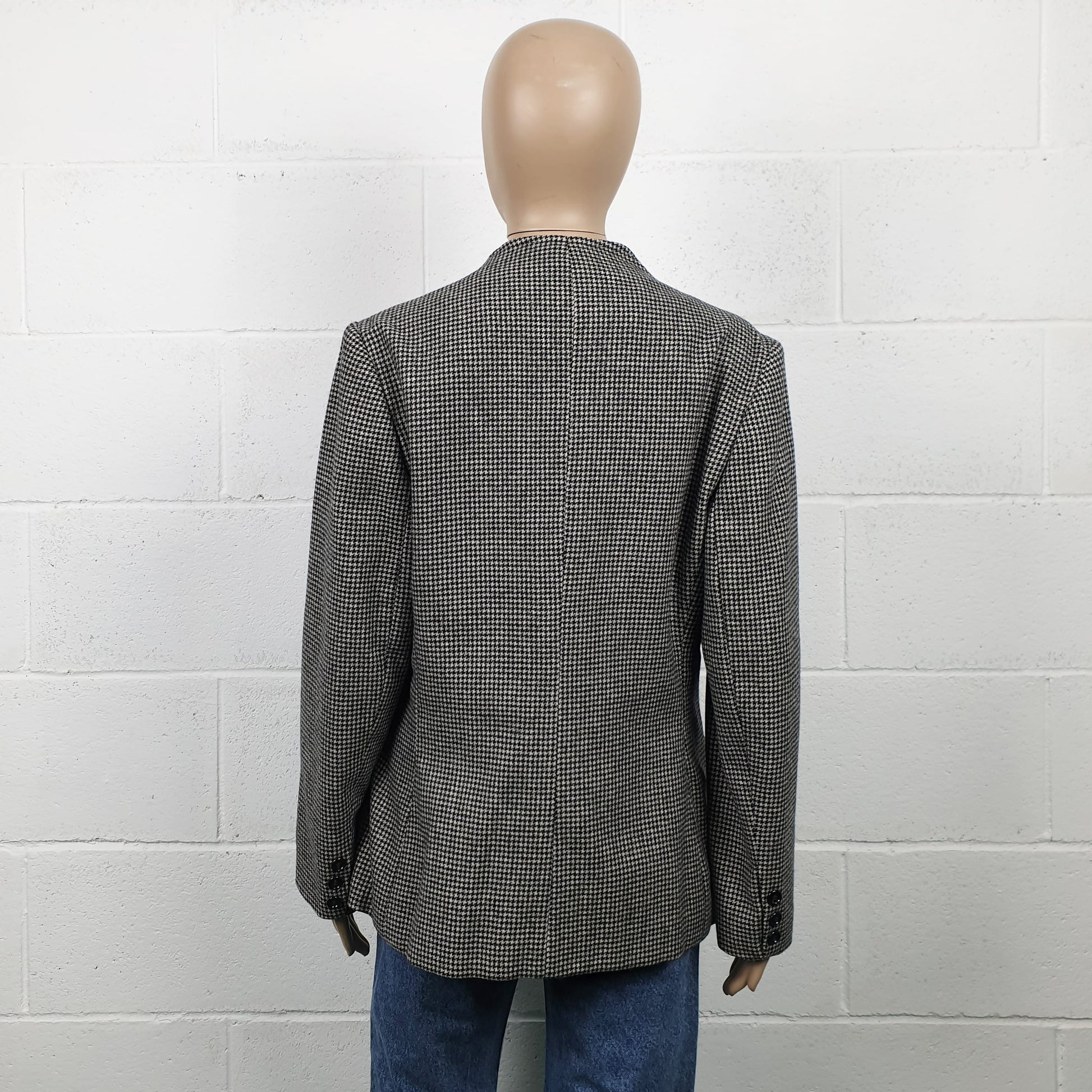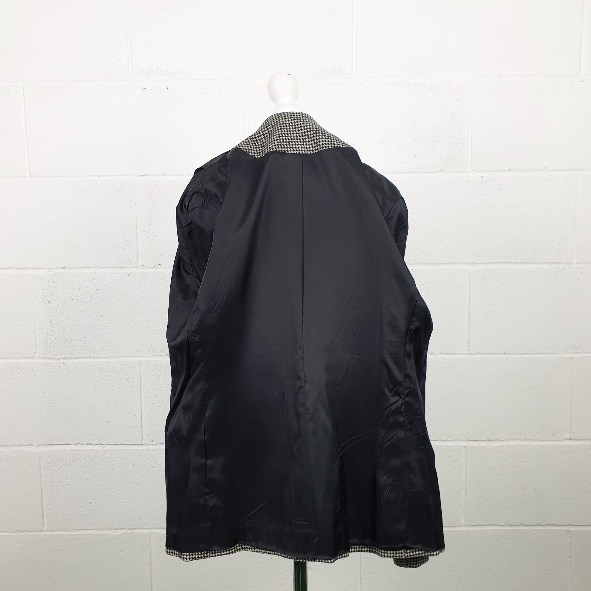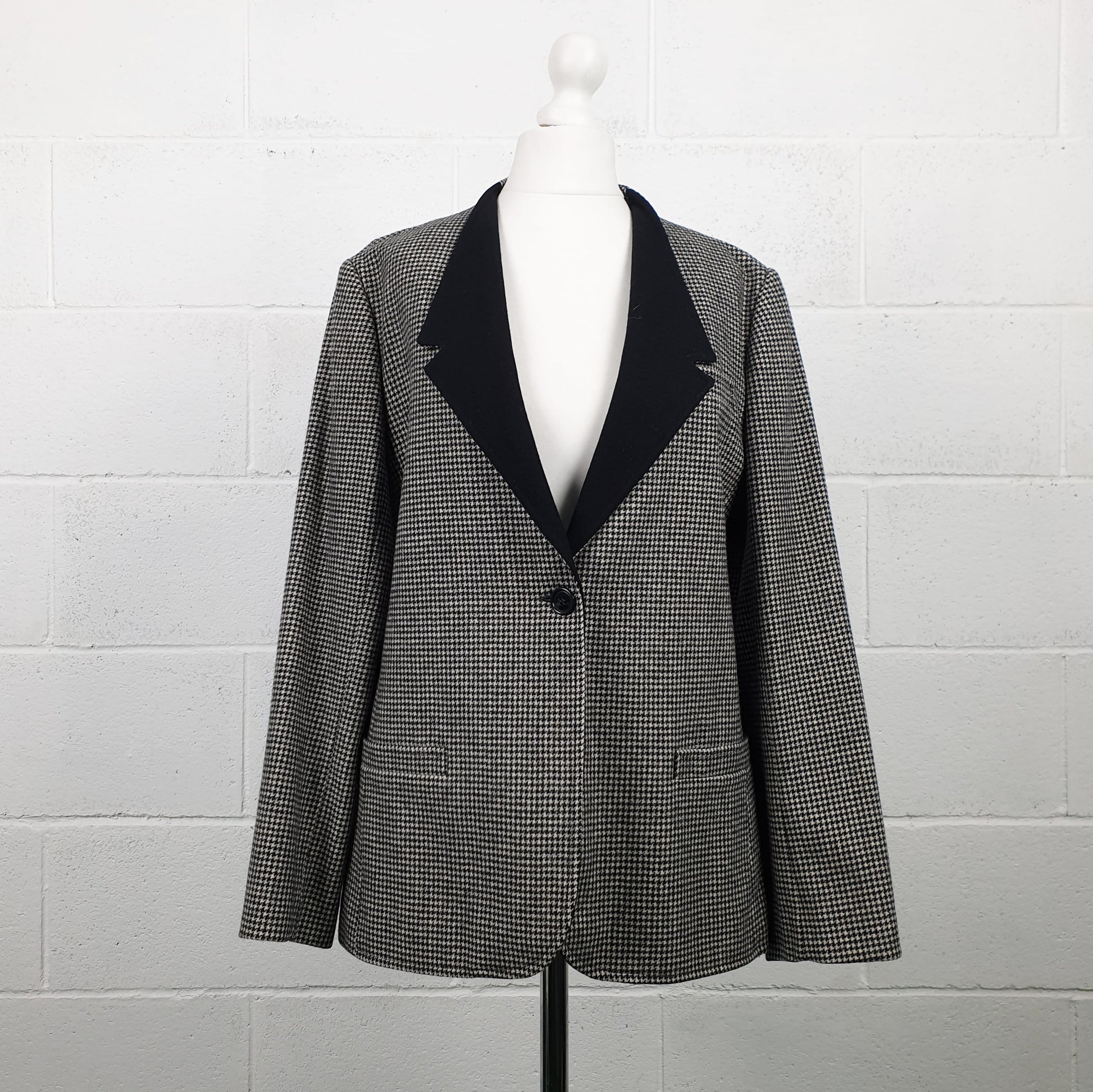 OLEG CASSINI giacca blazer vintage in fantasia pied-de-poule micro nei toni classici del bianco e nero. collo a contrasto in lana total black, chiusura monopetto tramite bottone singolo. Foderata in nero, già portata in lavanderia; second hand in buonissime condizioni, vi segnalo soltanto un puntino di tessuto leso, come da foto. Non si tratta di un buco ma solo di qualche pelo della lana mancante, che risulta davvero impercettibile. Taglia 12 corrispondente ad una 44 italiana, la vedete qui sul manichino 38/40. Queste le sue misure in piano: larghezza spalle 39 cm, lunghezza manica 58 cm, larghezza seno 51 cm, larghezza vita 44 cm, lunghezza totale 70 cm. 80% lana 20% poliestere. Spedizione esclusa €7 (corriere) - sull'acquisto di due o più articoli la spedizione è gratuita! #gloriagiacche