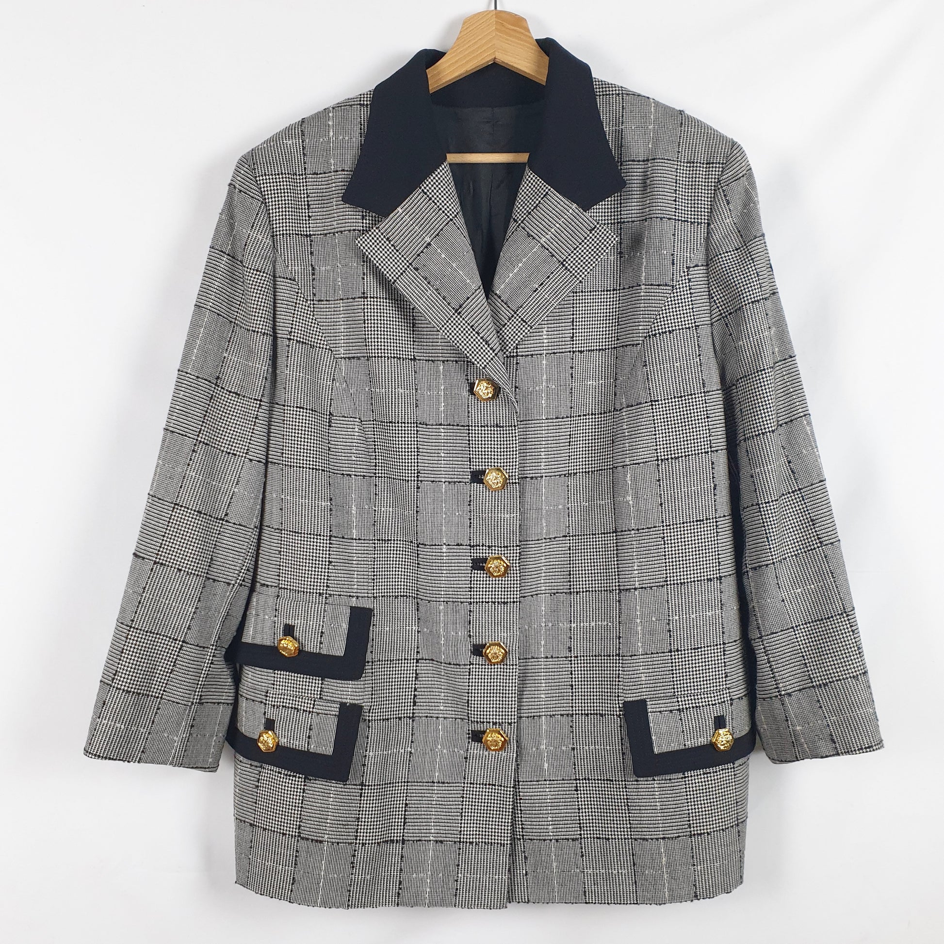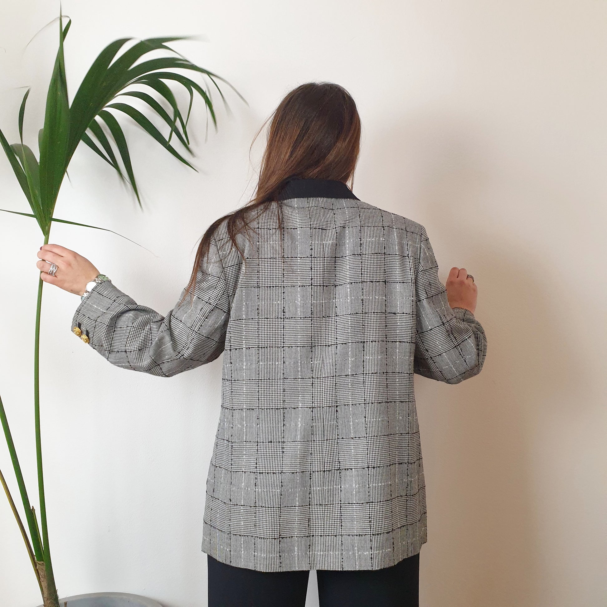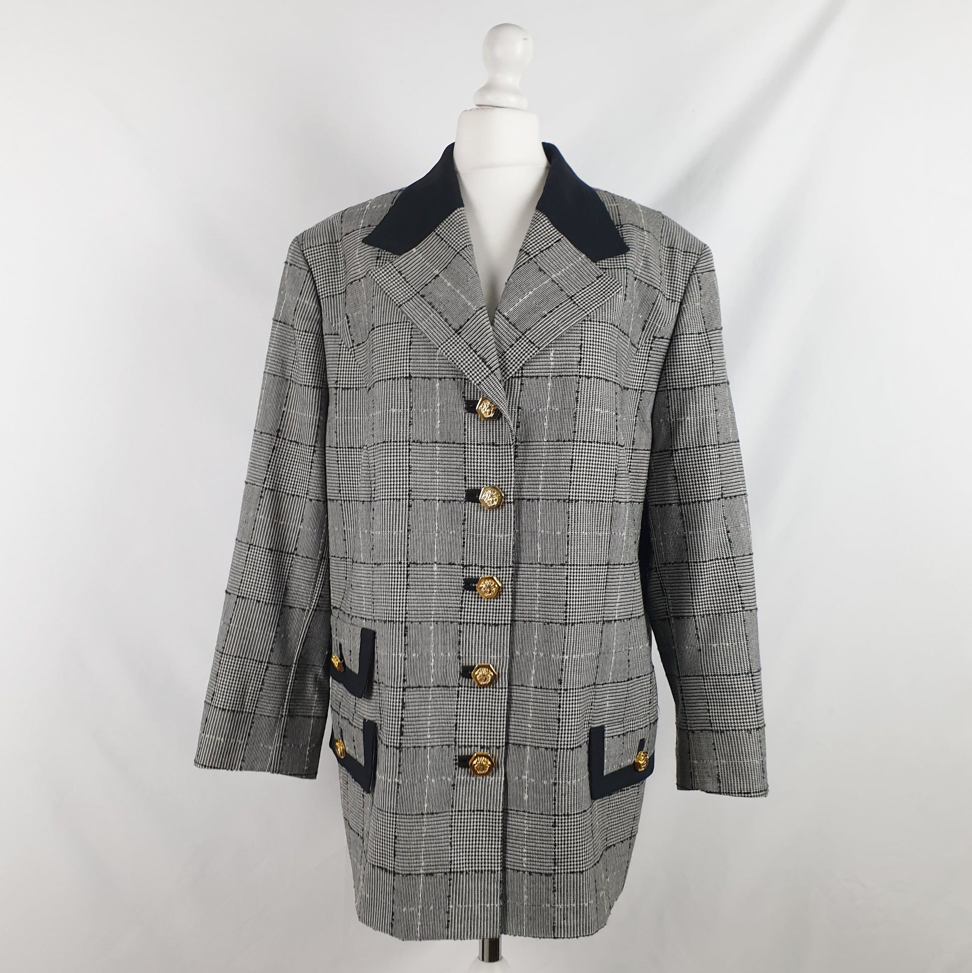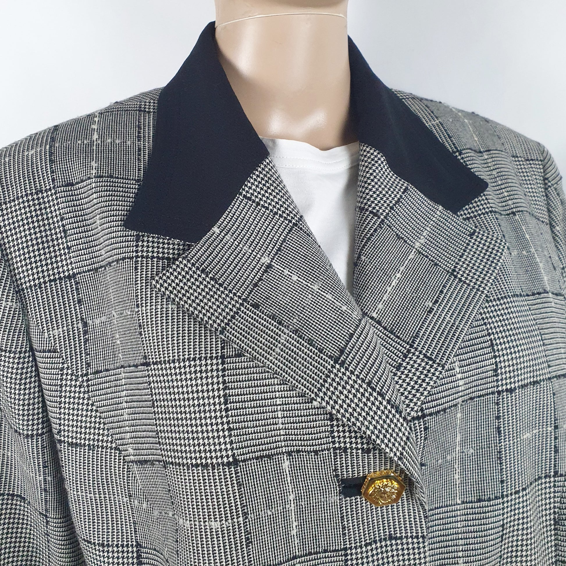 VERSATILE DI GIANNI VERSACE incredibile giacca blazer oversize vintage sui toni del bianco e del nero che si fondono in un tessuto che crea dei quadrotti con la stampa di micro pied-de-poule. Protagonisti assoluti i grandi bottoni dorati con la celebre testa di medusa, curati e rifiniti nel minimo dettaglio: basti pensare che lo spessore stesso del bottone ha incisa la tipica greca del marchio. In perfette condizioni, manca di taglia: la vedete sul manichino 38/40 ma è molto ampia e la consiglierei portata oversize. Queste le misure in piano: larghezza spalle 45-46 cm, lunghezza manica 57, larghezza seno 62, larghezza vita 57, larghezza sul fondo 63, lunghezza totale 78 cm. Pura lana vergine, fodera 100% viscosa. Un pezzo di storia, ormai di difficile reperibilità e che spero trovi la giusta compagna e compagnia. Spedizione esclusa €7 (corriere) - sull'acquisto di due o più articoli la spedizione è gratuita! #gloriagiacche