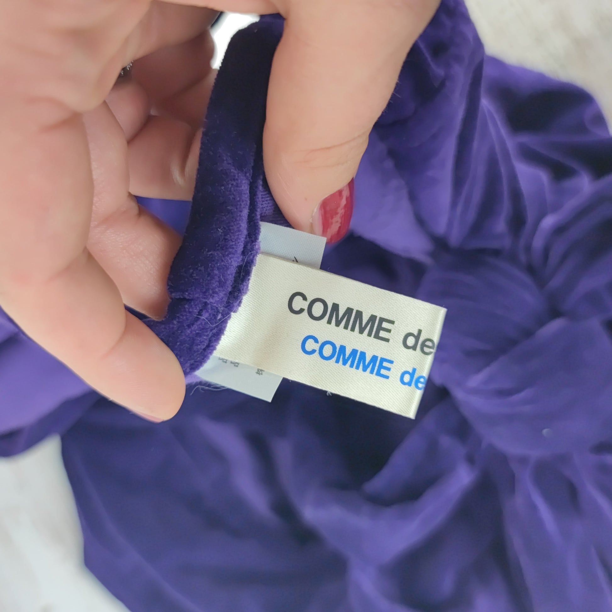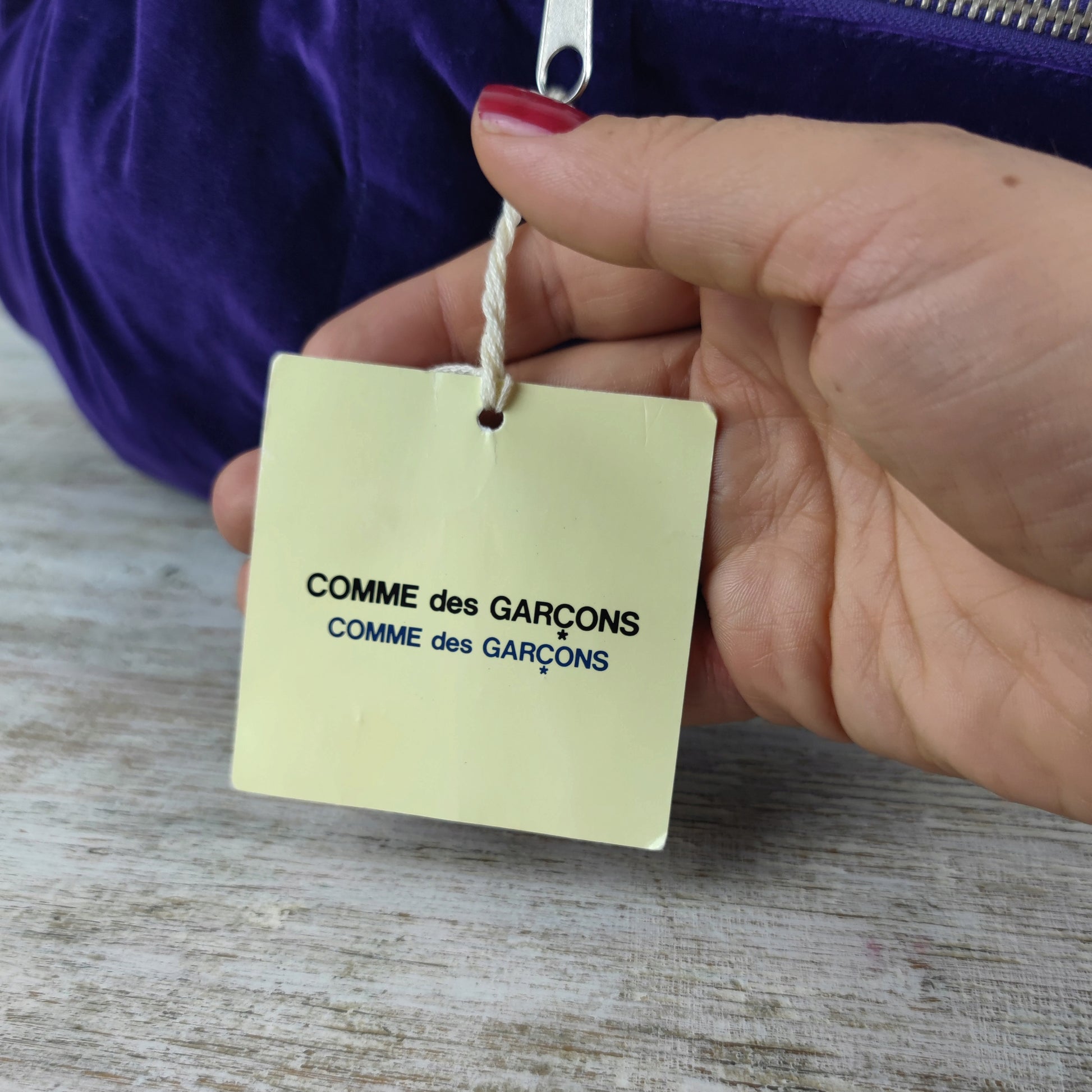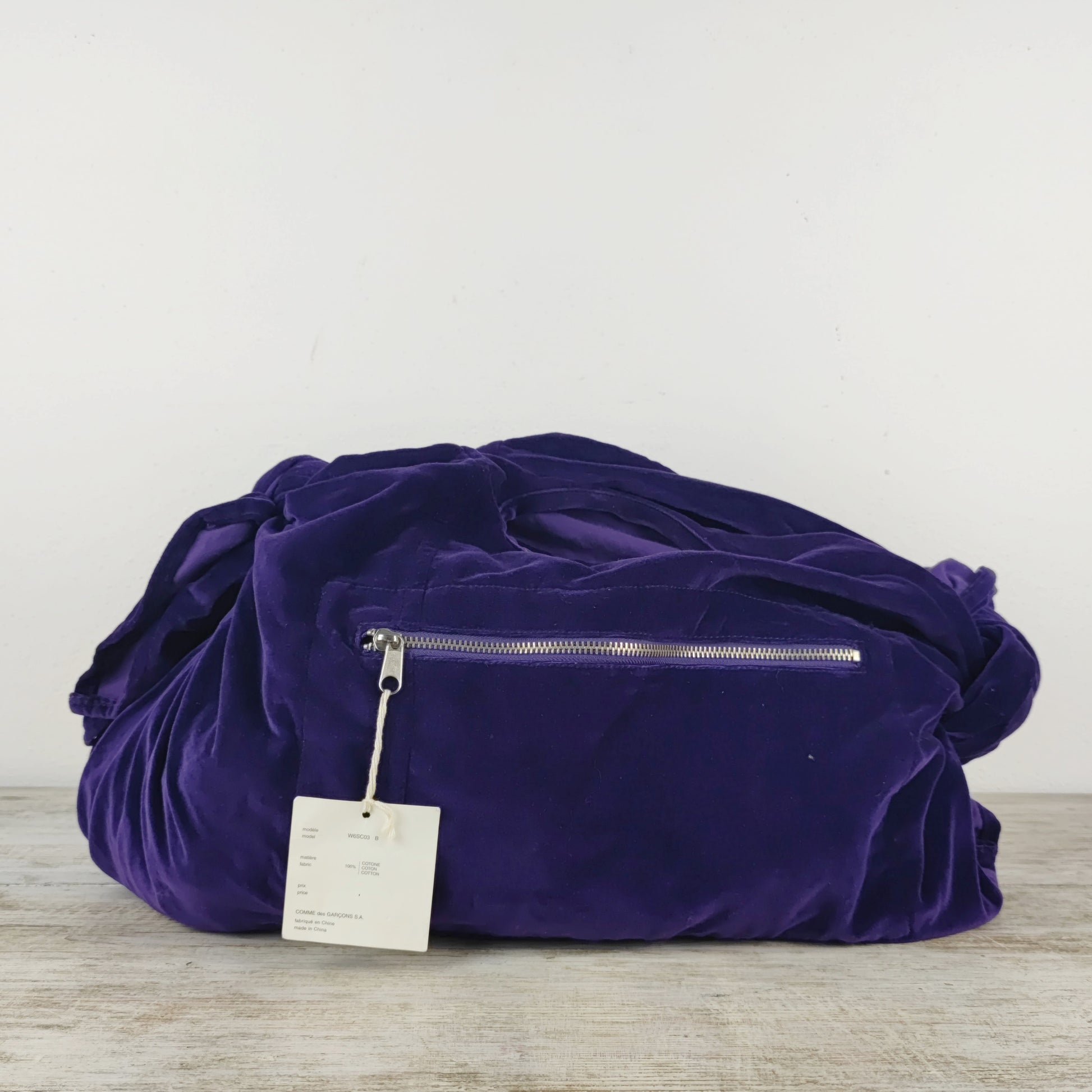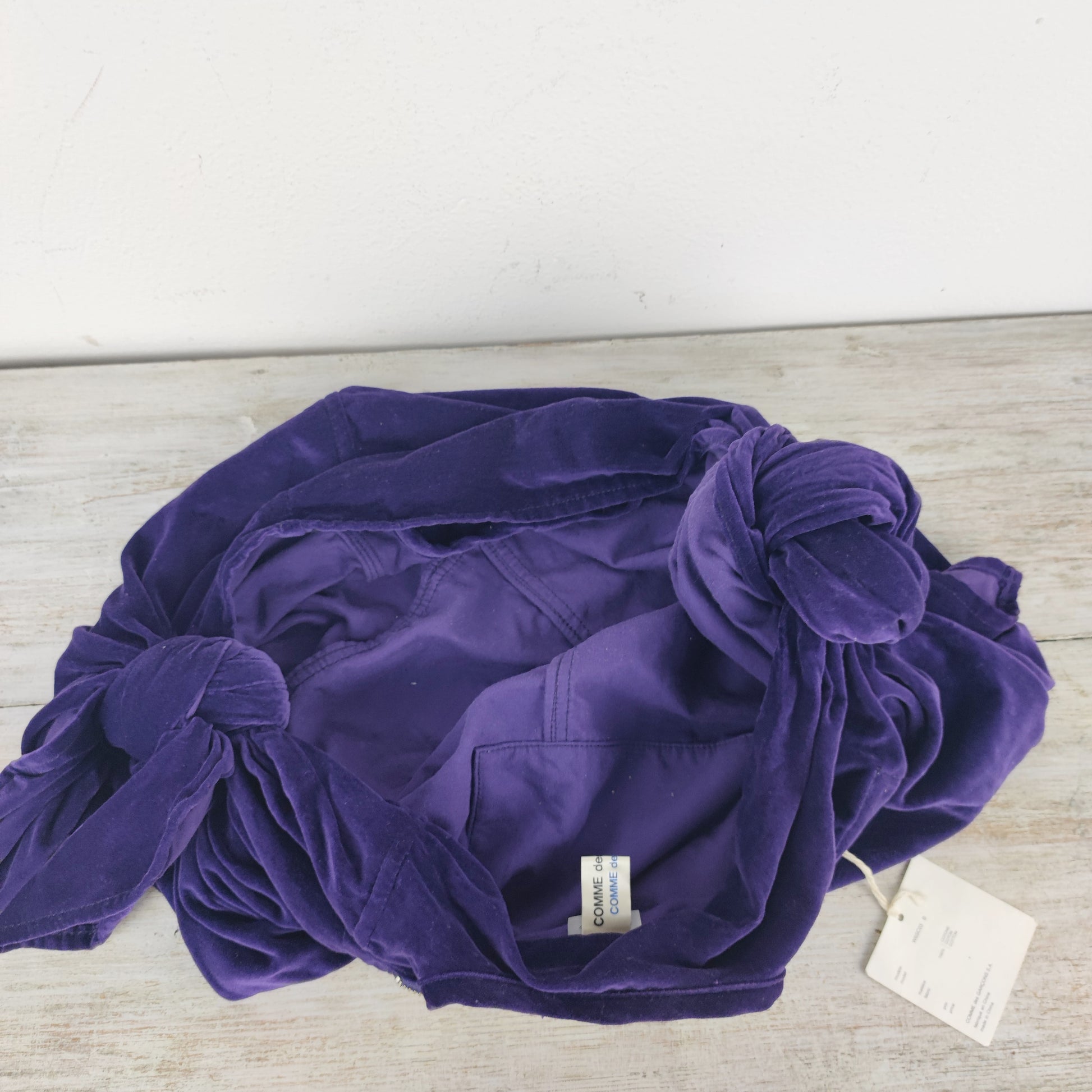 COMME DES GARCONS borsa in velluto liscio viola con maxi fiocchi laterali e piccola tasca con cerniera sul retro.