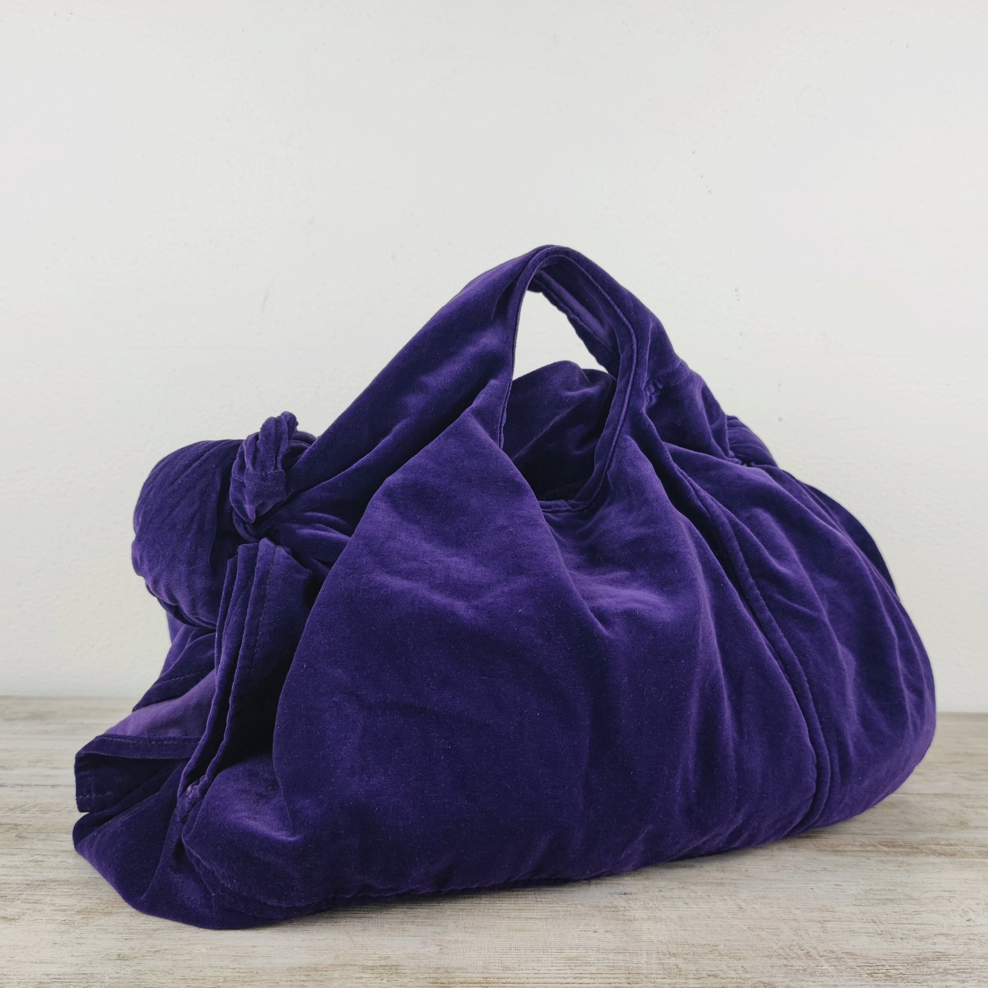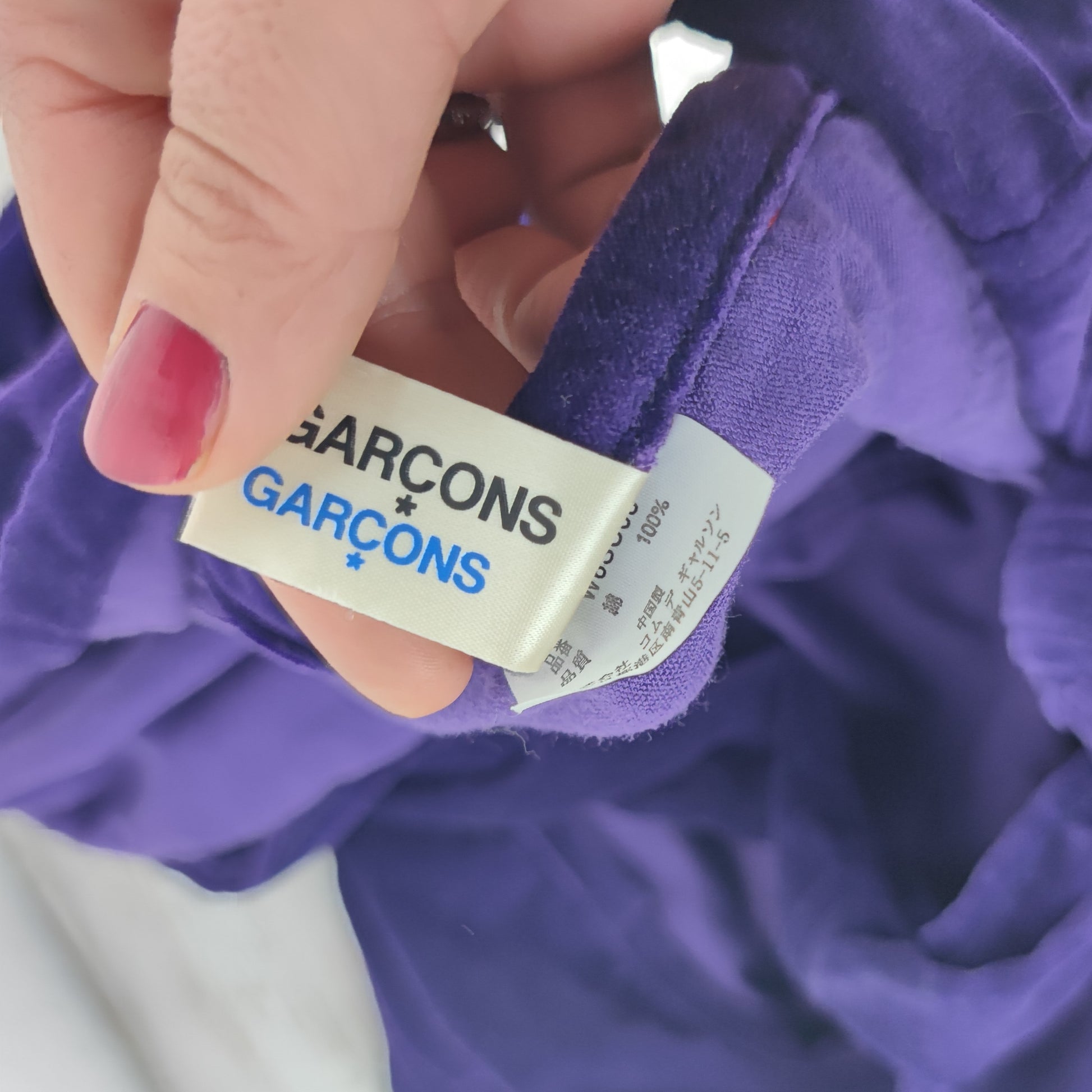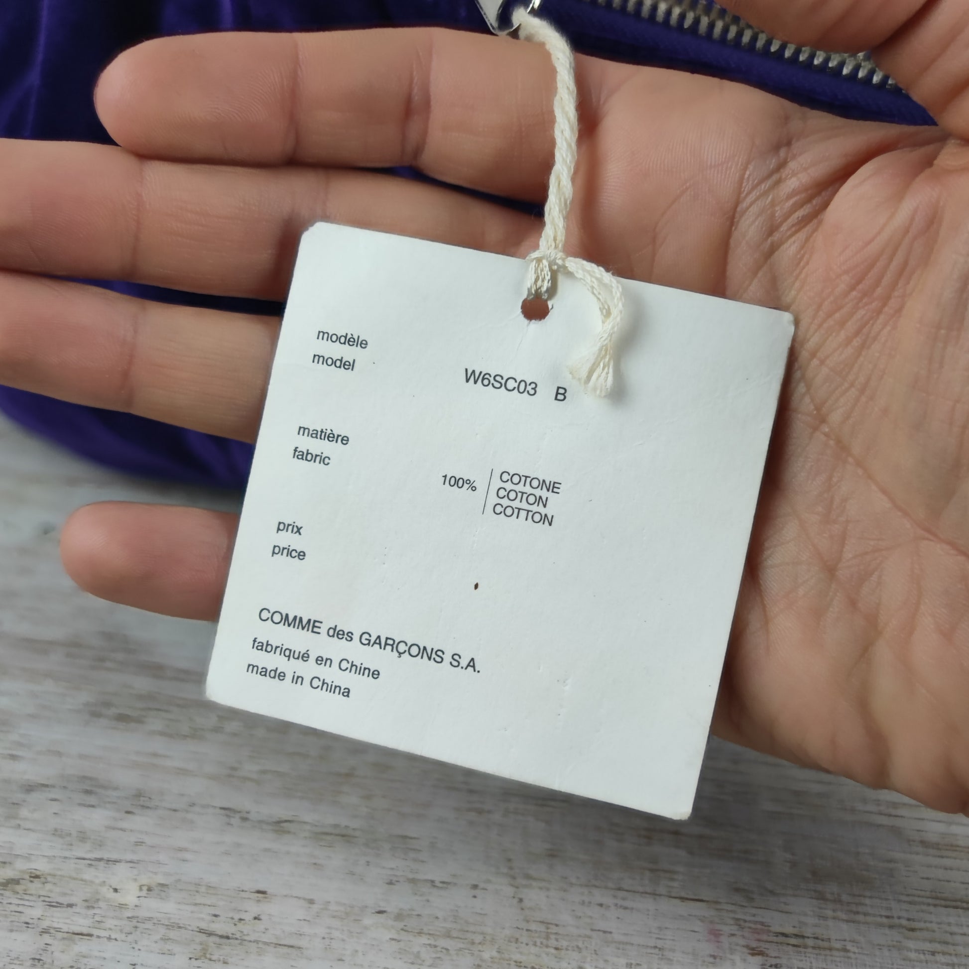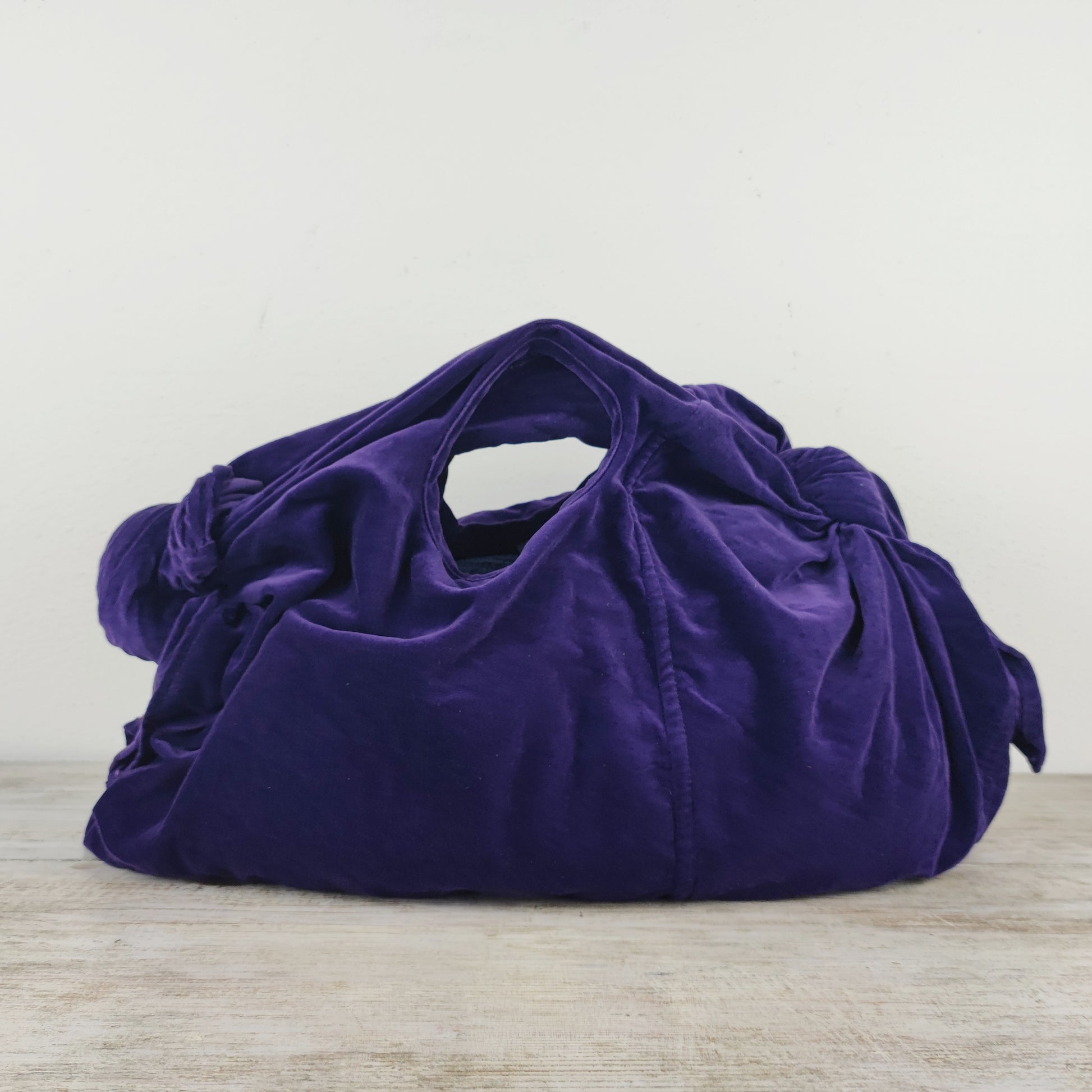 COMME DES GARCONS borsa in velluto liscio viola con maxi fiocchi laterali e piccola tasca con cerniera sul retro.