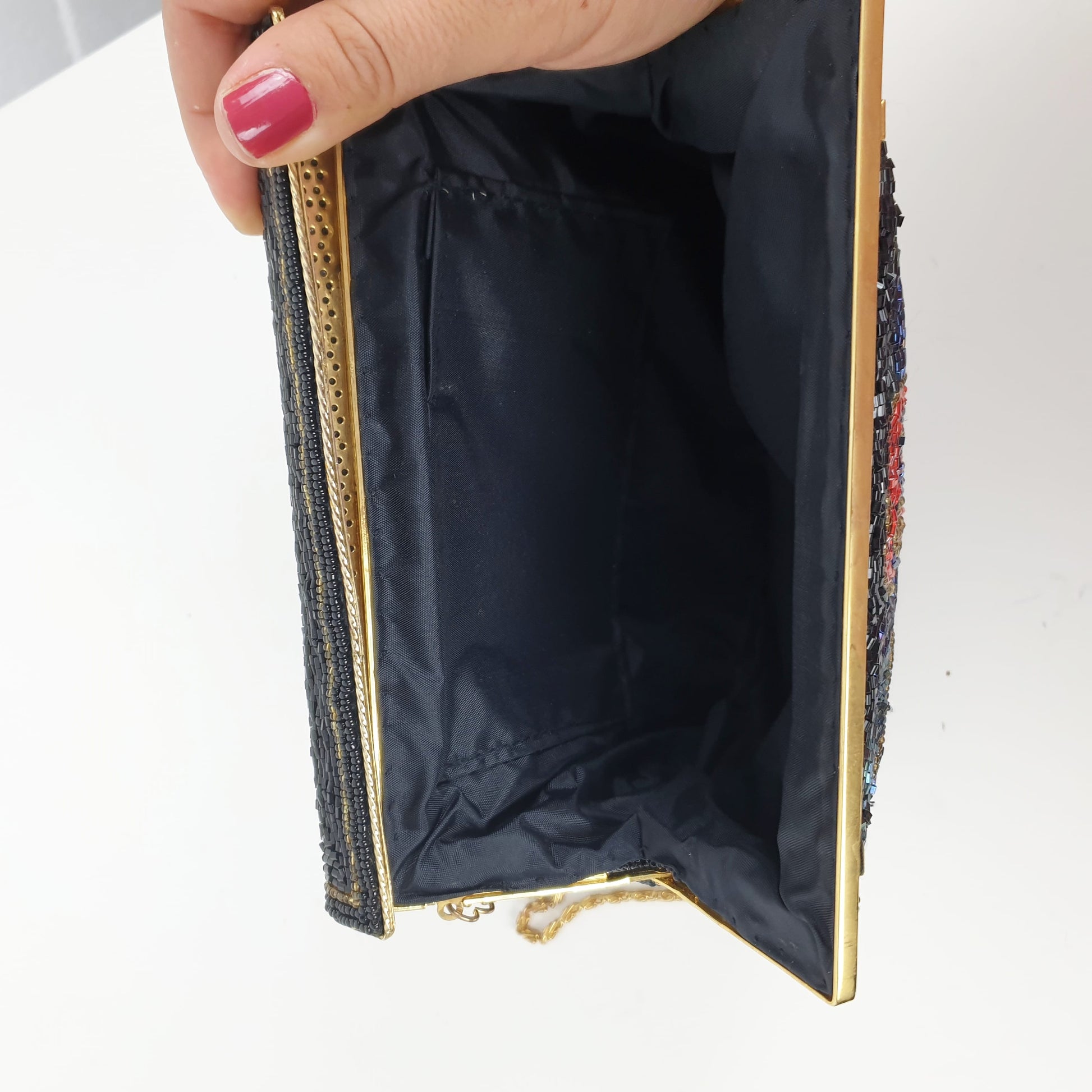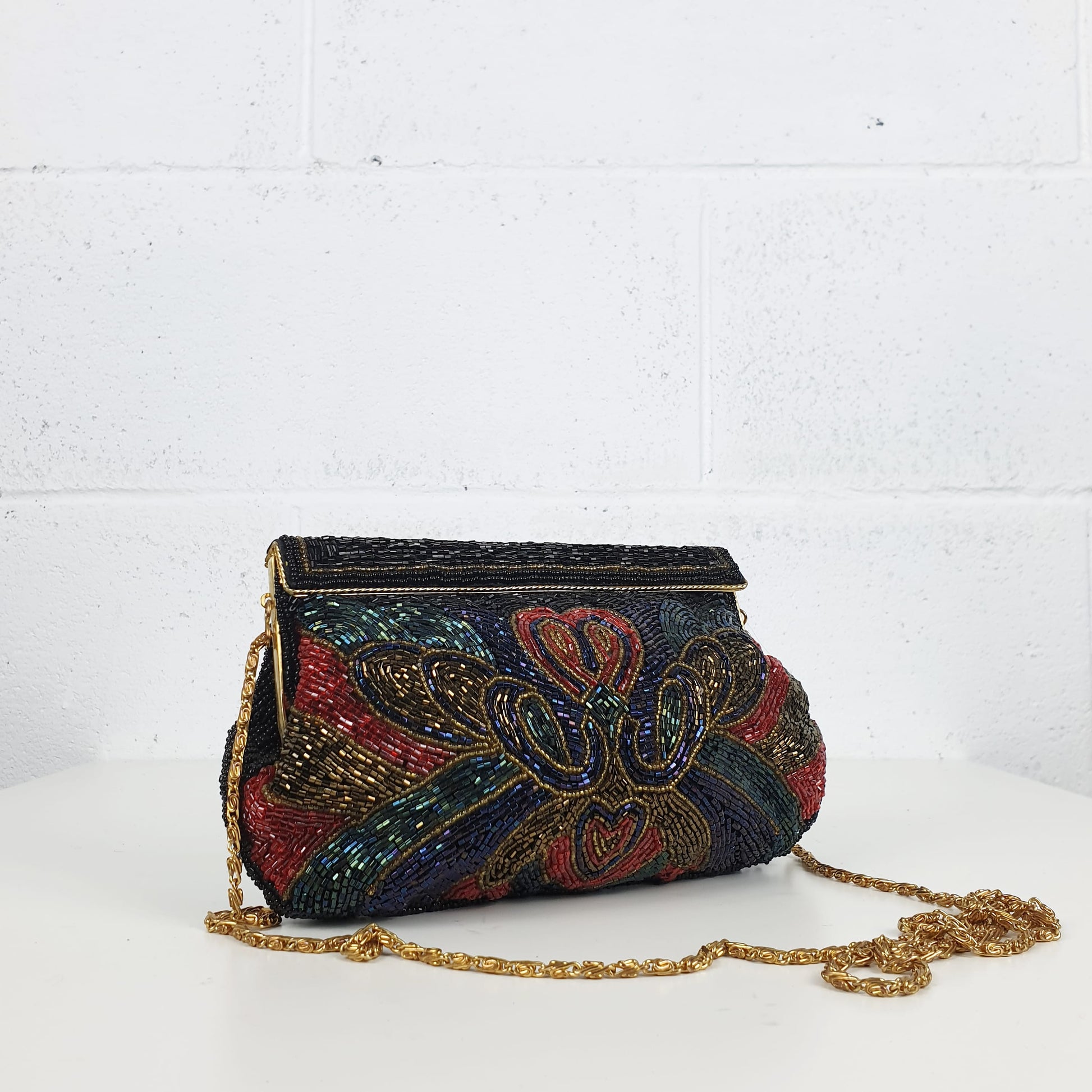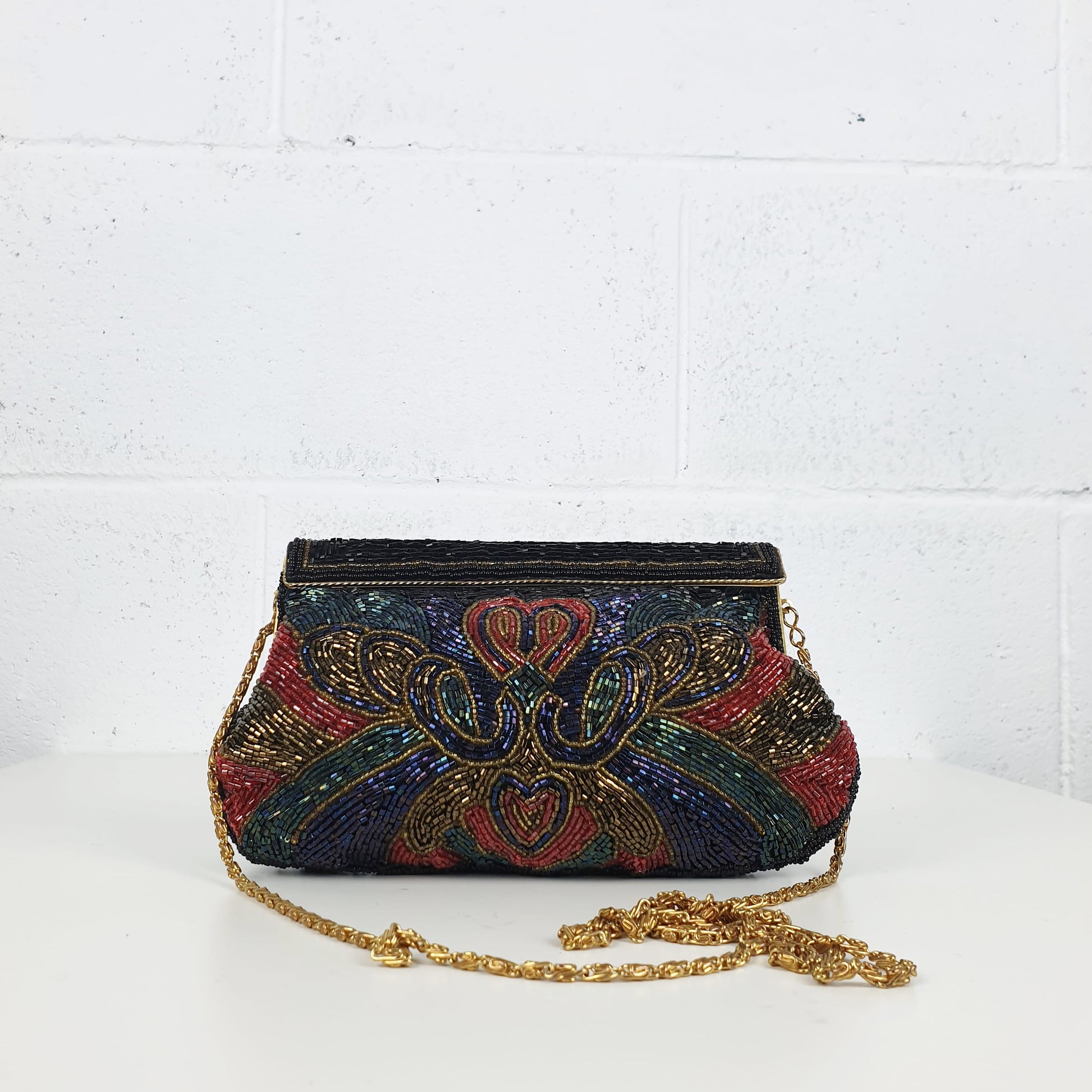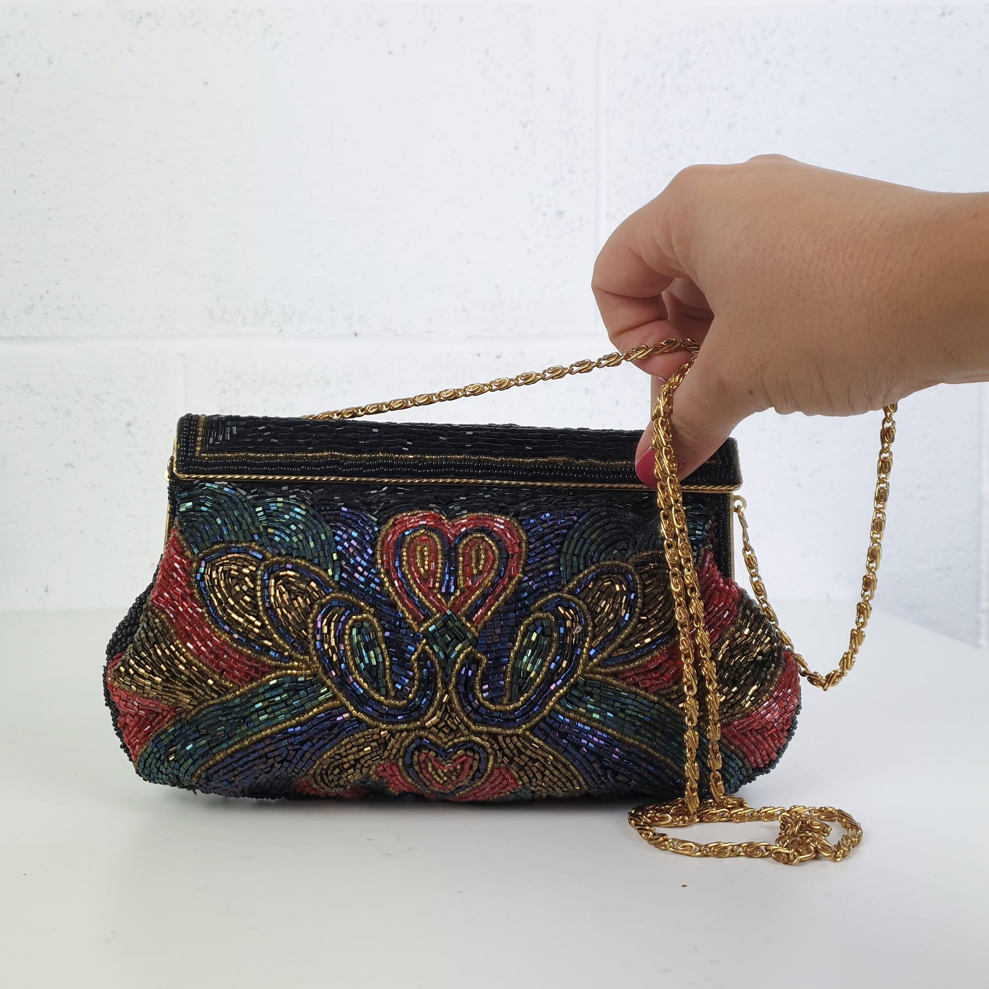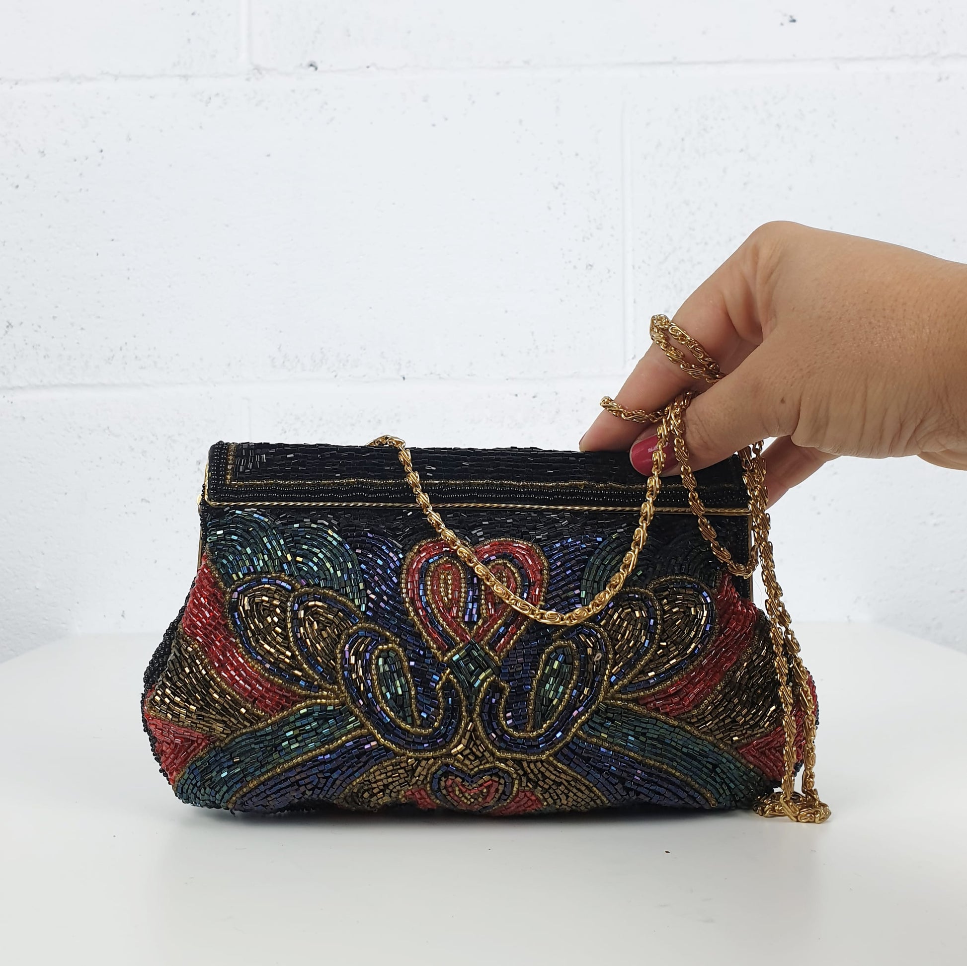 Borsa vintage da sera - borsetta baguette tempestata di perline colorate ricamate a mano, un lavoro paziente e certosino che ha certamente richiesto molto tempo. Total black per il retro, un disegno colorato invece sul davanti che crea dei cuori centrali nel disegno. Caratteristica principale l'apertura rigida, con un inserto in metallo che rende più semplice portarla a mano. Catenina oro anche per essere portata a spalla. In ottime condizioni generali anche considerando l'età, è saltato qualche piccolo punto come segnalato in foto, ma veramente due puntini impercettibili ed impossibili da notare. Queste le sue misure indicative: lunghezza 22 cm, altezza 15 cm. Spedizione esclusa €7 (corriere) - sull'acquisto di due o più articoli la spedizione è gratuita! #gloriaborse #gloriaaccessori