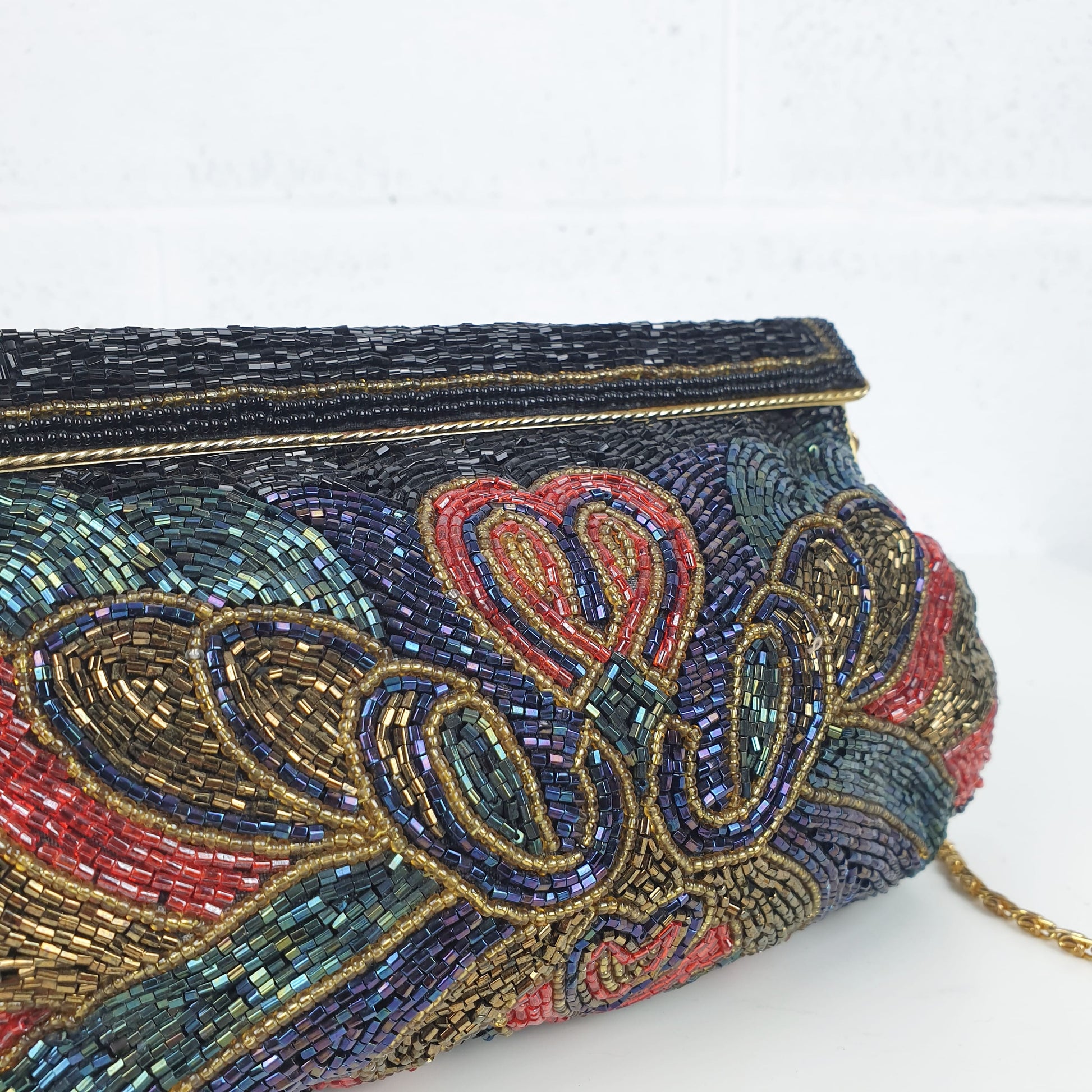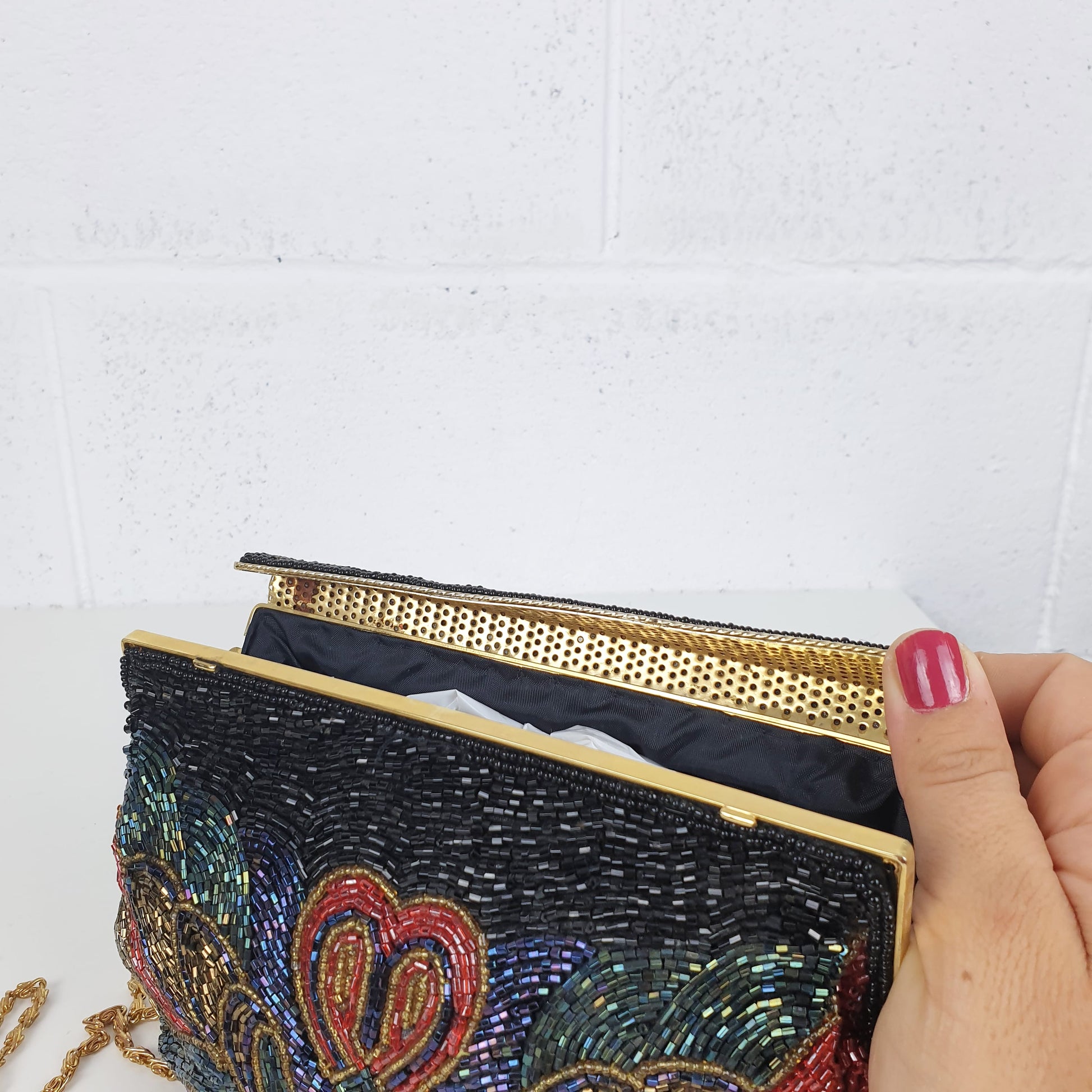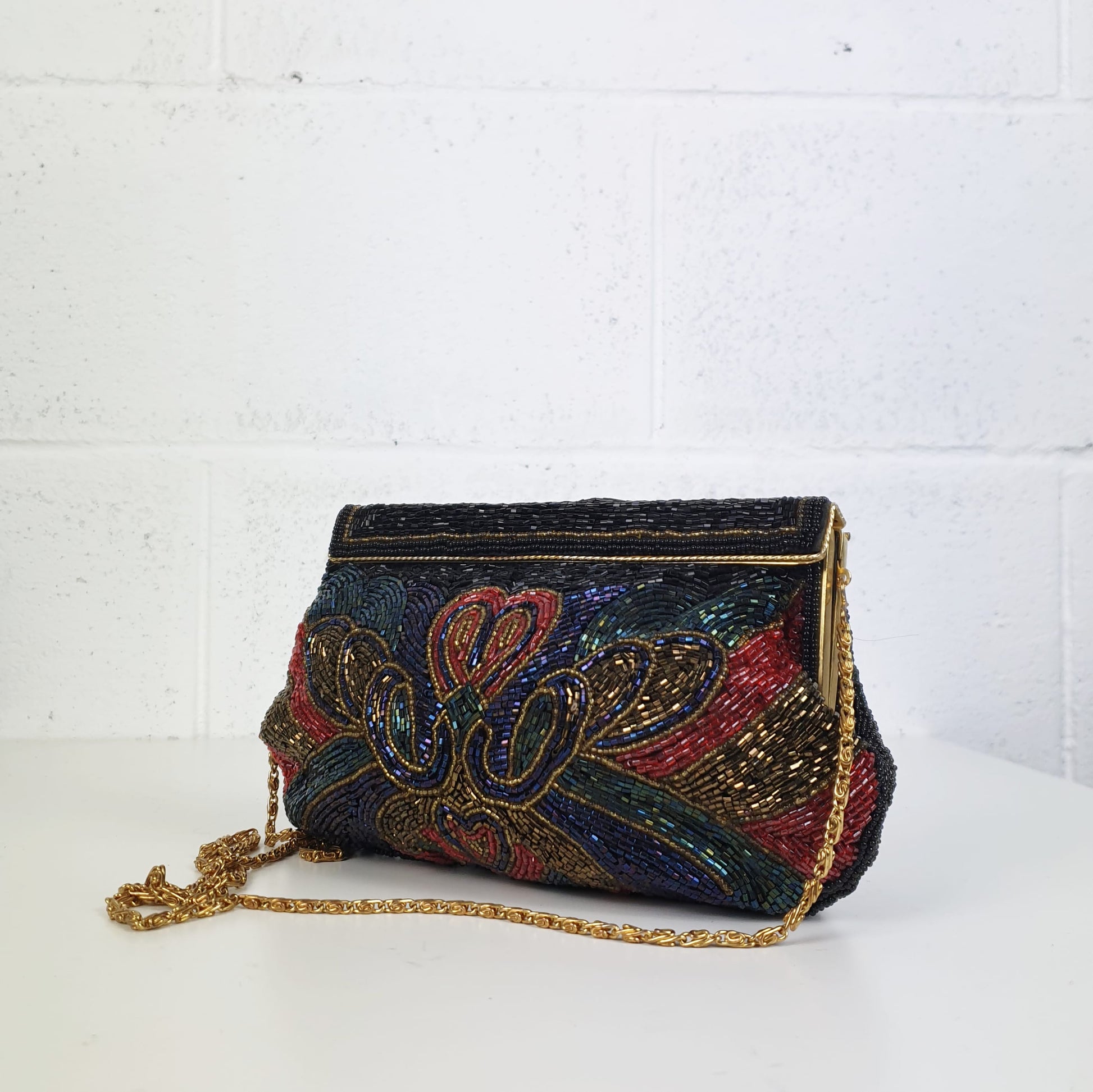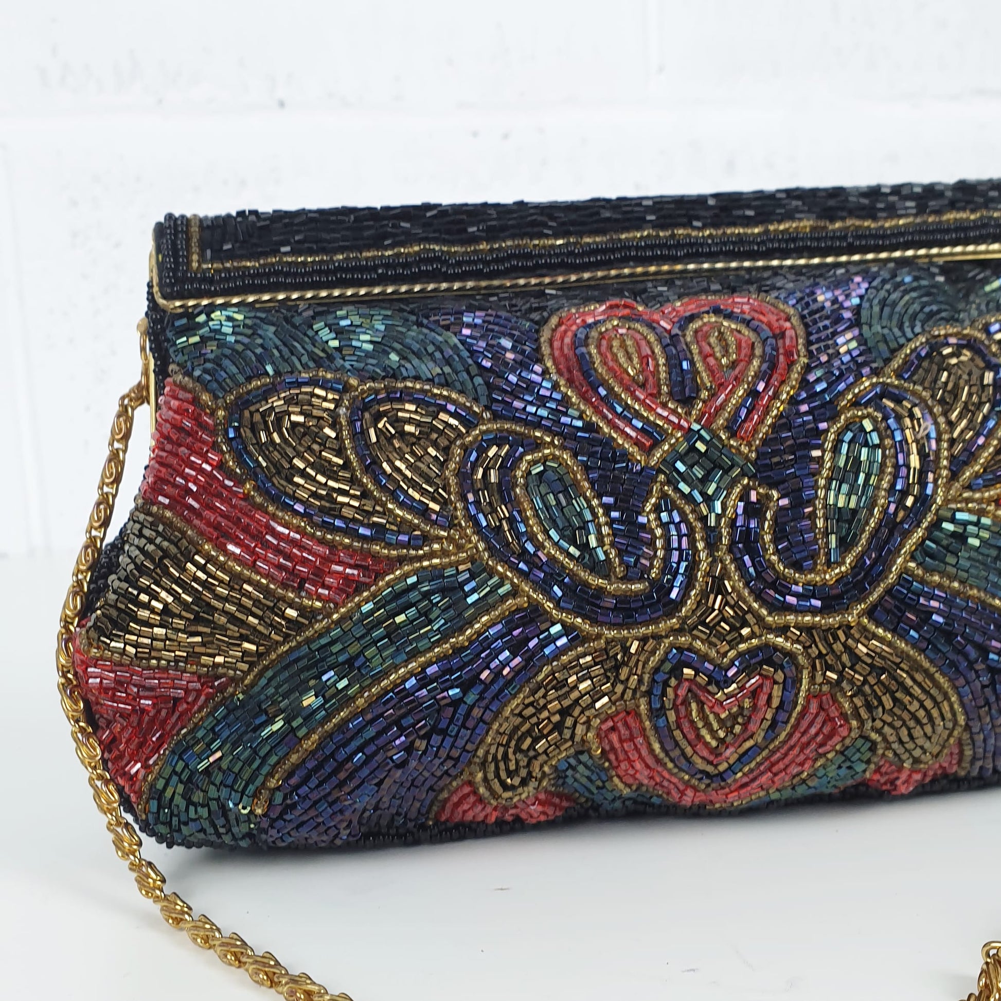 Borsa vintage da sera - borsetta baguette tempestata di perline colorate ricamate a mano, un lavoro paziente e certosino che ha certamente richiesto molto tempo. Total black per il retro, un disegno colorato invece sul davanti che crea dei cuori centrali nel disegno. Caratteristica principale l'apertura rigida, con un inserto in metallo che rende più semplice portarla a mano. Catenina oro anche per essere portata a spalla. In ottime condizioni generali anche considerando l'età, è saltato qualche piccolo punto come segnalato in foto, ma veramente due puntini impercettibili ed impossibili da notare. Queste le sue misure indicative: lunghezza 22 cm, altezza 15 cm. Spedizione esclusa €7 (corriere) - sull'acquisto di due o più articoli la spedizione è gratuita! #gloriaborse #gloriaaccessori