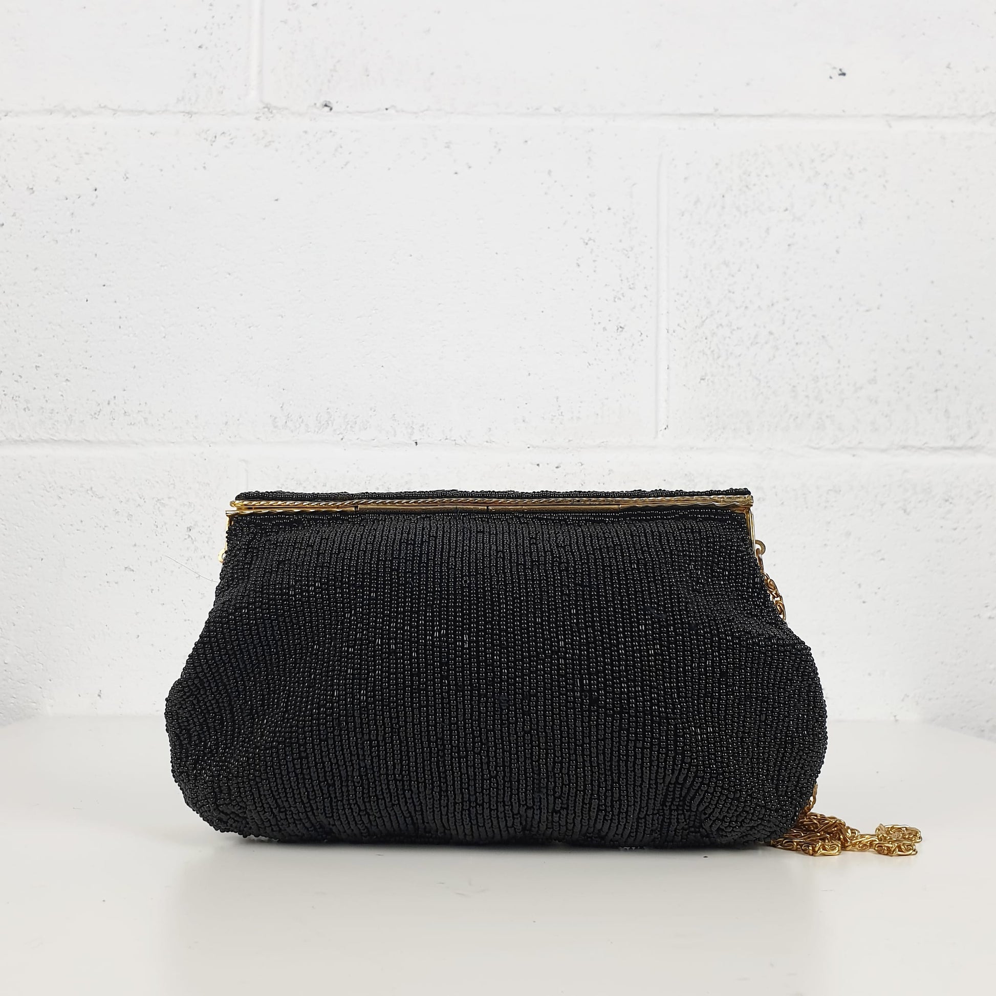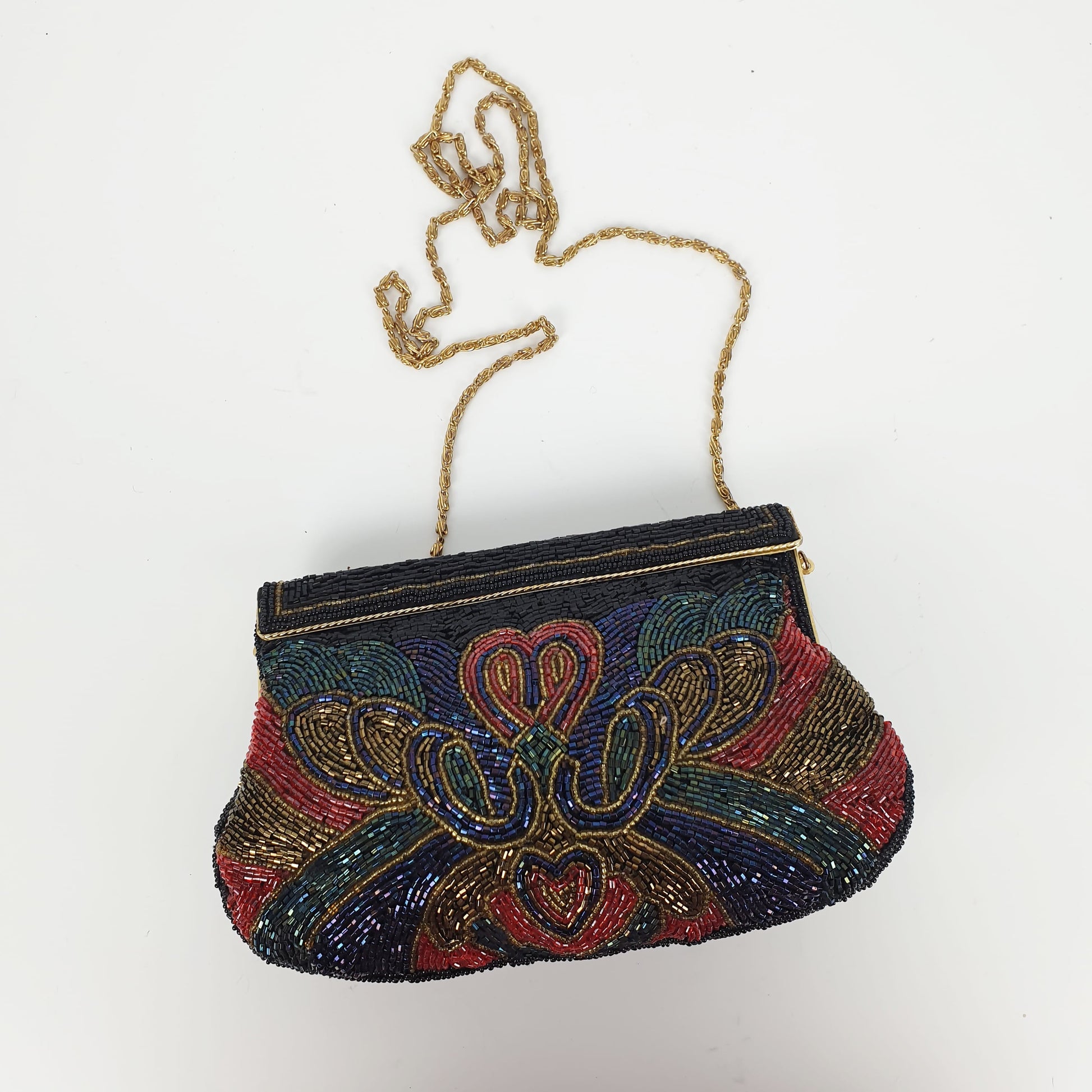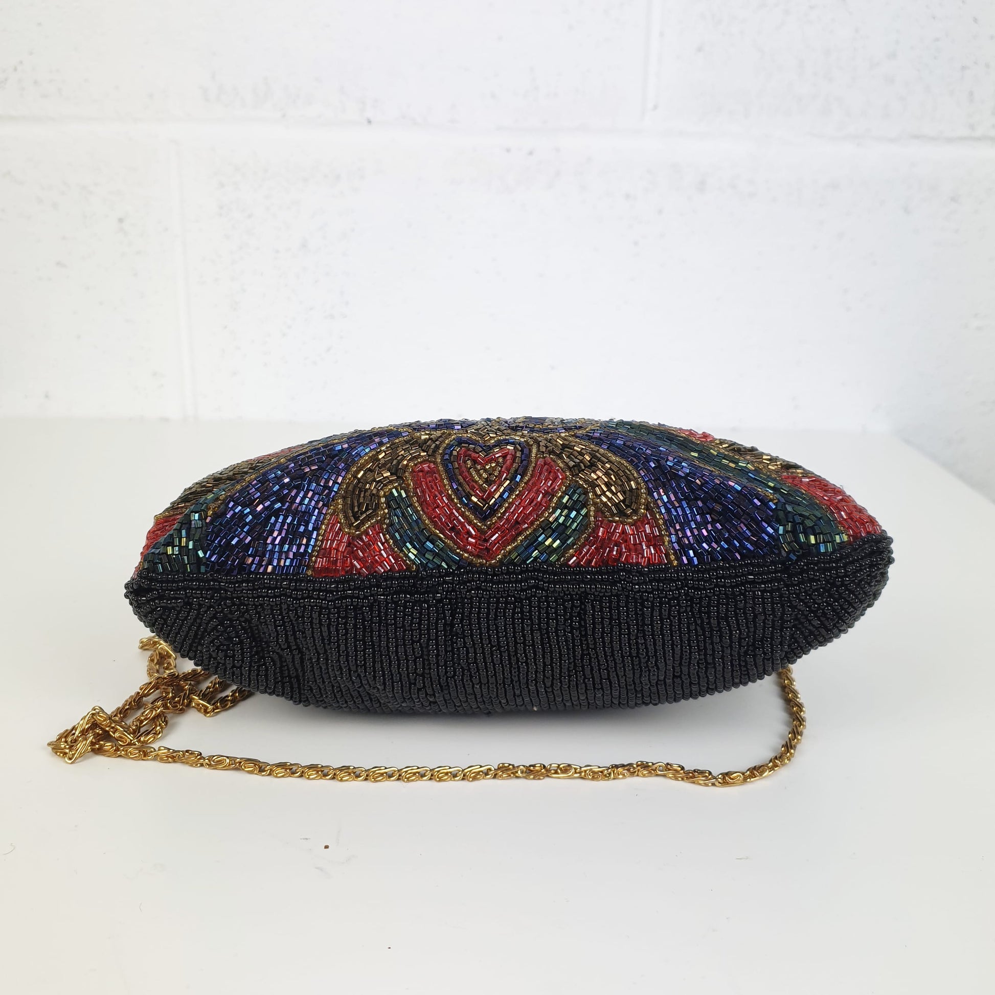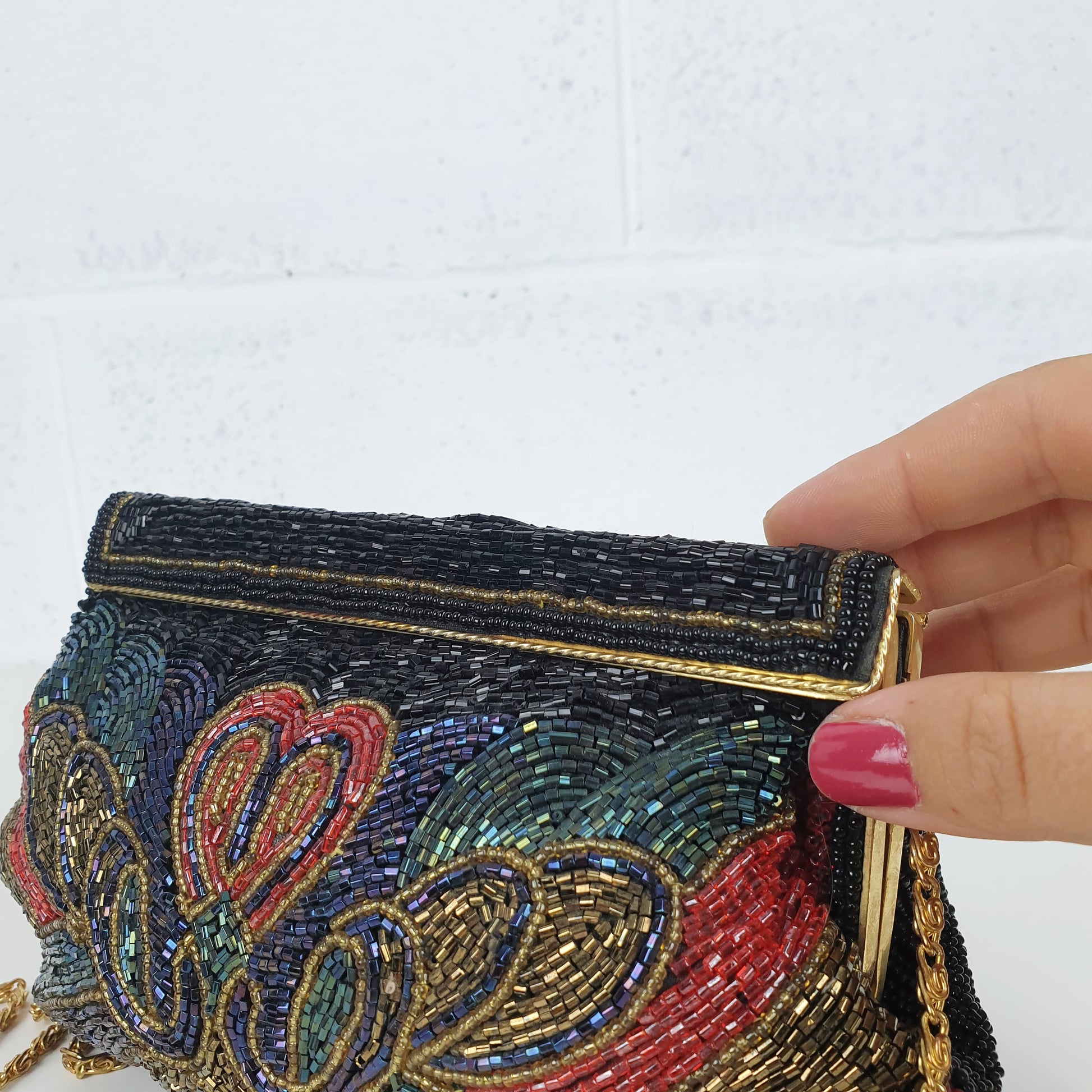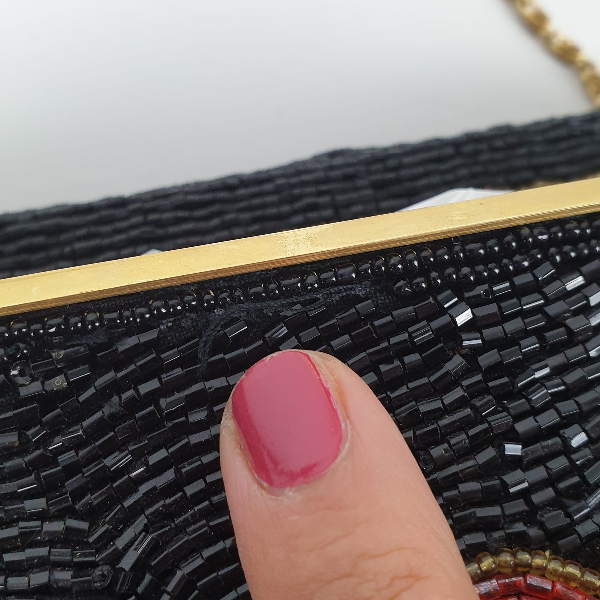 Borsa vintage da sera - borsetta baguette tempestata di perline colorate ricamate a mano, un lavoro paziente e certosino che ha certamente richiesto molto tempo. Total black per il retro, un disegno colorato invece sul davanti che crea dei cuori centrali nel disegno. Caratteristica principale l'apertura rigida, con un inserto in metallo che rende più semplice portarla a mano. Catenina oro anche per essere portata a spalla. In ottime condizioni generali anche considerando l'età, è saltato qualche piccolo punto come segnalato in foto, ma veramente due puntini impercettibili ed impossibili da notare. Queste le sue misure indicative: lunghezza 22 cm, altezza 15 cm. Spedizione esclusa €7 (corriere) - sull'acquisto di due o più articoli la spedizione è gratuita! #gloriaborse #gloriaaccessori
