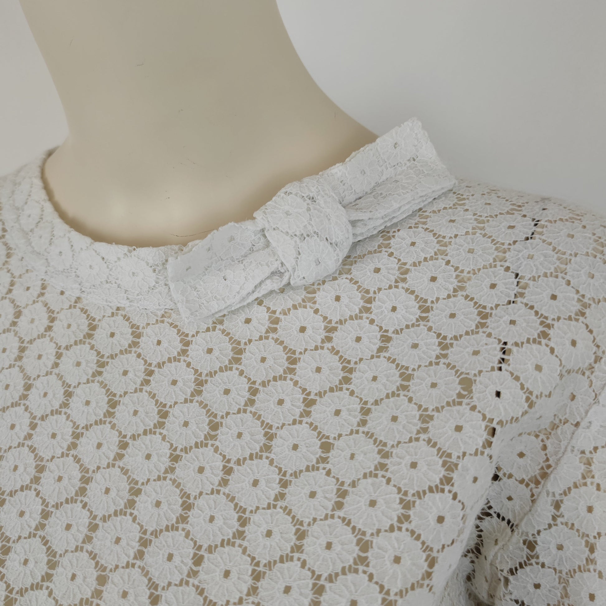 COMME DES GARCONS camicietta - blusa in pizzo di cotone bianco con piccoli fiocchi sul lato del collo e sui polsini.