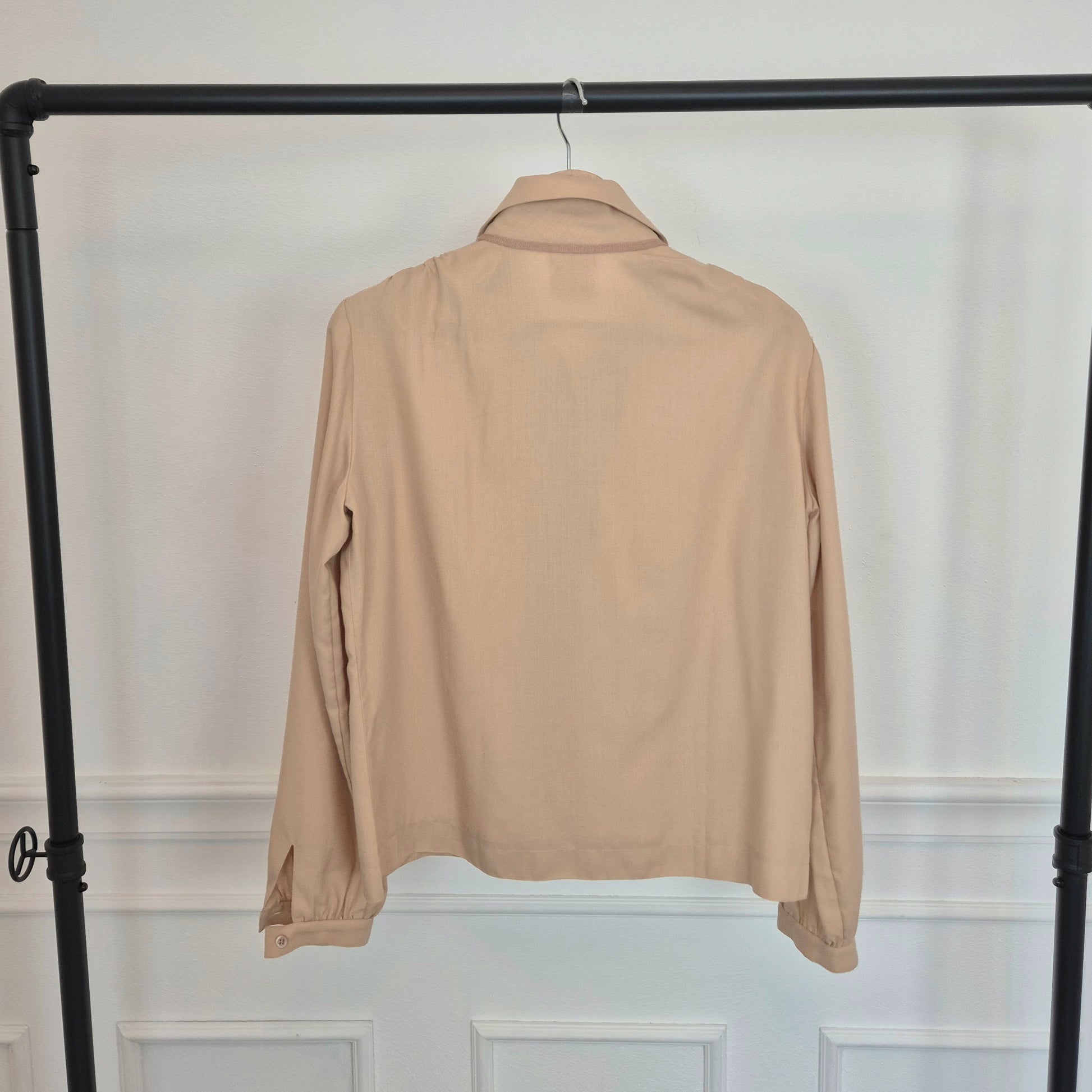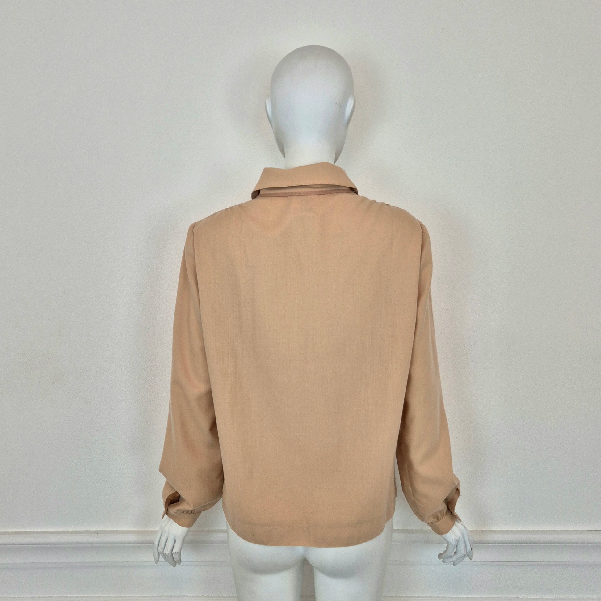 COURREGES Camicia vintage color beige con particolare doppio colletto tono su tono, uno dei quali in maglia. Bottoncini su tutta la lunghezza e due piccole stringhe sotto il collo da chiudere in un fiocco.