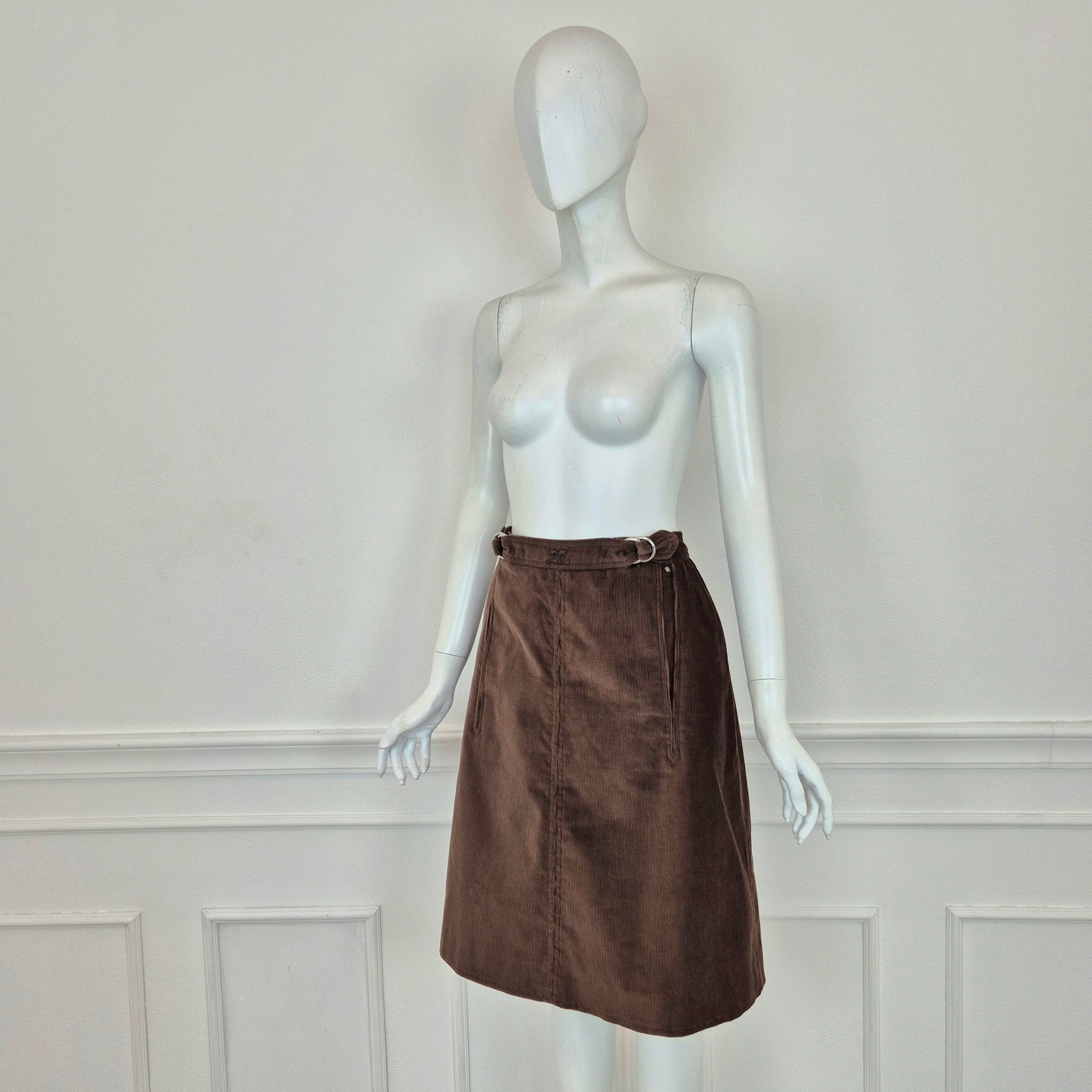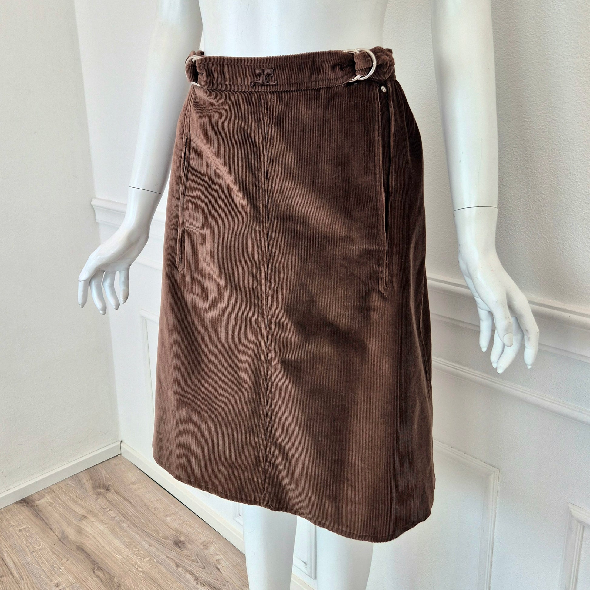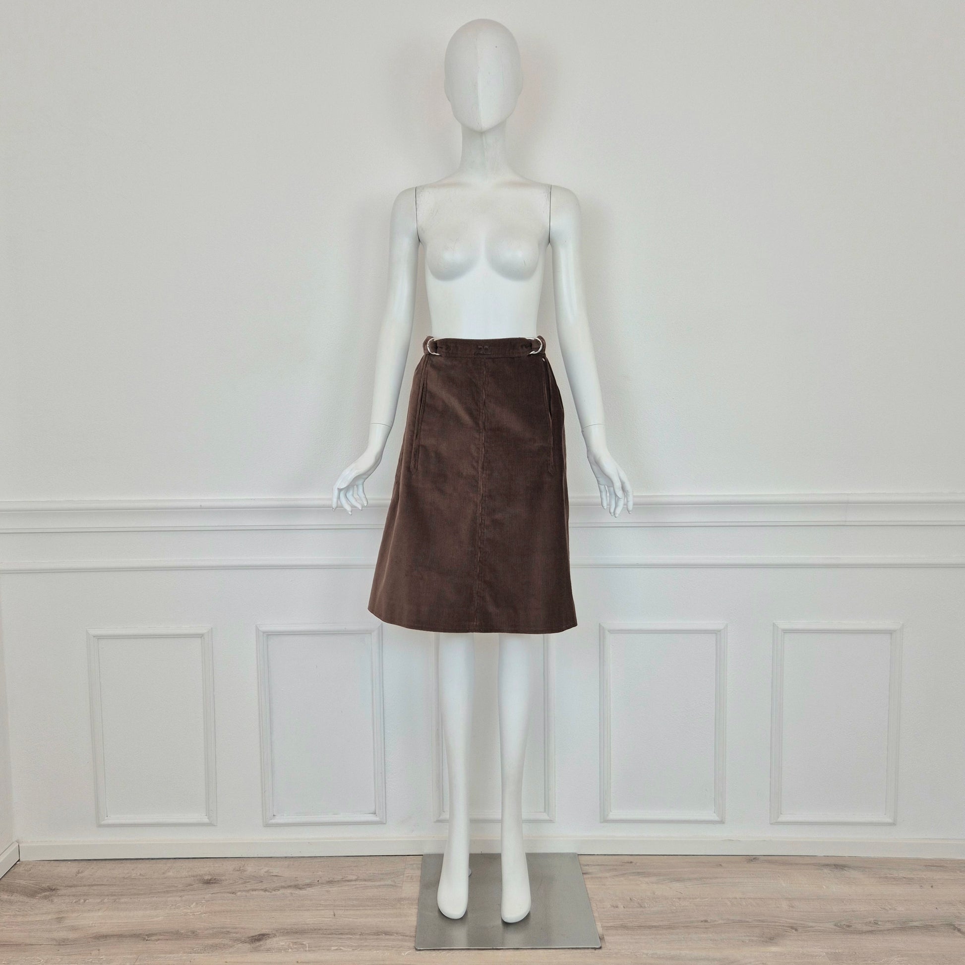 COURREGES gonna vintage in velluto a coste color marrone, con vita alta e particolare chiusura tramite due anelli in metallo, che si possono regolare sul punto vita.