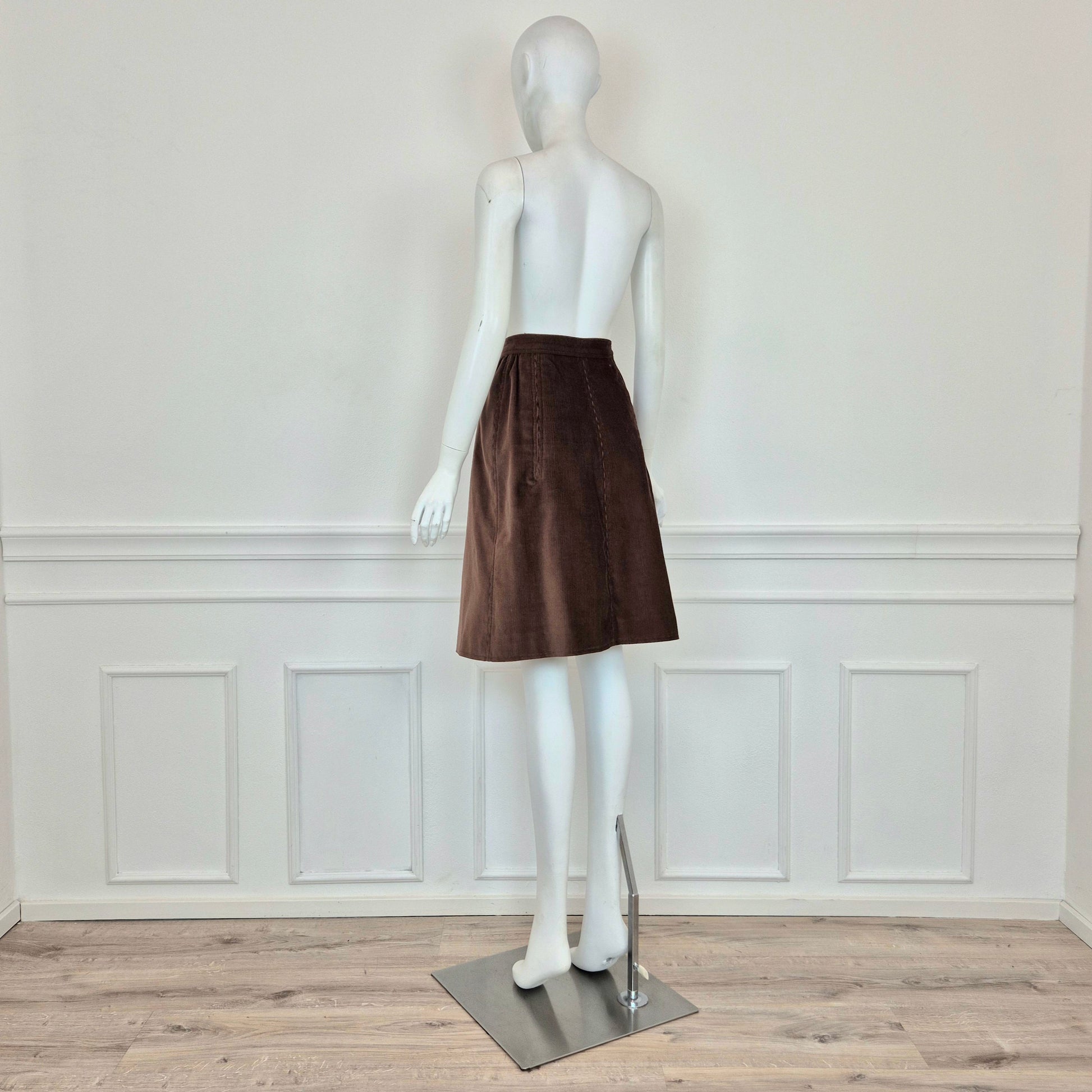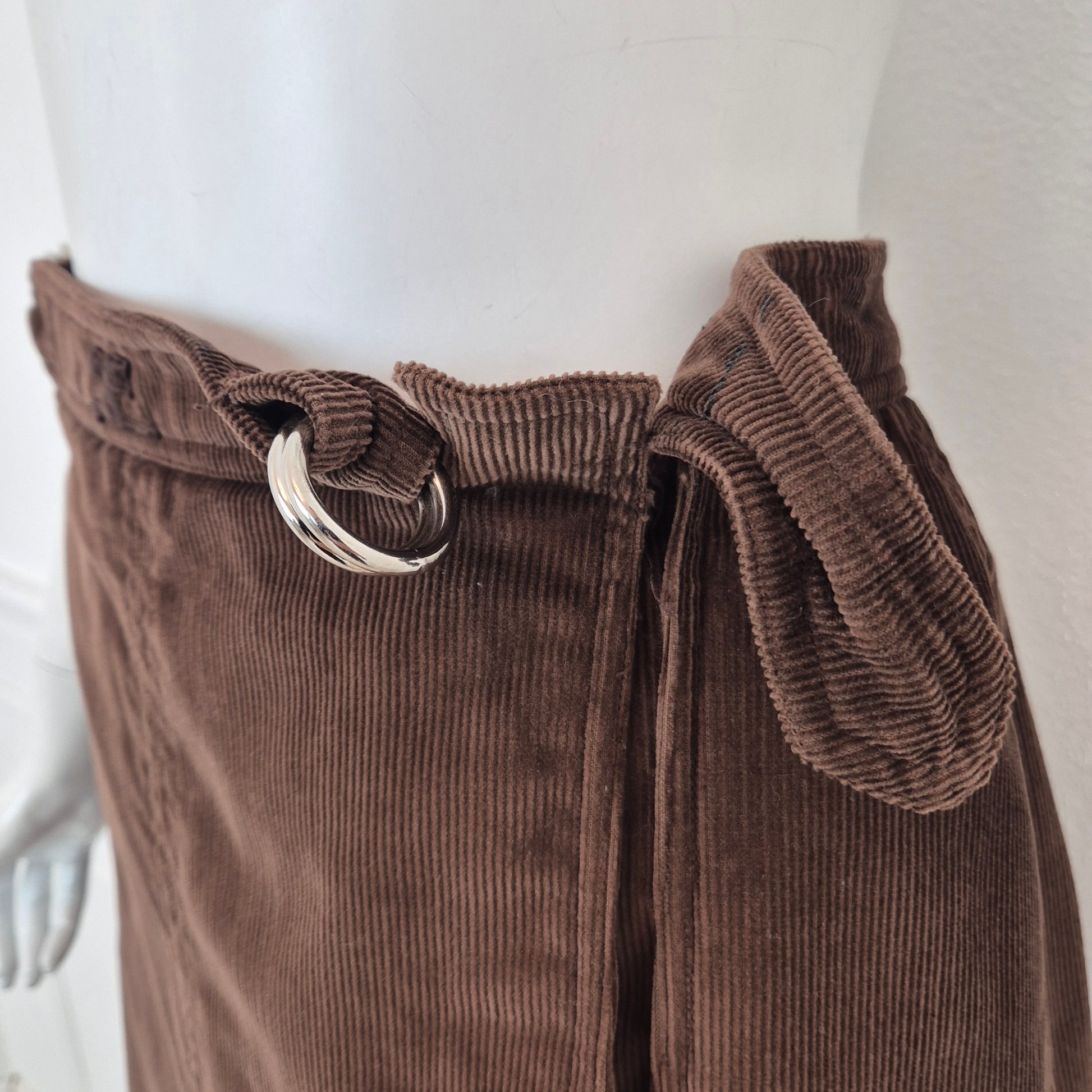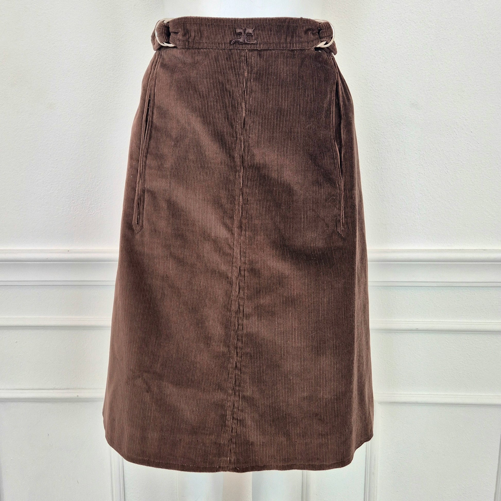 COURREGES gonna vintage in velluto a coste color marrone, con vita alta e particolare chiusura tramite due anelli in metallo, che si possono regolare sul punto vita.