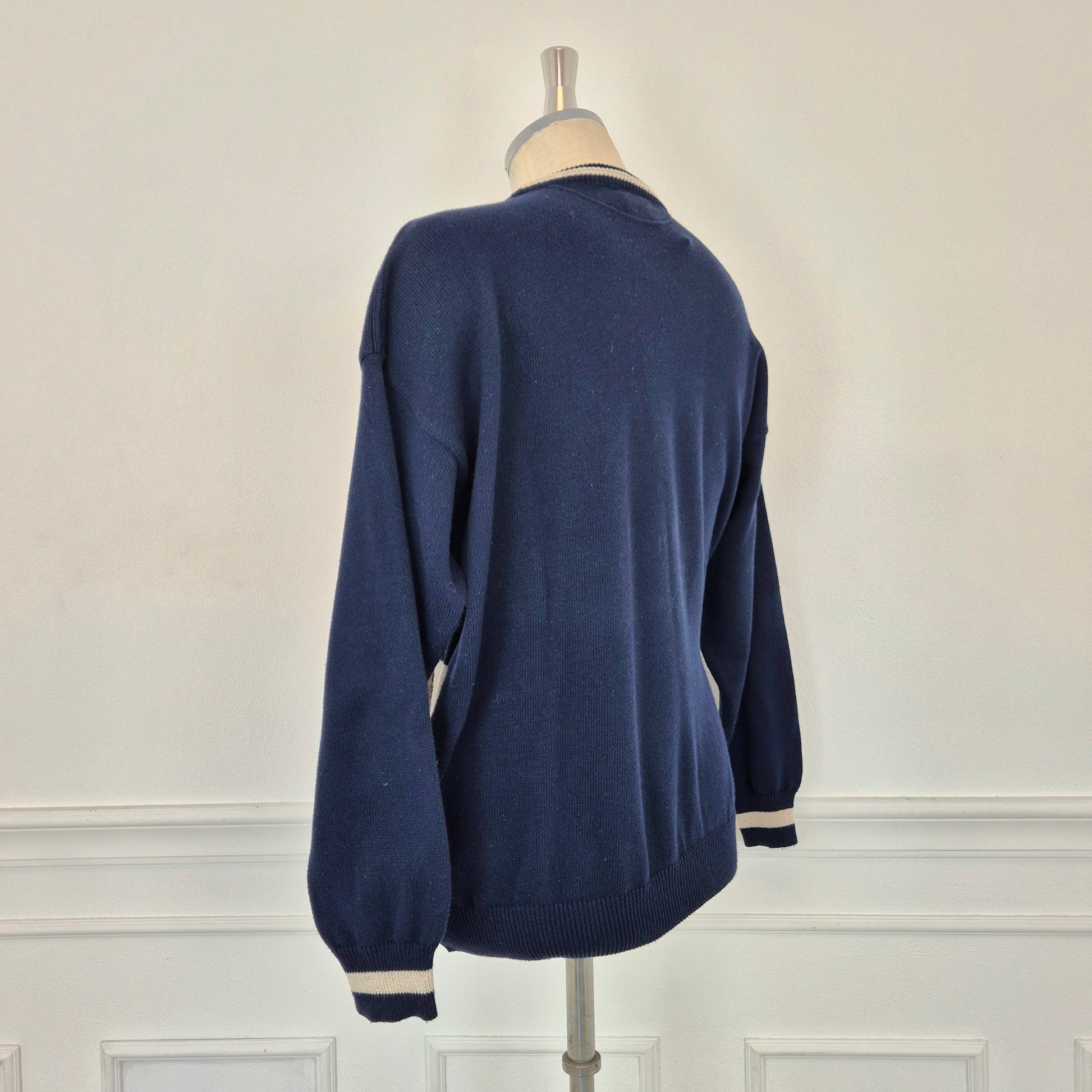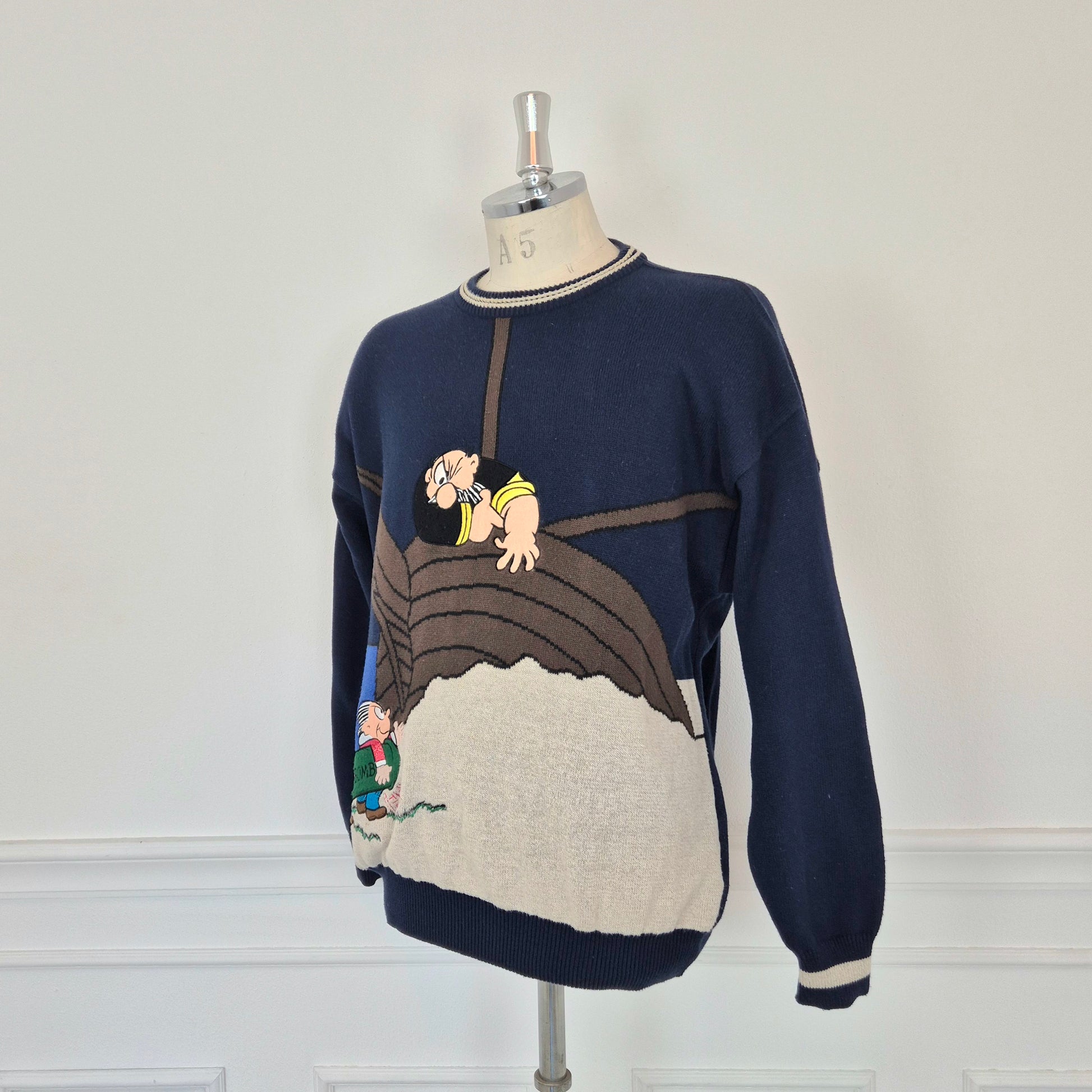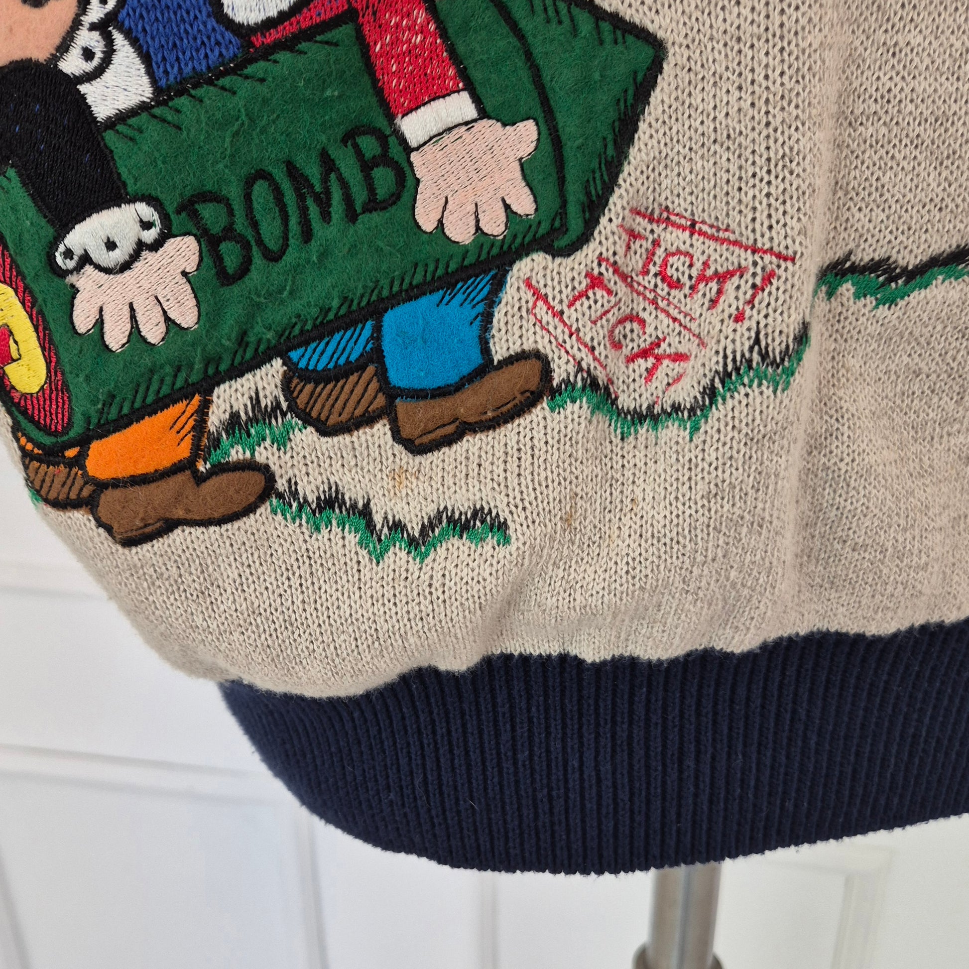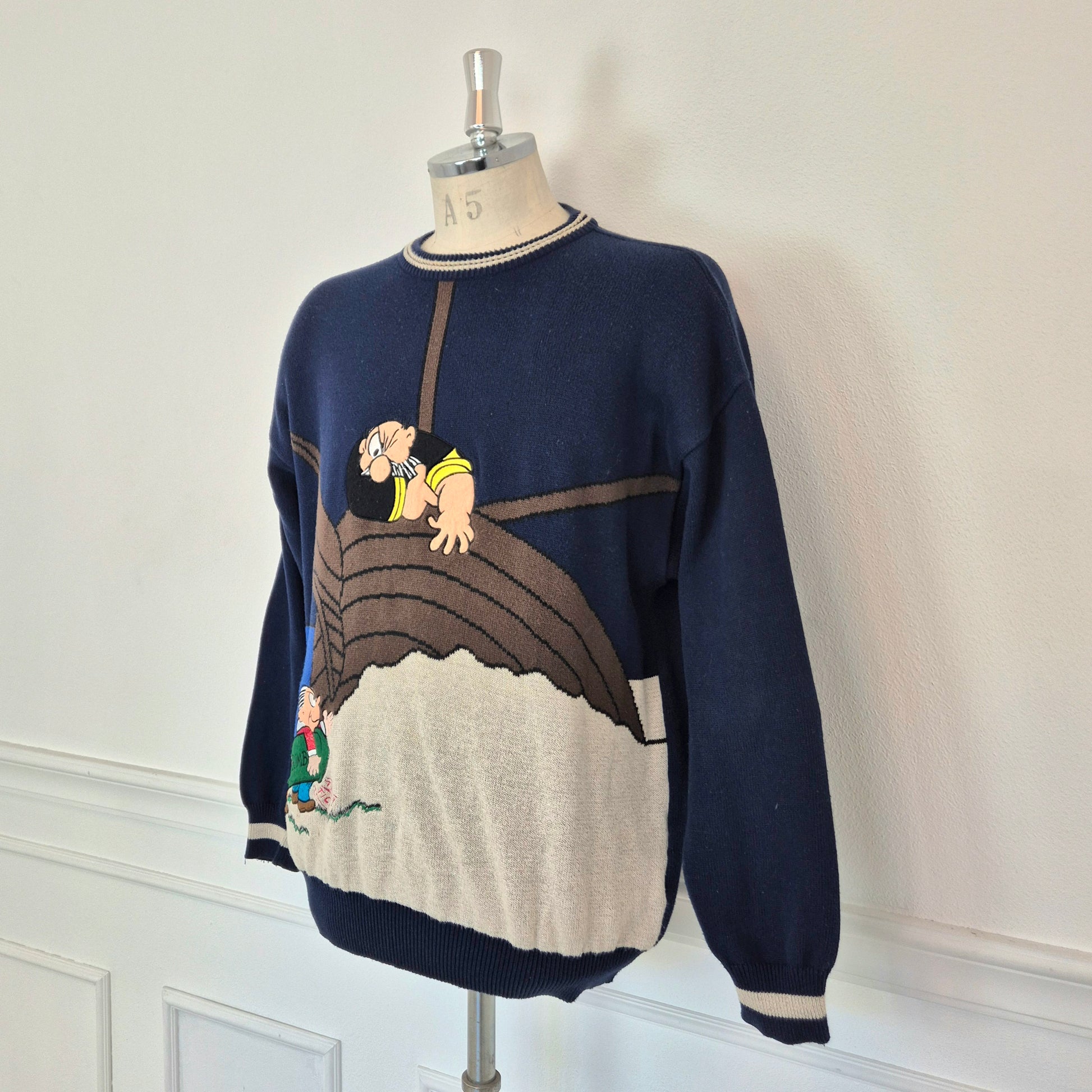 JC DE CASTELBAJAC maglione vintage (1991) in cotone, fondo blu e disegno frontale che riprende una scena dalla serie a fumetti "Bibì e Bibò".