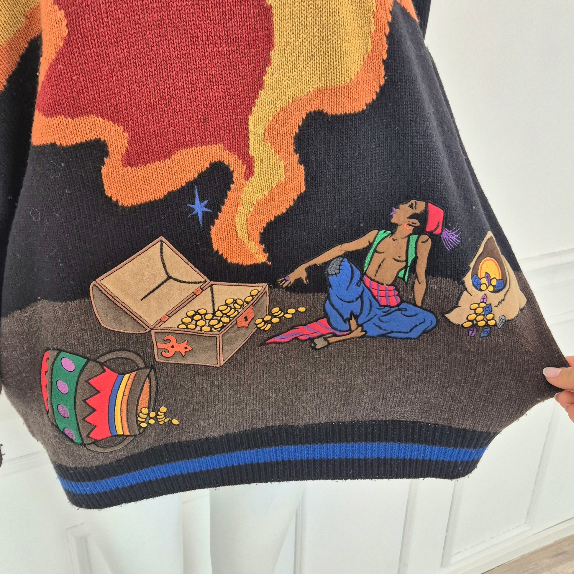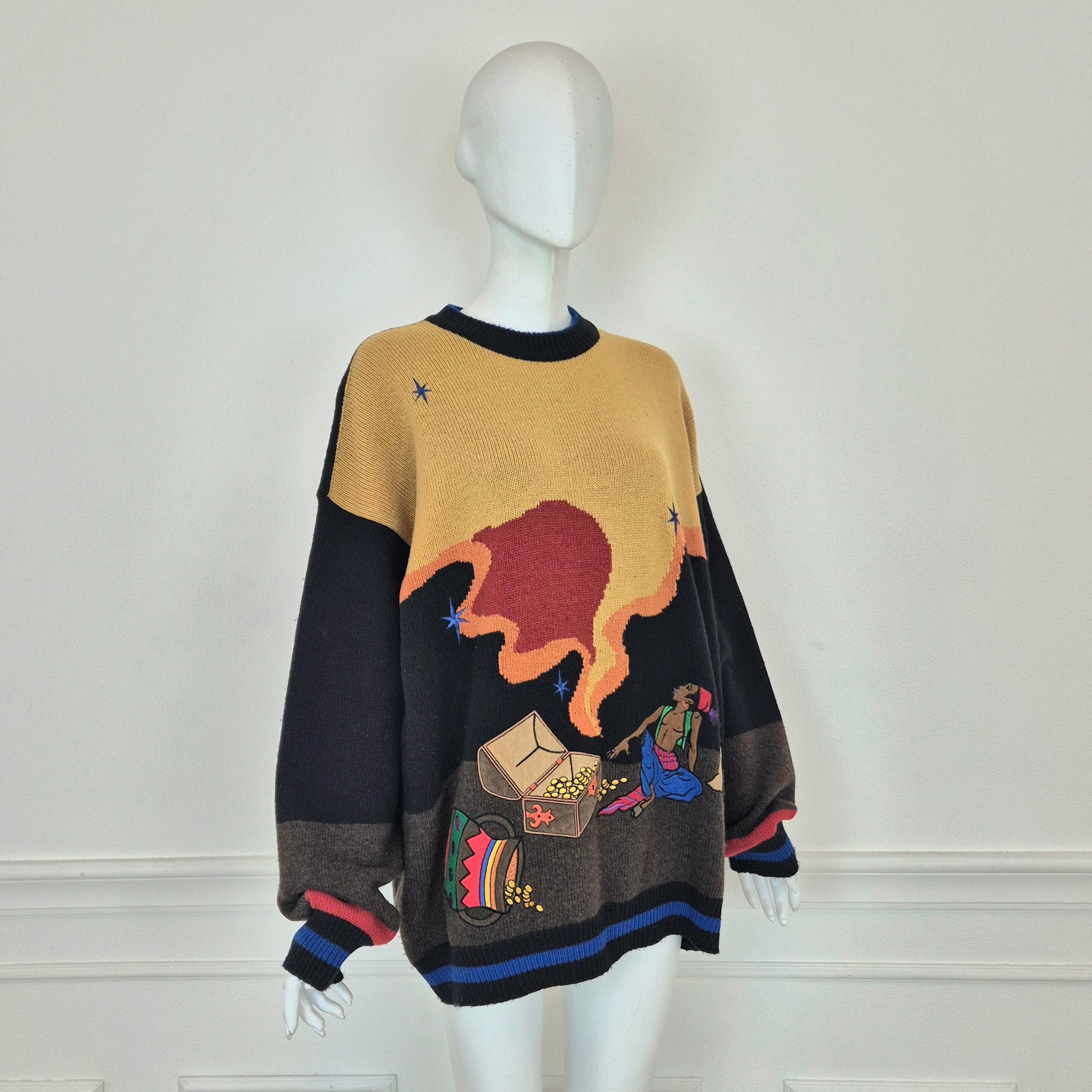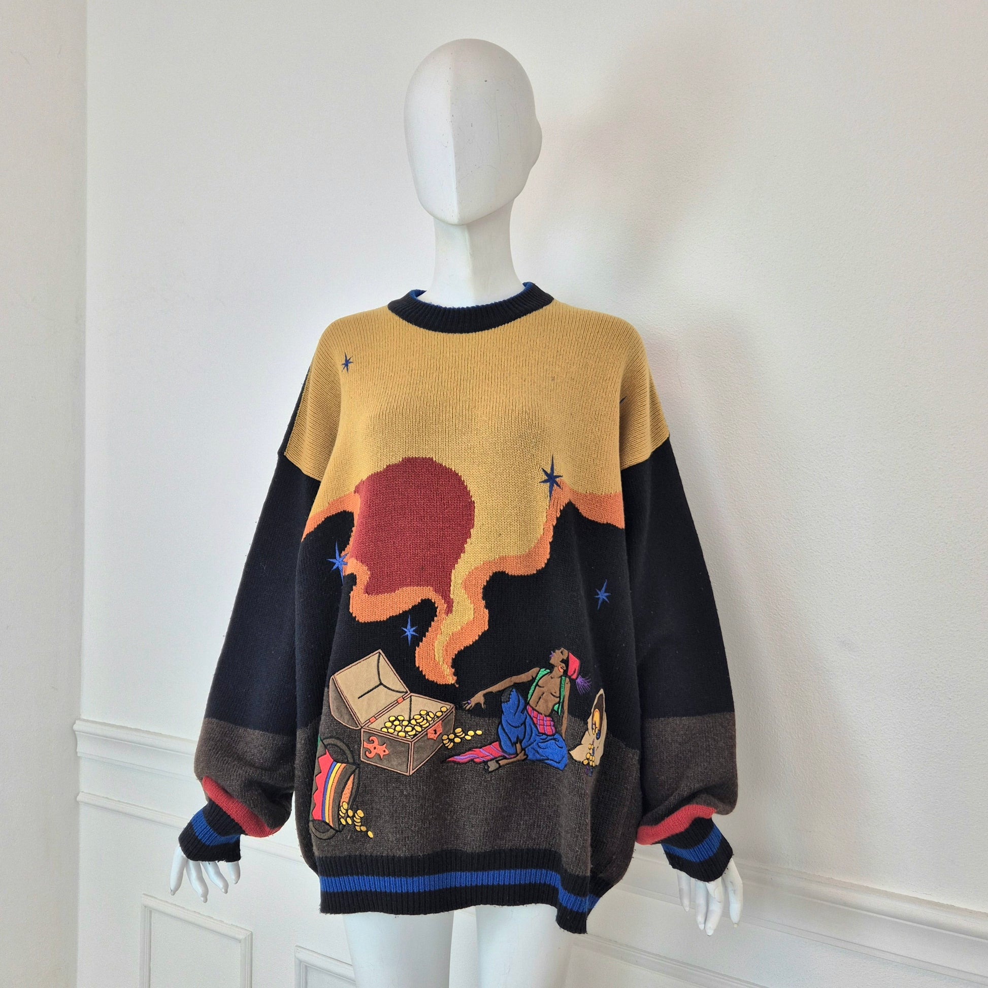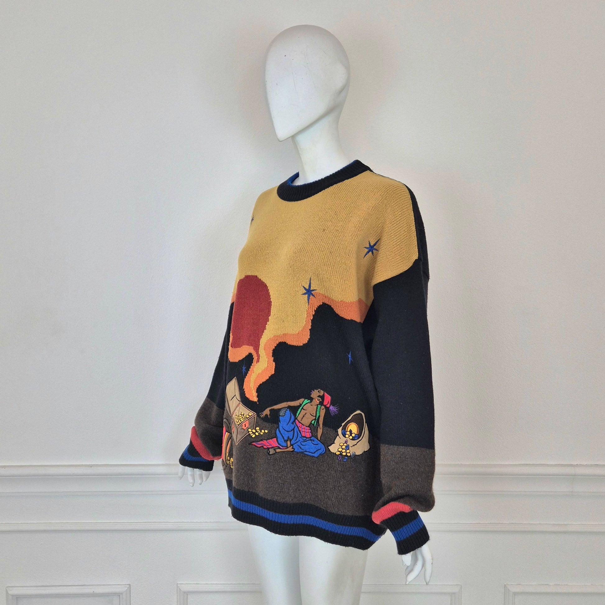 JC DE CASTELBAJAC maglione vintage anni '90 in lana e poliammide con soggetto Aladino.