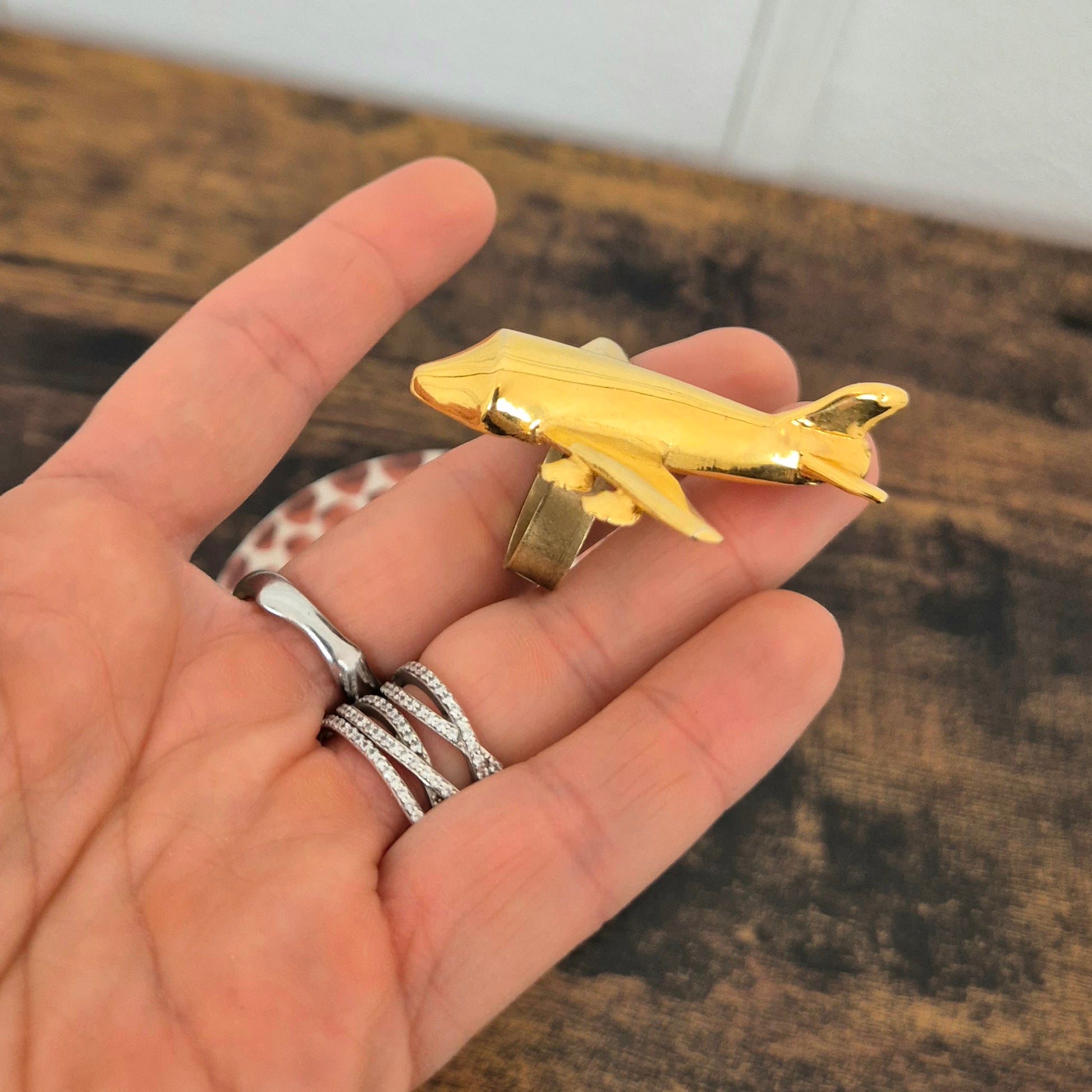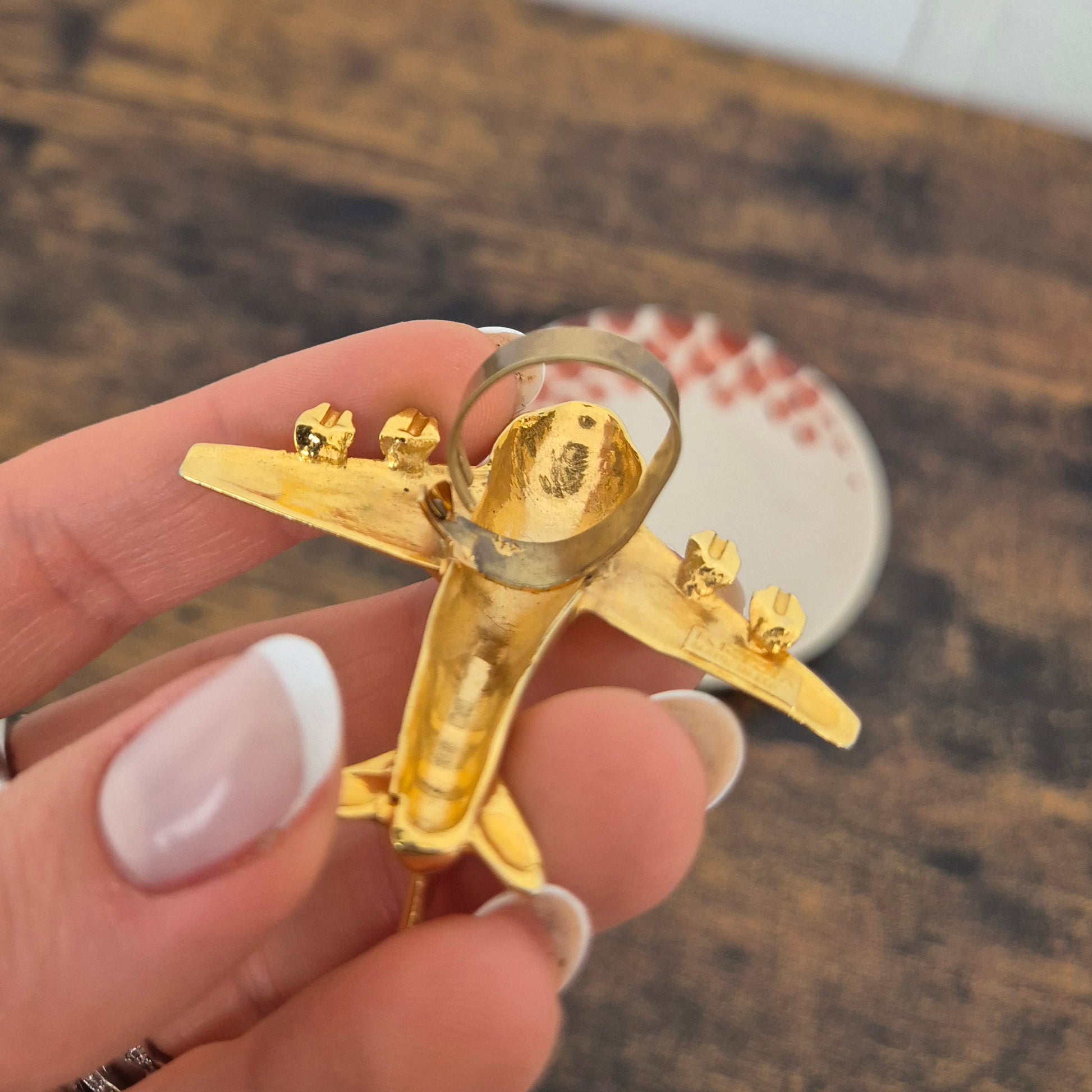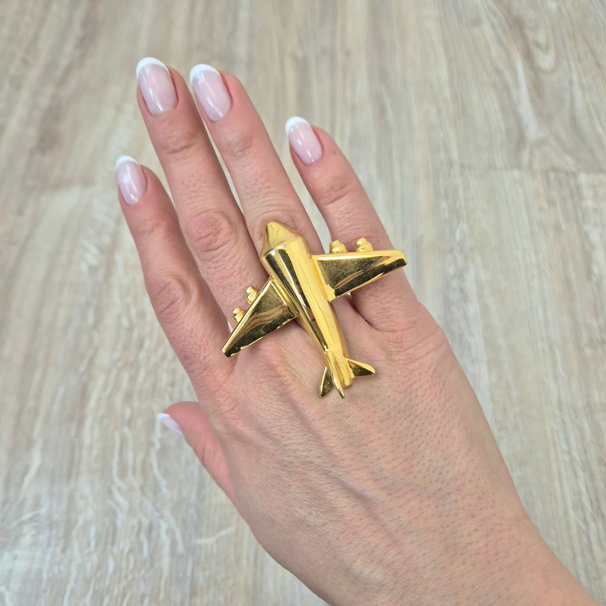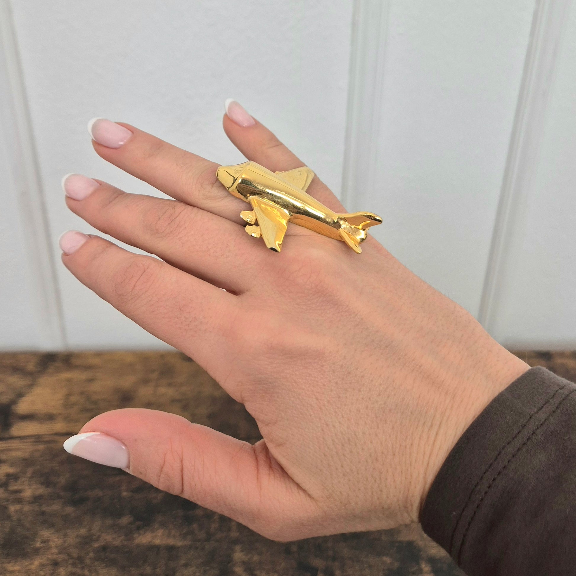 KRIZIA iconico maxi anello vintage in metallo dorato, raffigurante un grande aeroplano, caro all’immaginario di Maria (Mariuccia!) Mandelli.