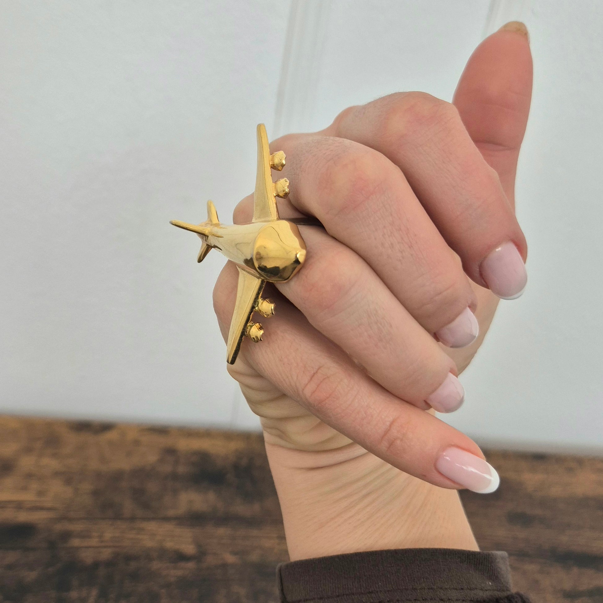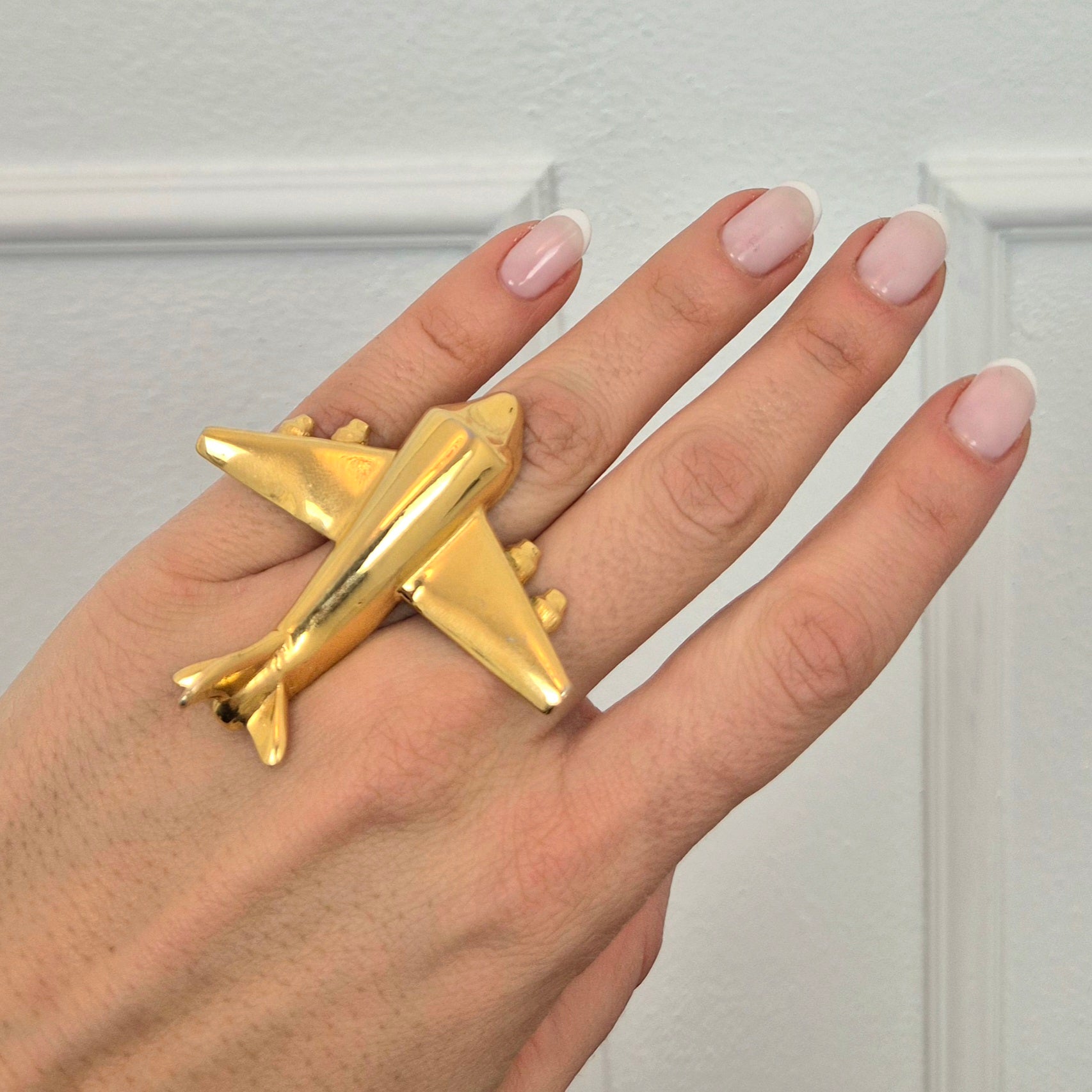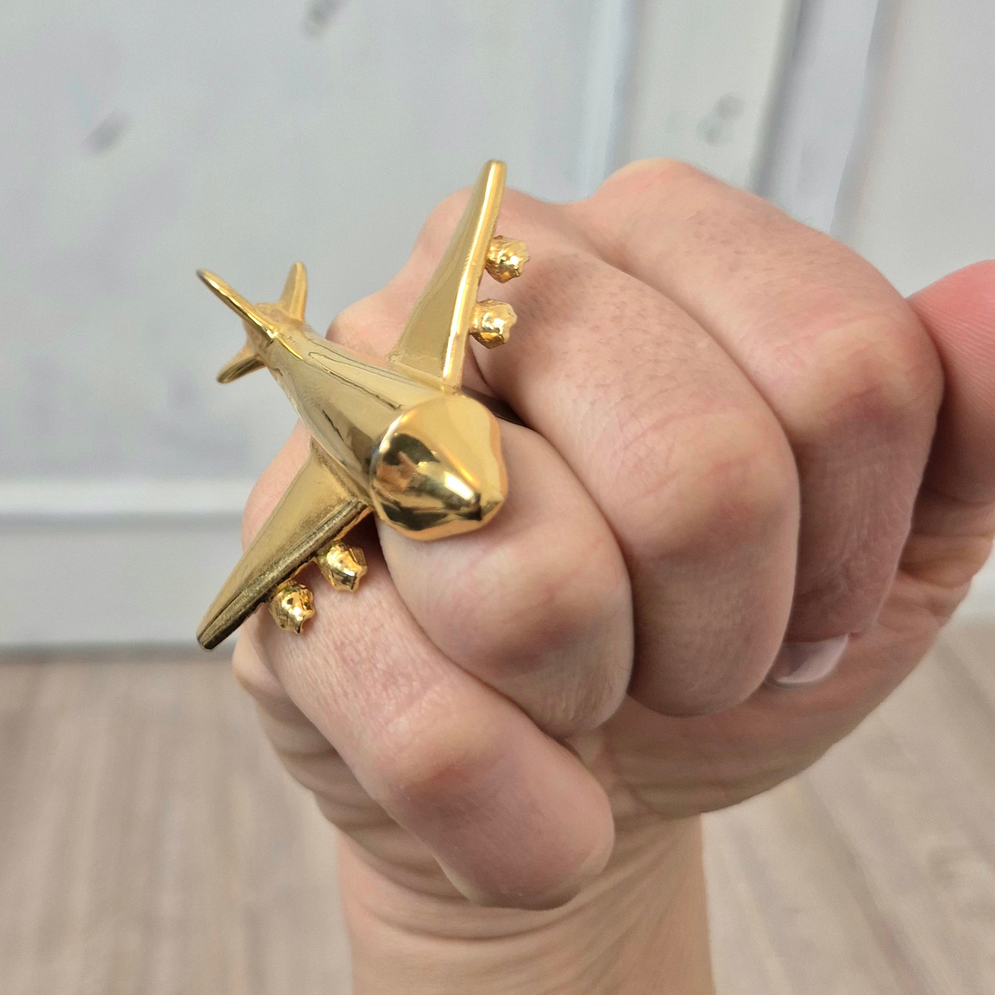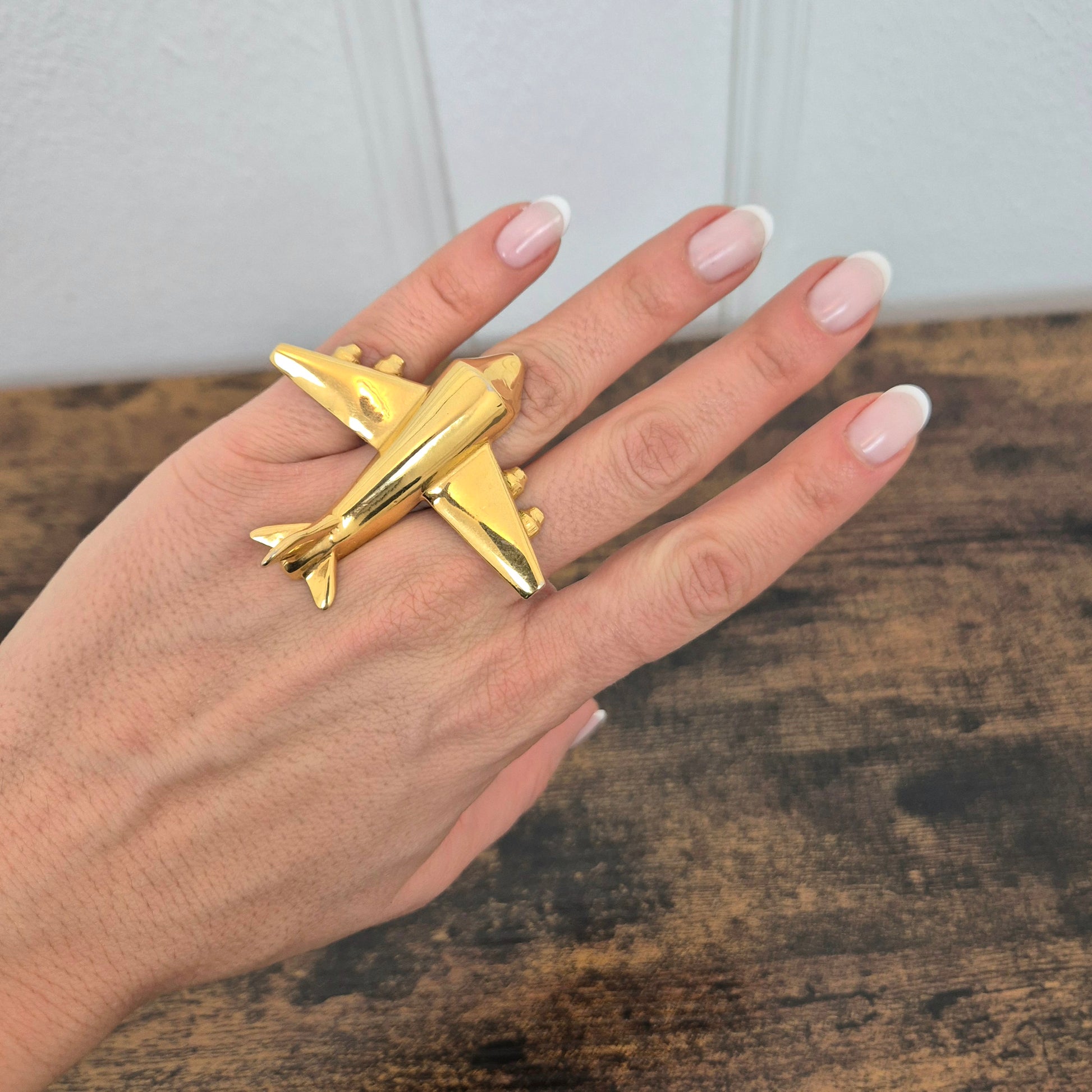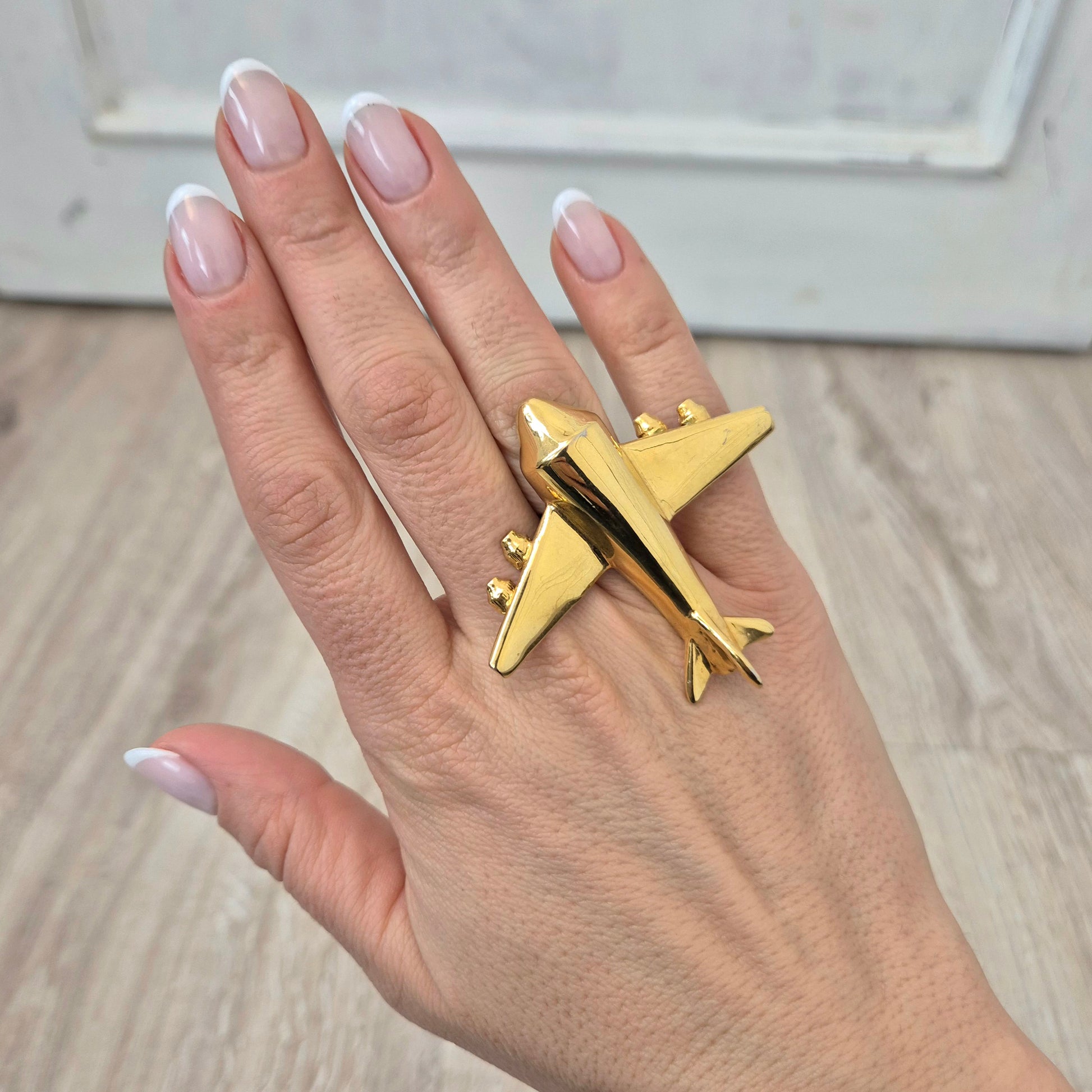 KRIZIA iconico maxi anello vintage in metallo dorato, raffigurante un grande aeroplano, caro all’immaginario di Maria (Mariuccia!) Mandelli.