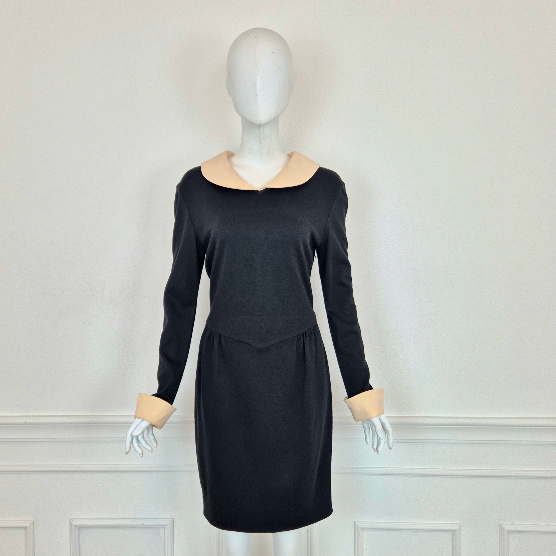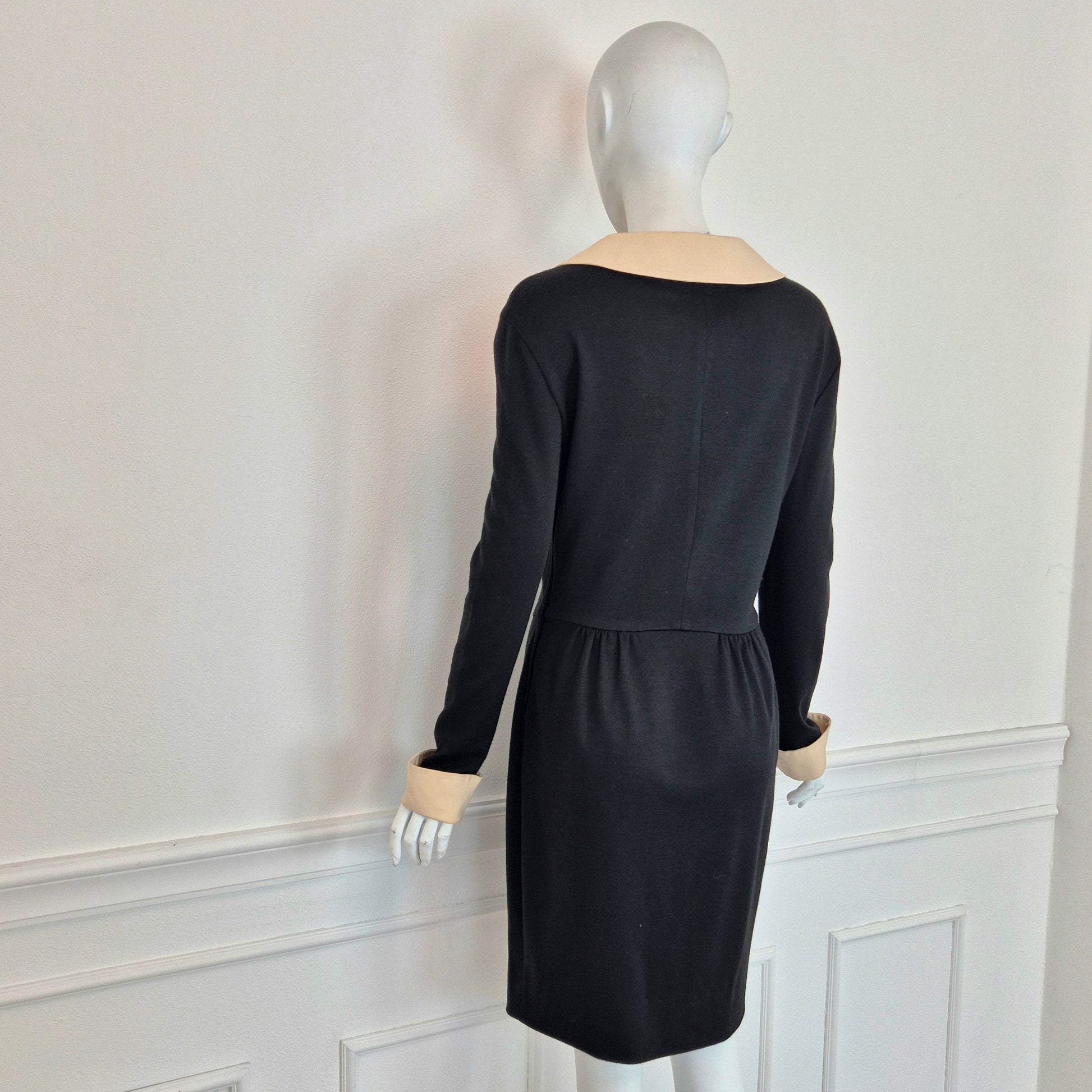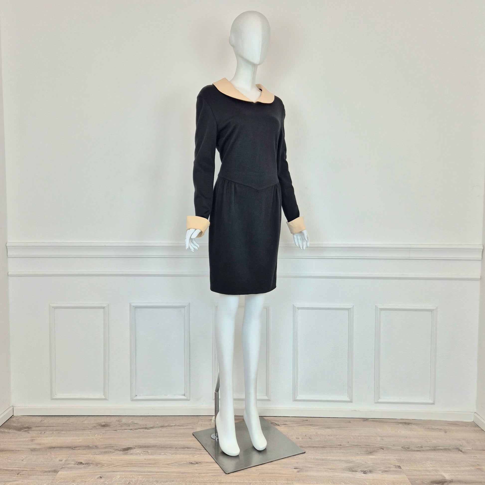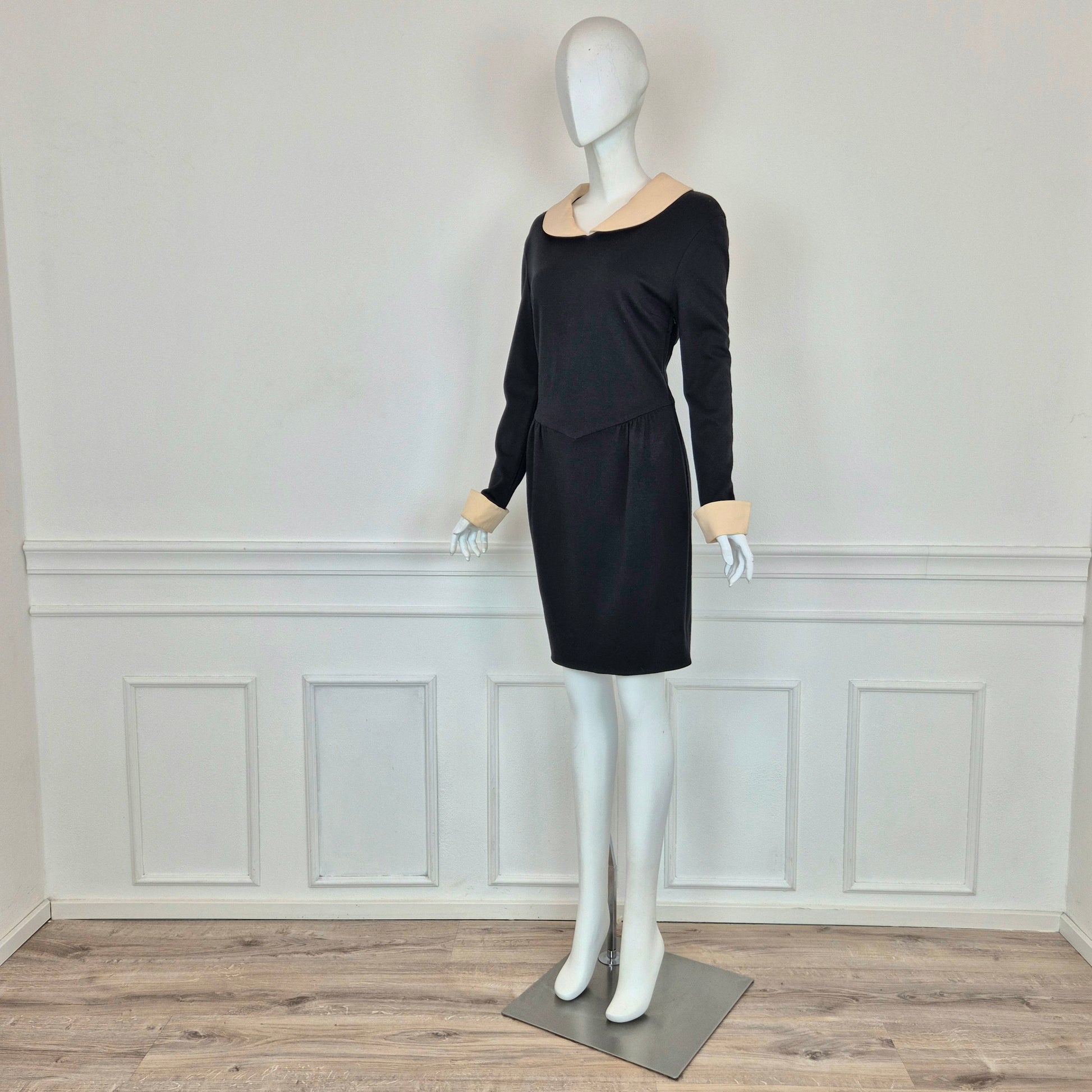 MOSCHINO CHEAP AND CHIC abito vintage a cavallo tra fine degli anni '80 ed i primissimi anni '90, in misto lana nero con colletto e polsini in cady color burro. Modello iconico, riporta subito alla mente Olivia.