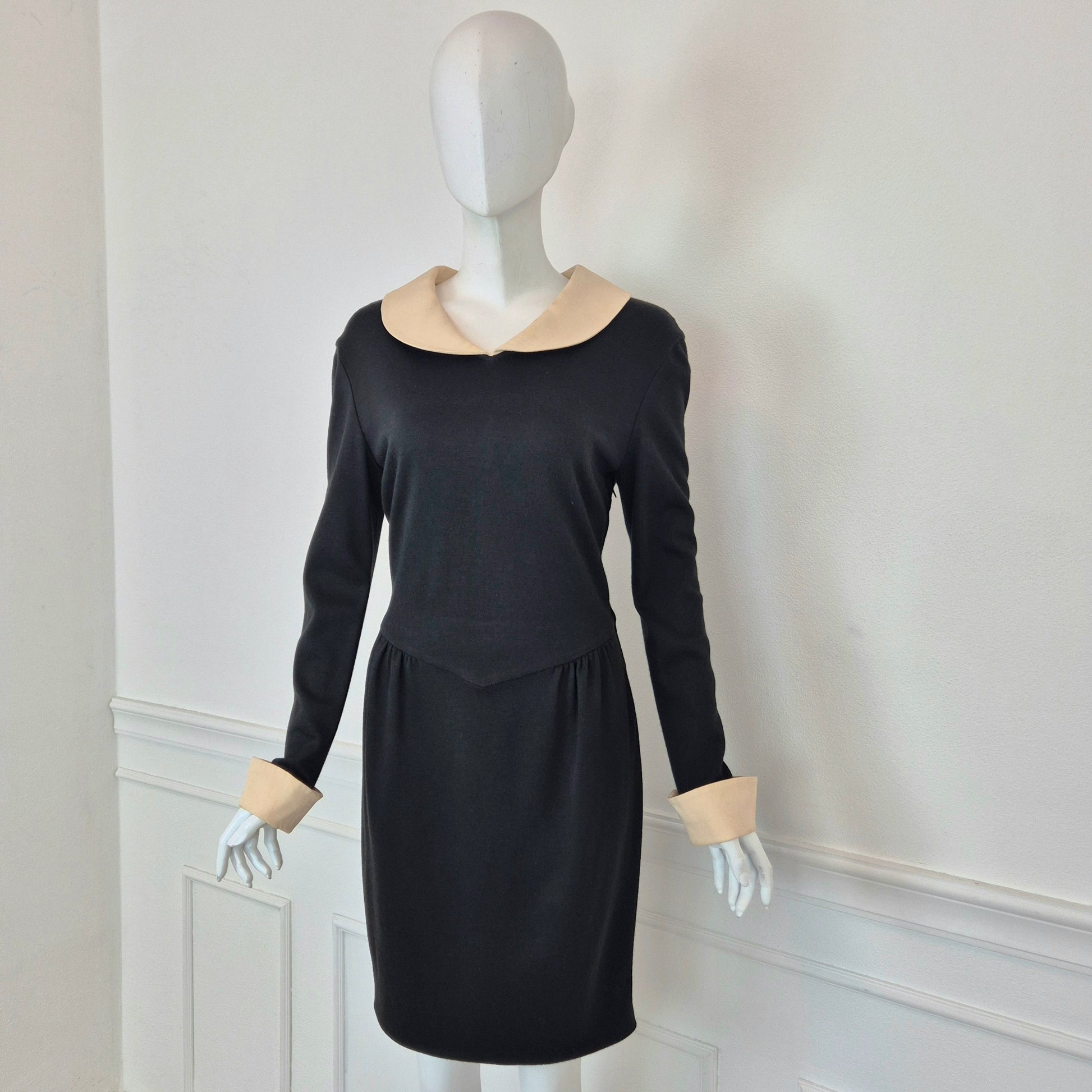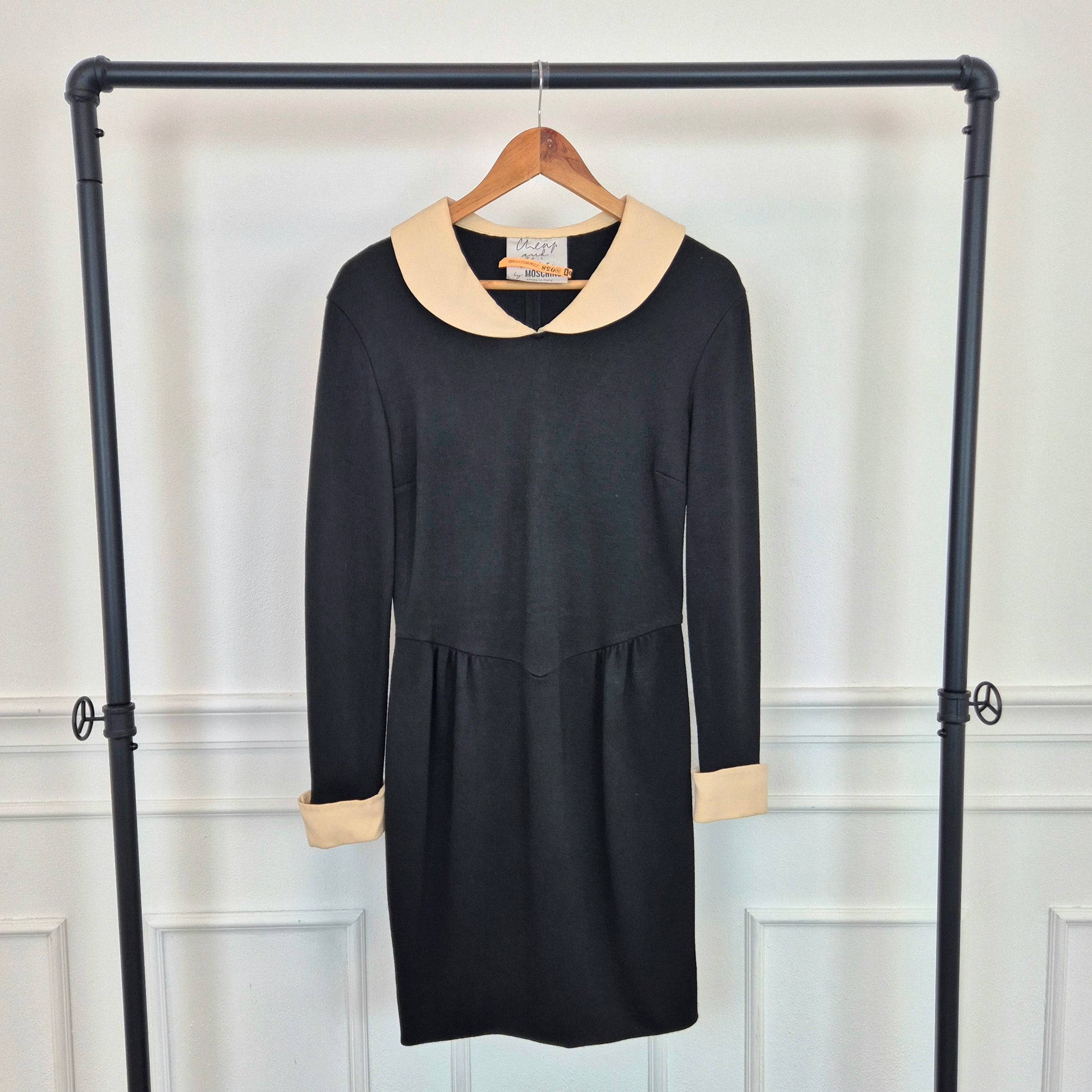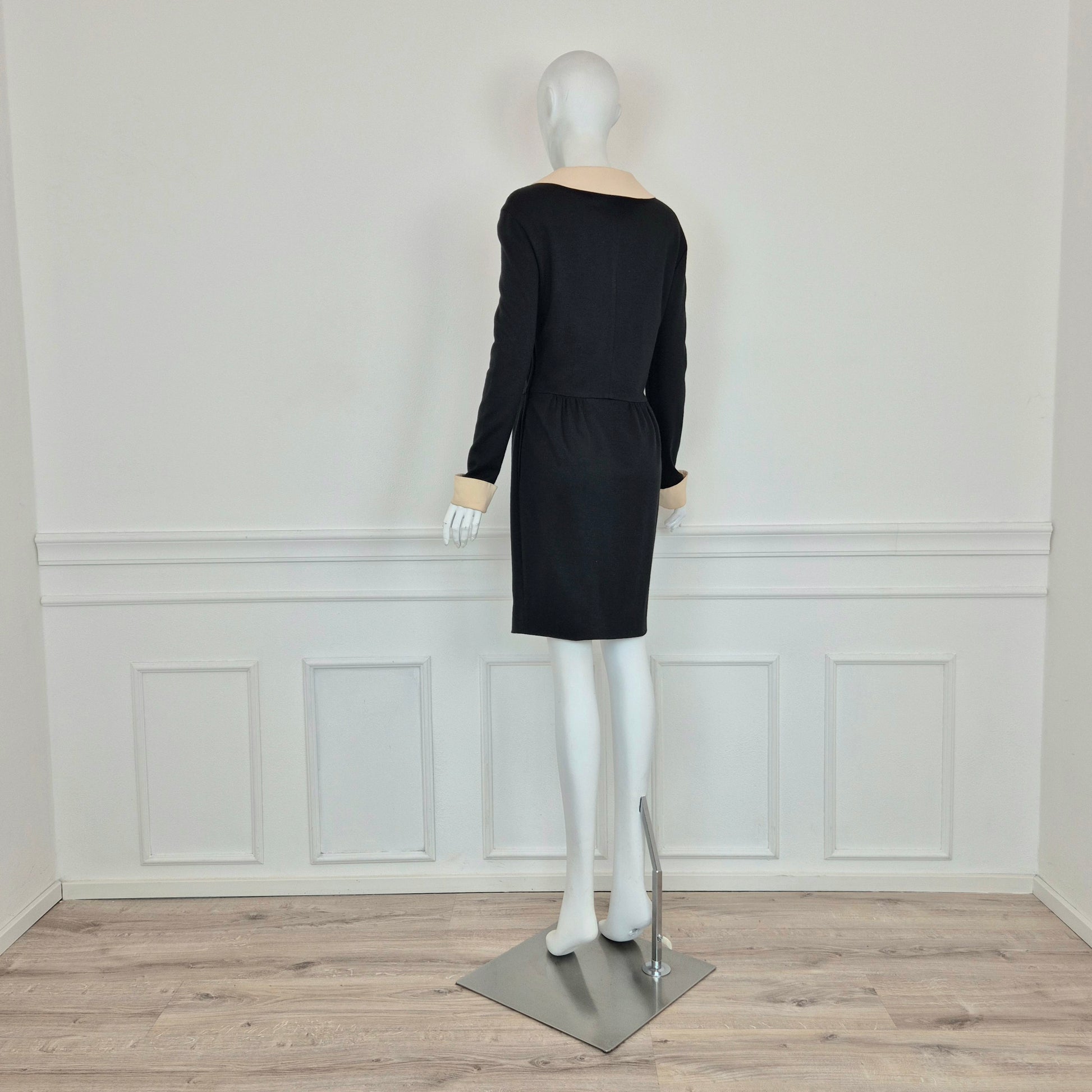 MOSCHINO CHEAP AND CHIC abito vintage a cavallo tra fine degli anni '80 ed i primissimi anni '90, in misto lana nero con colletto e polsini in cady color burro. Modello iconico, riporta subito alla mente Olivia.