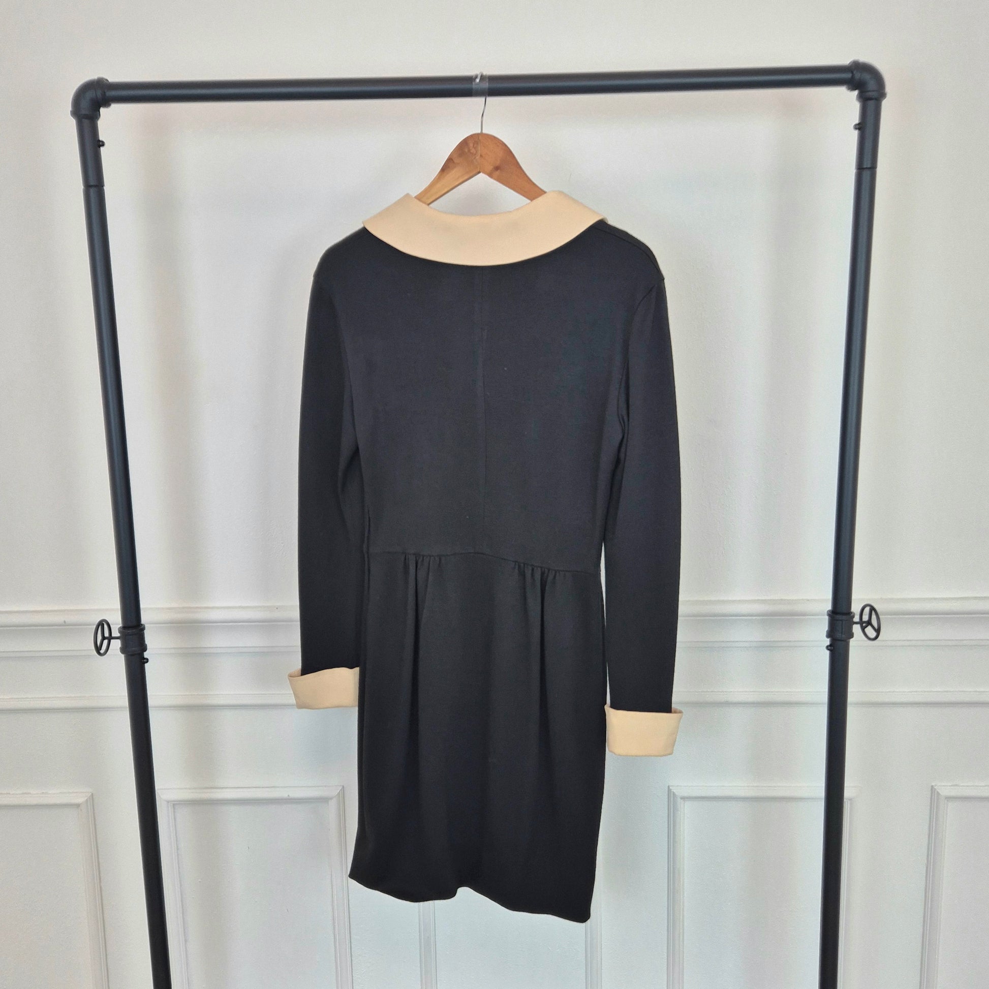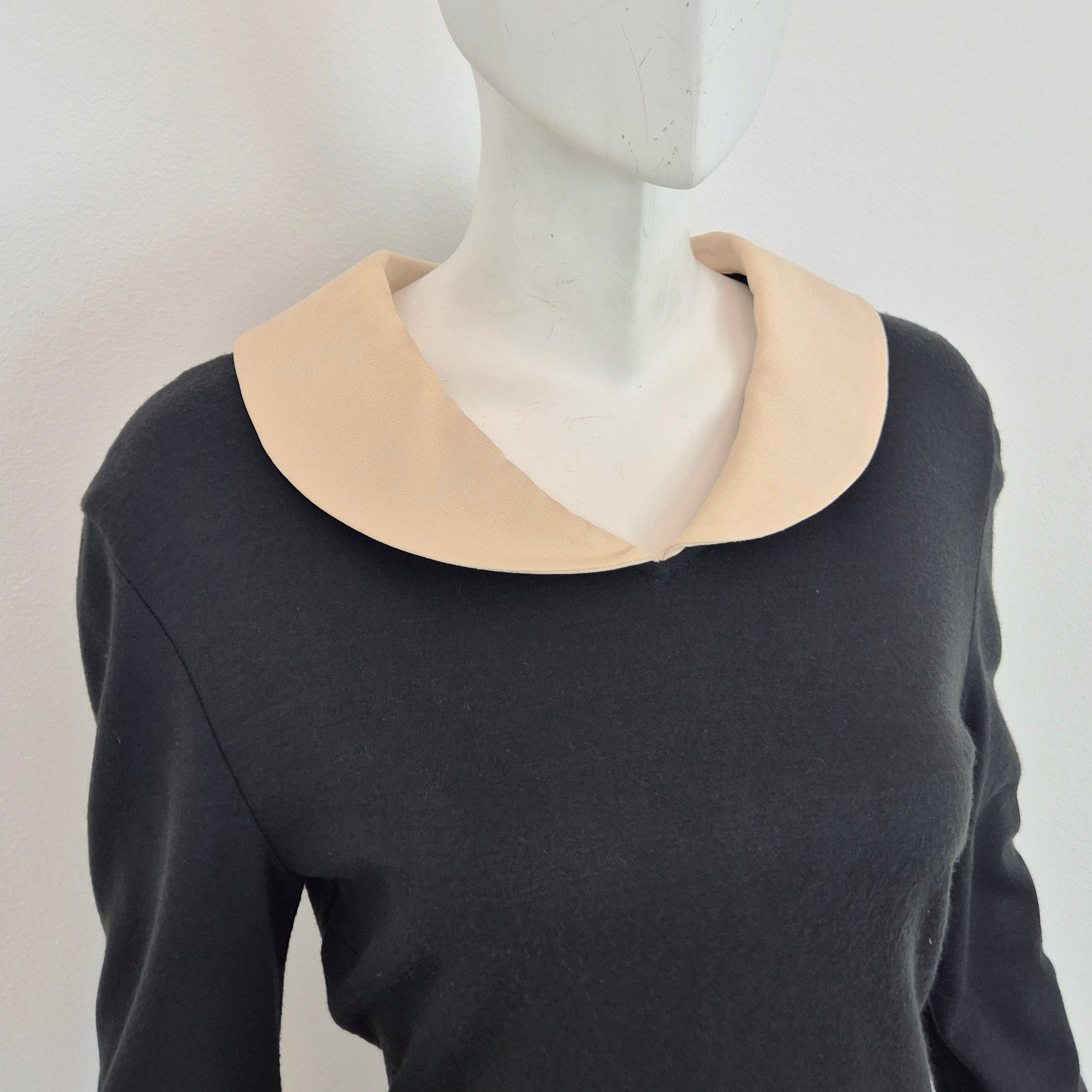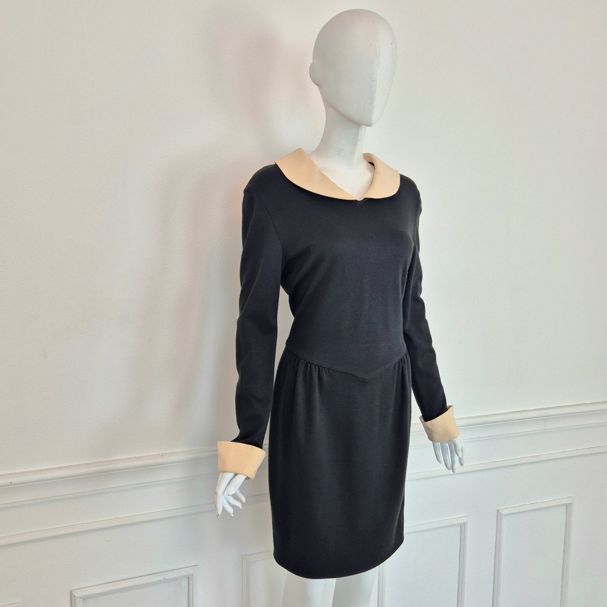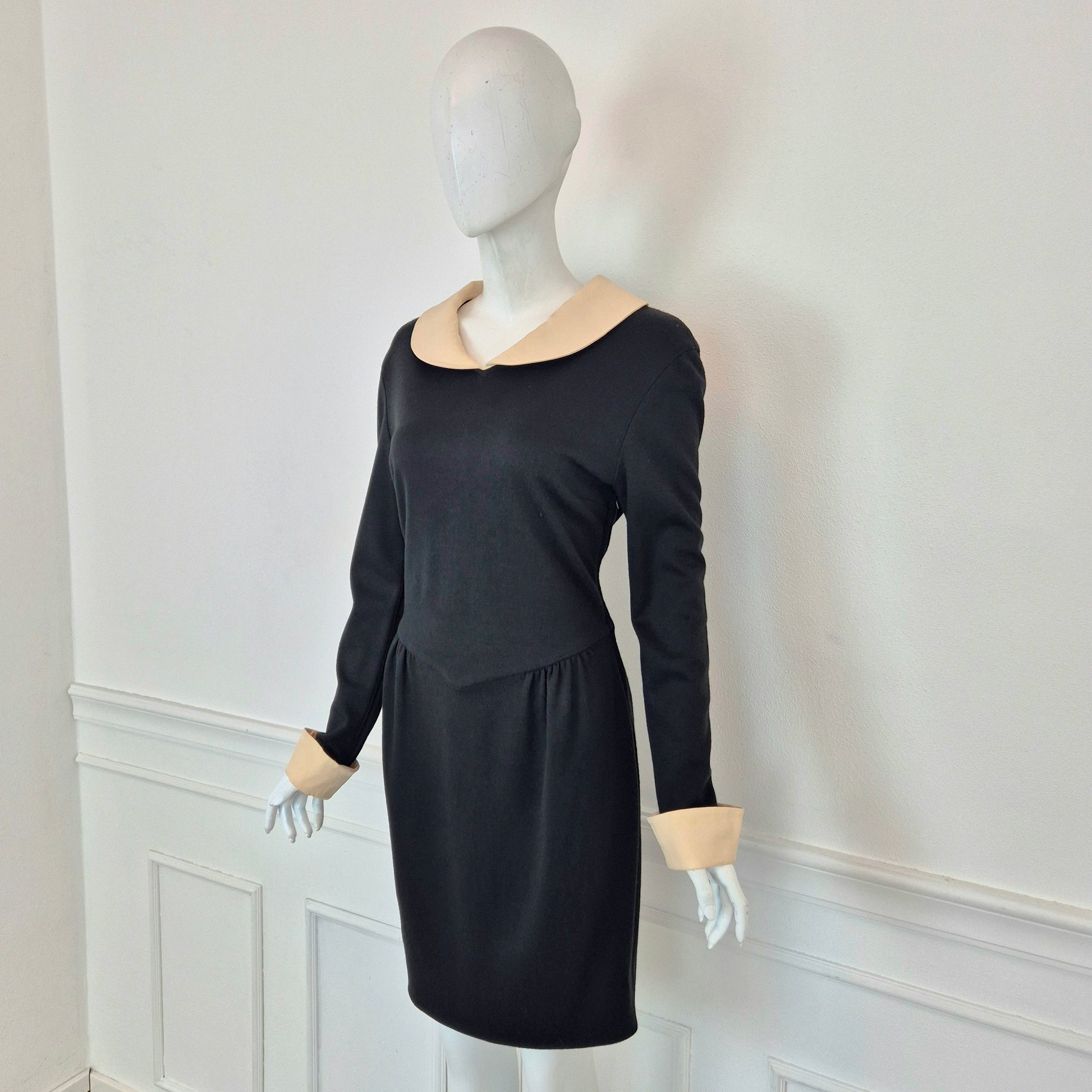 MOSCHINO CHEAP AND CHIC abito vintage a cavallo tra fine degli anni '80 ed i primissimi anni '90, in misto lana nero con colletto e polsini in cady color burro. Modello iconico, riporta subito alla mente Olivia.