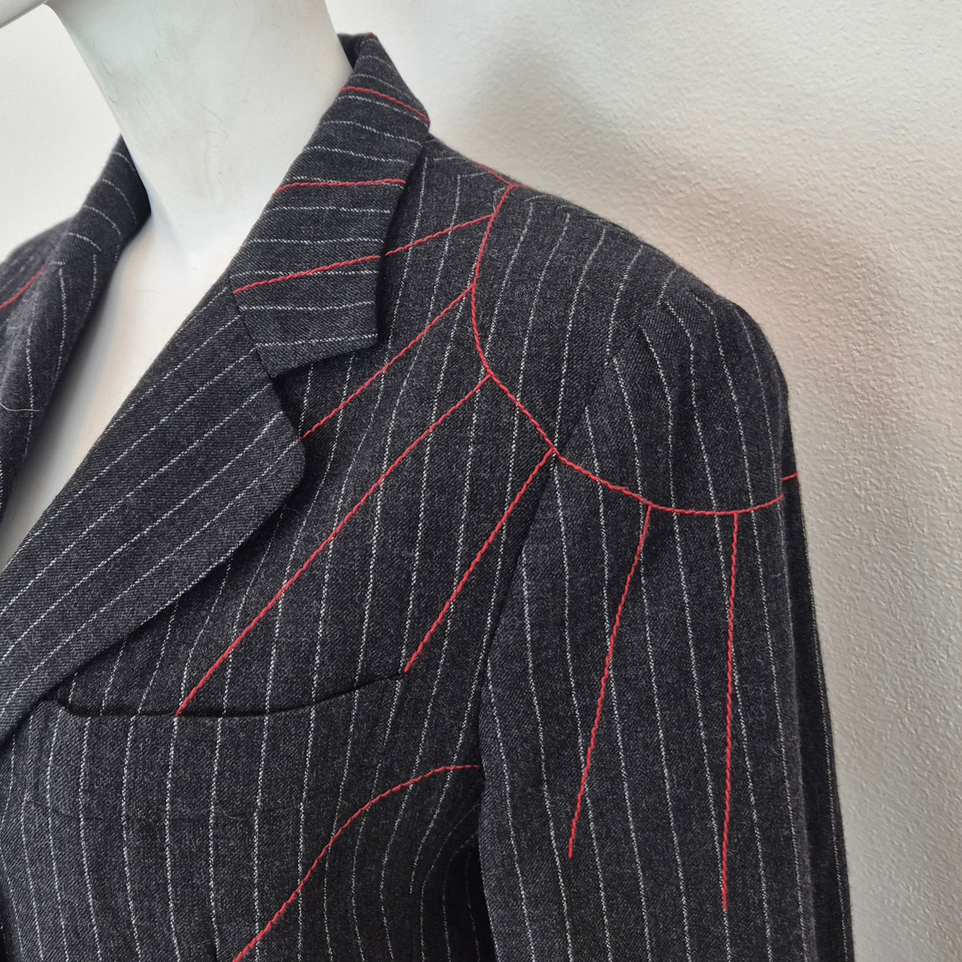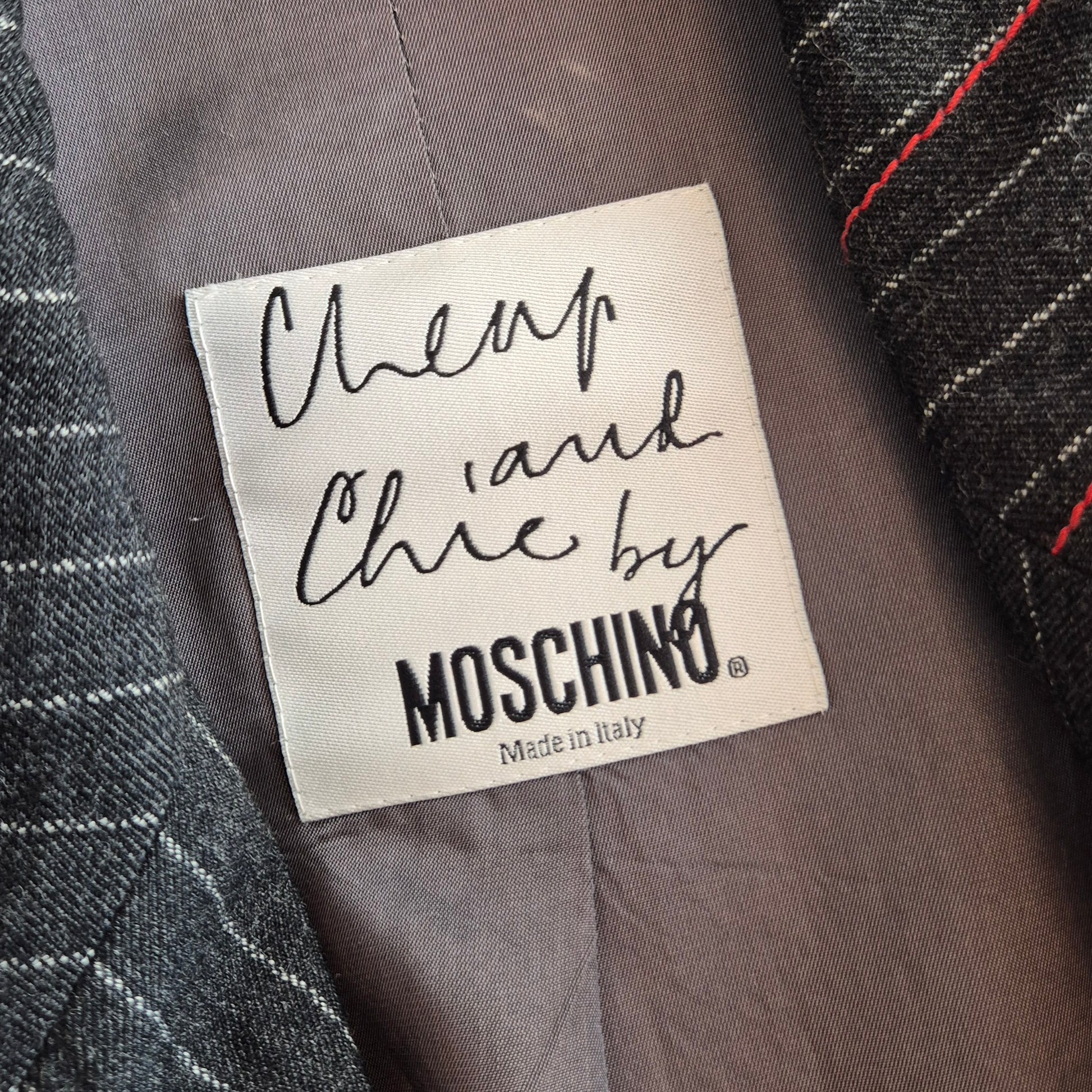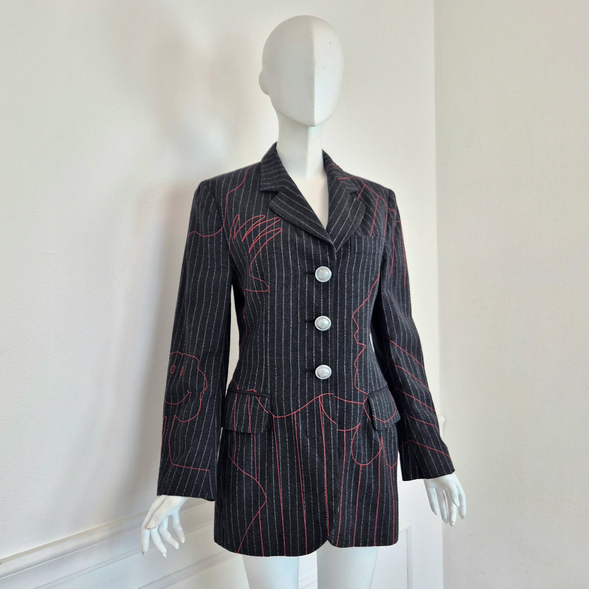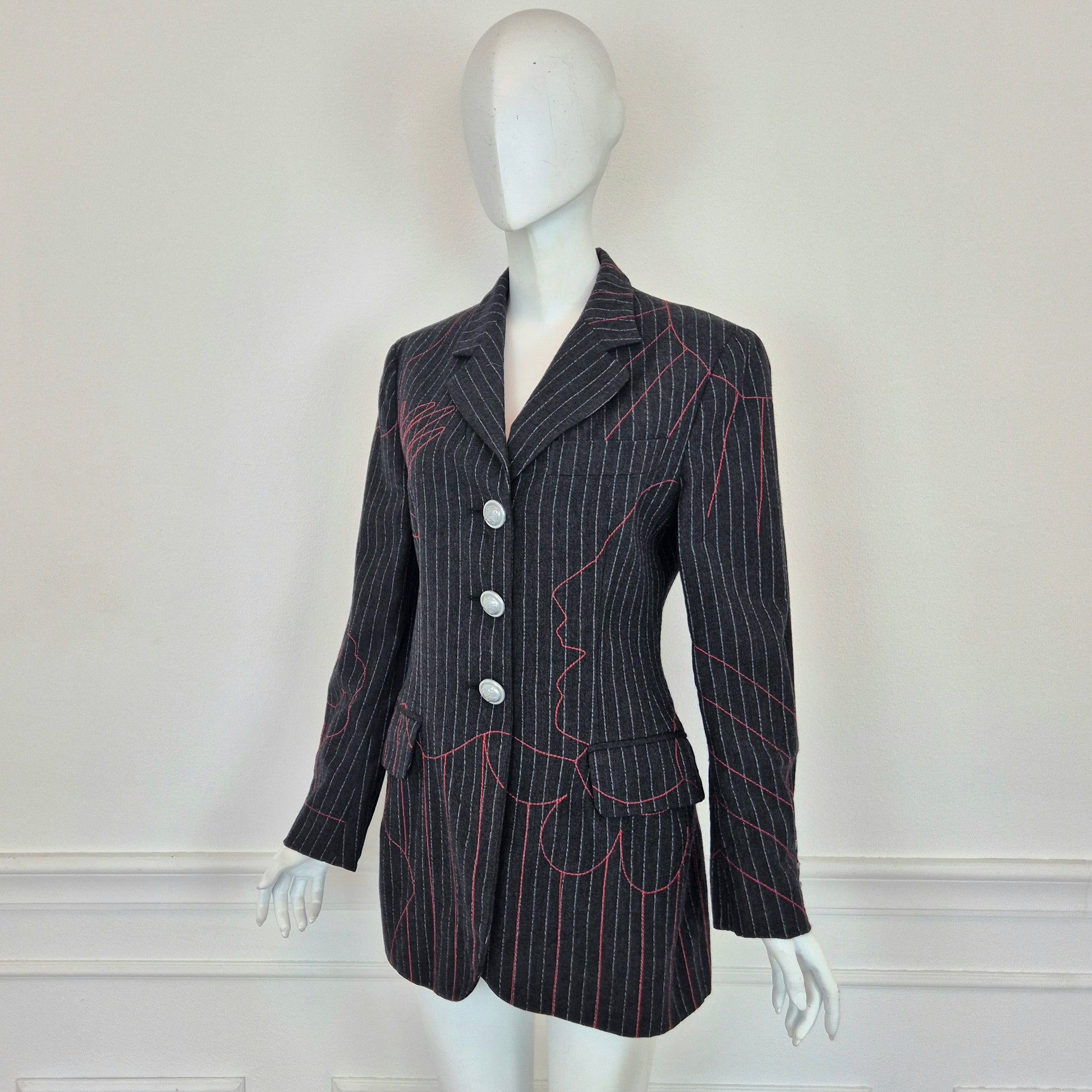 MOSCHINO CHEAP AND CHIC blazer vintage anni '90 in pura lana, tessuto gessato sui toni classici del grigio scuro e del bianco, con ricami rossi in pieno stile Franco Moschino: la sagoma di Olivia si riconosce sul davanti, un sole su di una spalla ed un albero sulla manica opposta, per finire con la schiena.