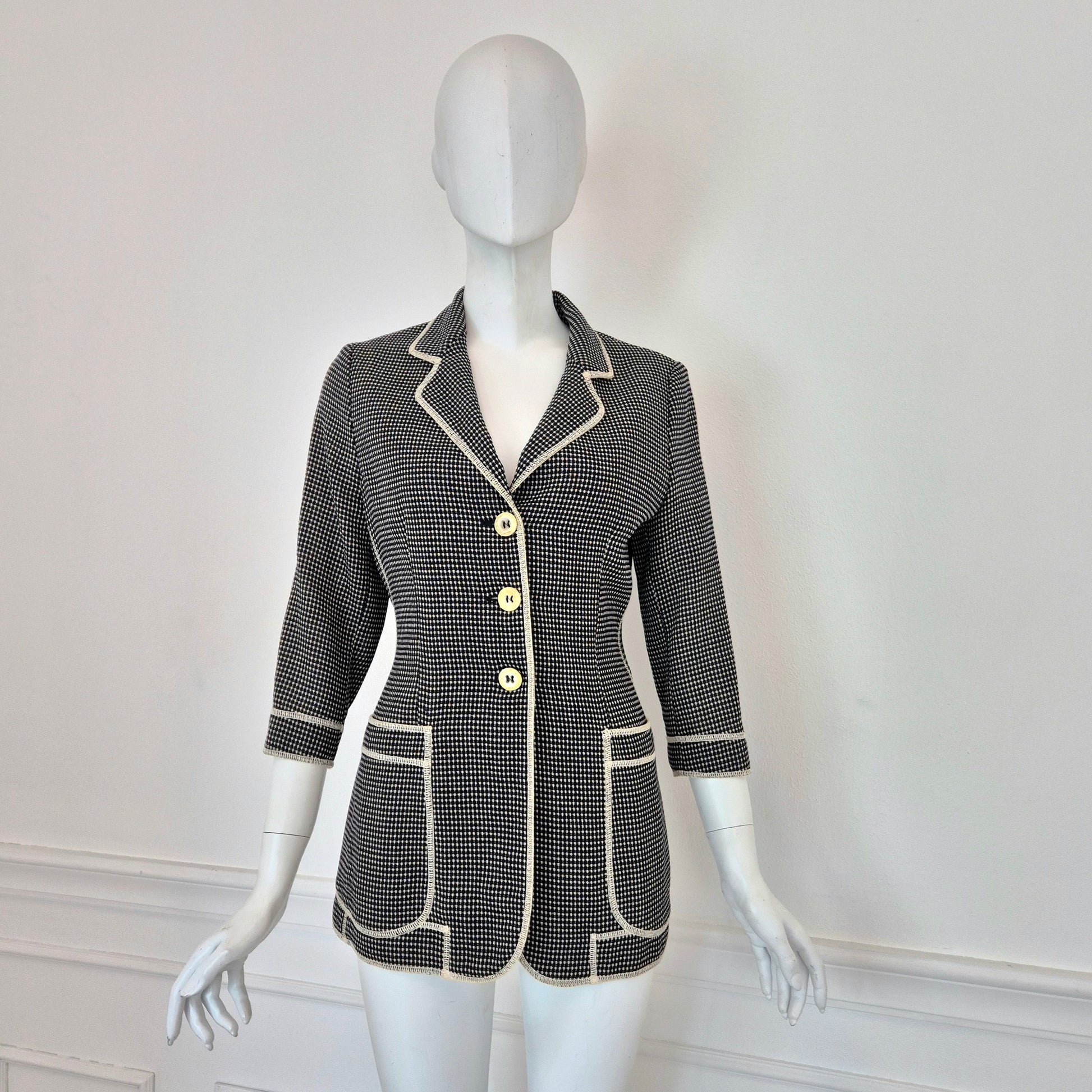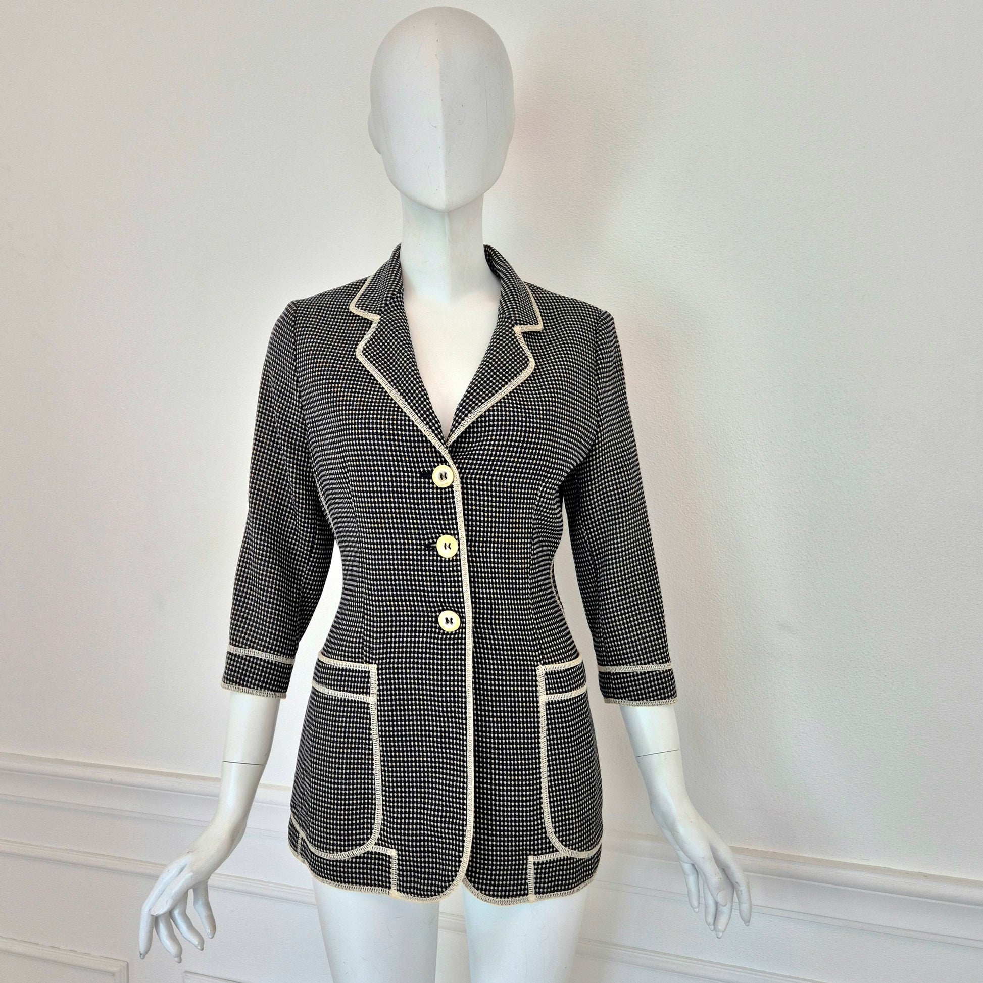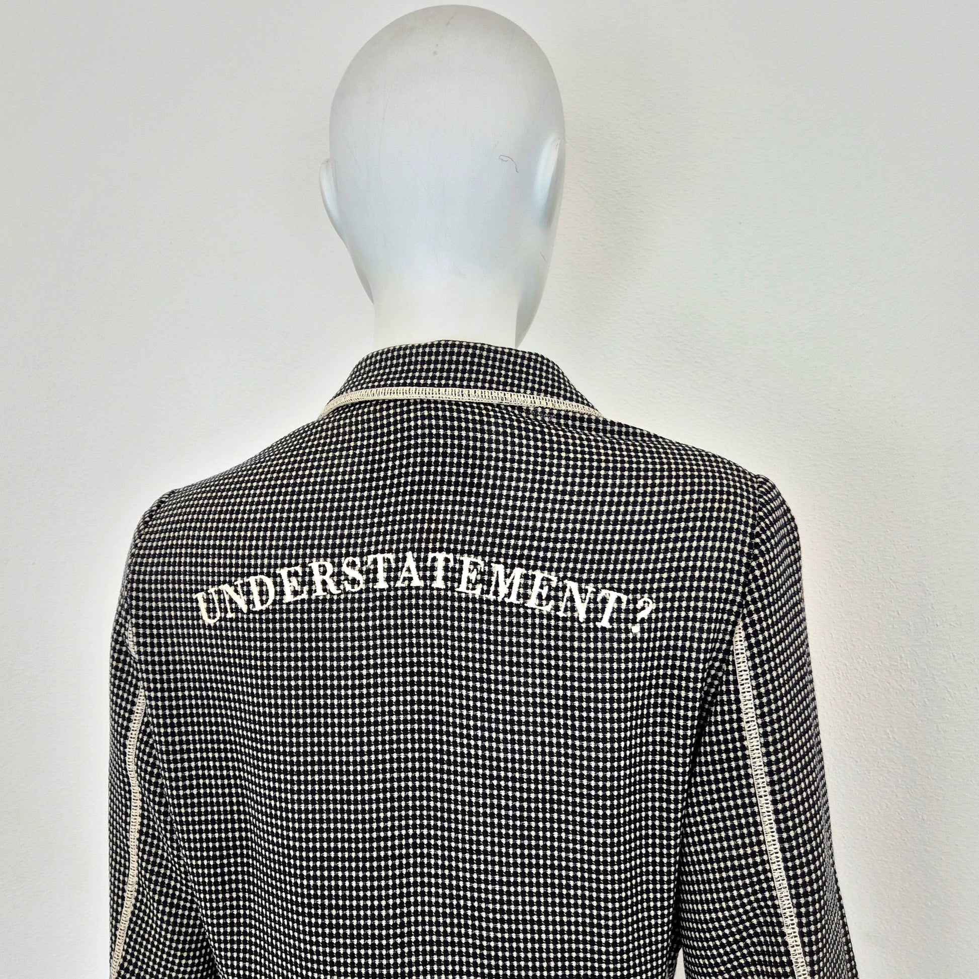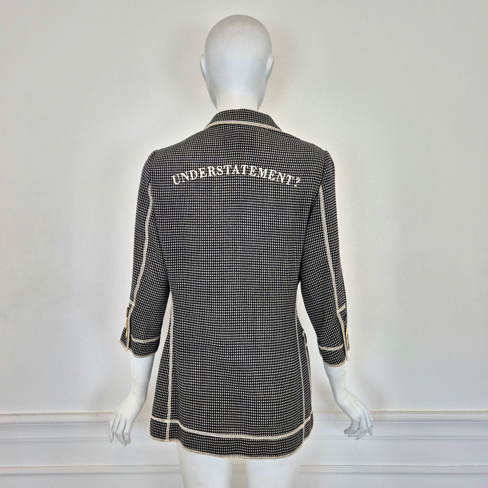 MOSCHINO COUTURE giacca blazer vintage anni '90 dal tessuto a microquadretti bianco-nero con cuciture e bottoni bianchi a contrasto e manica a tre quarti. Sul retro la scritta ricamata "Understatement?"