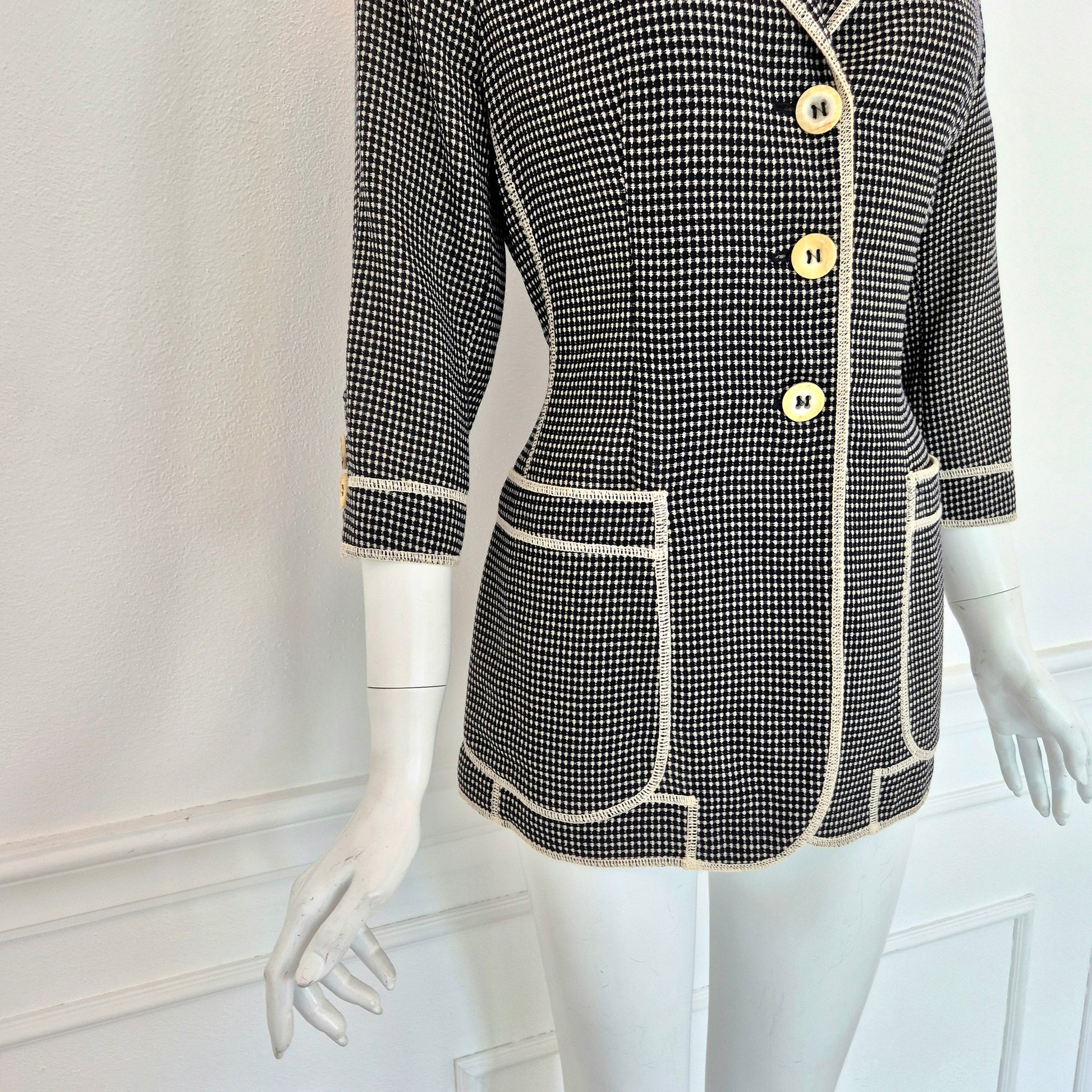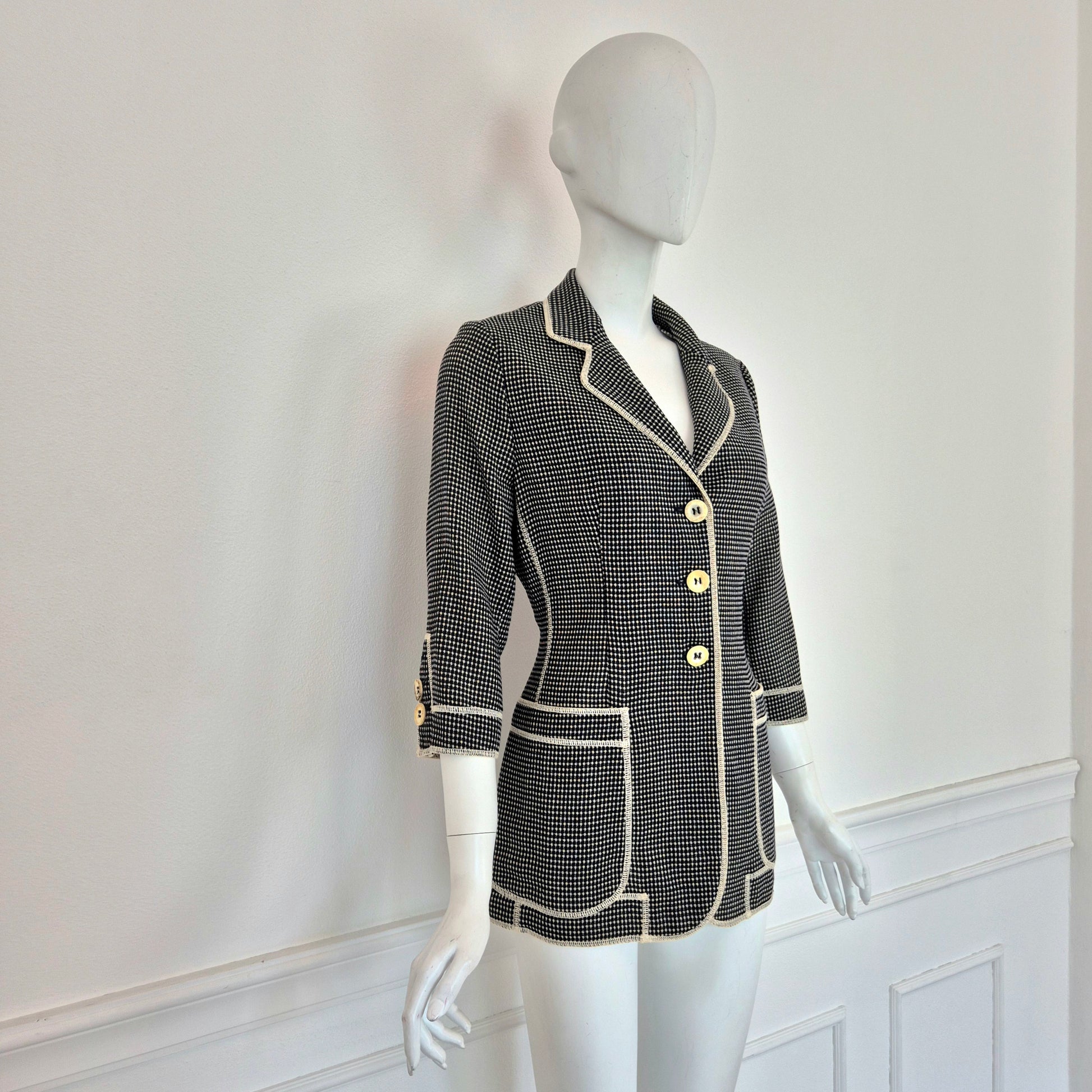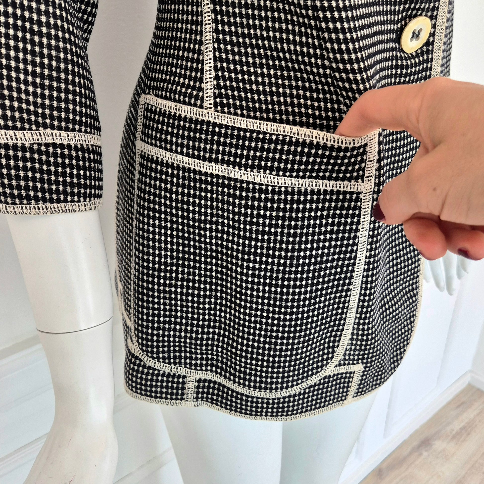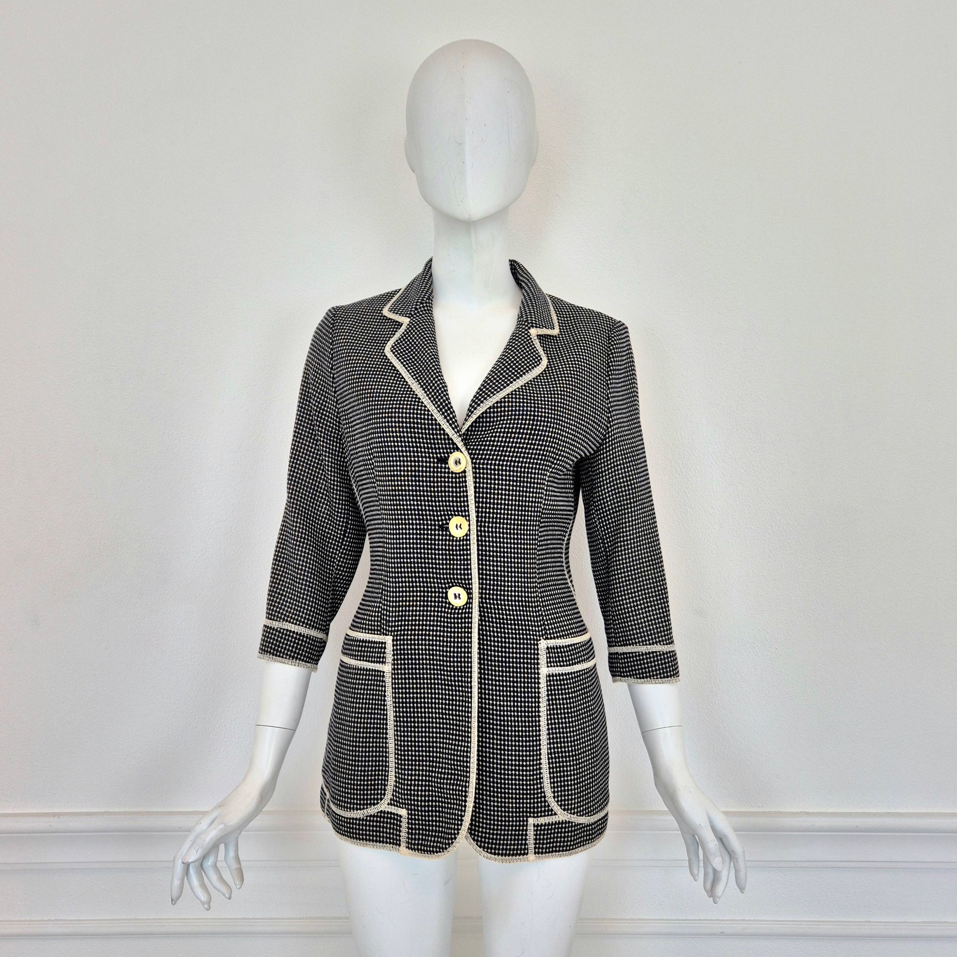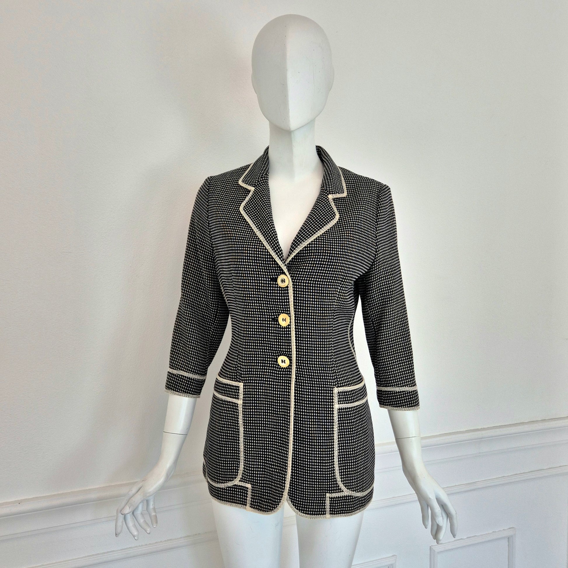 MOSCHINO COUTURE giacca blazer vintage anni '90 dal tessuto a microquadretti bianco-nero con cuciture e bottoni bianchi a contrasto e manica a tre quarti. Sul retro la scritta ricamata "Understatement?"