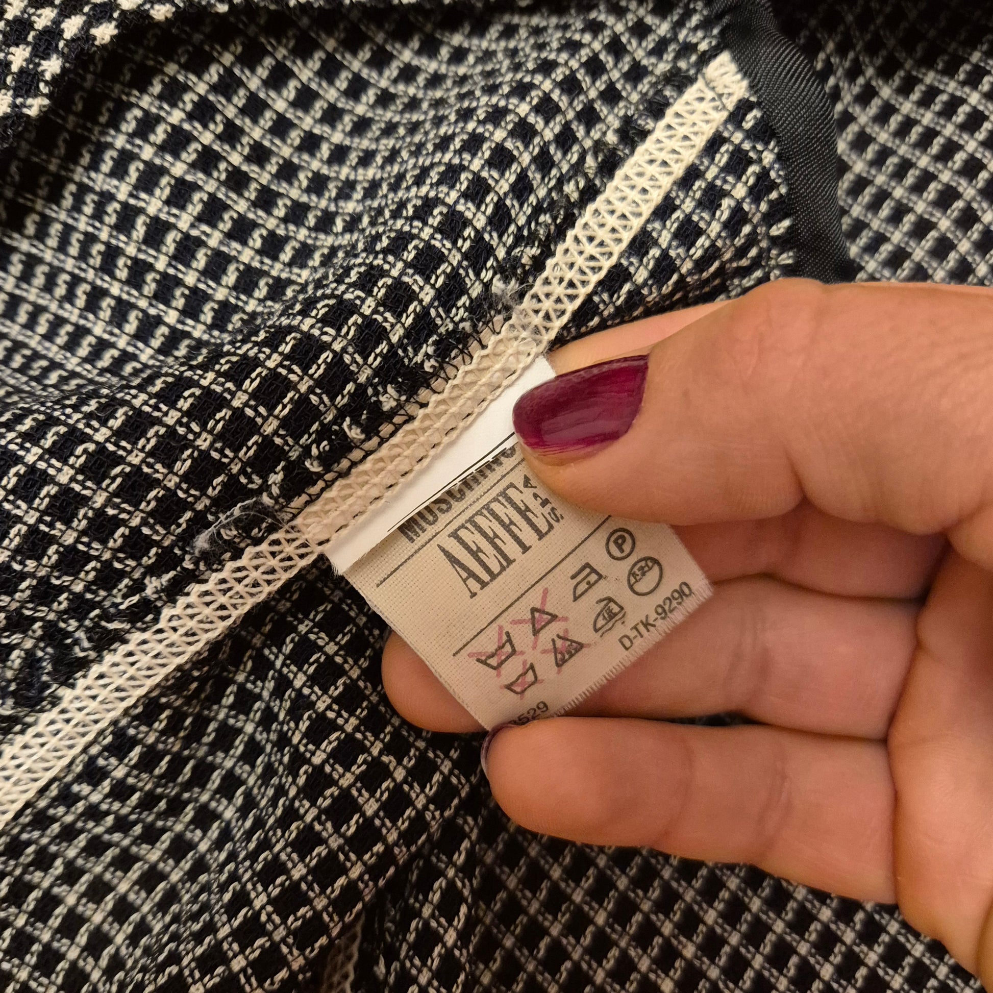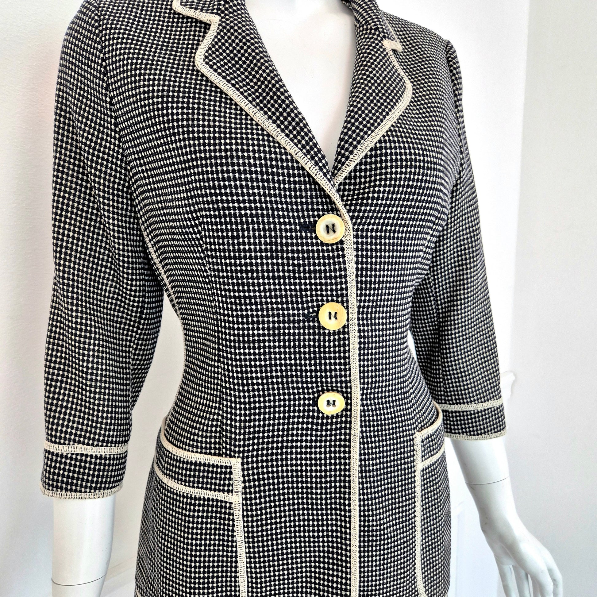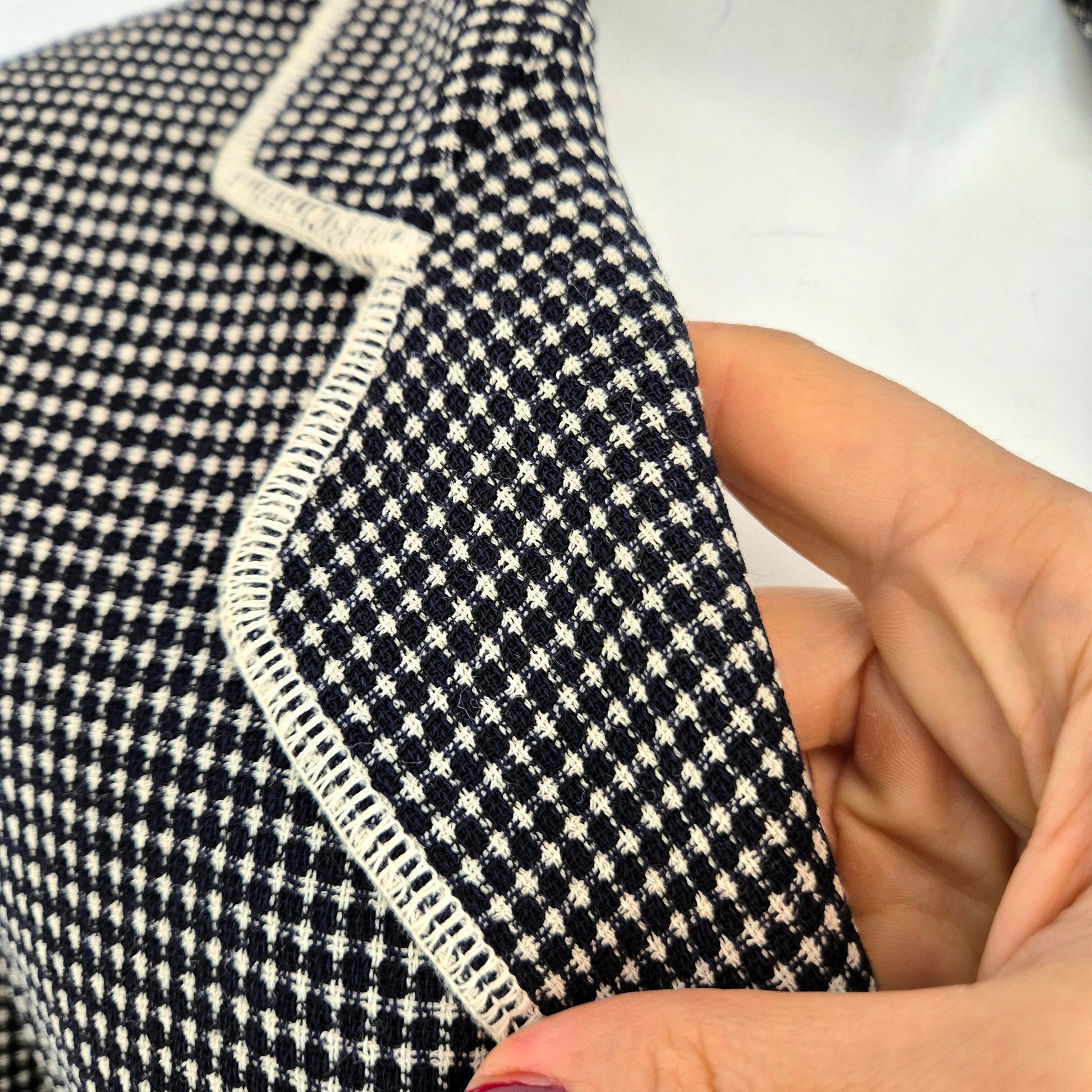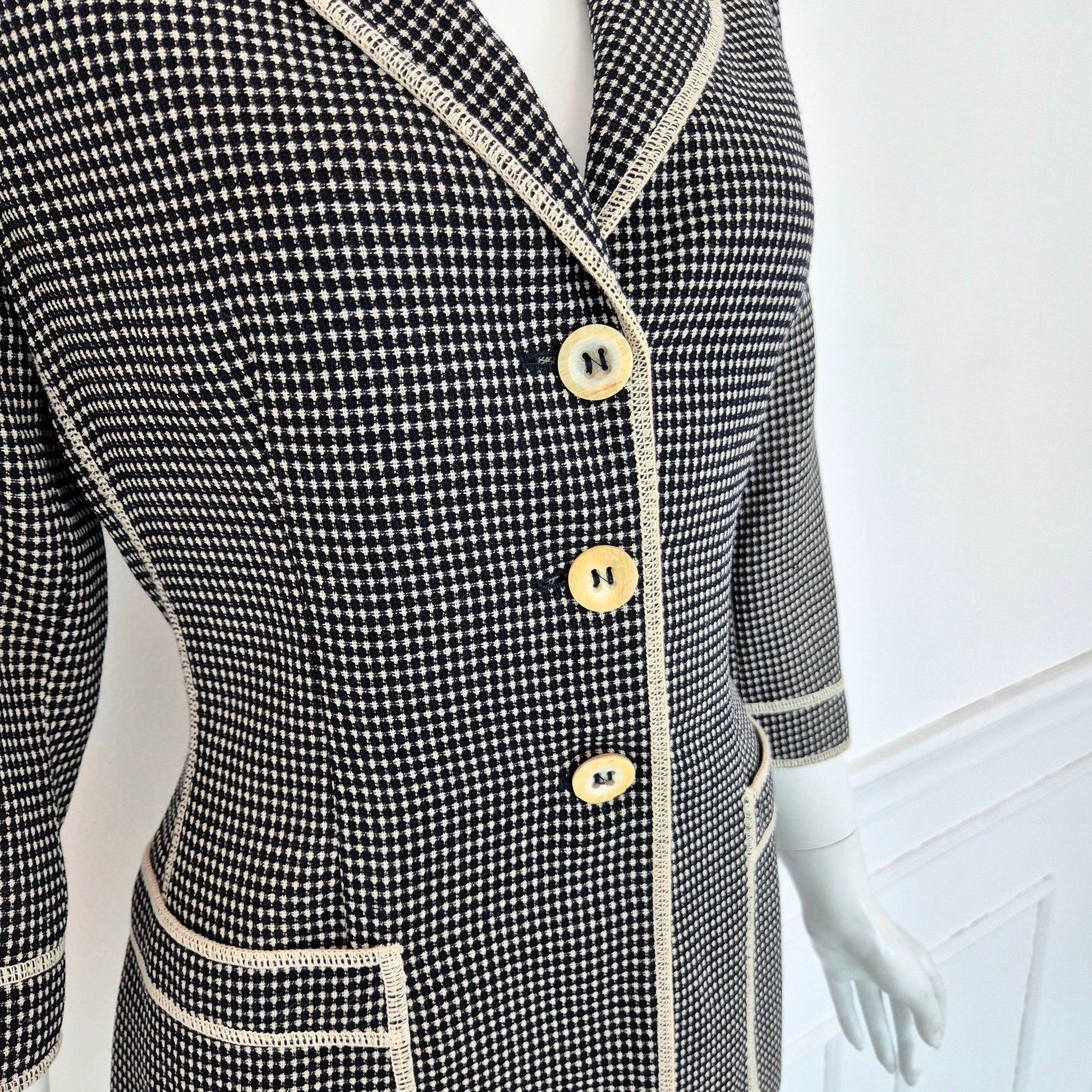 MOSCHINO COUTURE giacca blazer vintage anni '90 dal tessuto a microquadretti bianco-nero con cuciture e bottoni bianchi a contrasto e manica a tre quarti. Sul retro la scritta ricamata "Understatement?"