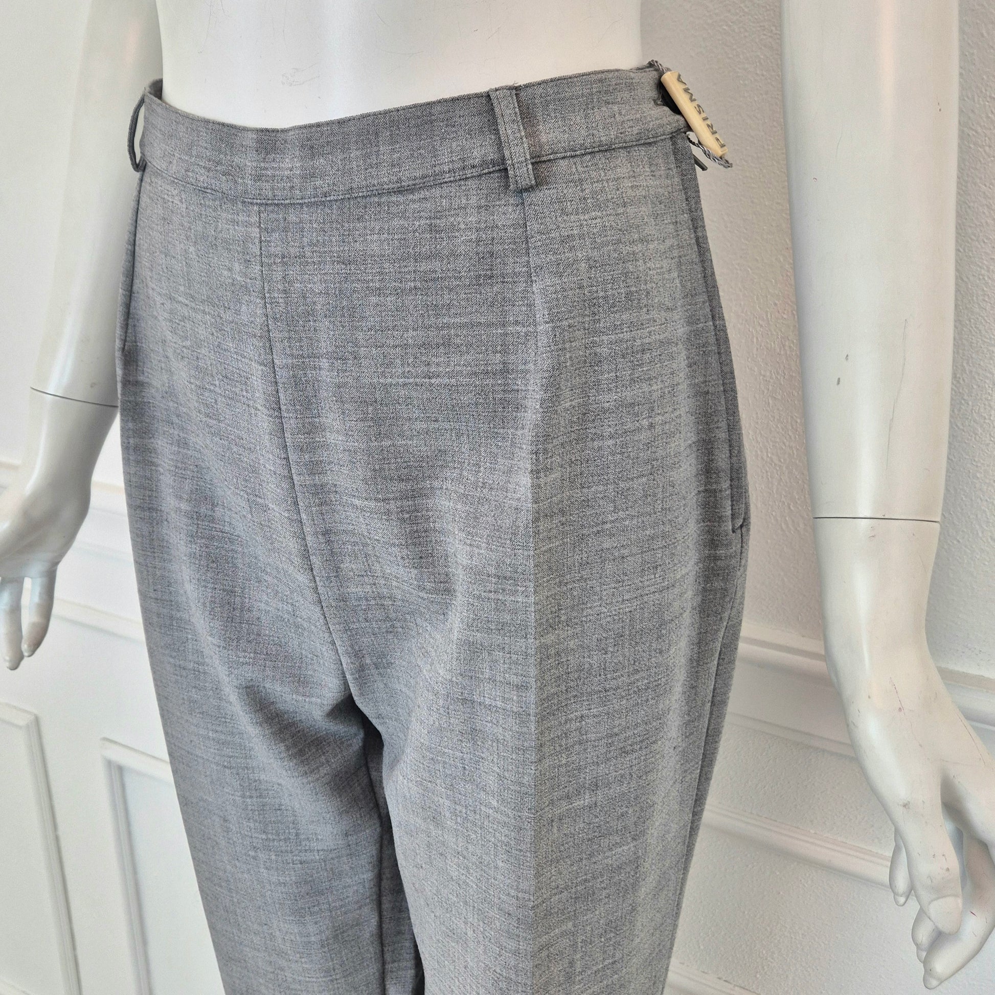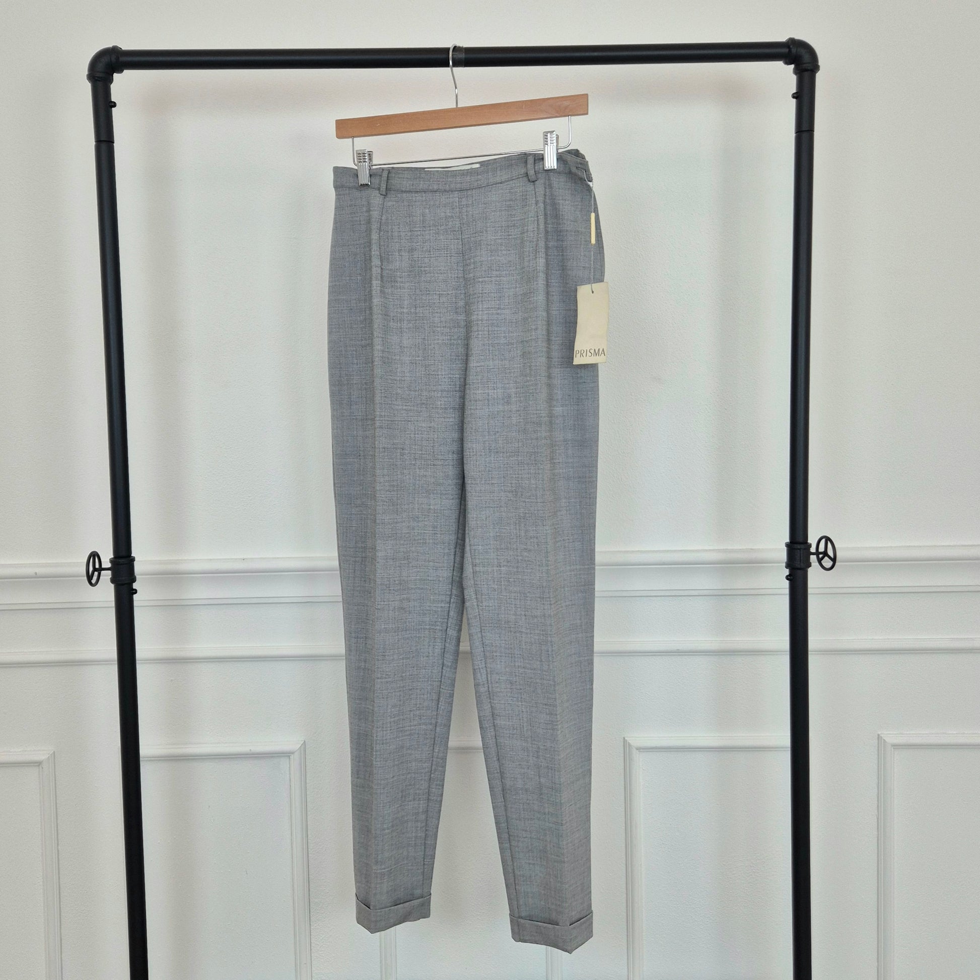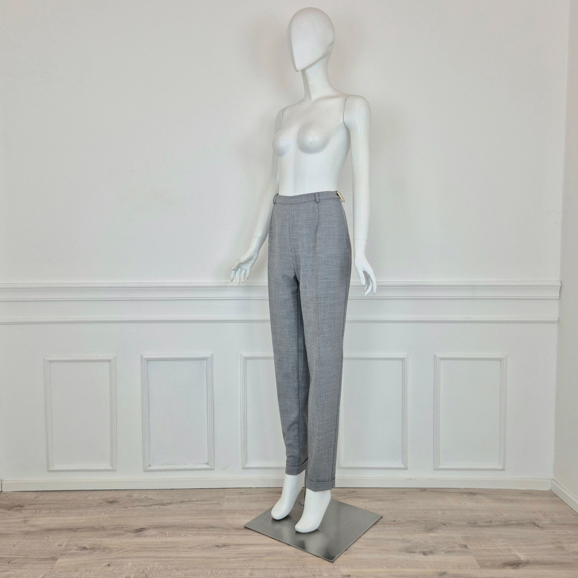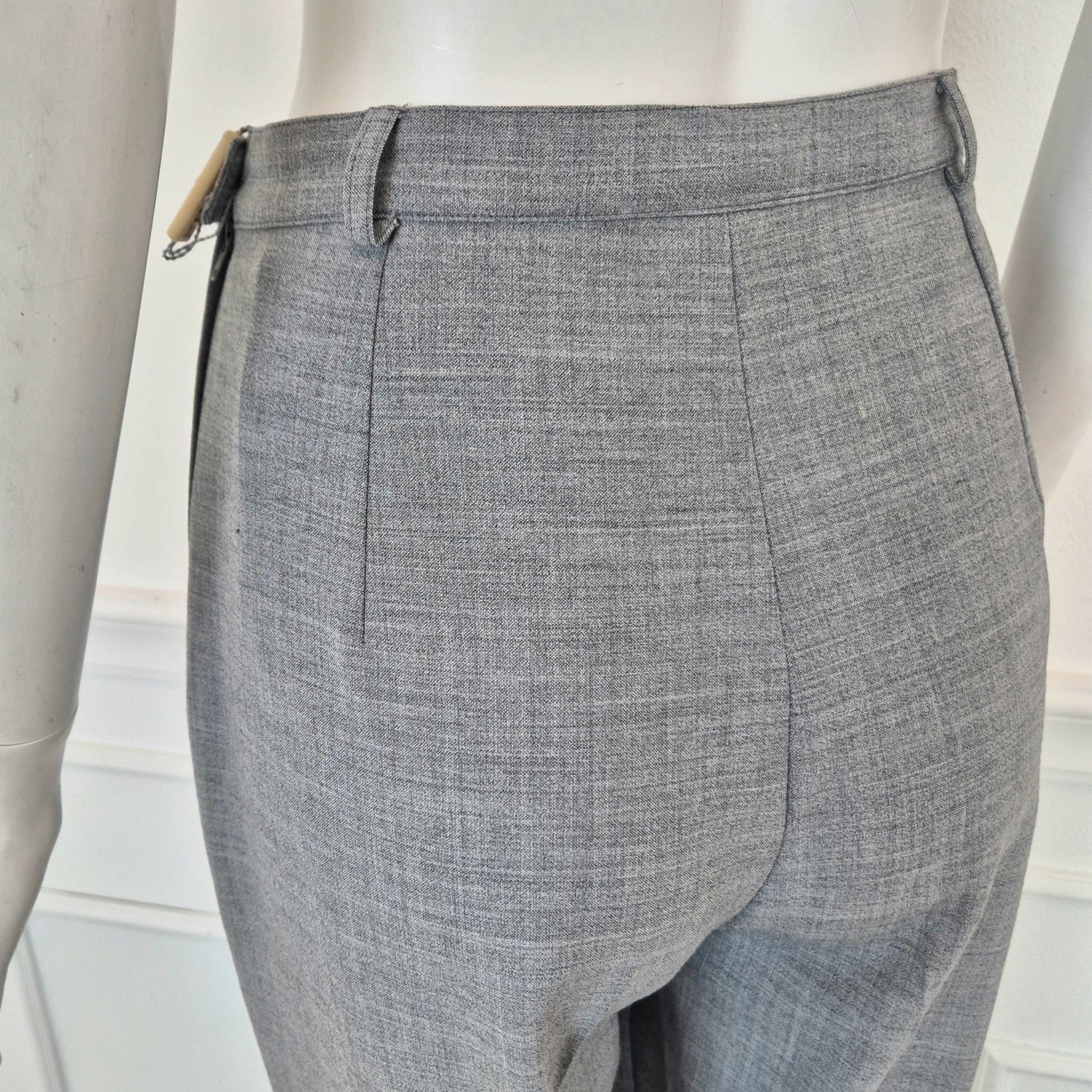 Pantaloni vintage ma nuovi con cartellino, in misto lana color grigio chiaro, con chiusura sul fianco tramite zip e bottone e gamba dritta con piega centrale.