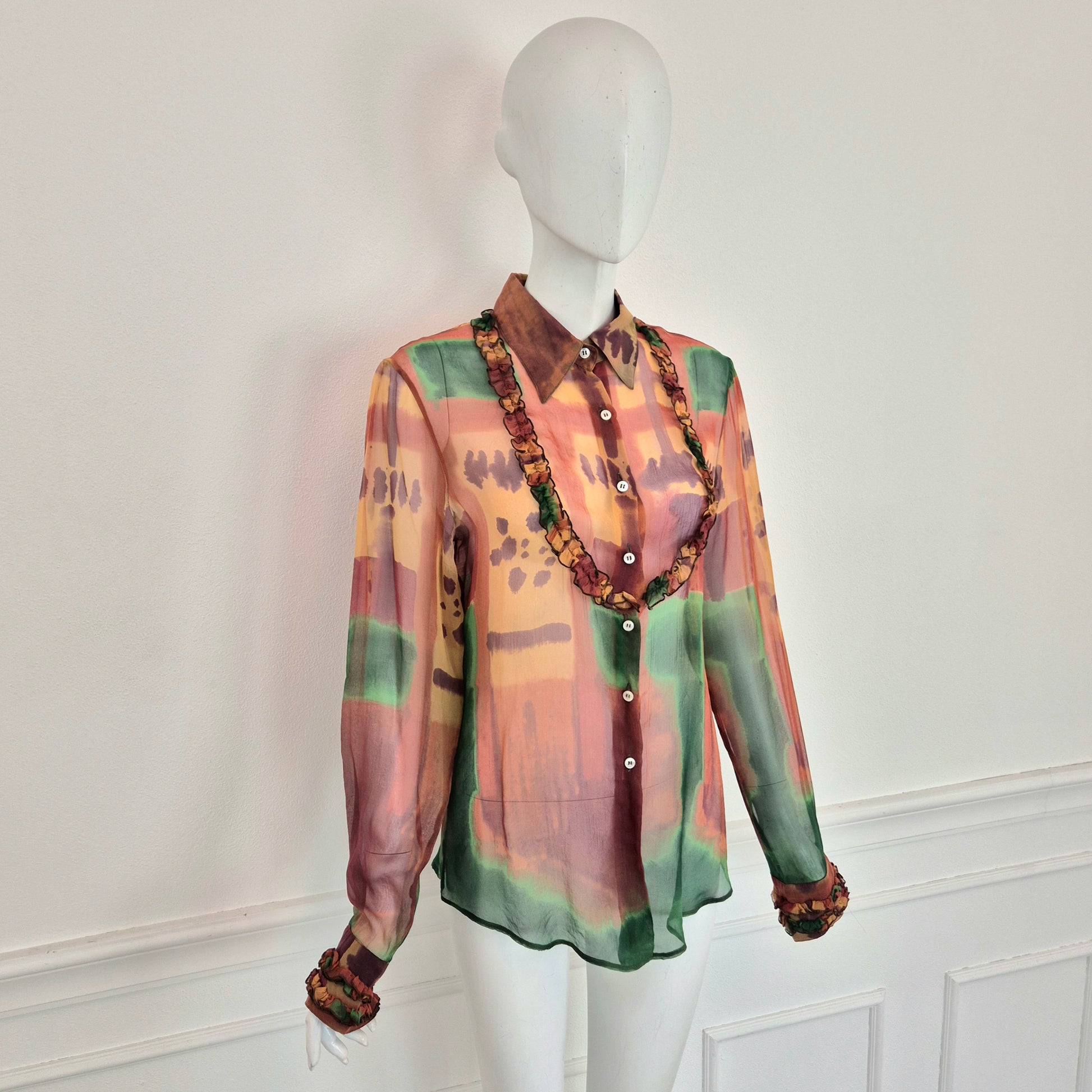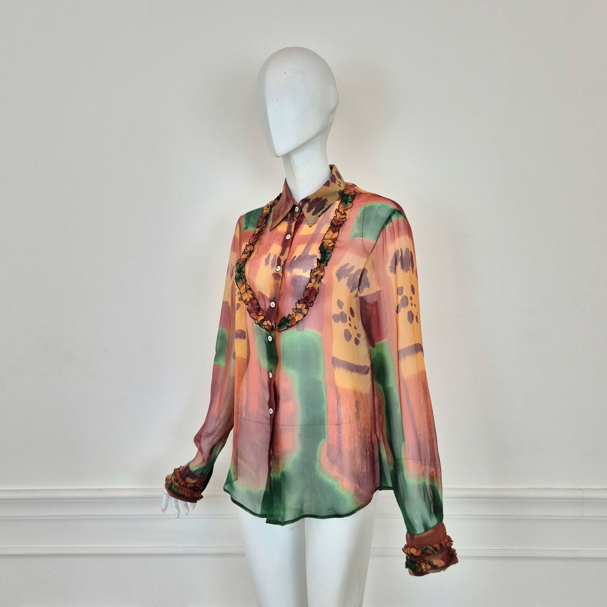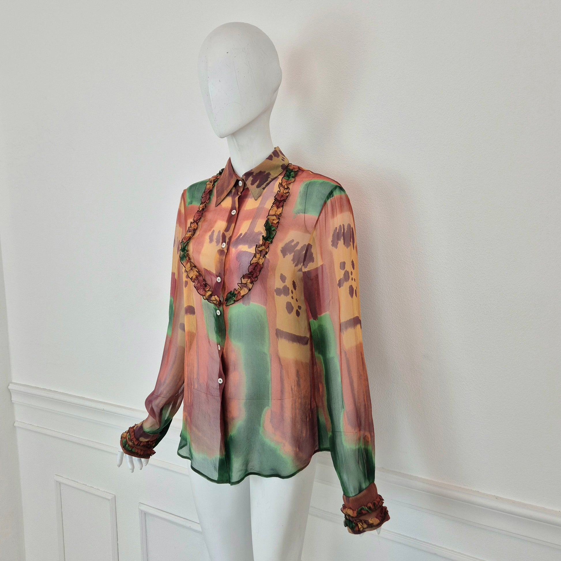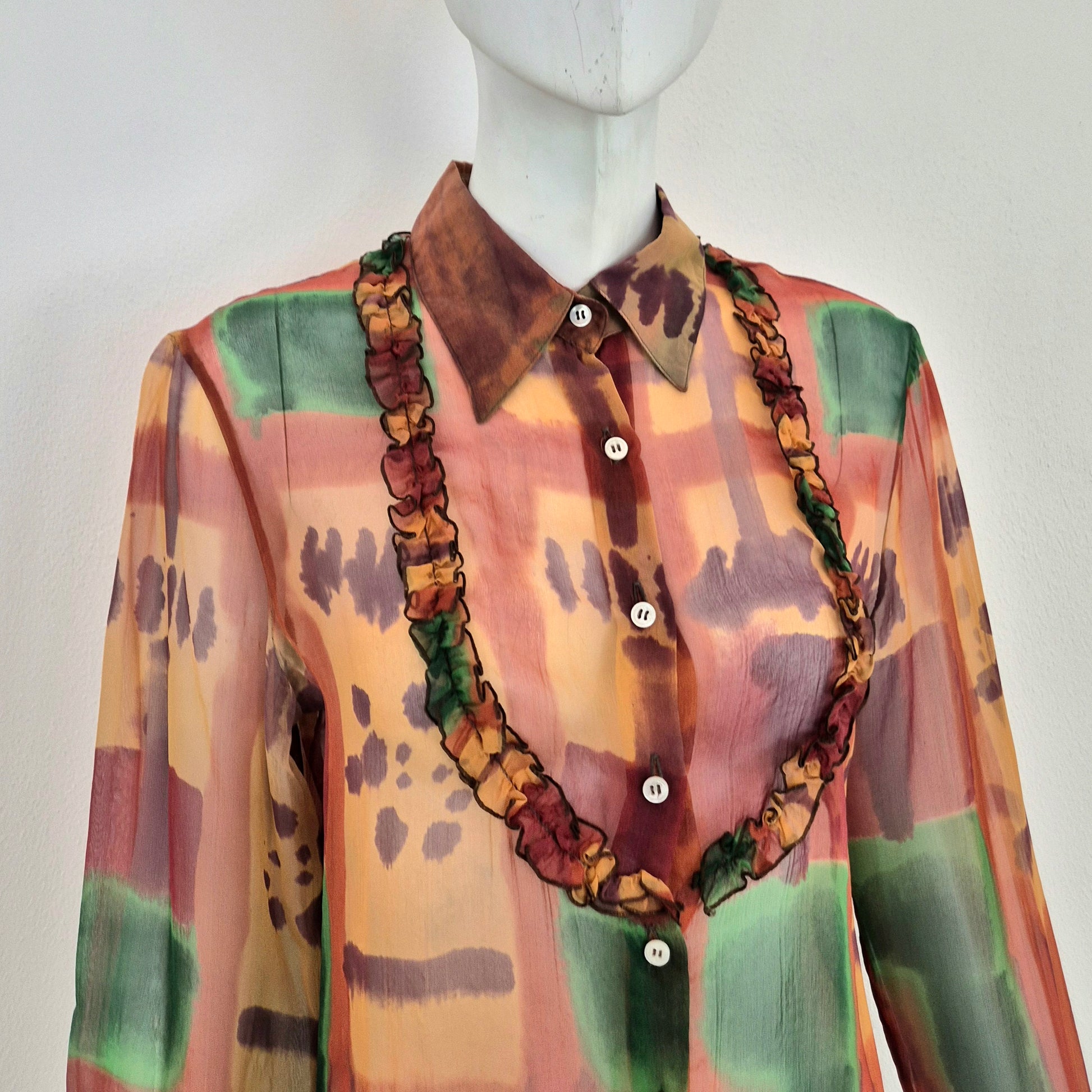 ROMEO GIGLI (linea Gigli) camicia vintage in misto seta, tessuto velato dalla fantasia astratta, quasi un acquerello sui toni del verde e del terra di Siena.