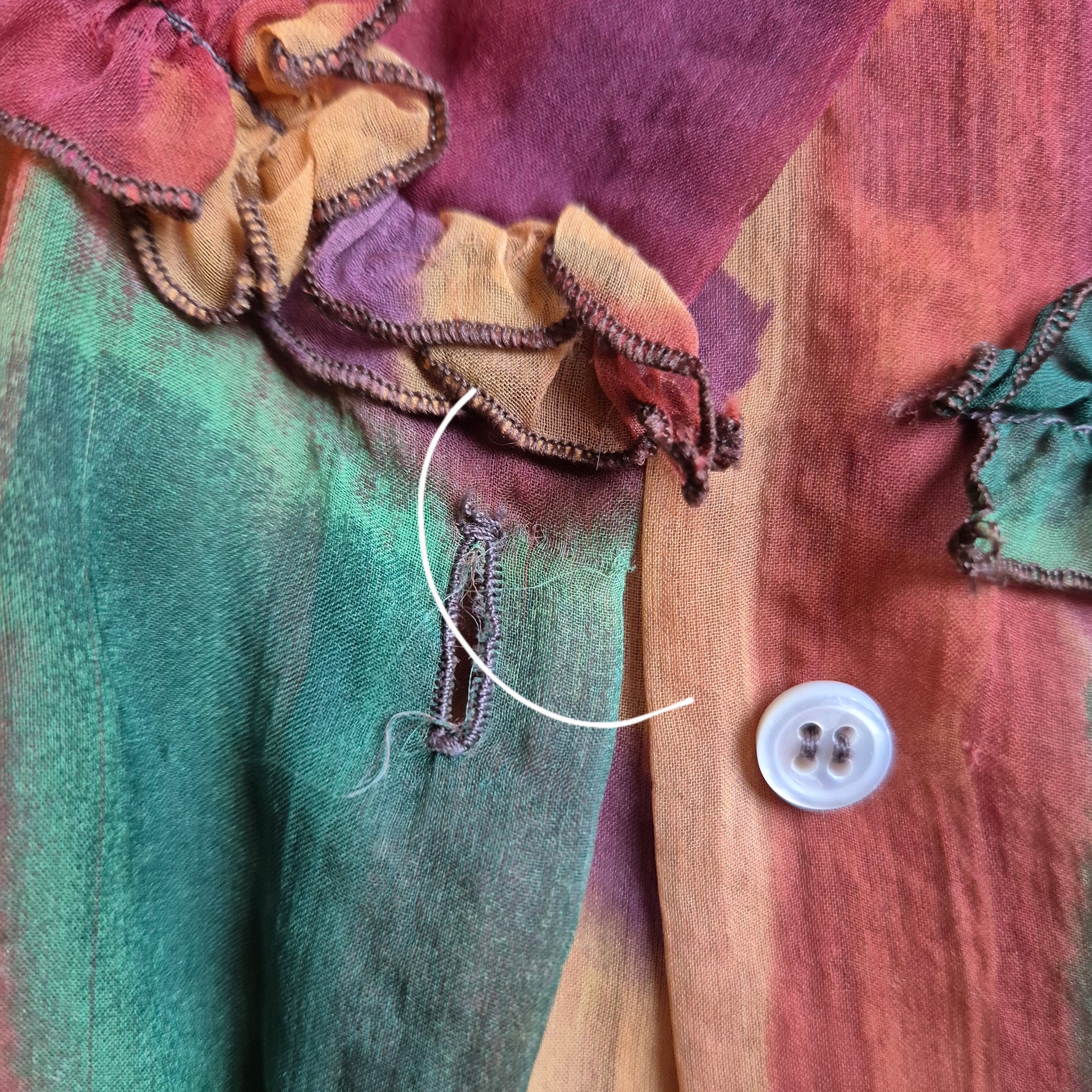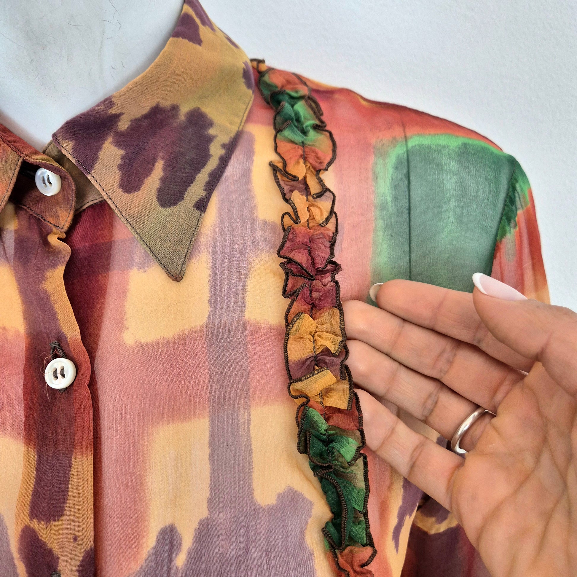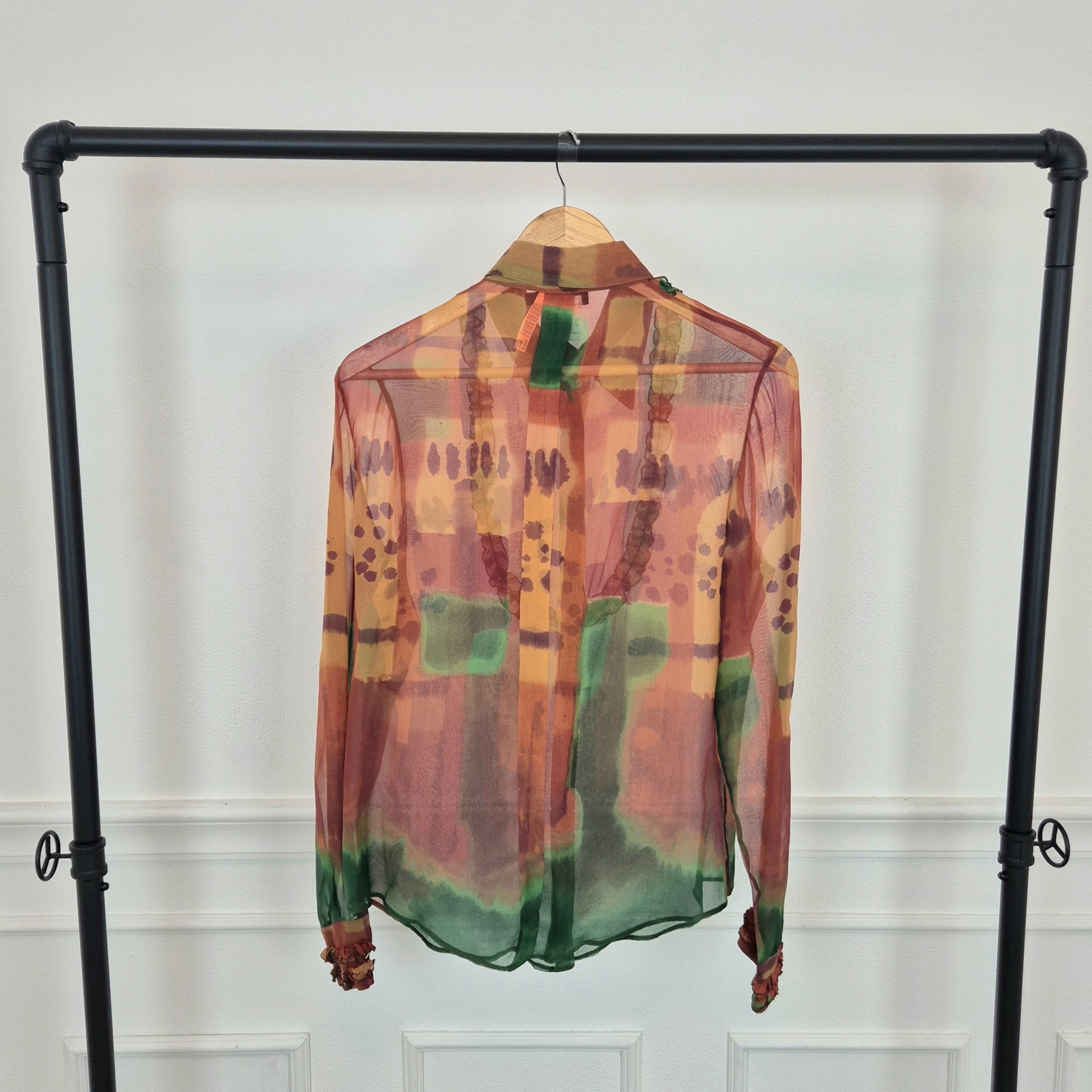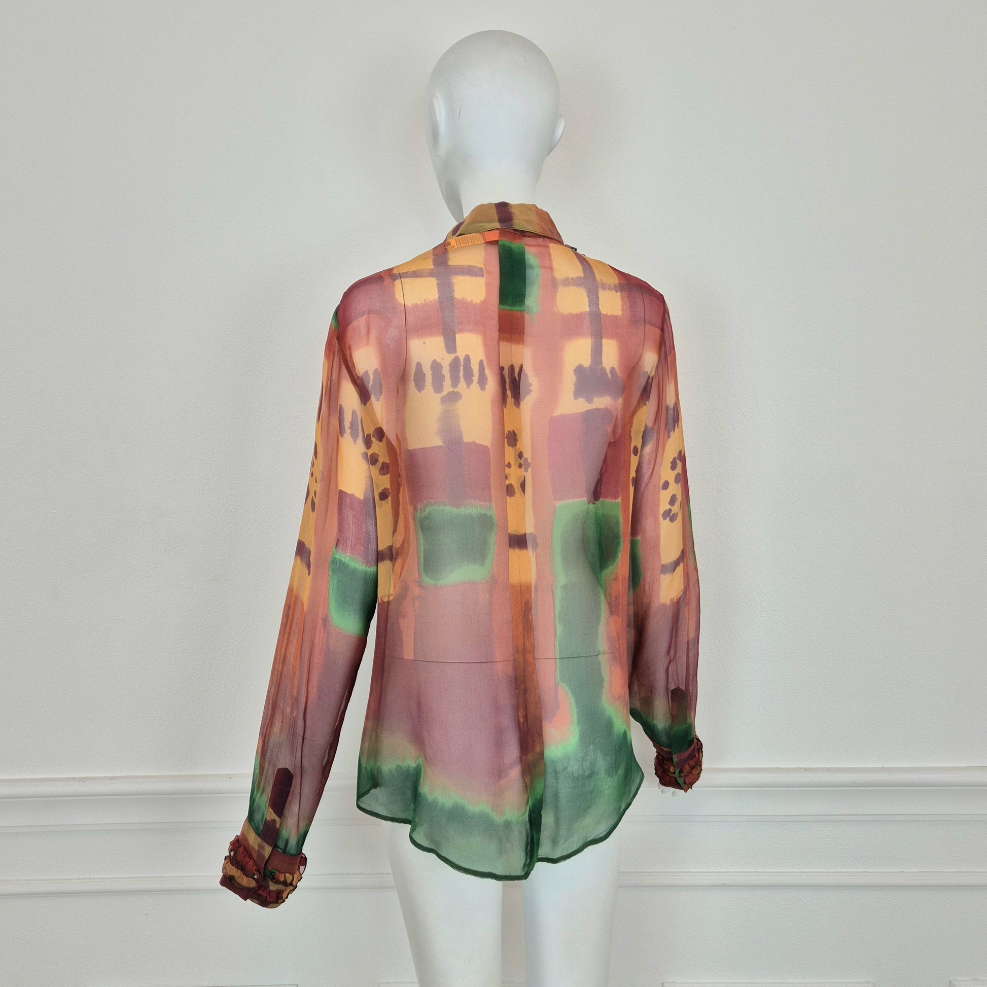 ROMEO GIGLI (linea Gigli) camicia vintage in misto seta, tessuto velato dalla fantasia astratta, quasi un acquerello sui toni del verde e del terra di Siena.