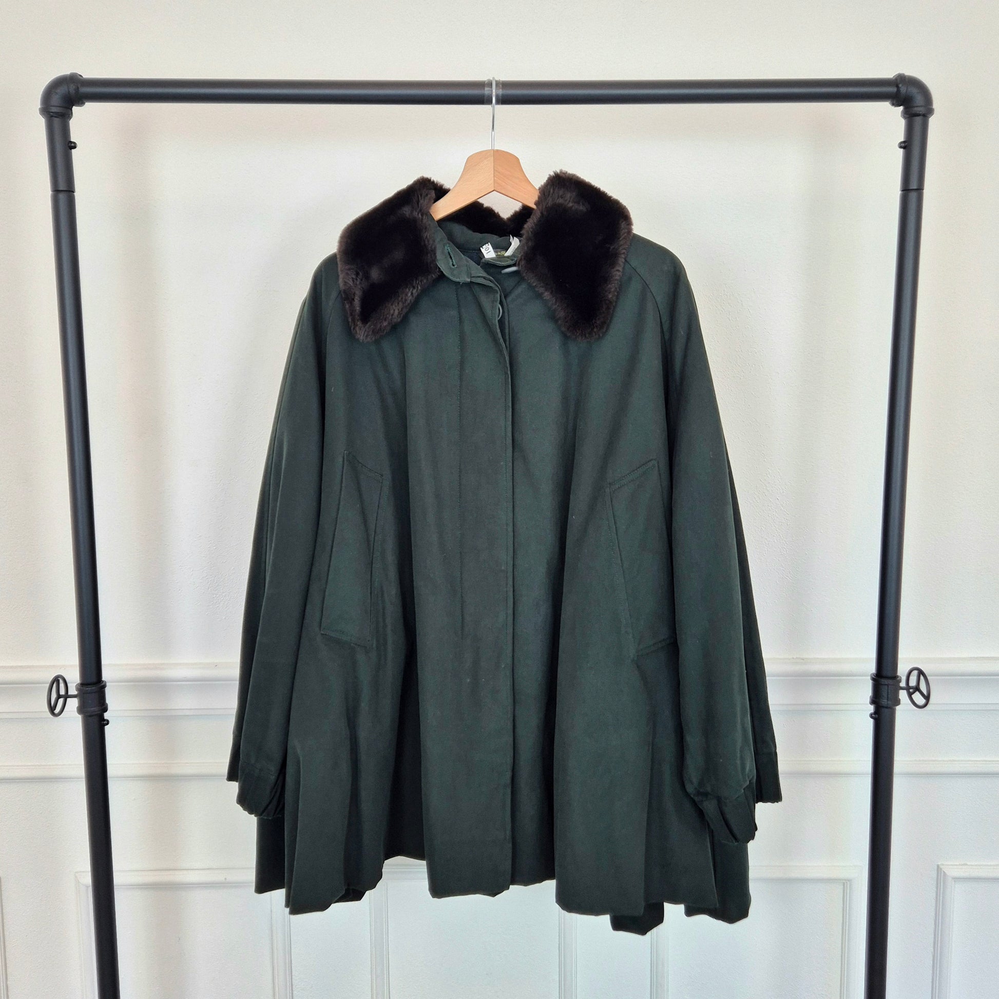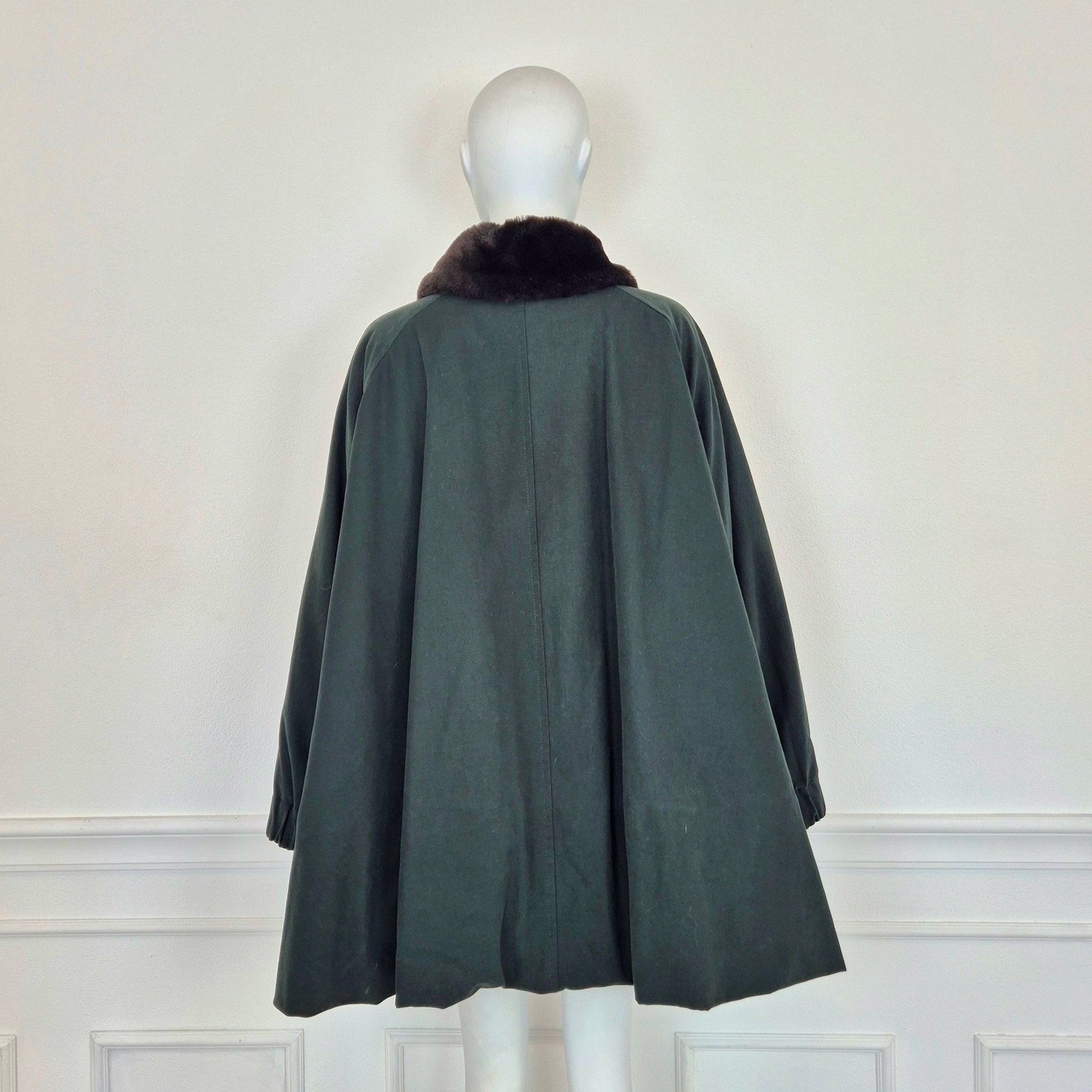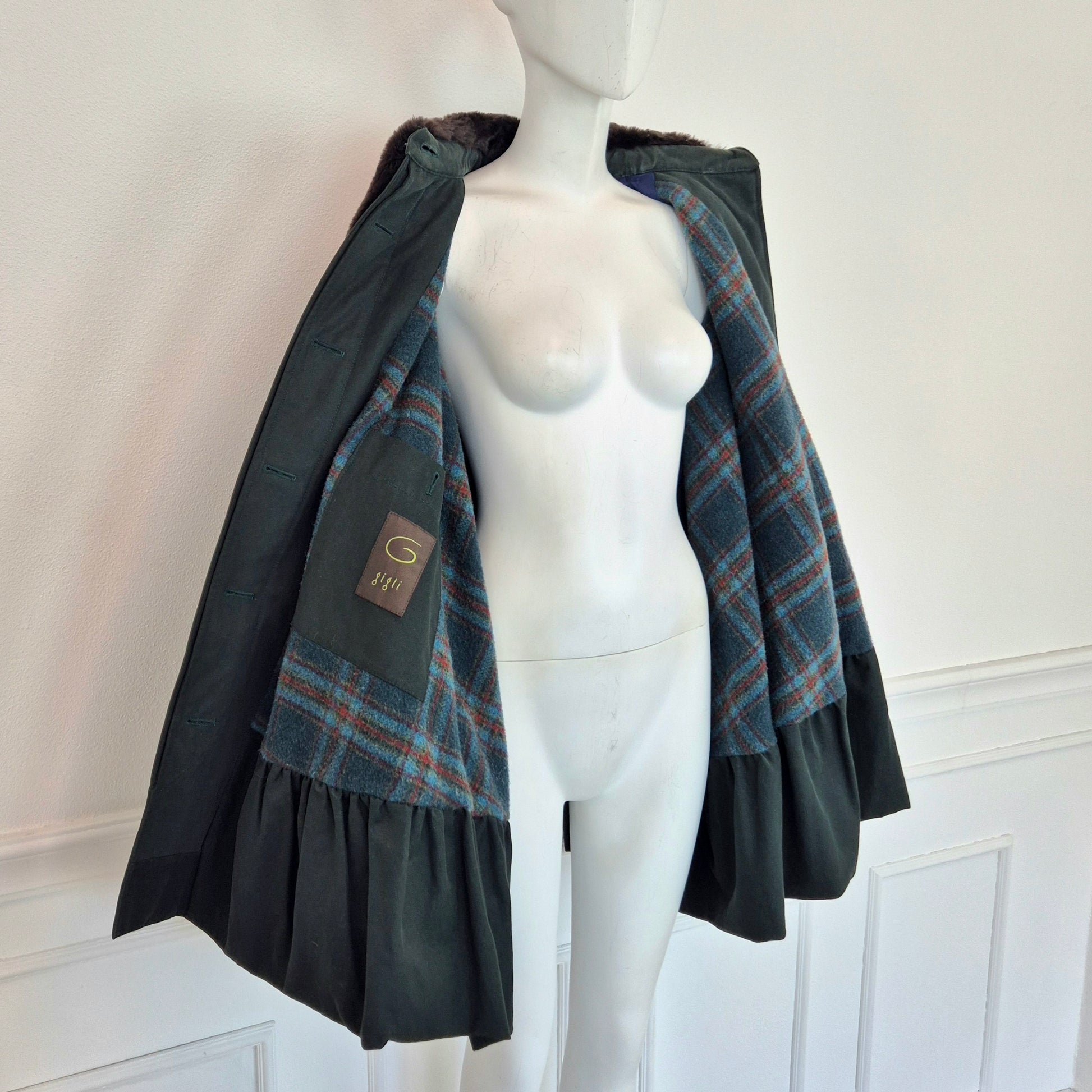 ROMEO GIGLI (linea G di Gigli) giaccone vintage anni '90 in misto cotone color verde bosco con collo in pelo marrone ed interno scozzese sui toni del turchese, blu, verde e bordeaux. Linea ampia che crea pieghe sul busto e scende a trapezio sui fianchi.