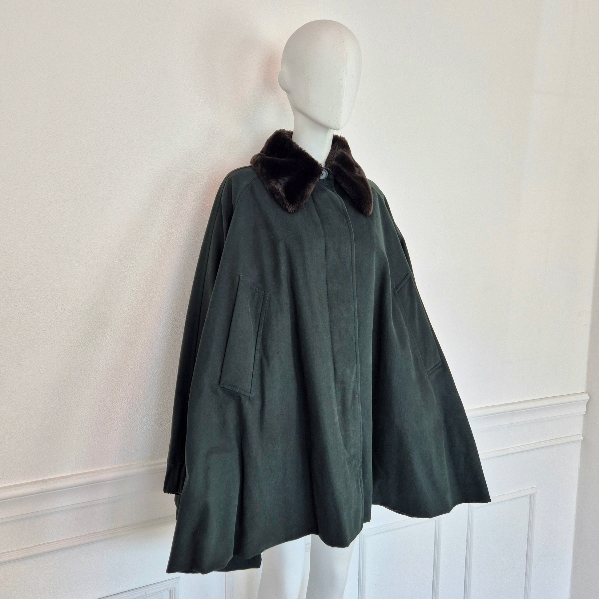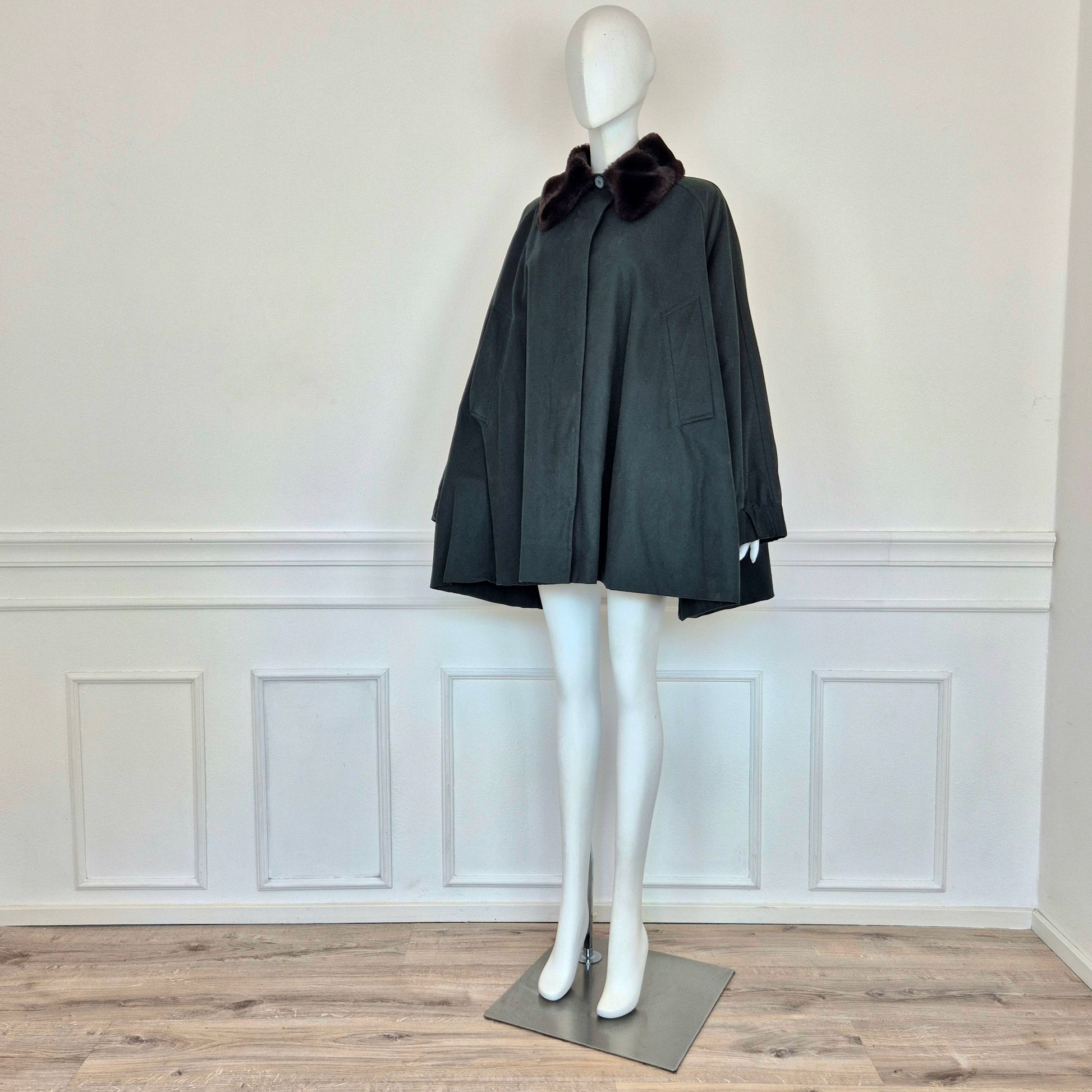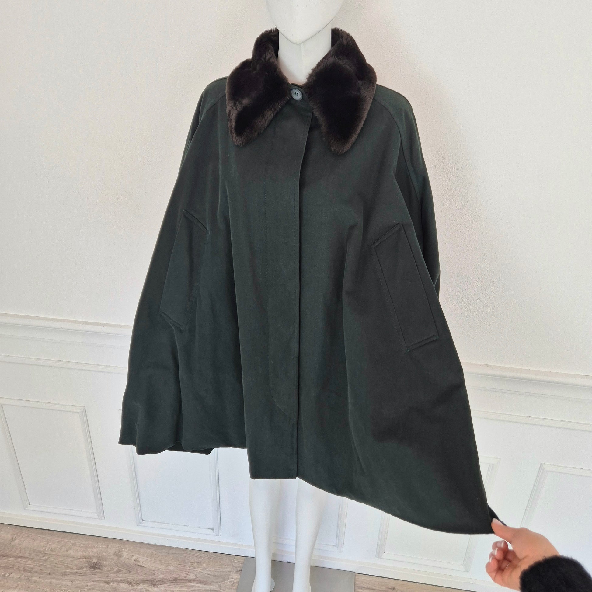 ROMEO GIGLI (linea G di Gigli) giaccone vintage anni '90 in misto cotone color verde bosco con collo in pelo marrone ed interno scozzese sui toni del turchese, blu, verde e bordeaux. Linea ampia che crea pieghe sul busto e scende a trapezio sui fianchi.