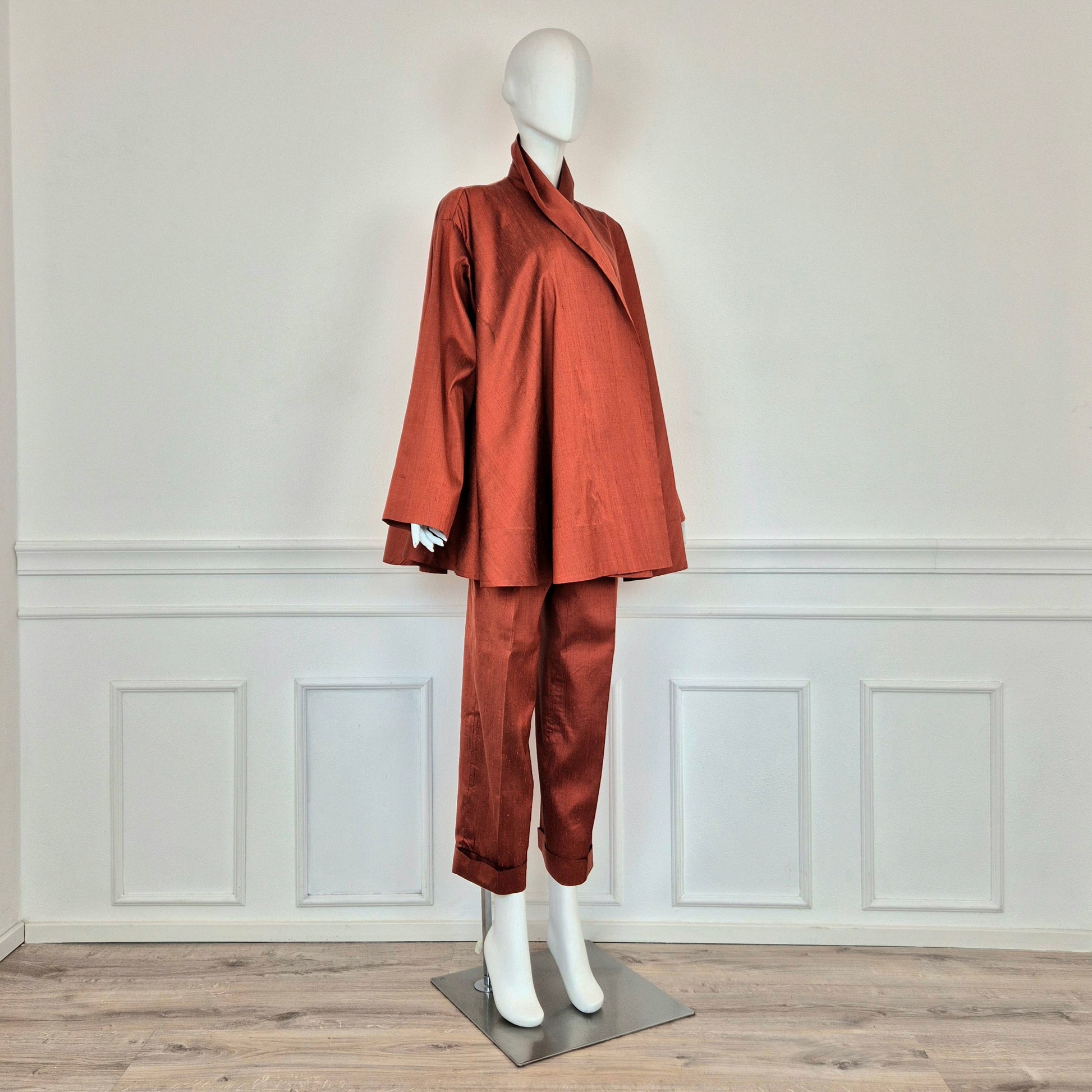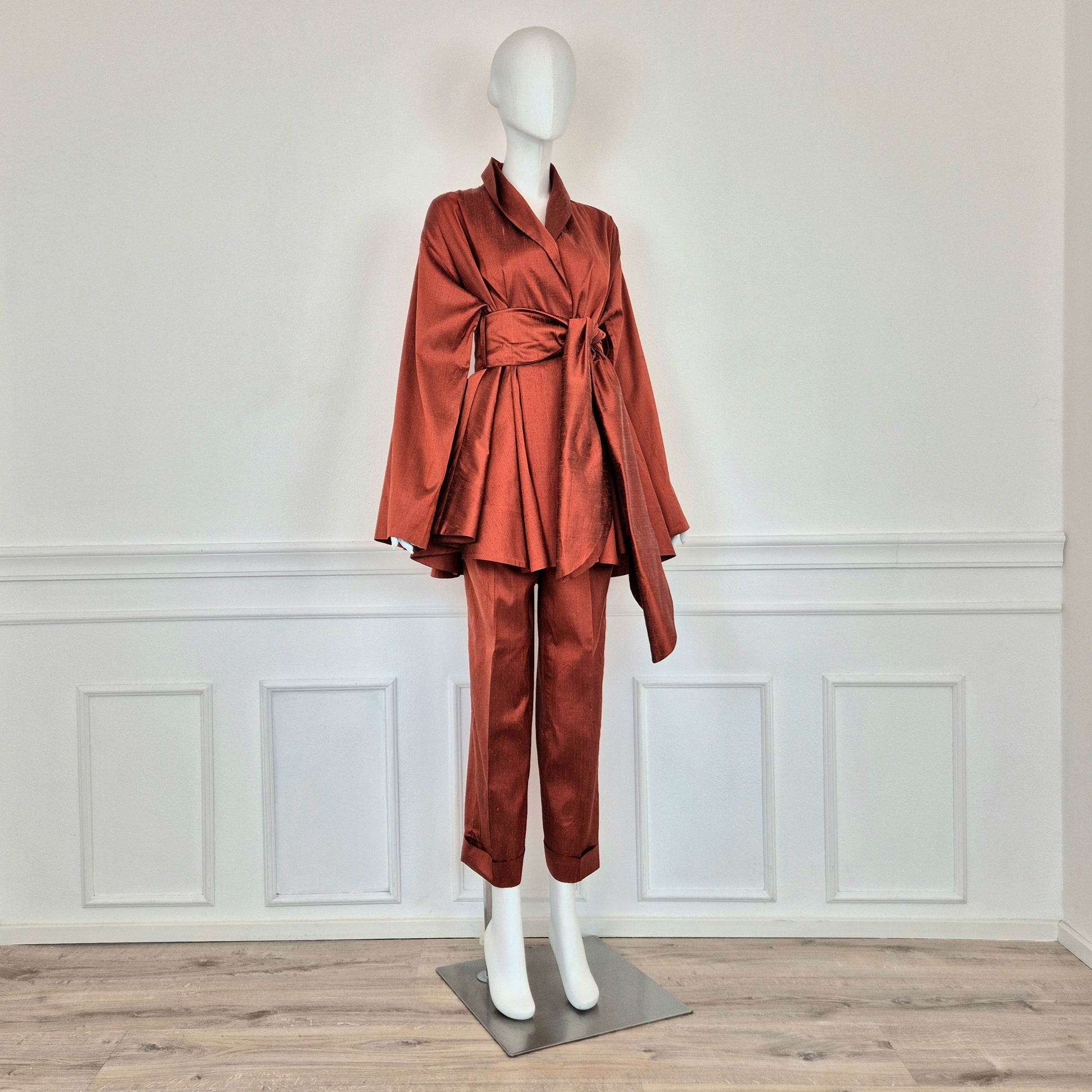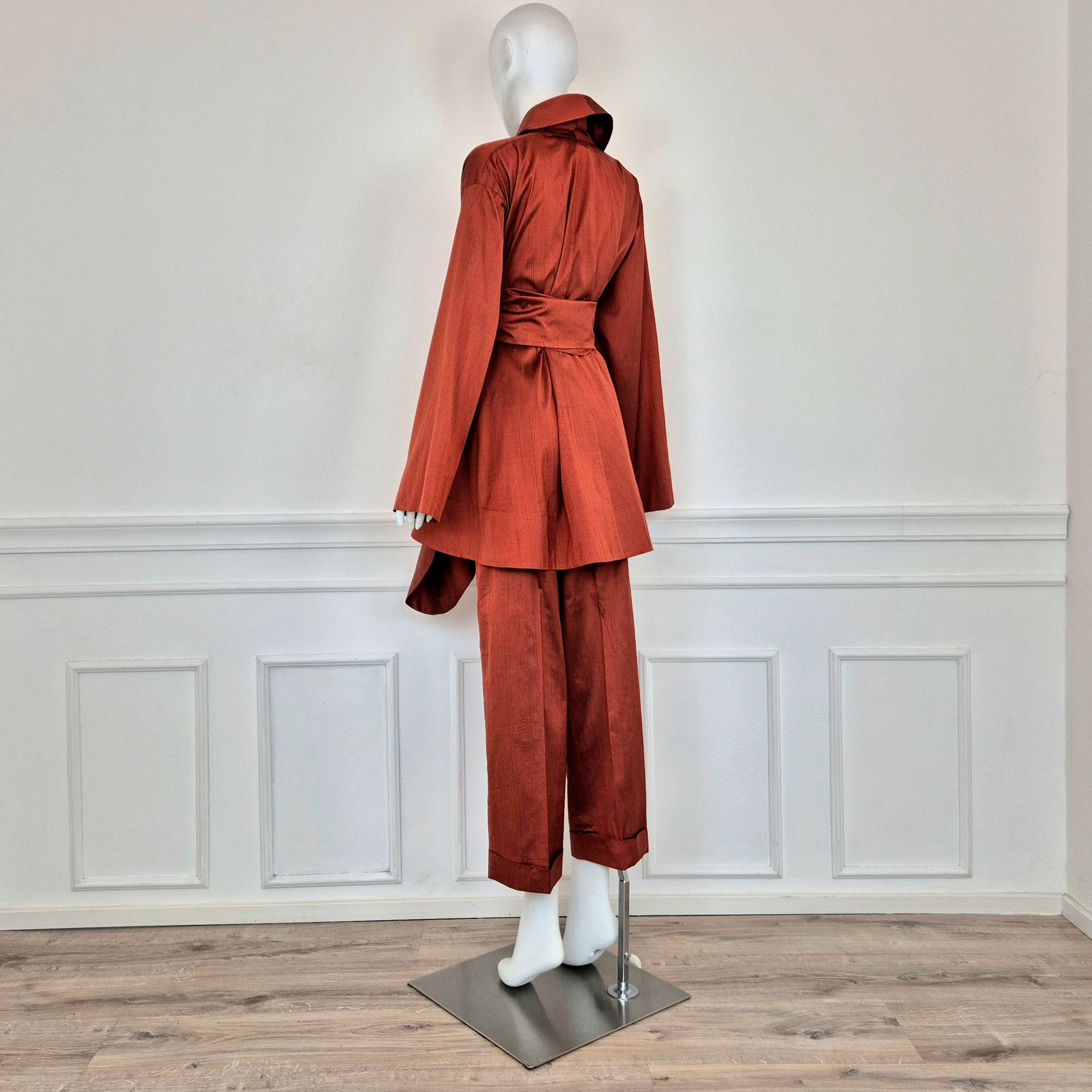 ROMEO GIGLI (spring summer 1990) iconico completo in shantung di seta color terra di Siena bruciata, composto da ampia giacca a kimono chiusa da cintura coordinata in tessuto e pantaloni dal taglio classico con piega centrale.