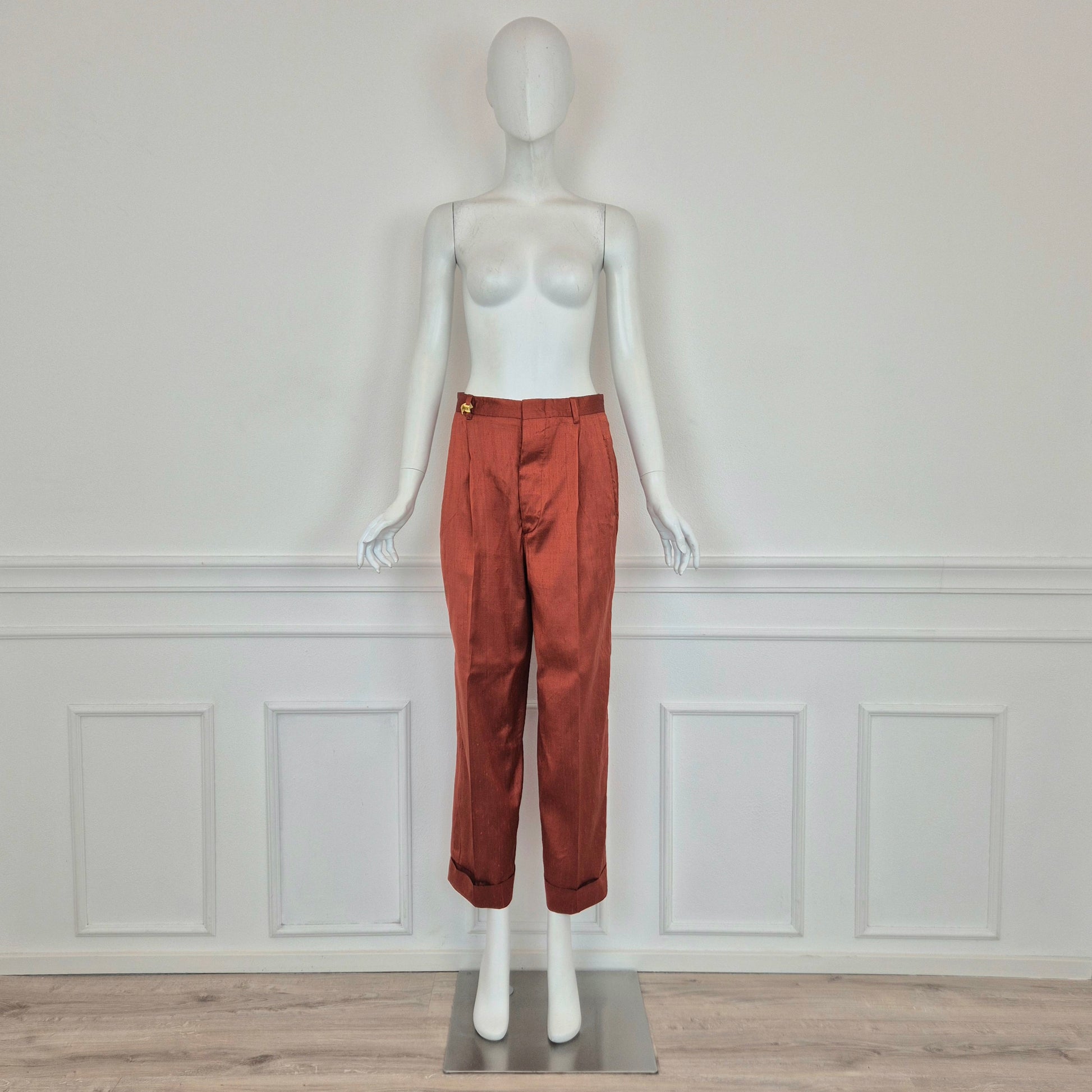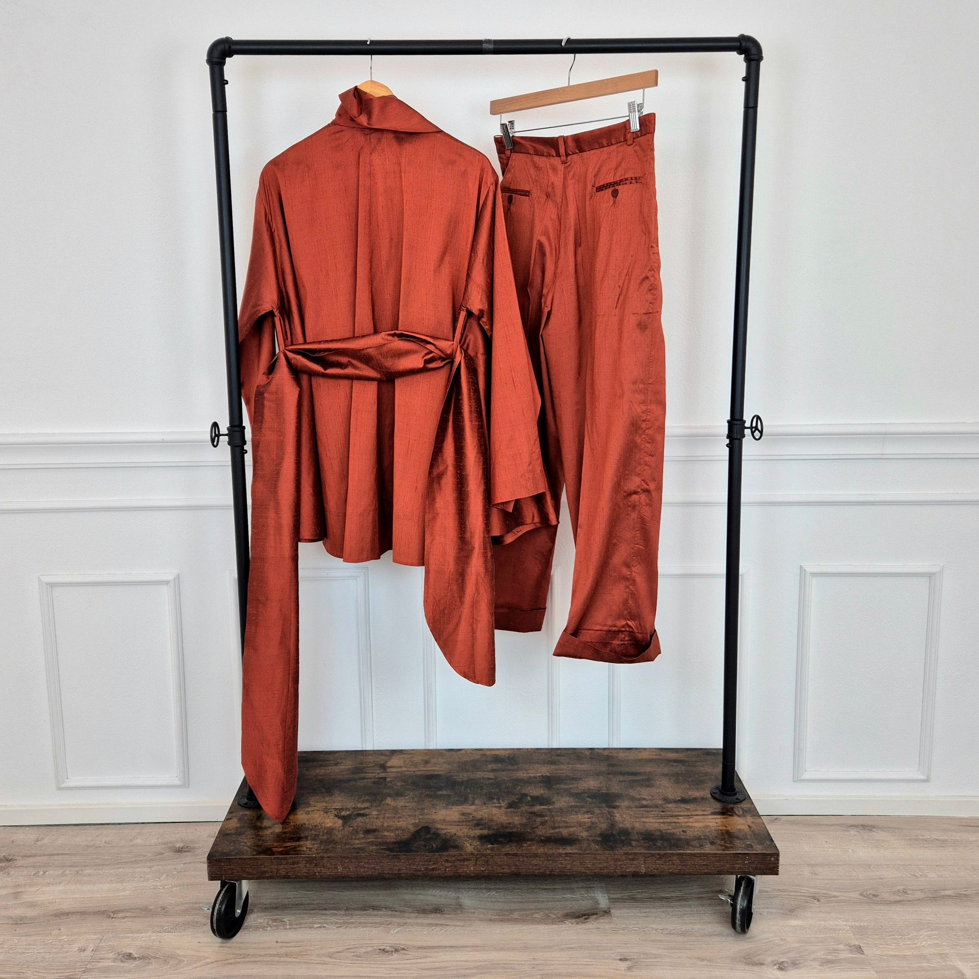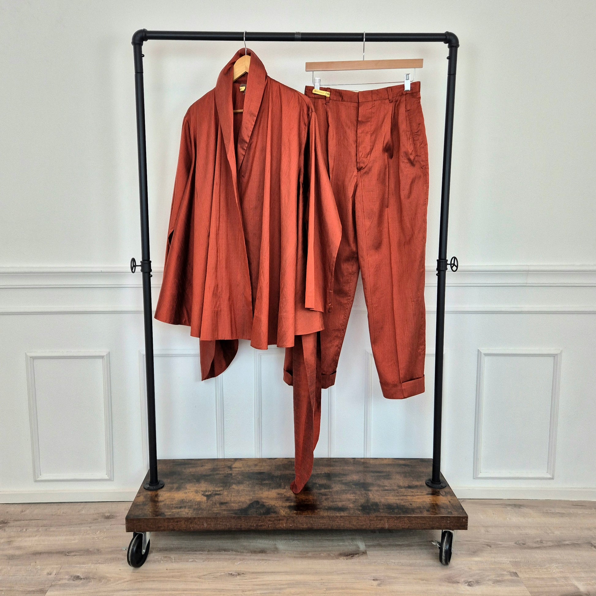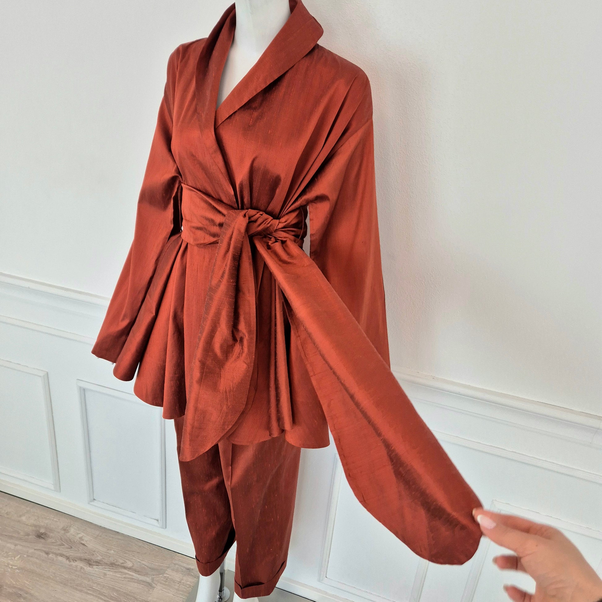 ROMEO GIGLI (spring summer 1990) iconico completo in shantung di seta color terra di Siena bruciata, composto da ampia giacca a kimono chiusa da cintura coordinata in tessuto e pantaloni dal taglio classico con piega centrale.