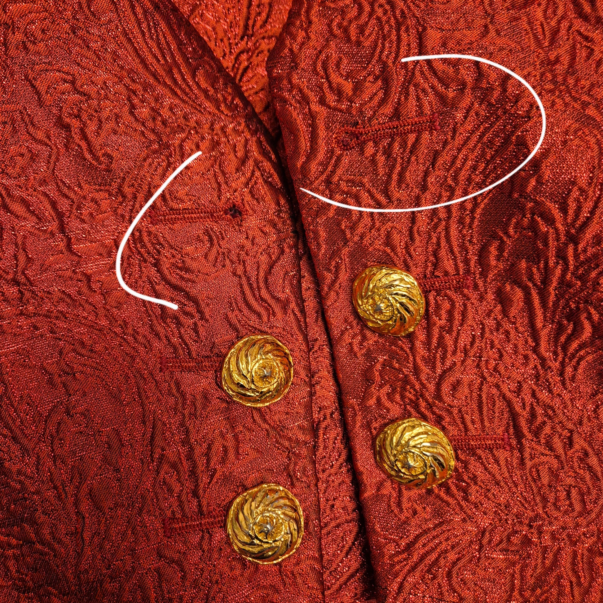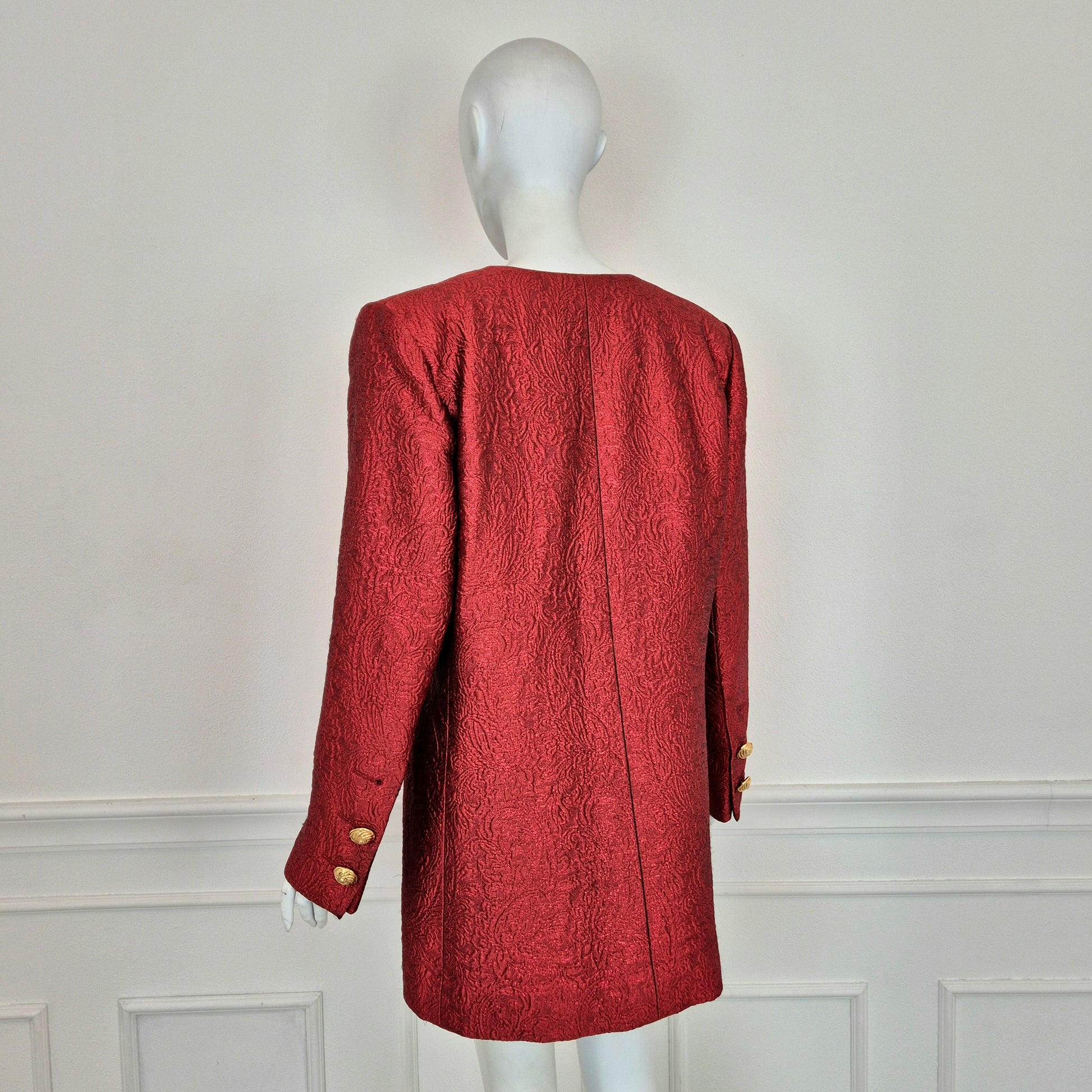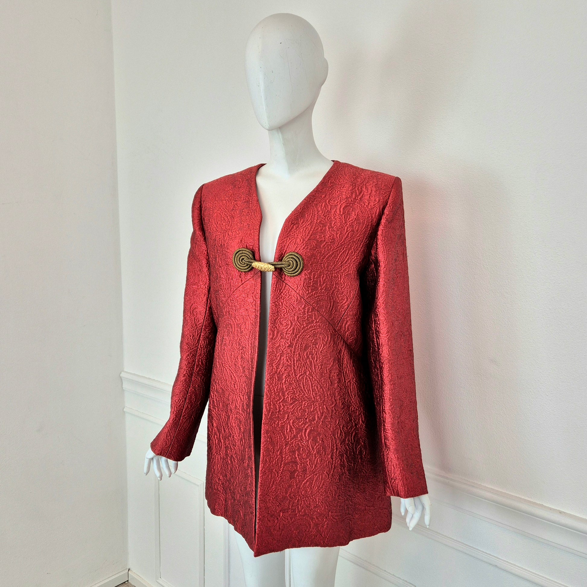 YVES SAINT LAURENT Rive gauche (fall winter 1991) giacca lunga in tessuto rosso broccato con particolare chiusura gioiello in metallo dorato. Internamente foderata tono su tono.