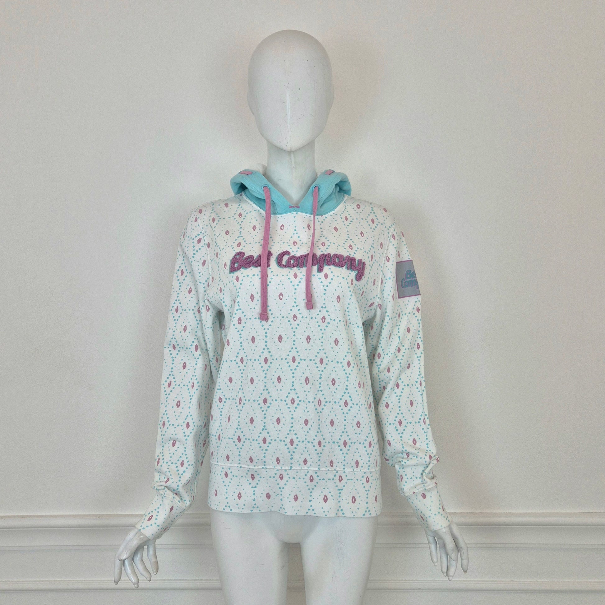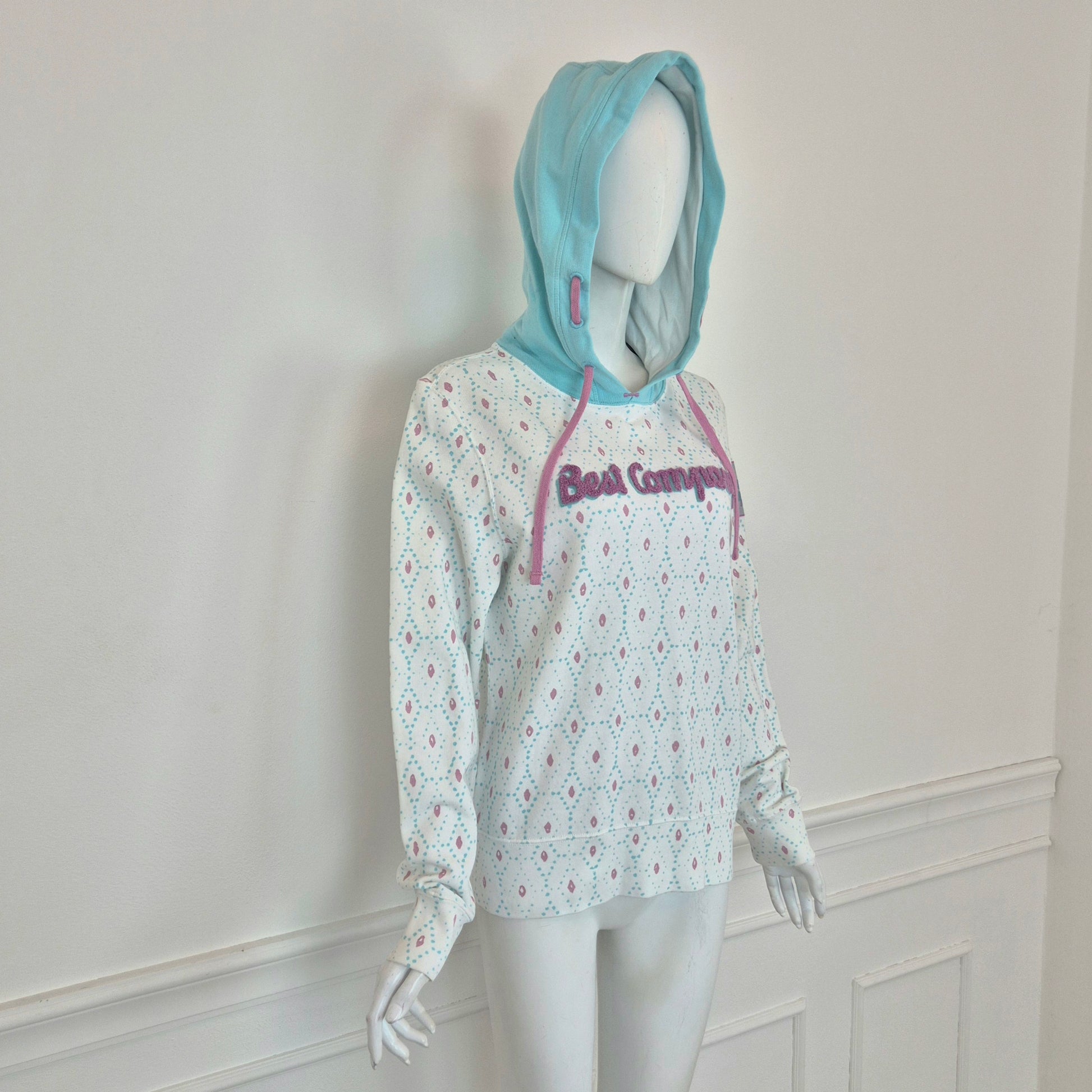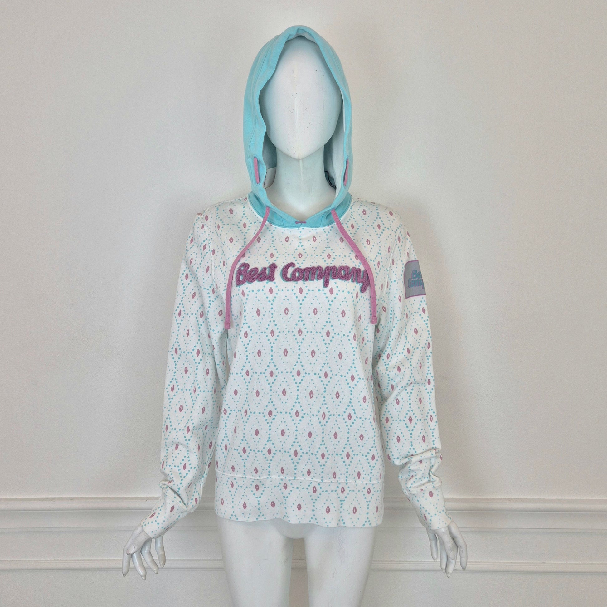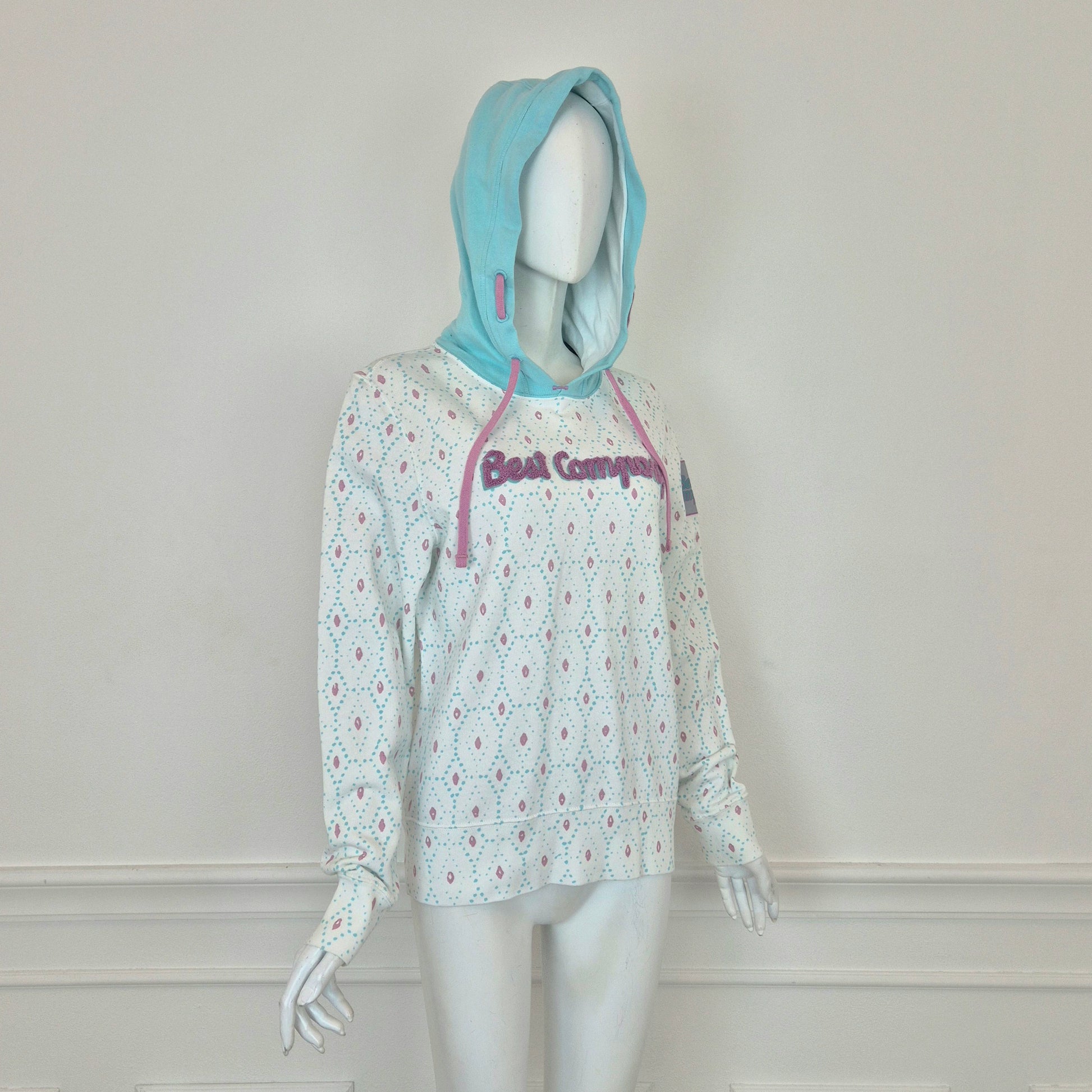 BEST COMPANY by Olmes Carretti - Felpa vintage ma nuova in puro cotone color bianco. con disegni sui toni dell'azzurro e del rosa, cappuccio e scritta in "spugna" sul torace.