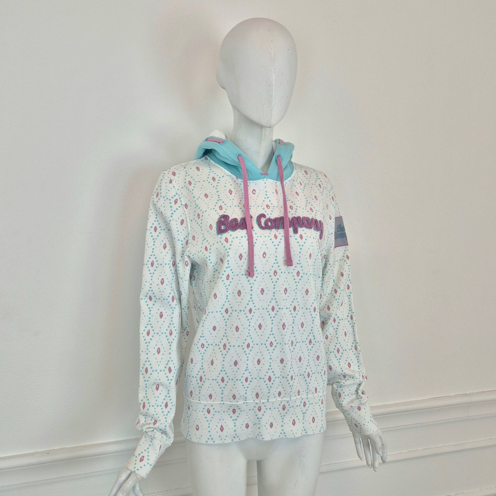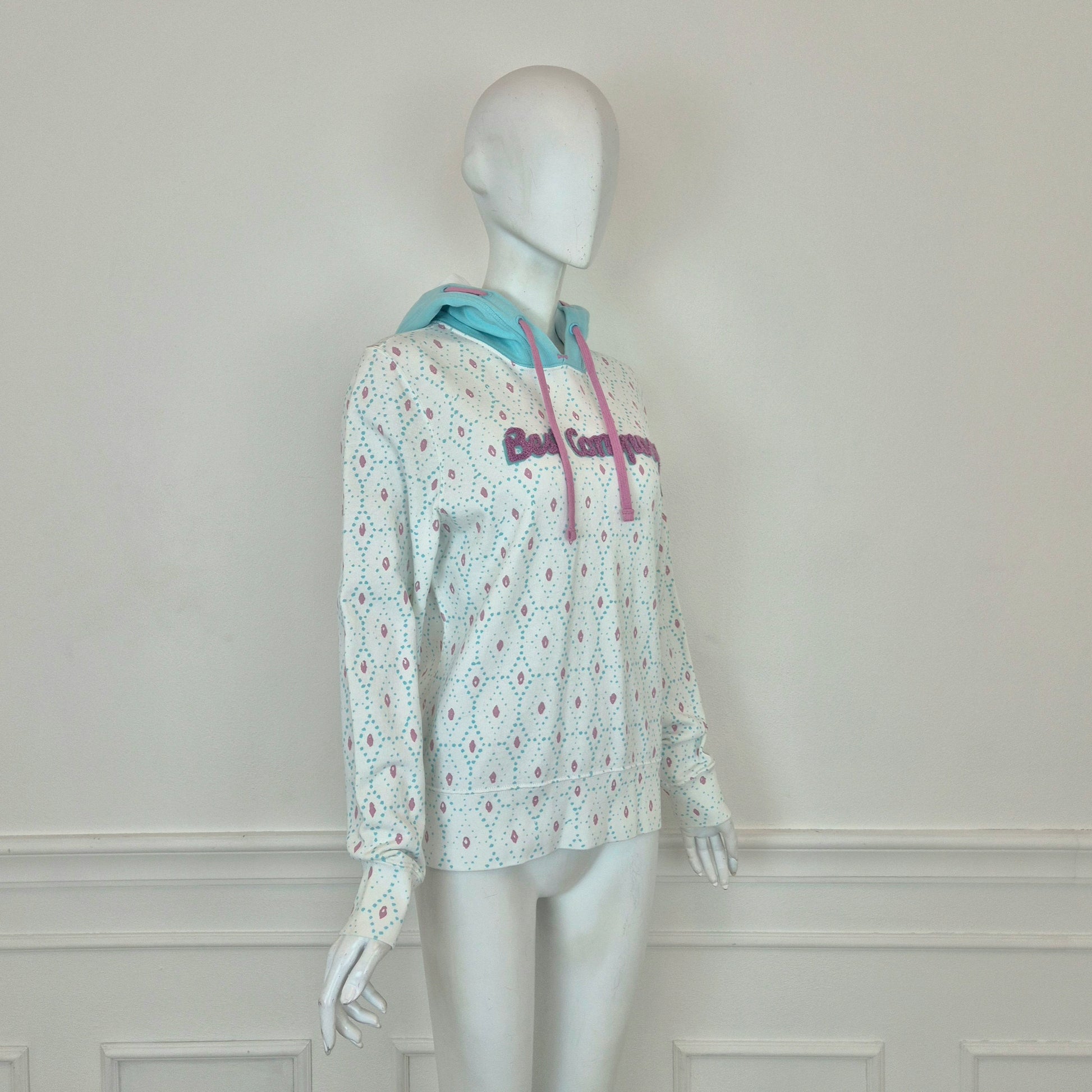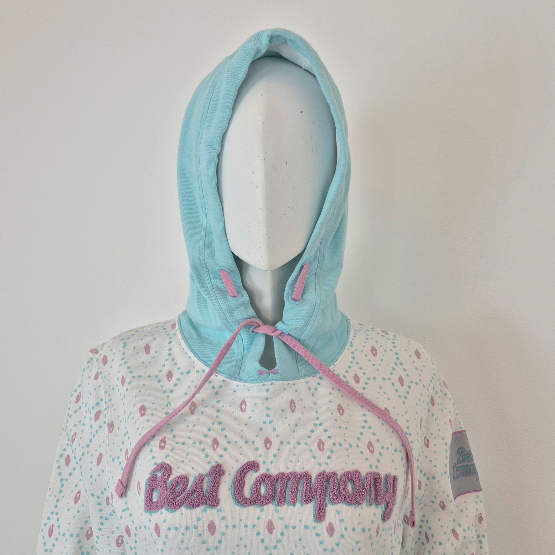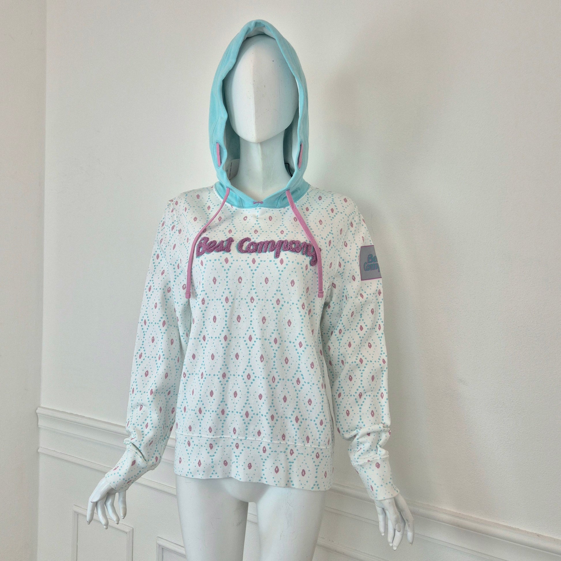BEST COMPANY by Olmes Carretti - Felpa vintage ma nuova in puro cotone color bianco. con disegni sui toni dell'azzurro e del rosa, cappuccio e scritta in "spugna" sul torace.