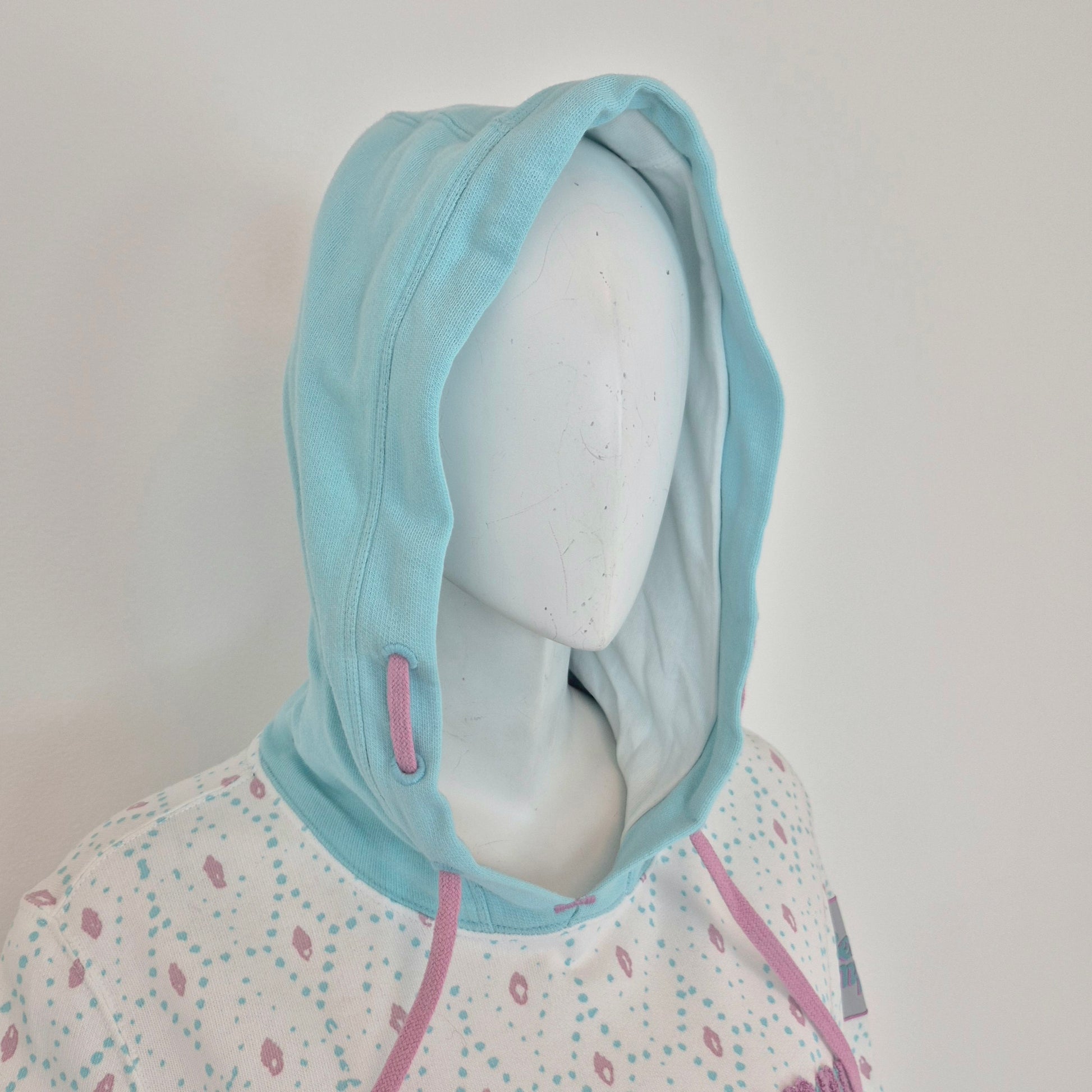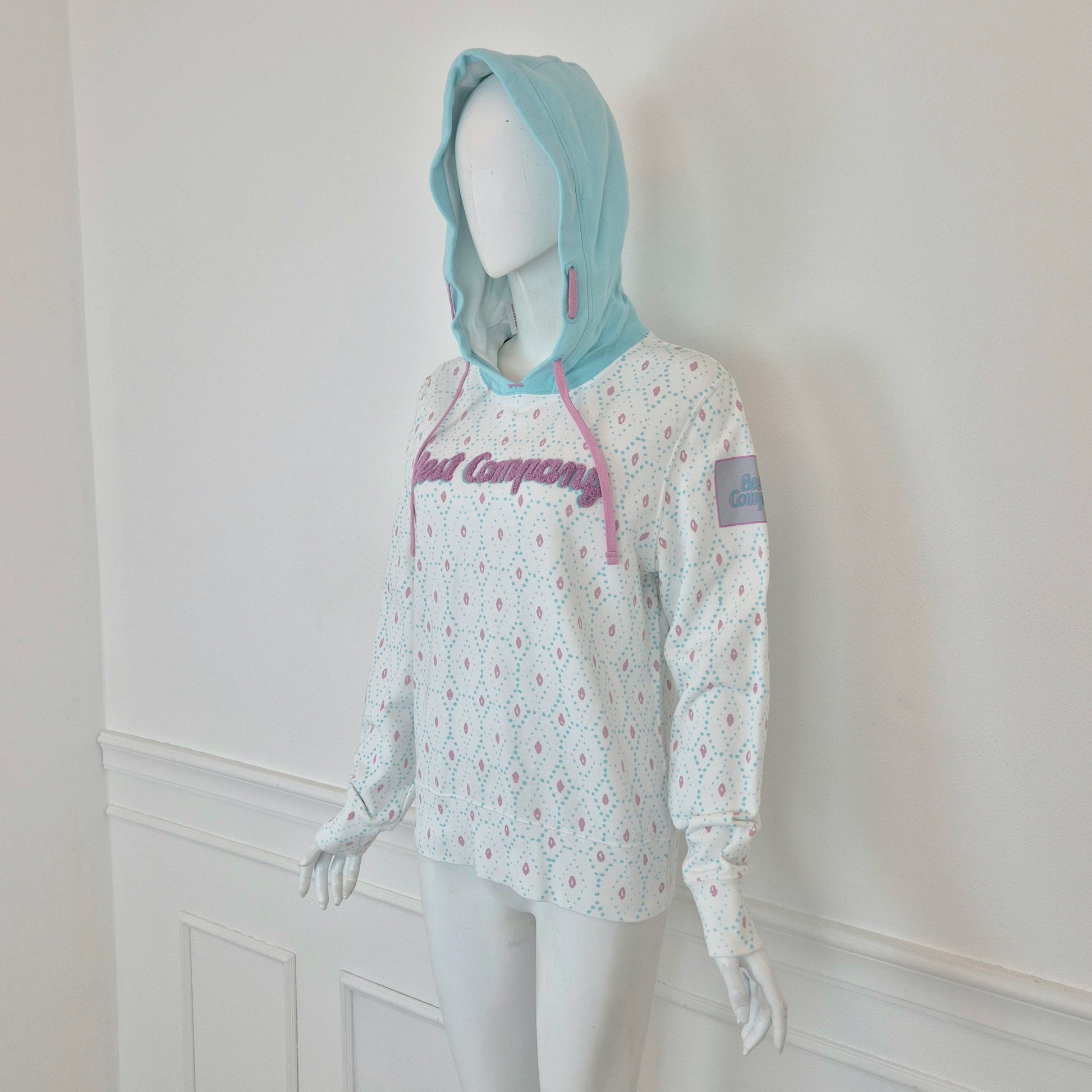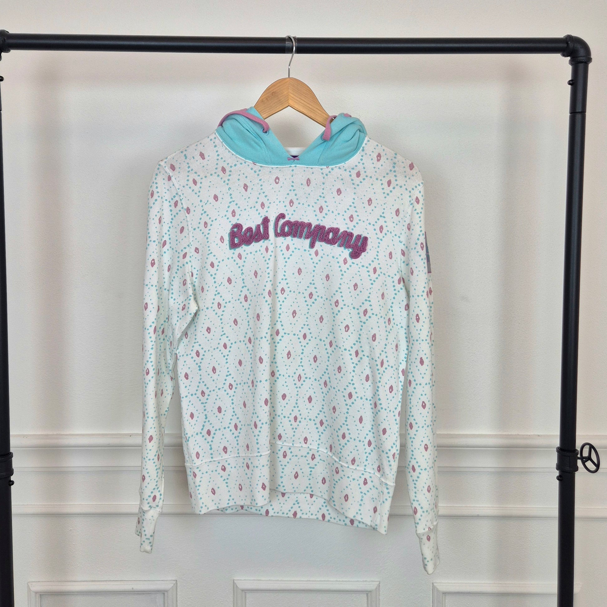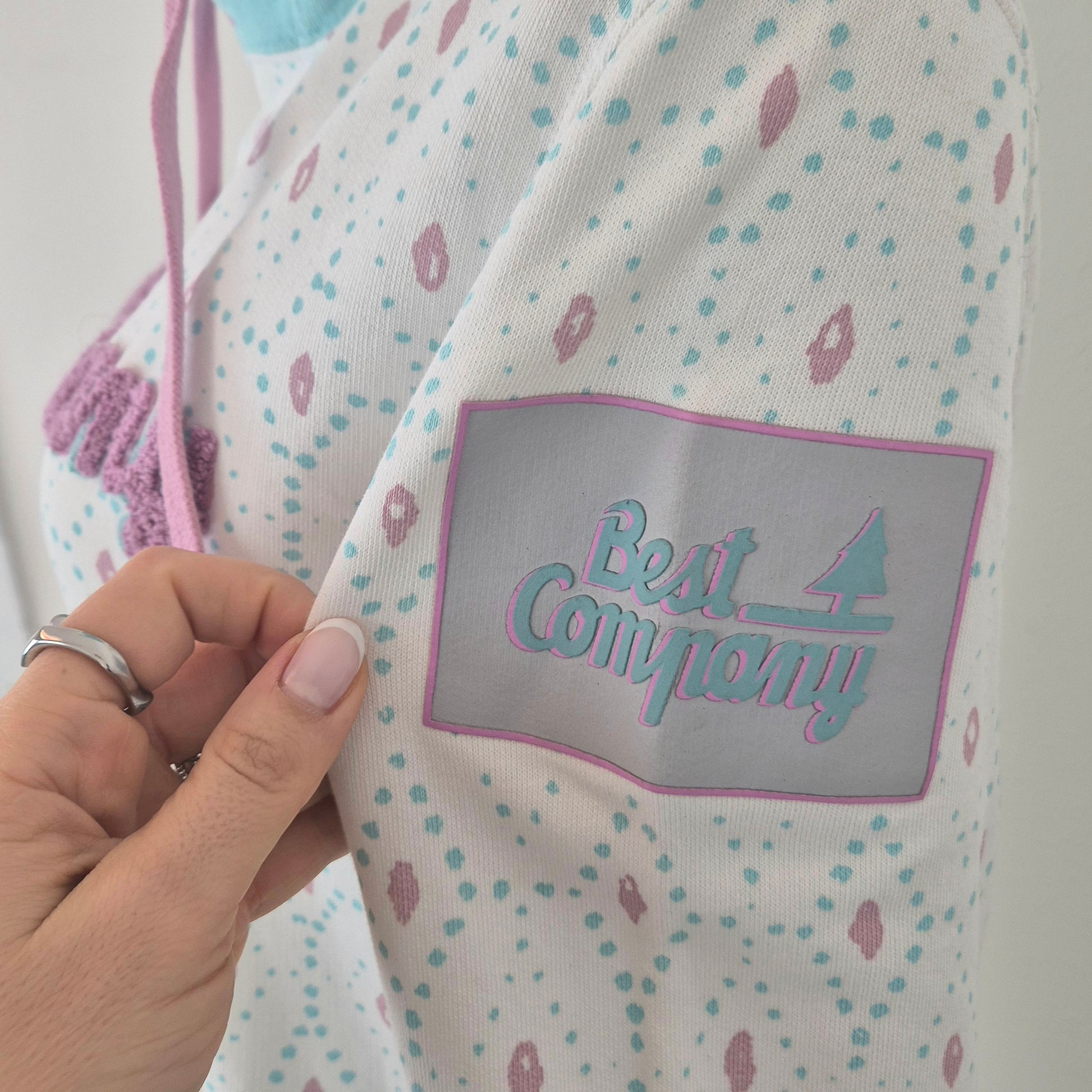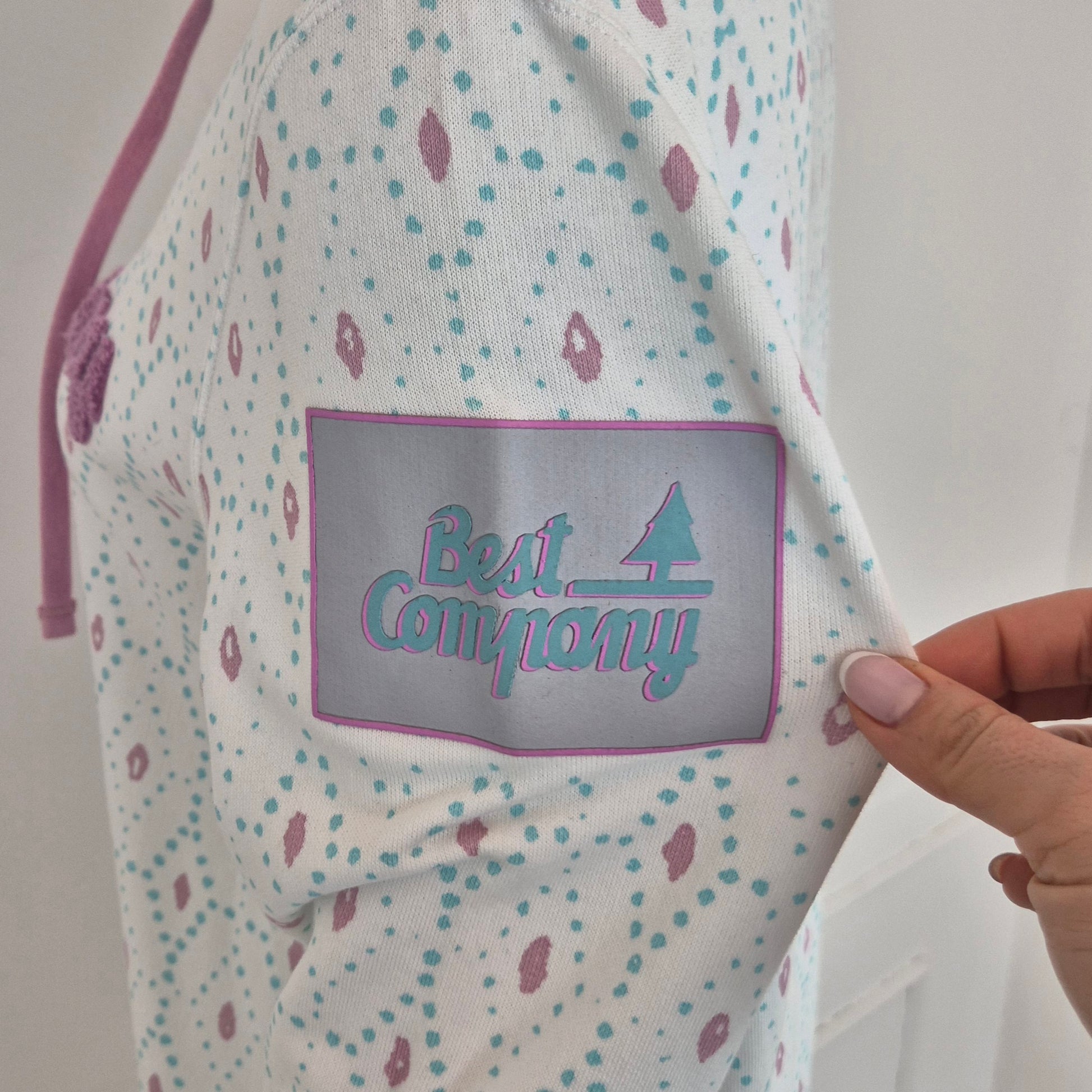 BEST COMPANY by Olmes Carretti - Felpa vintage ma nuova in puro cotone color bianco. con disegni sui toni dell'azzurro e del rosa, cappuccio e scritta in "spugna" sul torace.