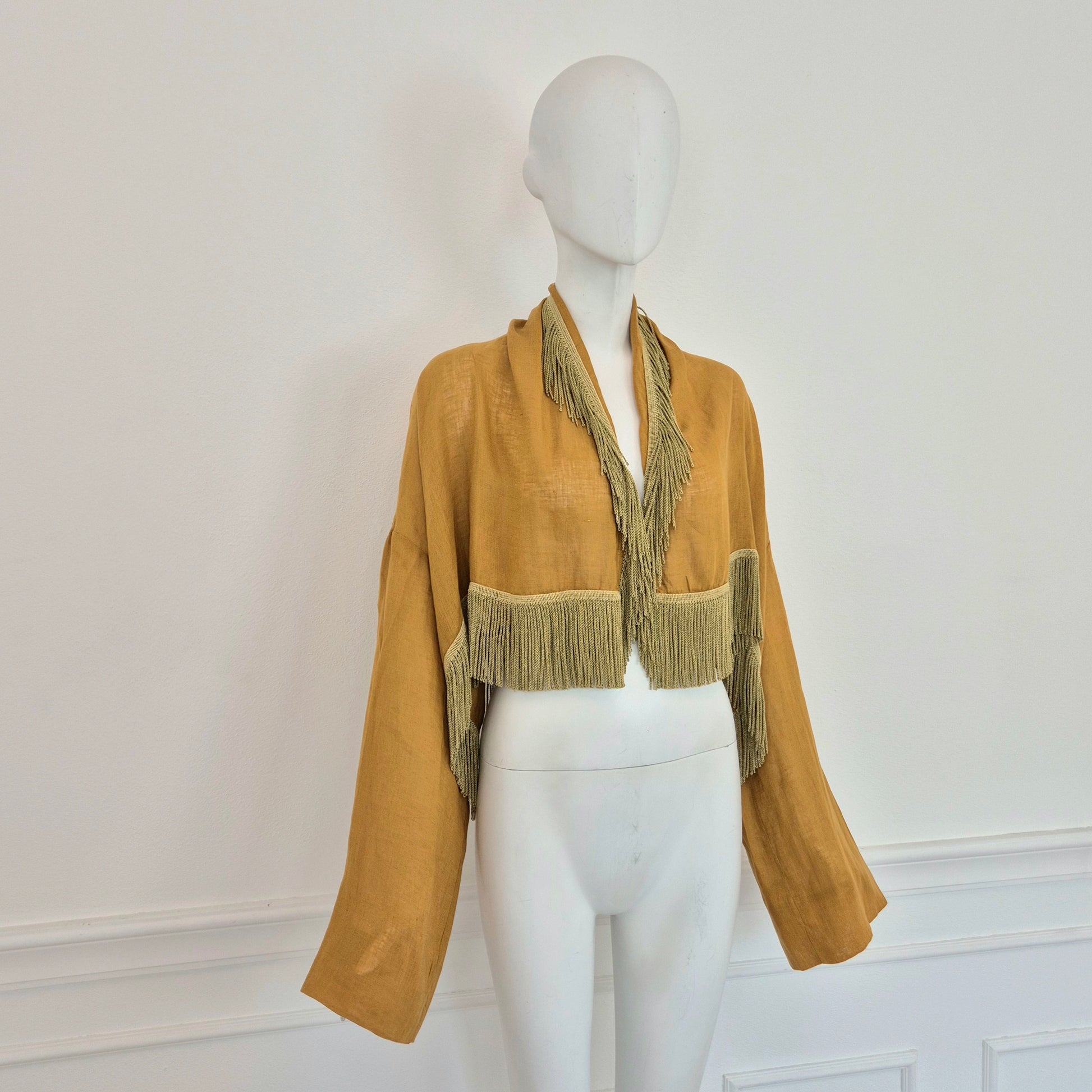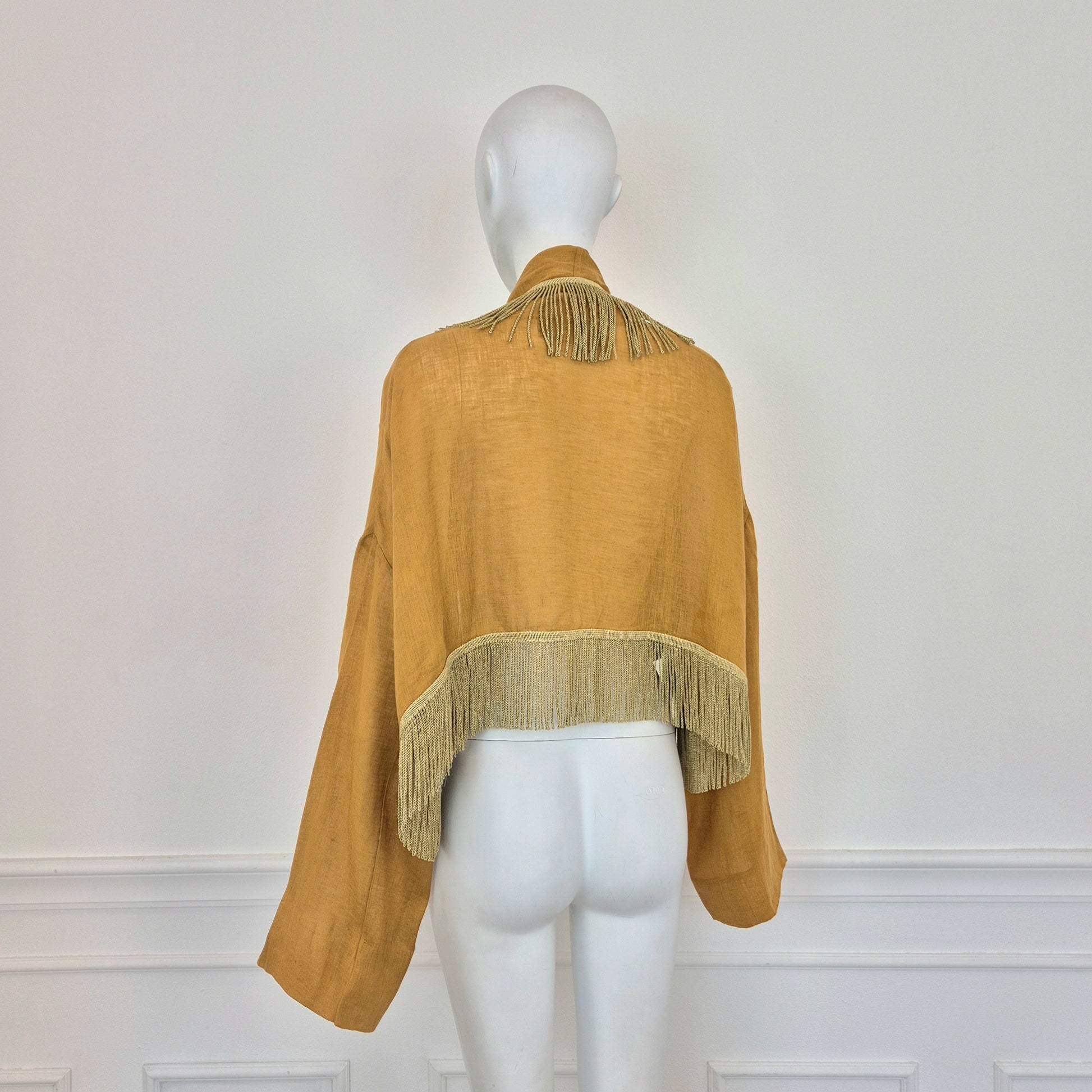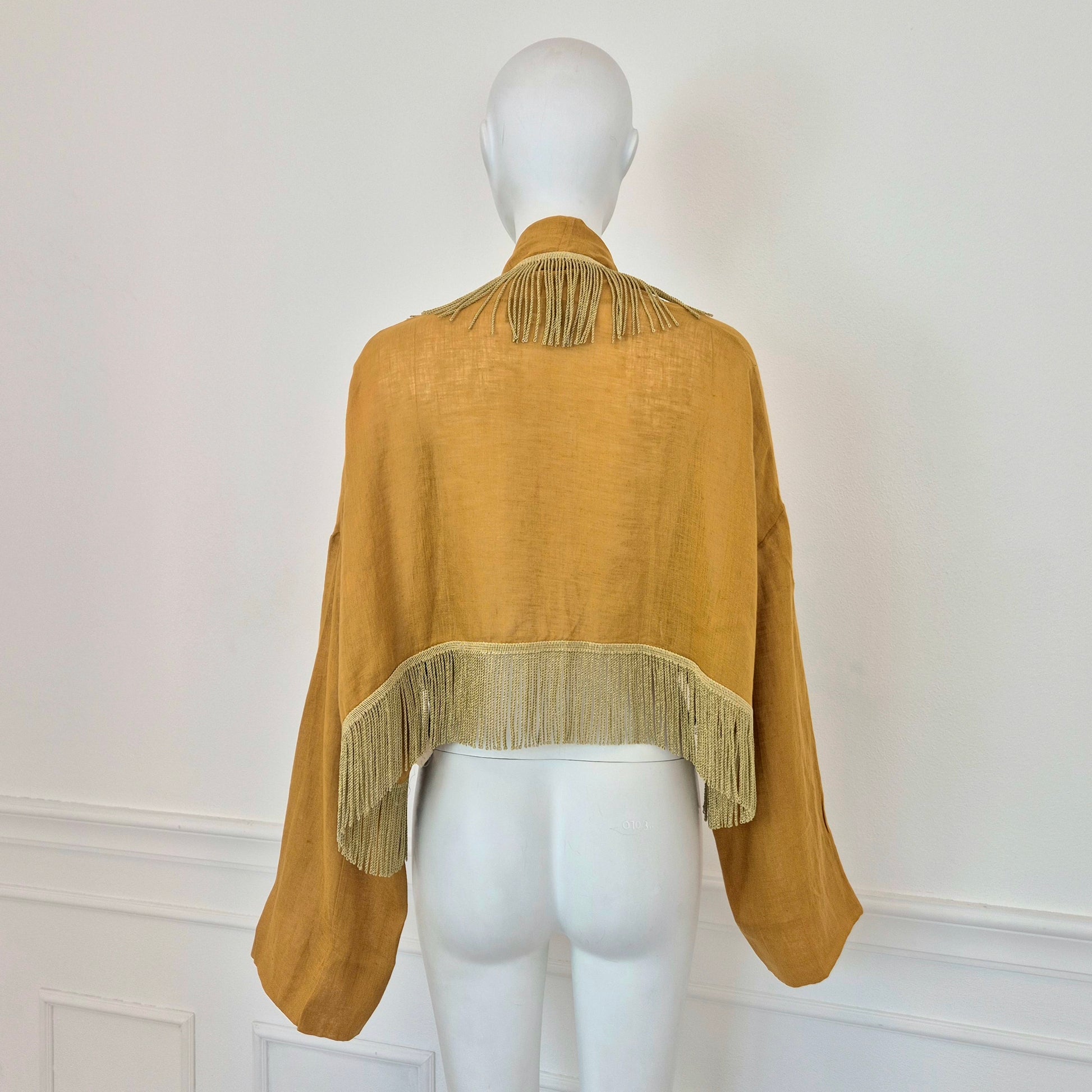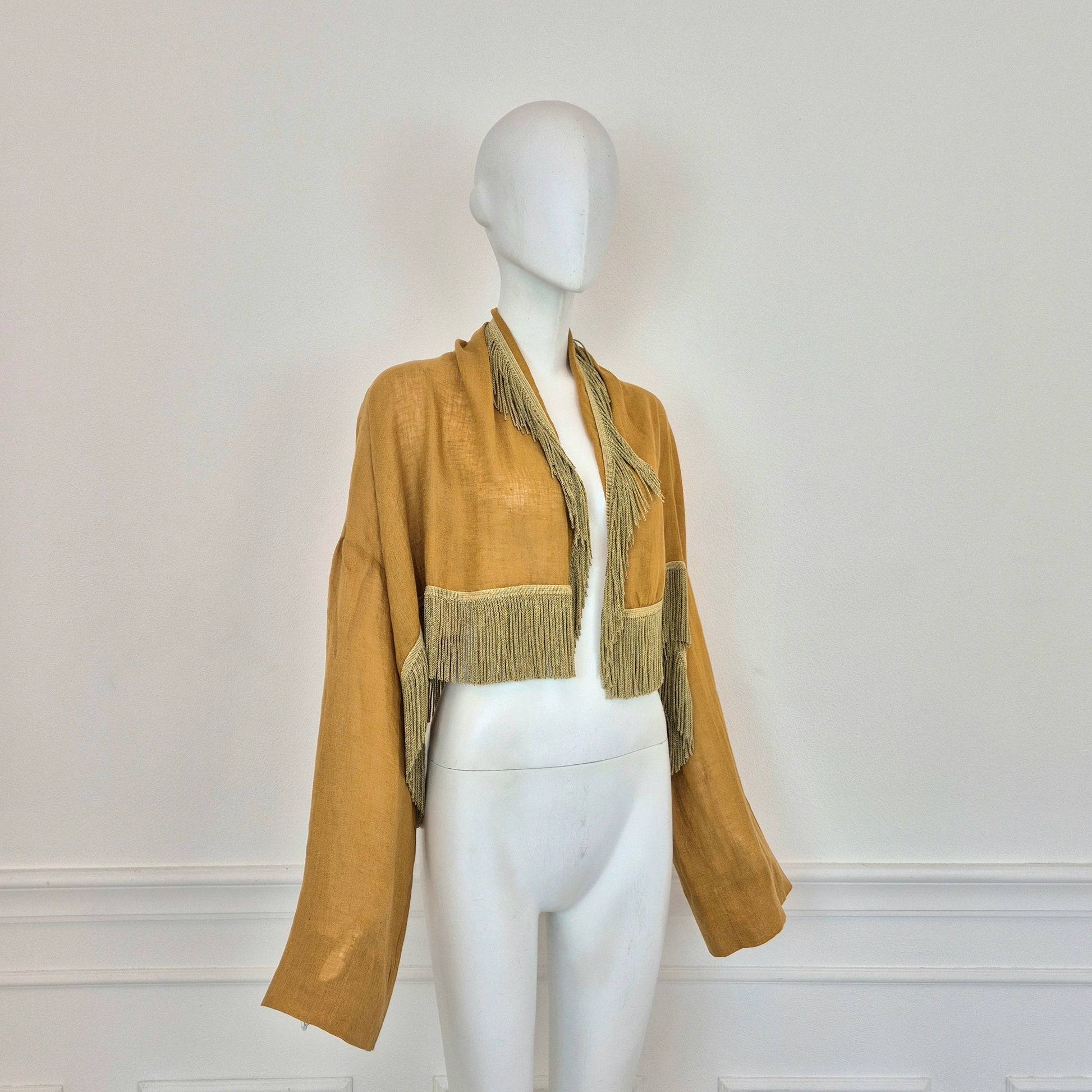 CALLAGHAN by ROMEO GIGLI (spring summer 1989) giacca corta vintage in lino color senape con applicazione di frange dorate.