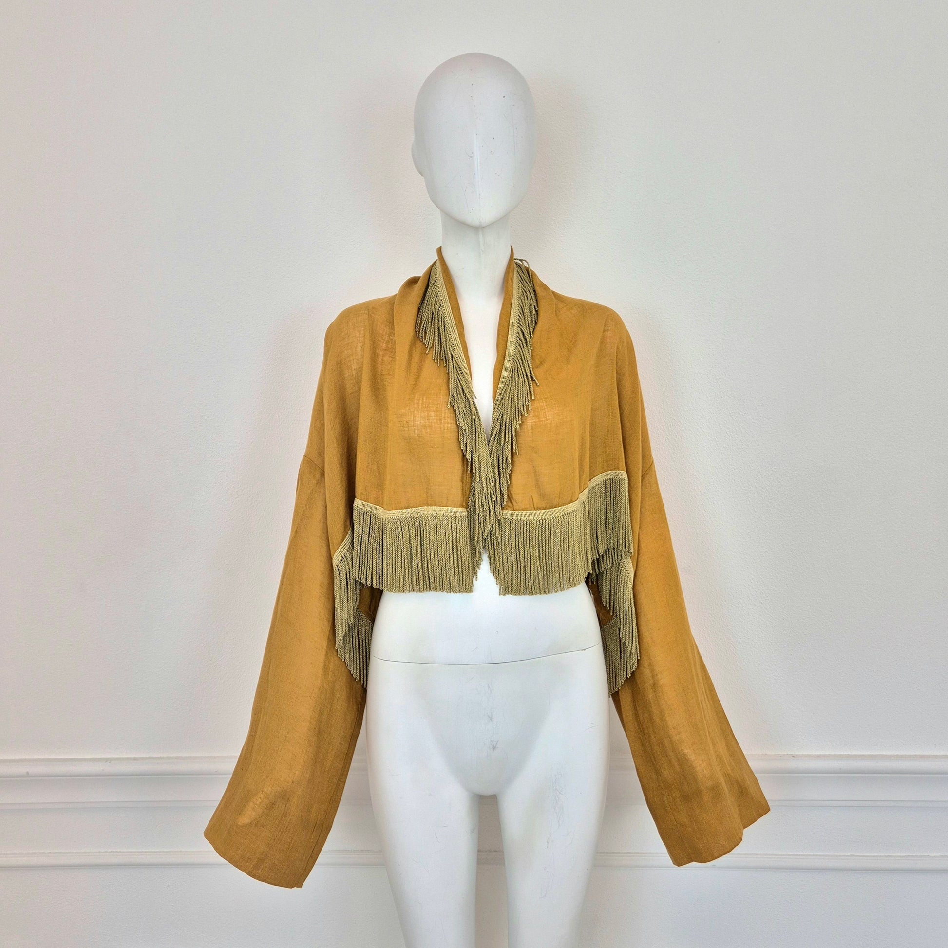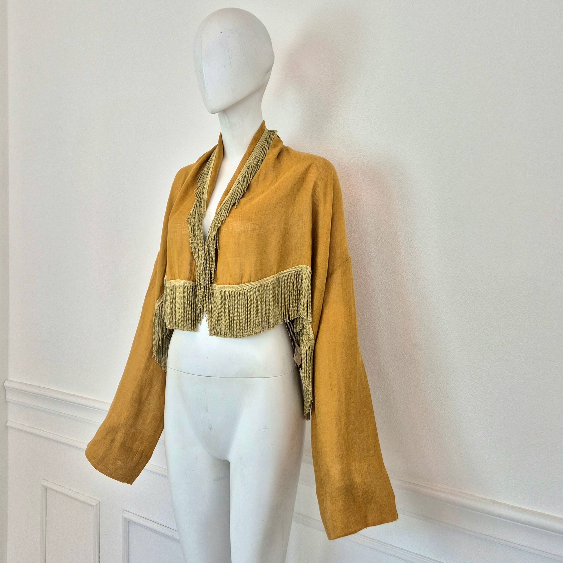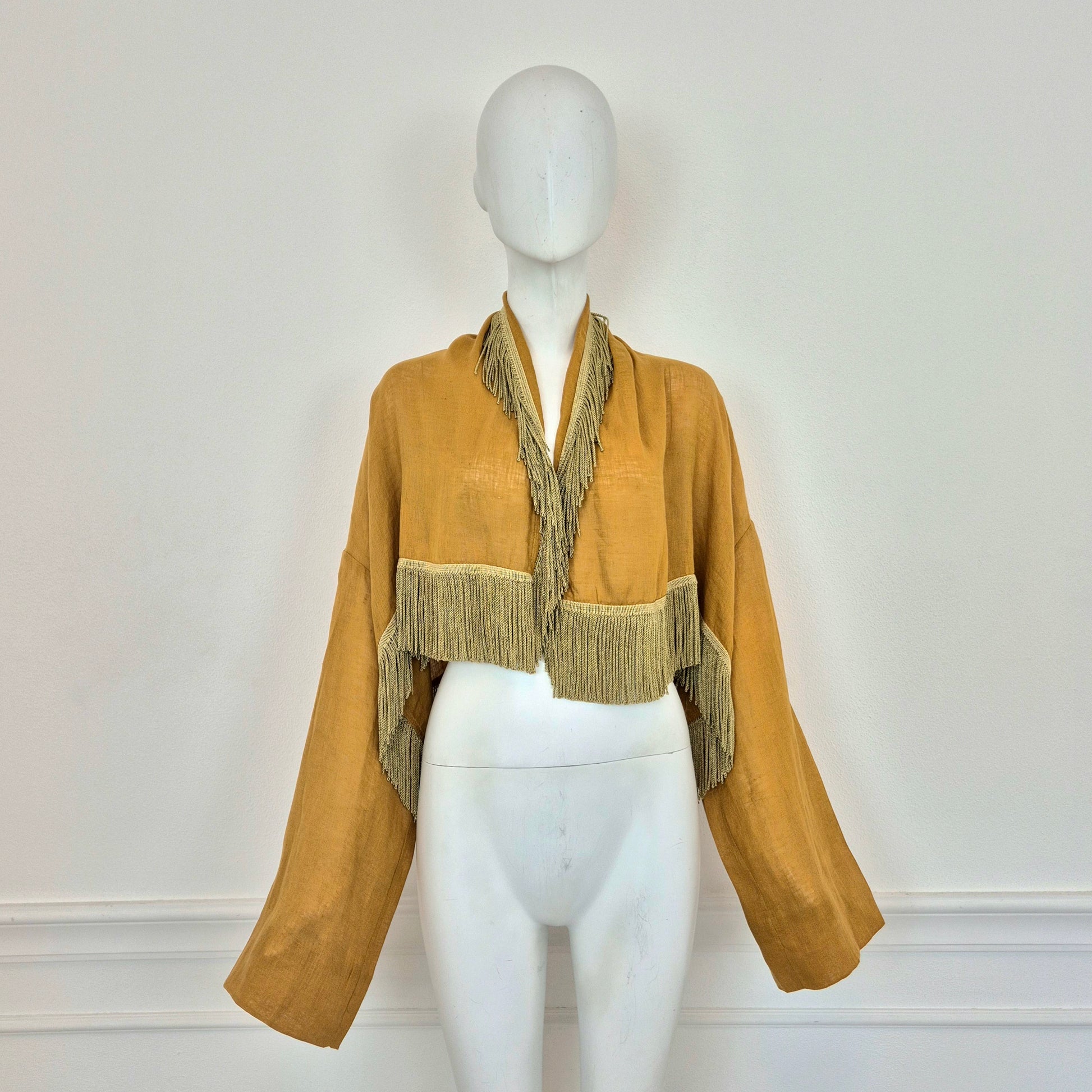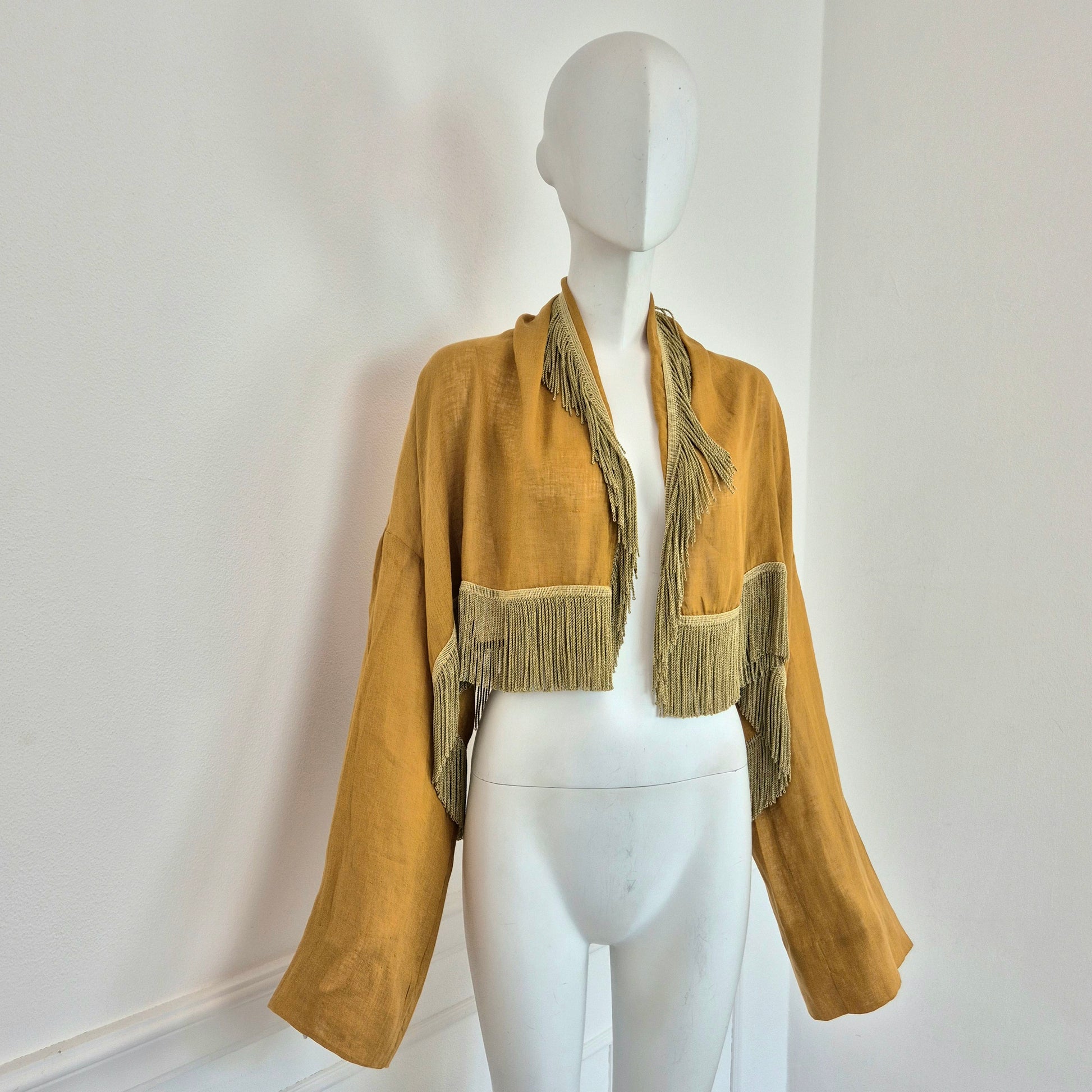 CALLAGHAN by ROMEO GIGLI (spring summer 1989) giacca corta vintage in lino color senape con applicazione di frange dorate.