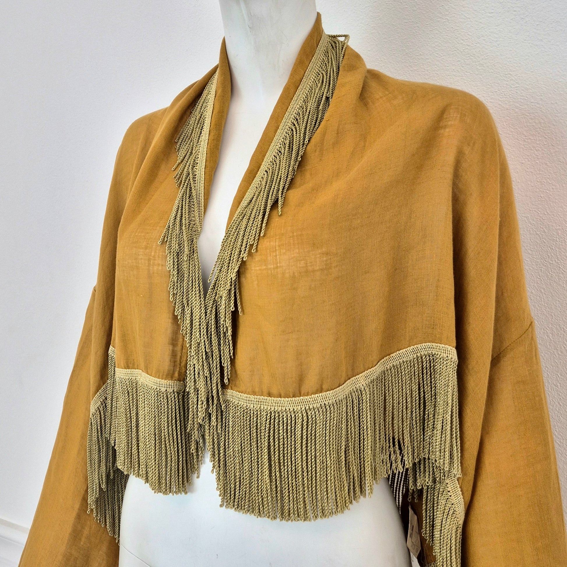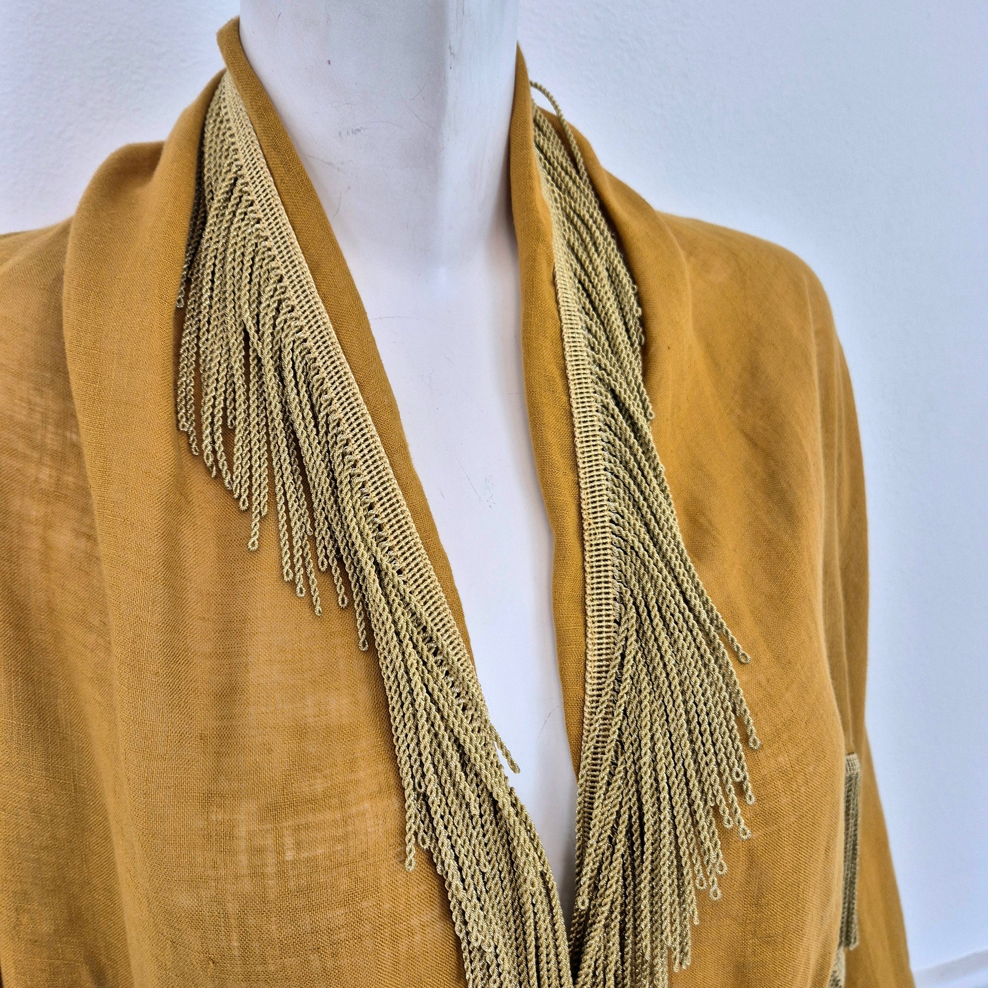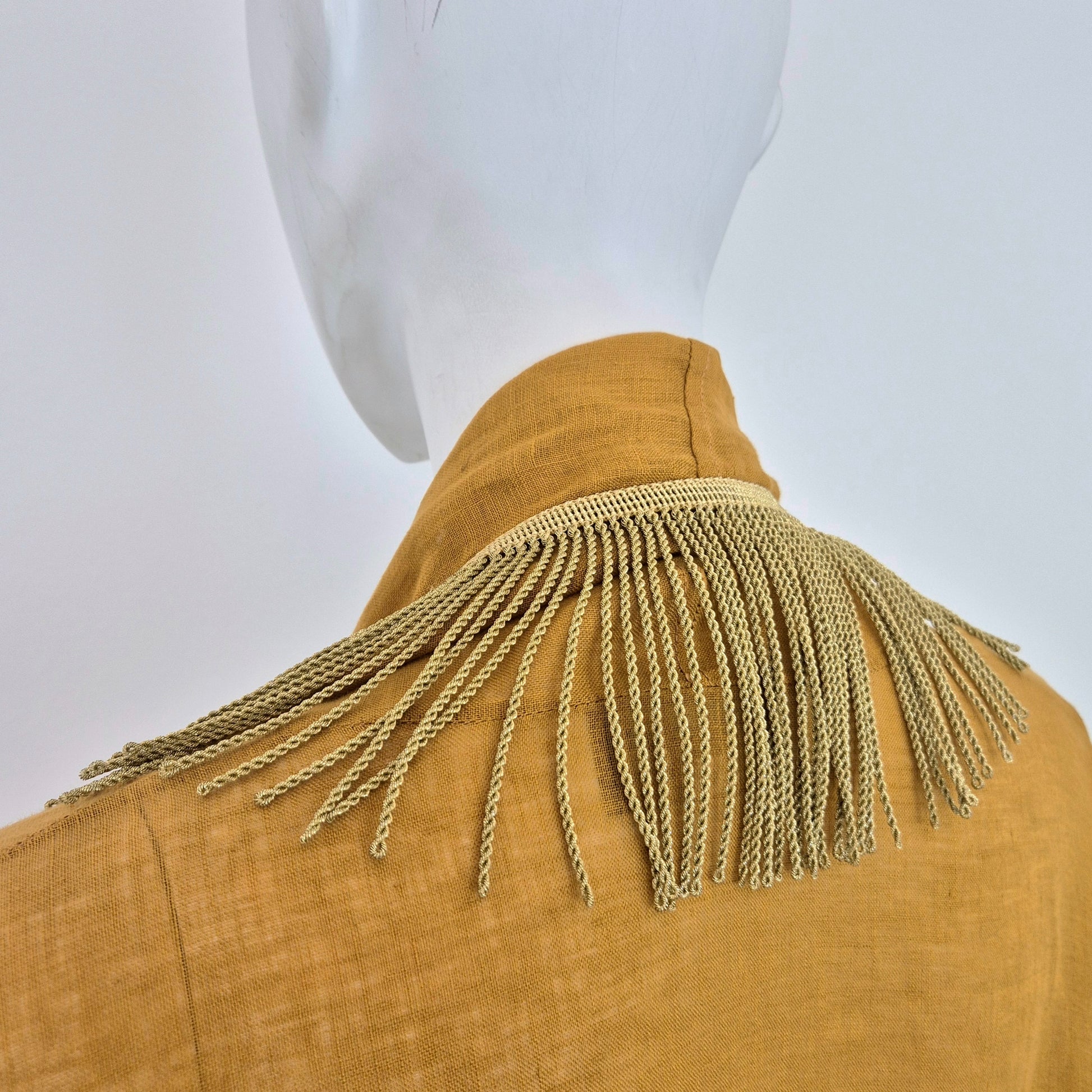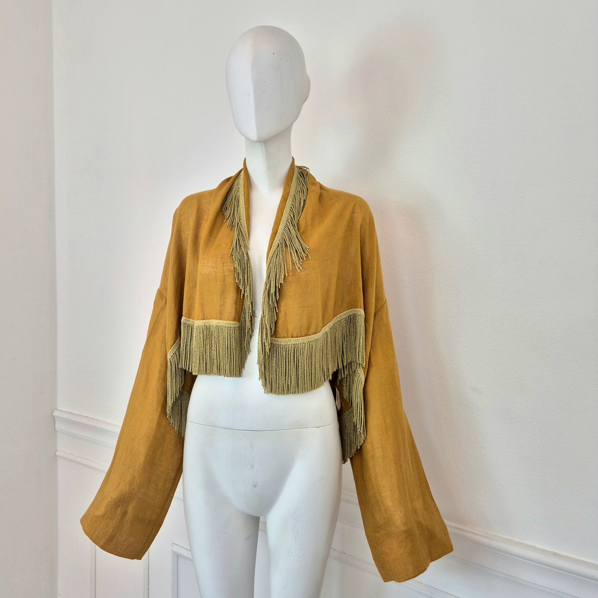 CALLAGHAN by ROMEO GIGLI (spring summer 1989) giacca corta vintage in lino color senape con applicazione di frange dorate.
