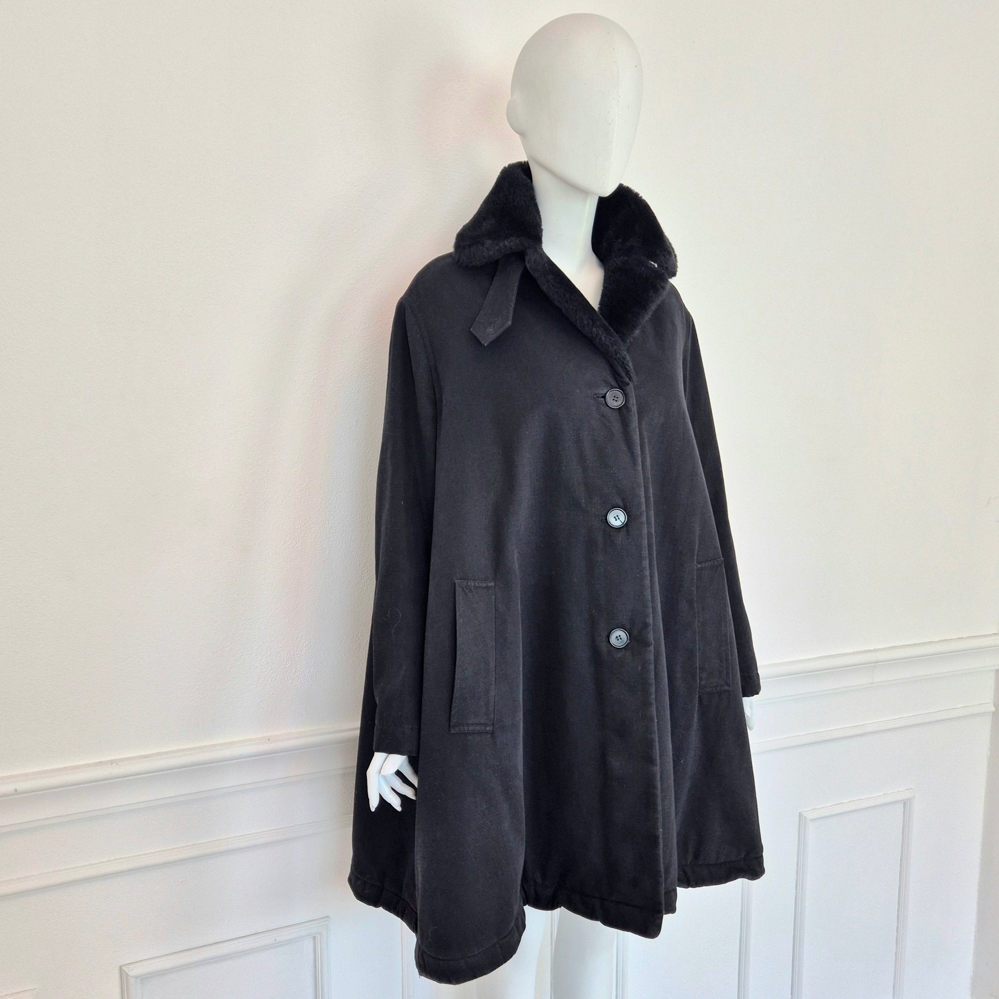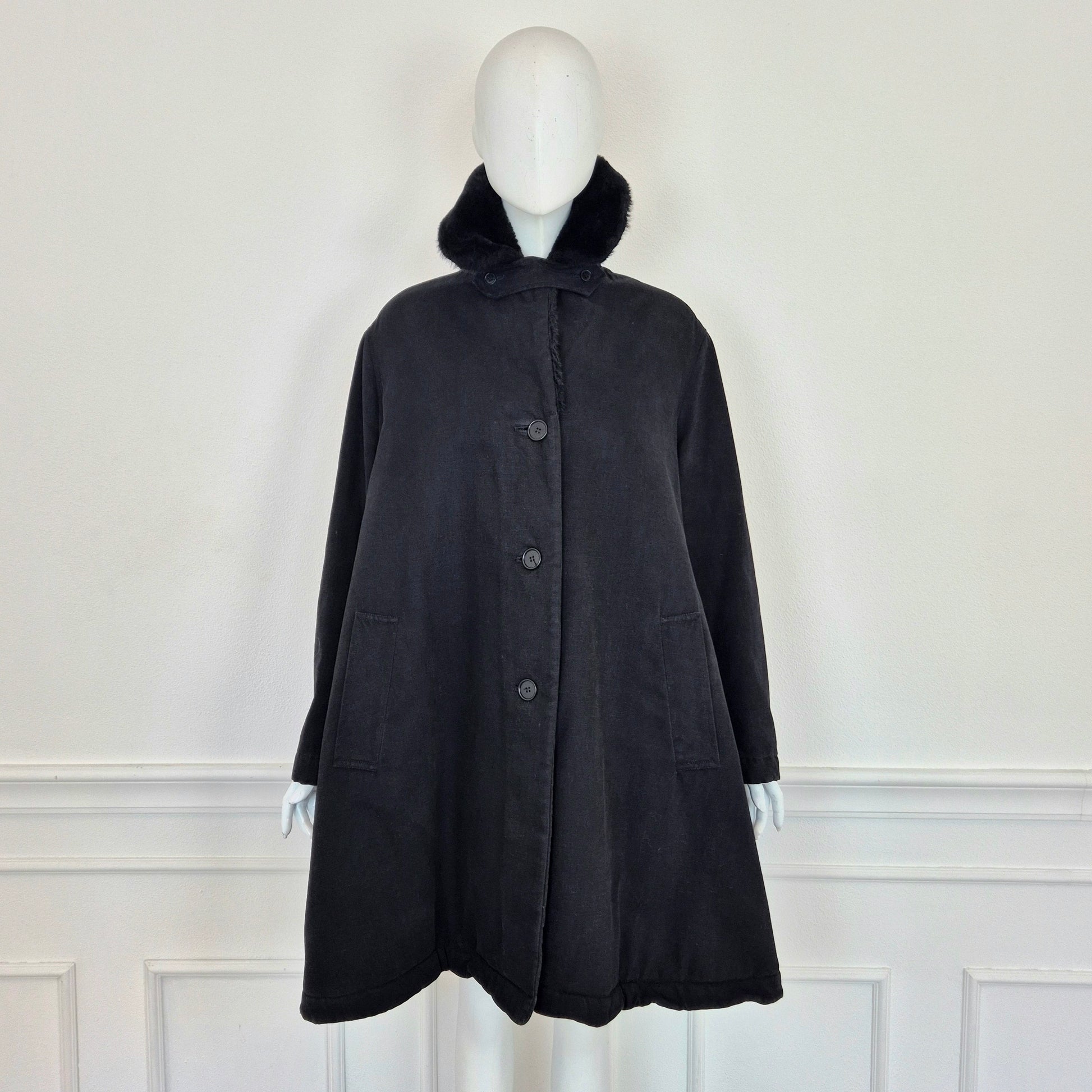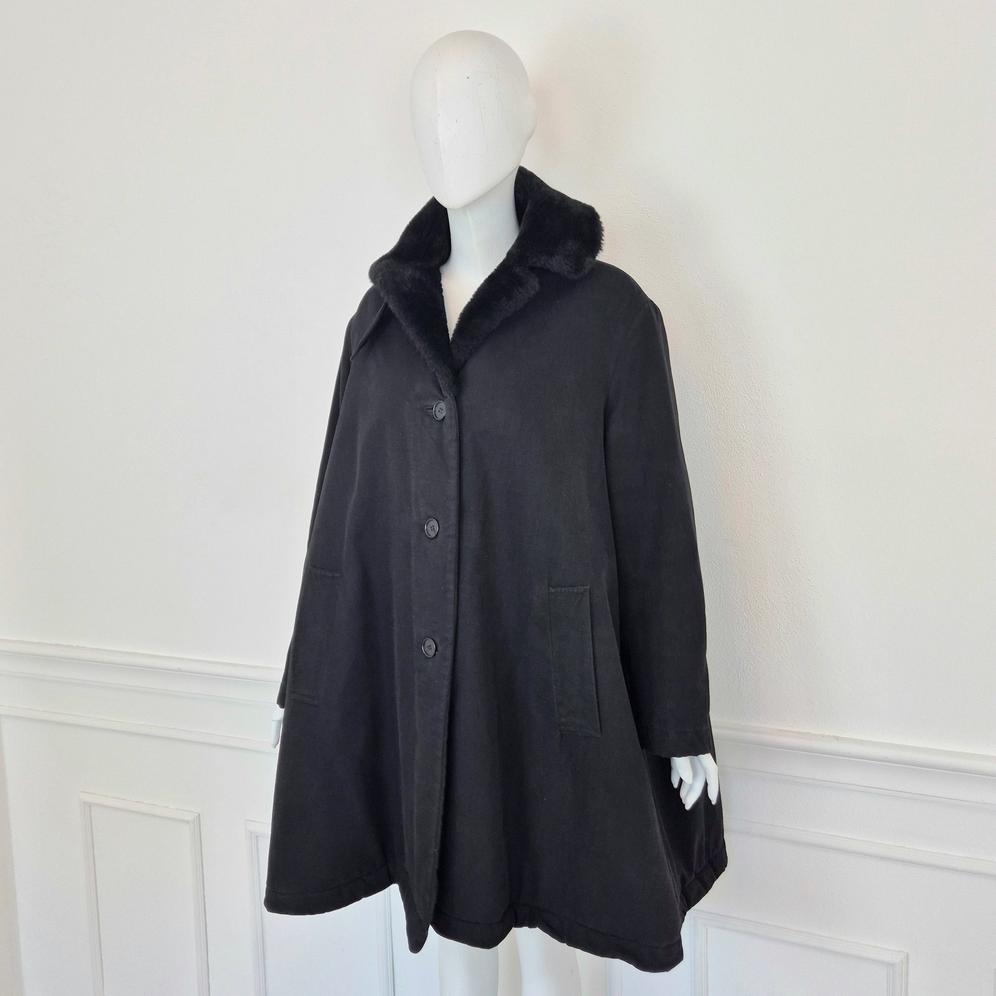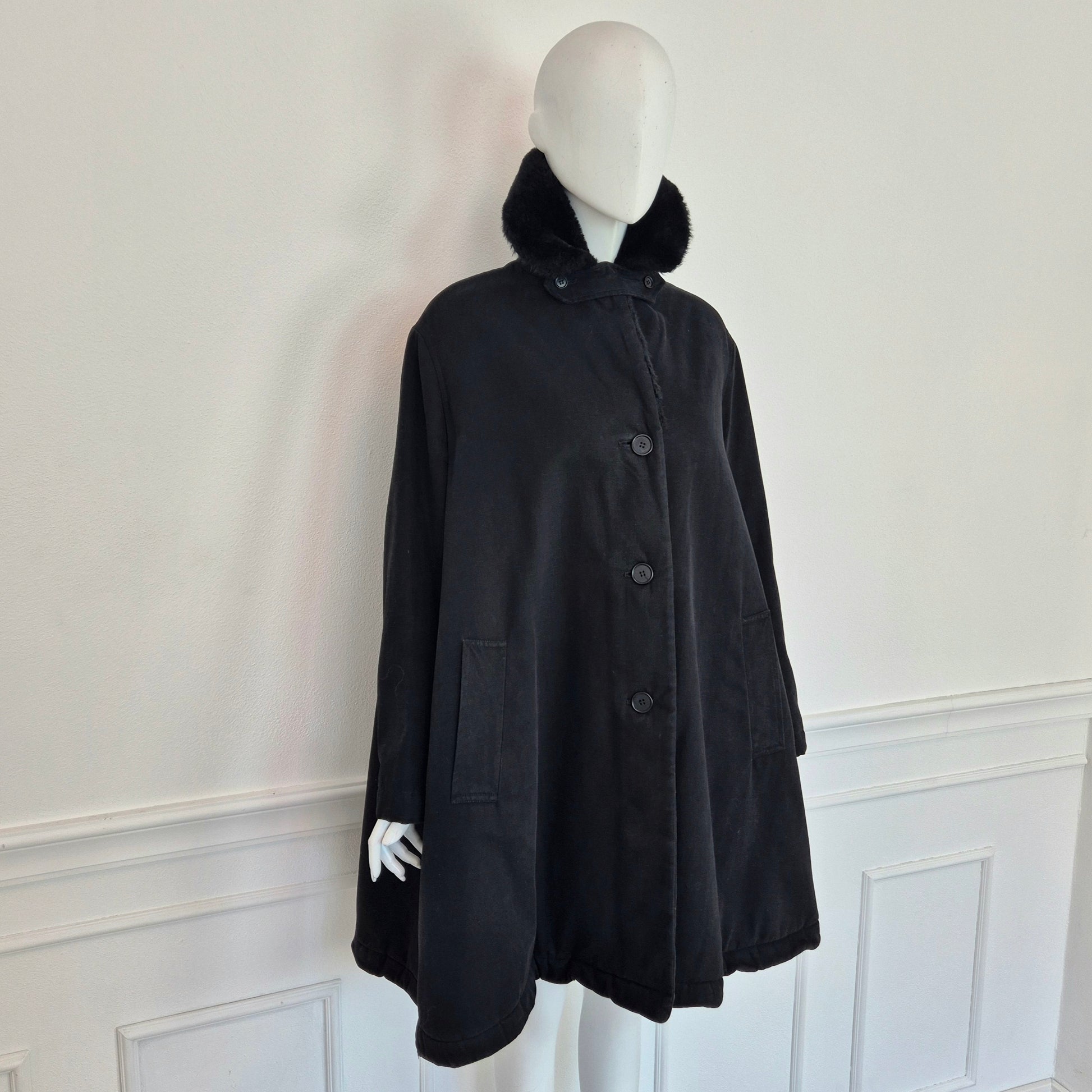 CALLAGHAN by Romeo Gigli (fw 1991) giaccone invernale color nero dalla linea a trapezio con interno in morbidissima ecopelliccia tono su tono. lunga fila di bottoni su tutta la lunghezza e tasche frontali.