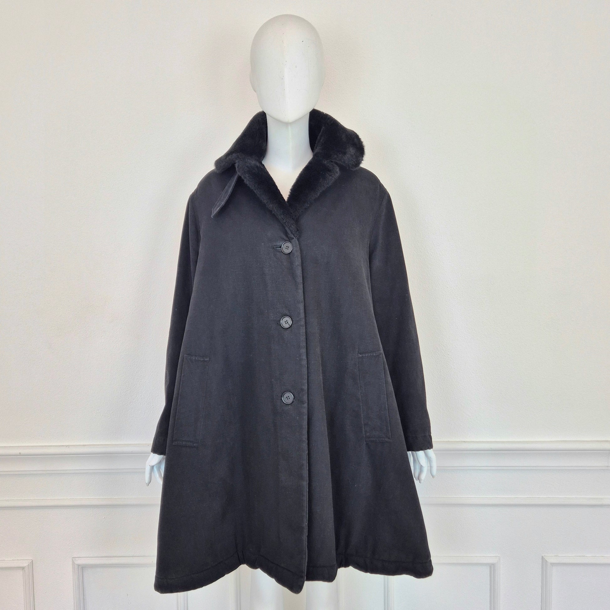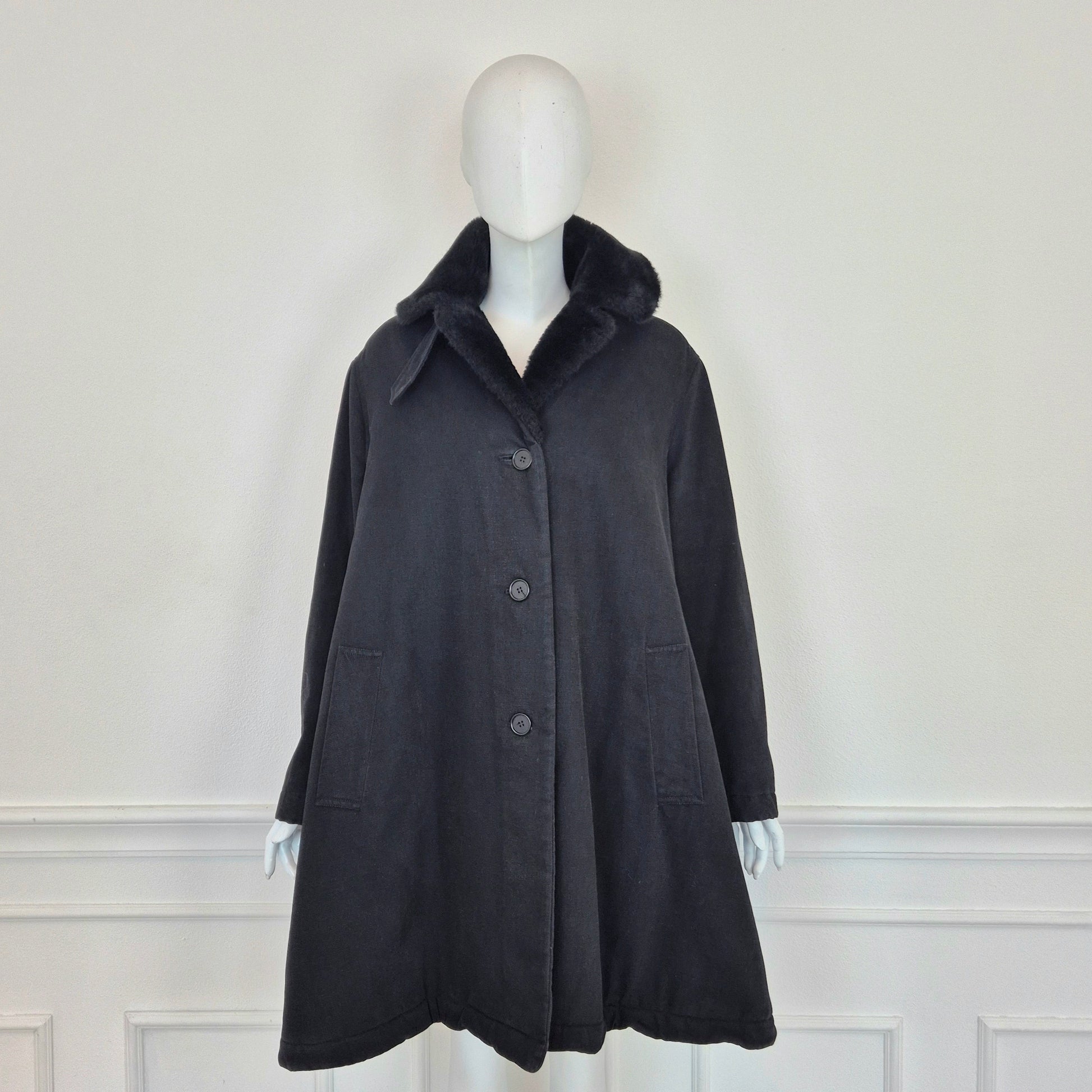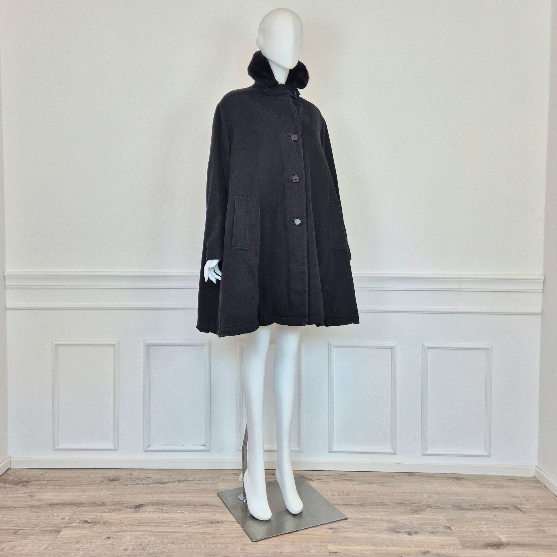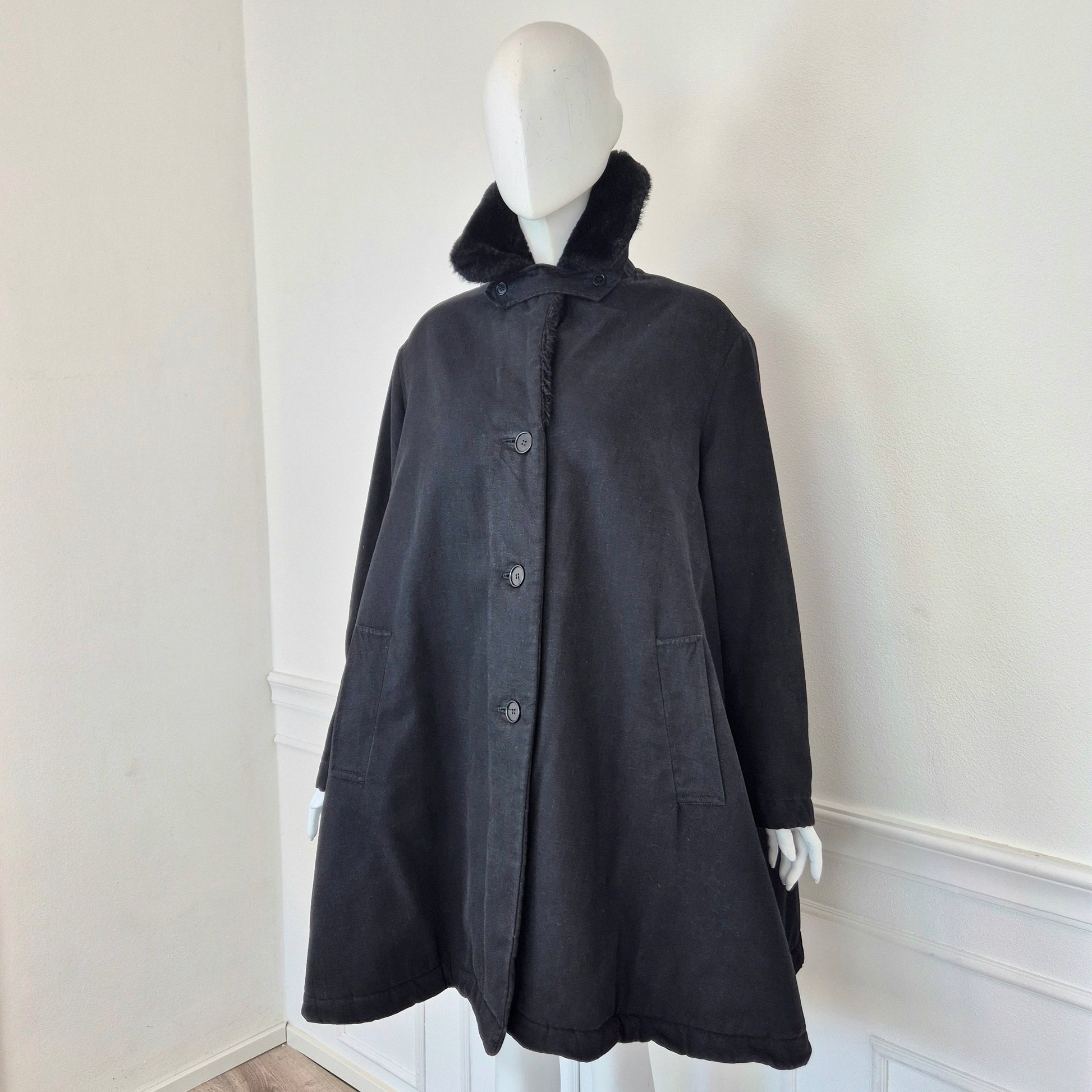 CALLAGHAN by Romeo Gigli (fw 1991) giaccone invernale color nero dalla linea a trapezio con interno in morbidissima ecopelliccia tono su tono. lunga fila di bottoni su tutta la lunghezza e tasche frontali.