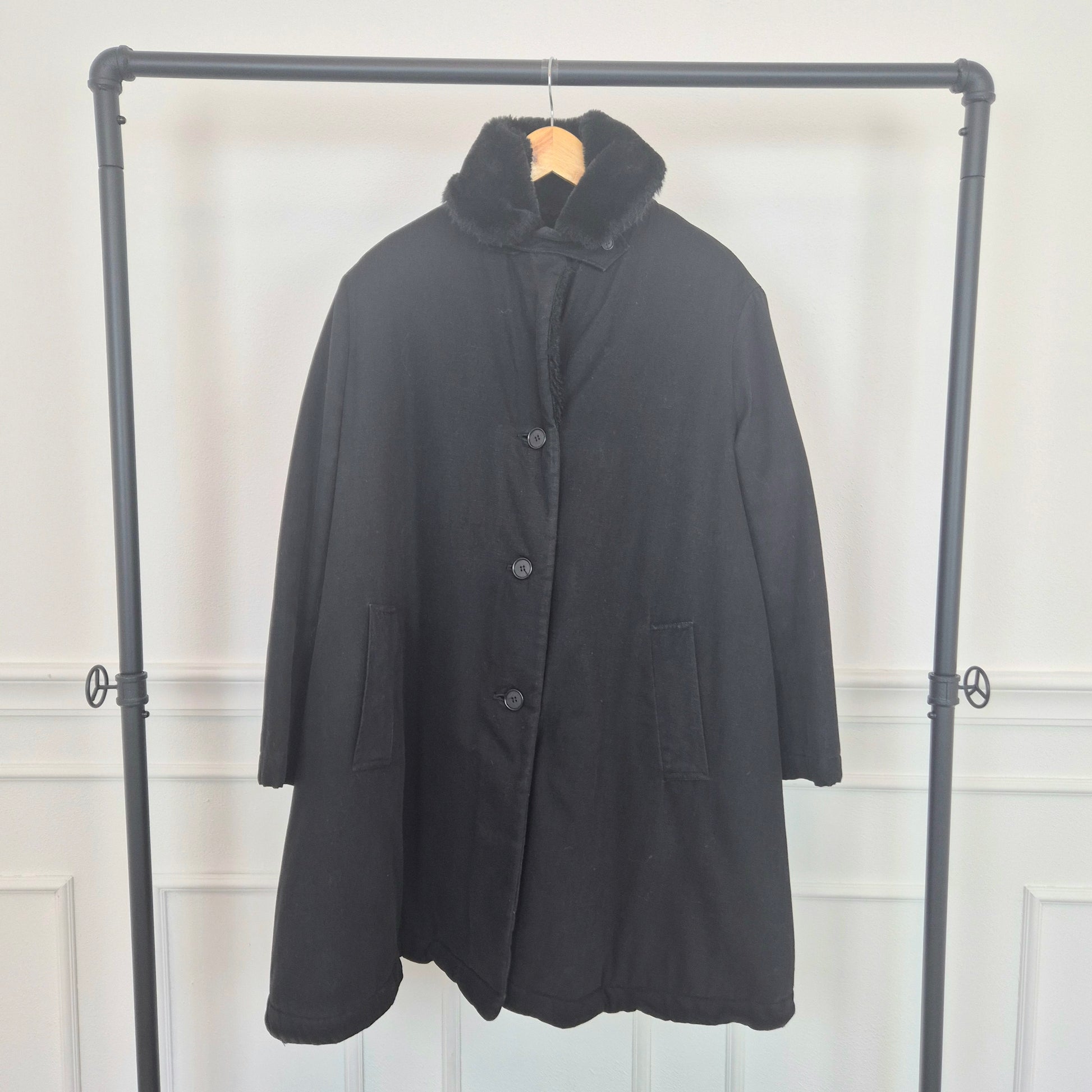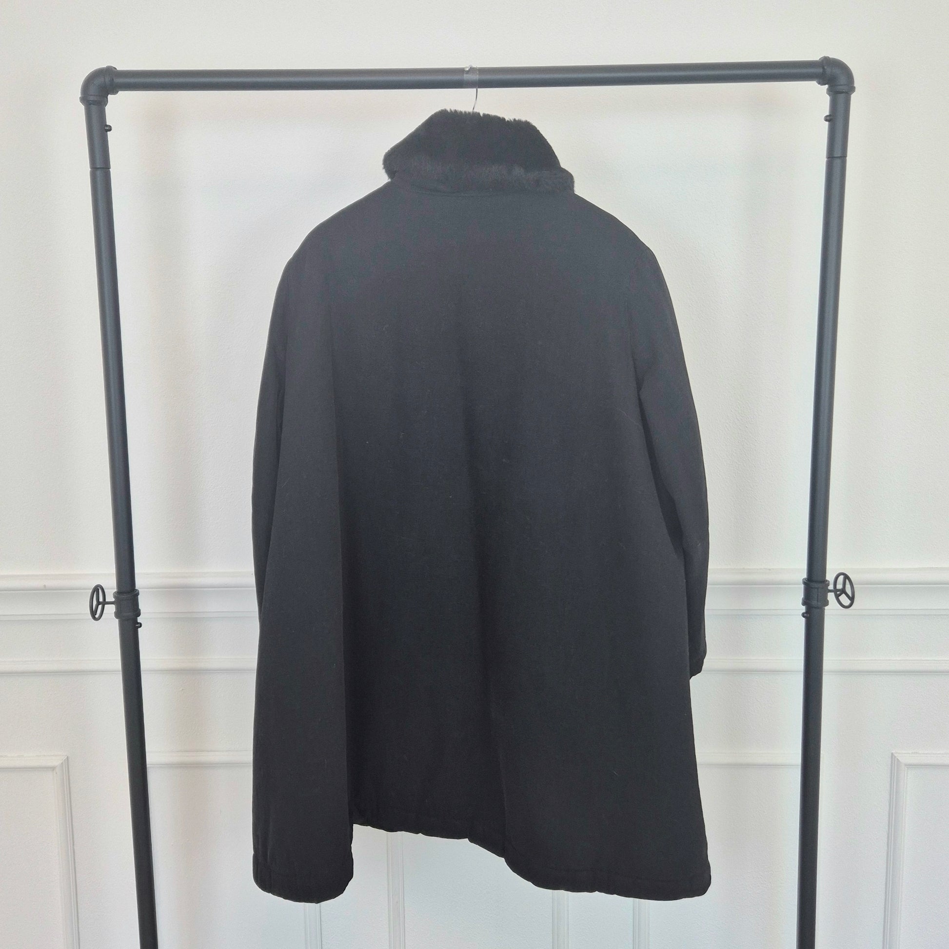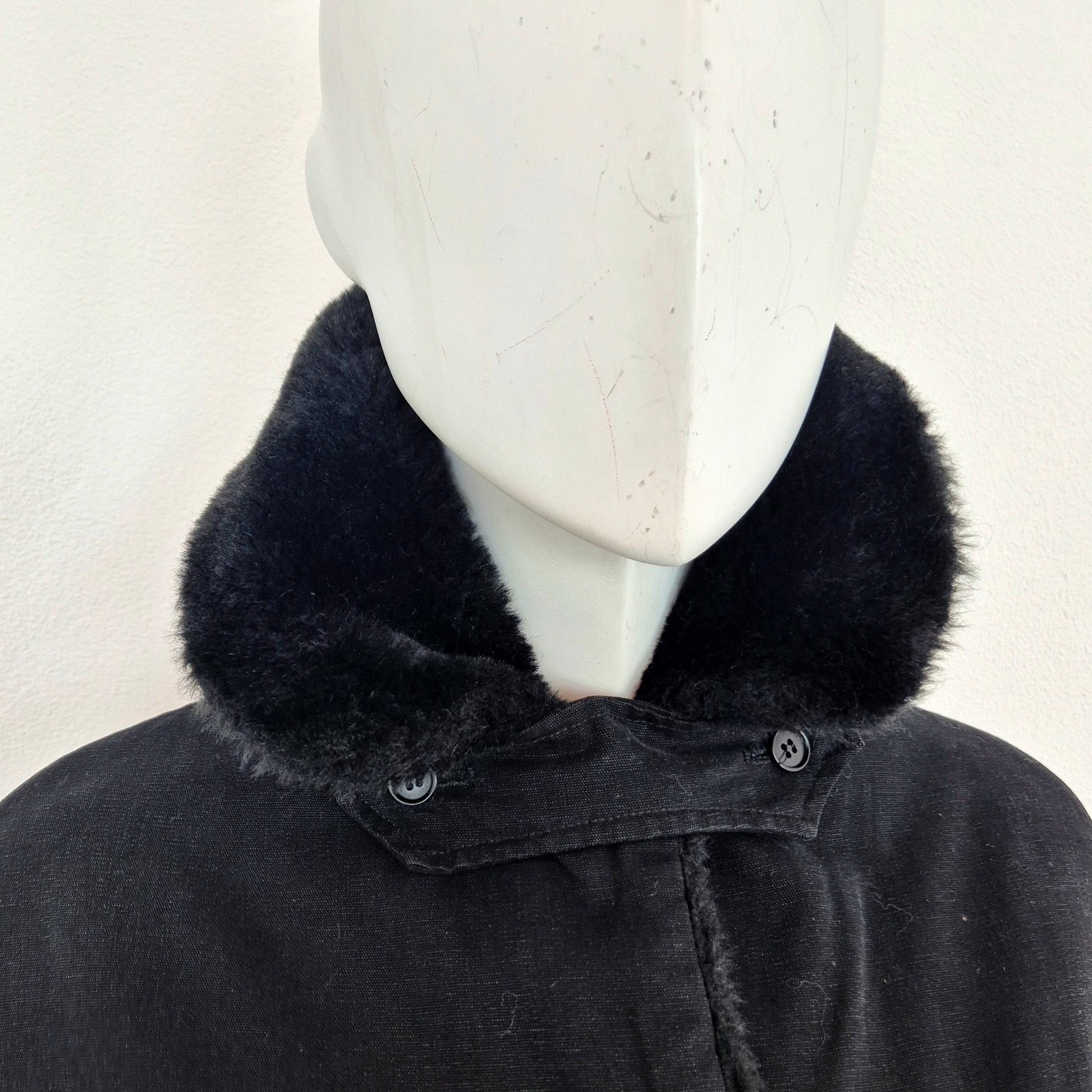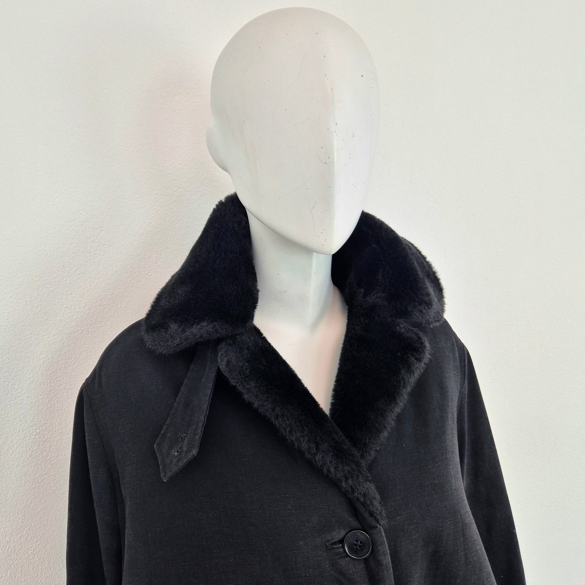 CALLAGHAN by Romeo Gigli (fw 1991) giaccone invernale color nero dalla linea a trapezio con interno in morbidissima ecopelliccia tono su tono. lunga fila di bottoni su tutta la lunghezza e tasche frontali.