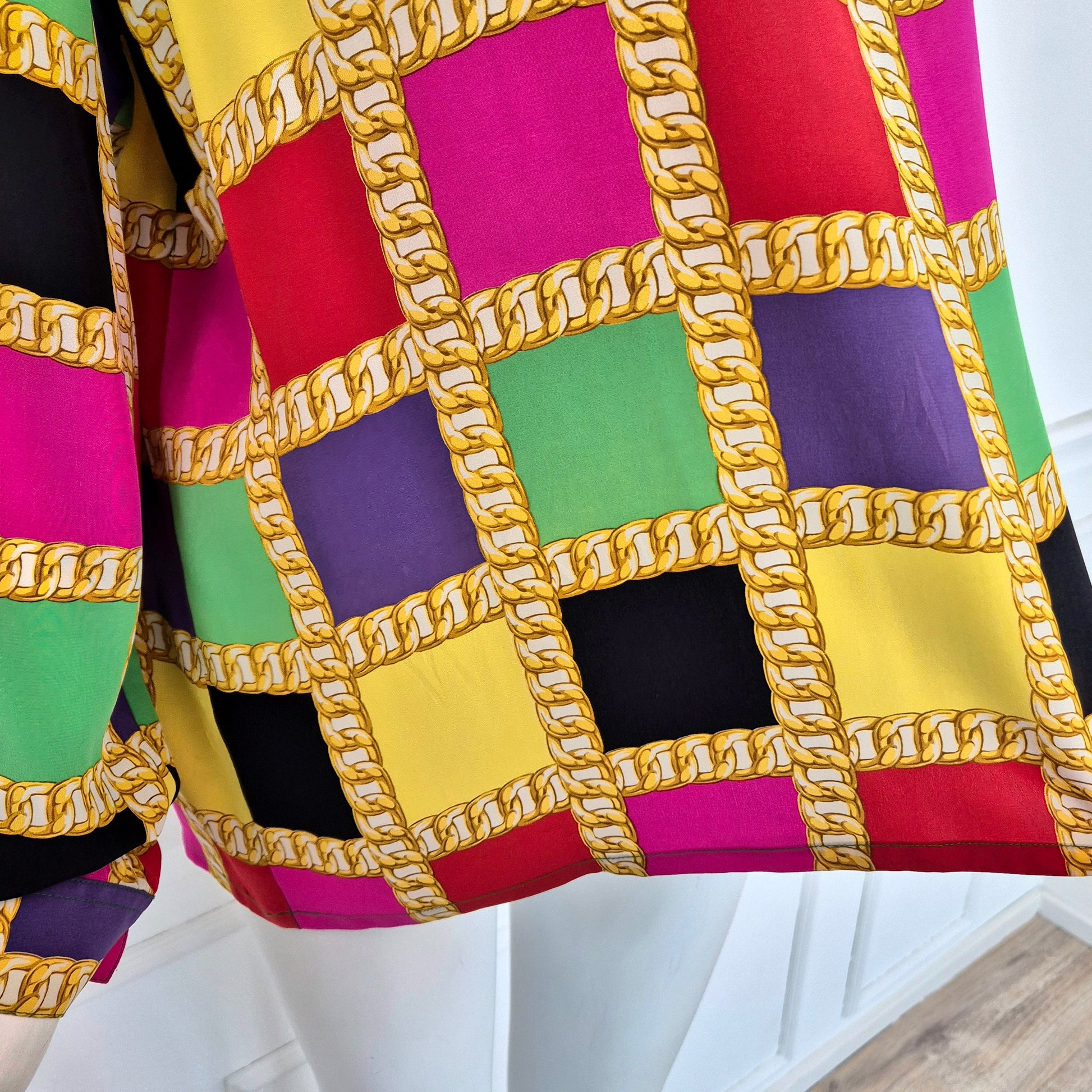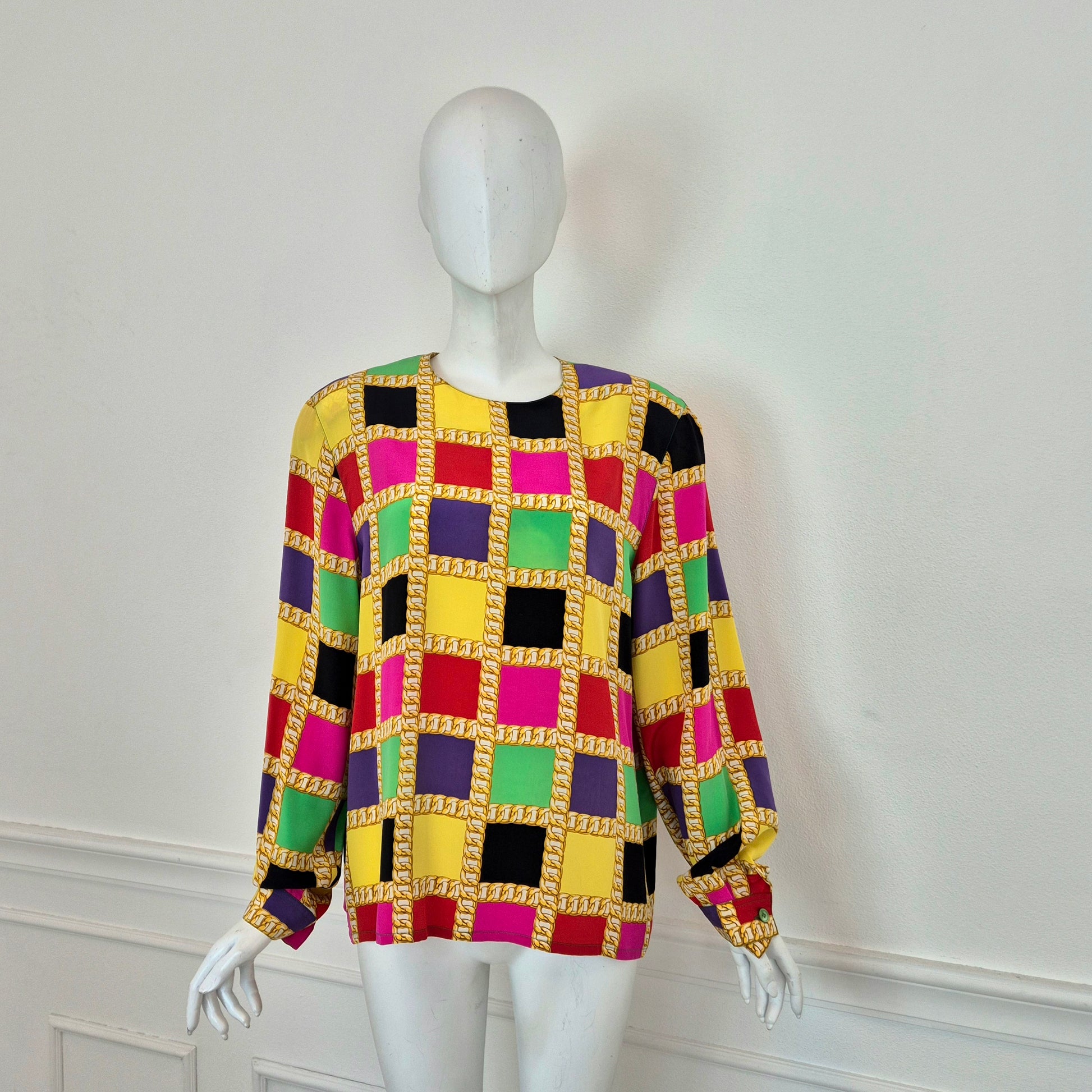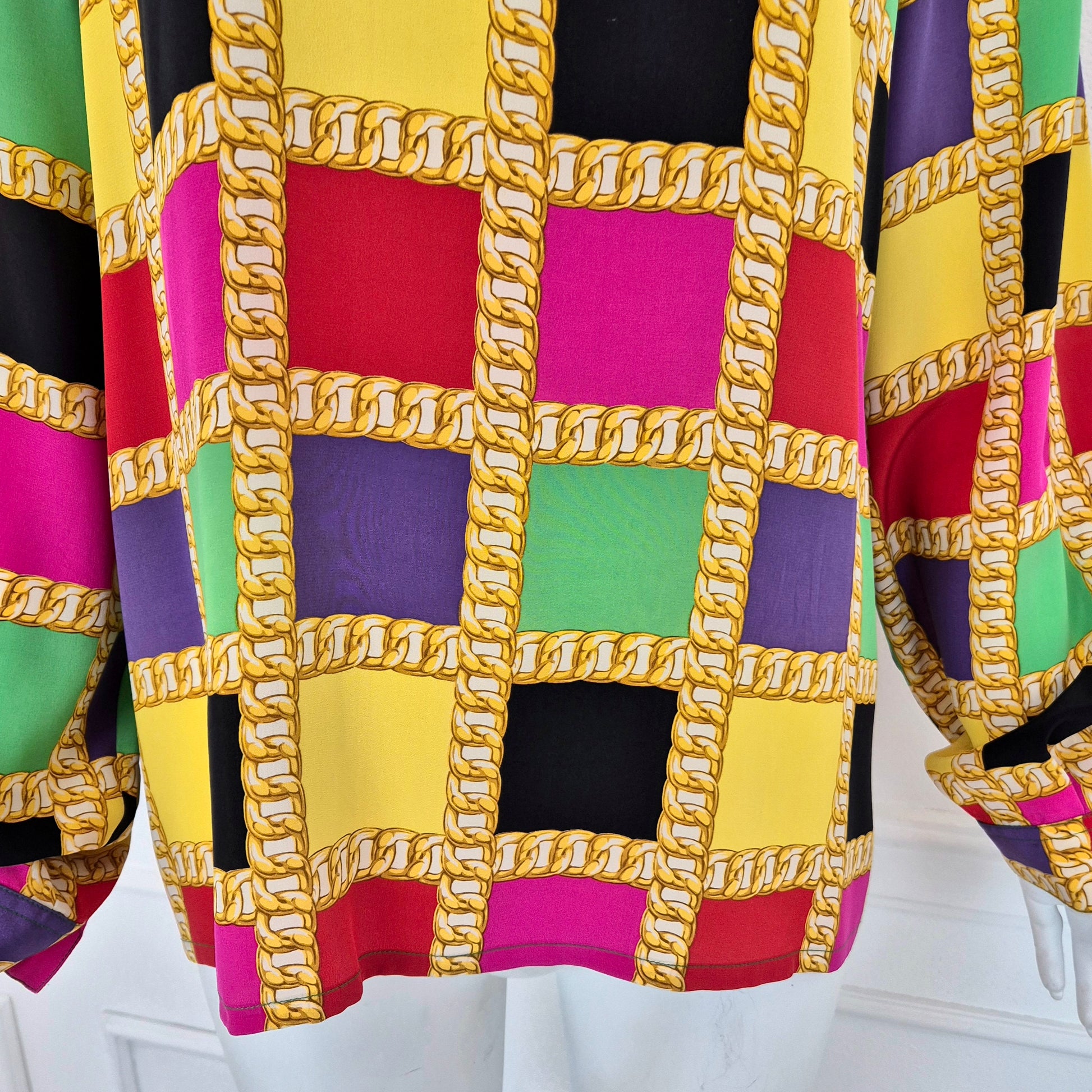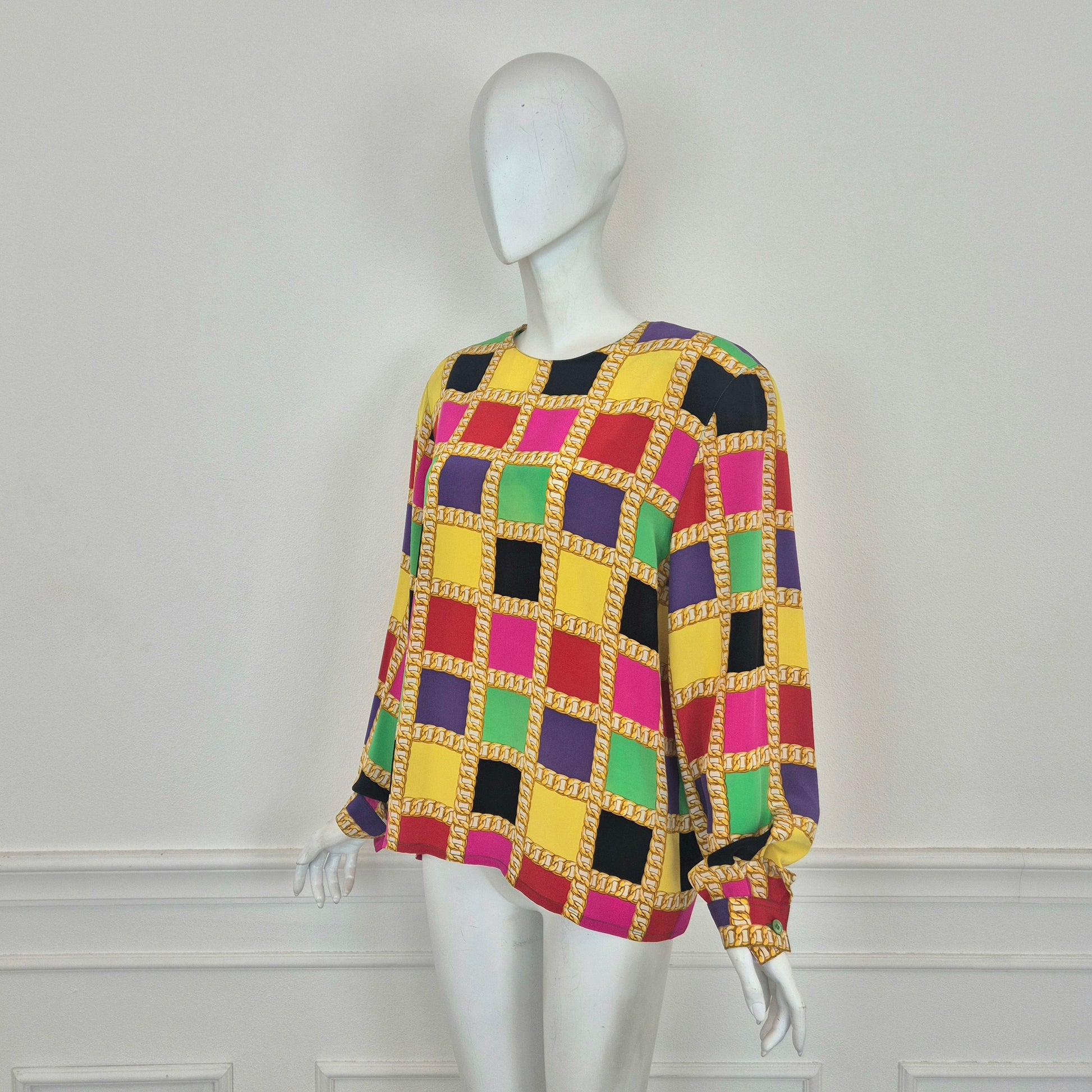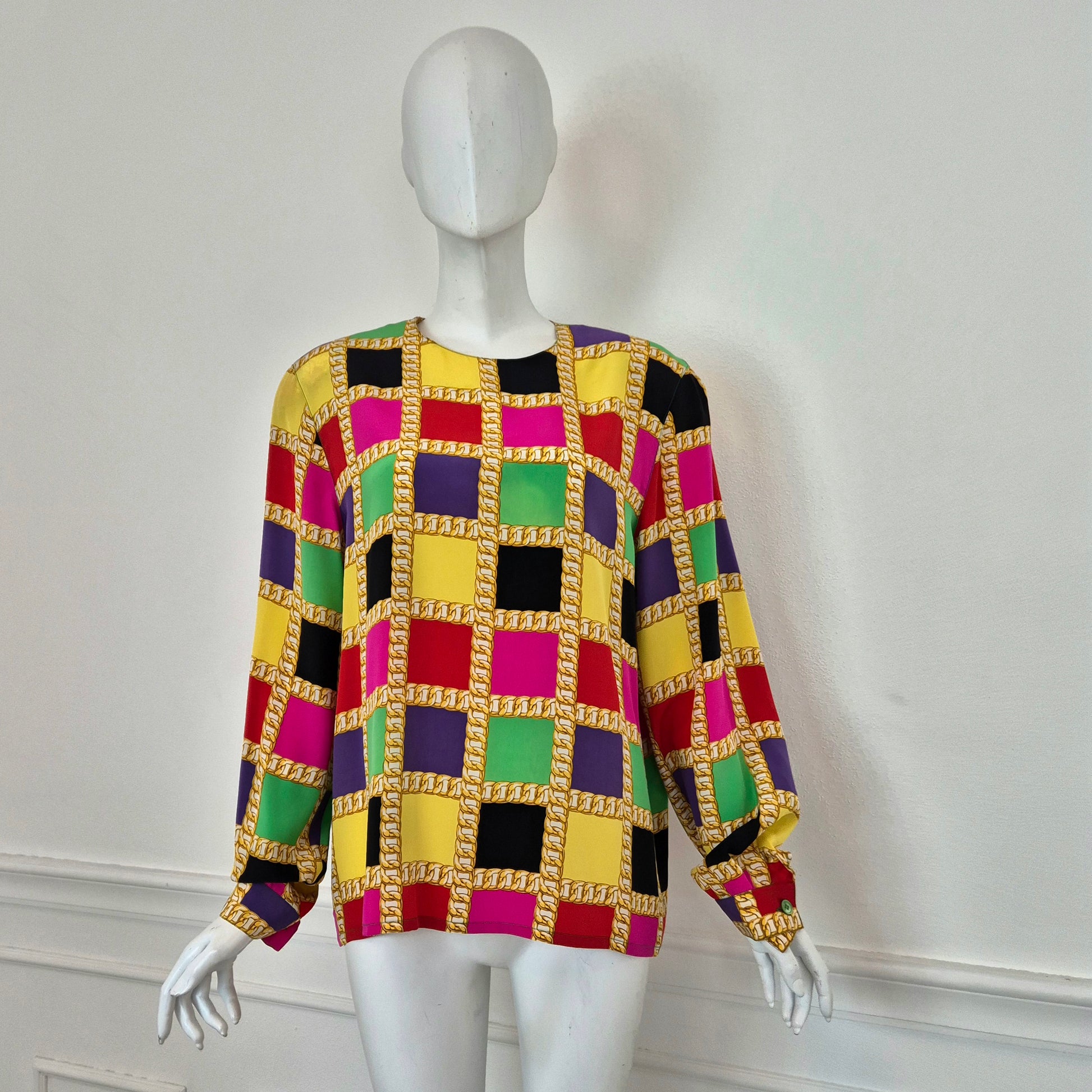 CELINE blusa vintage in pura seta dalla stampa a scacchi multicolor dai colori brillanti. a Fare da "ragnatela", la stampa di una catena dorata. Scollo rotondo, manica lunga, linea dritta e morbida sul busto.