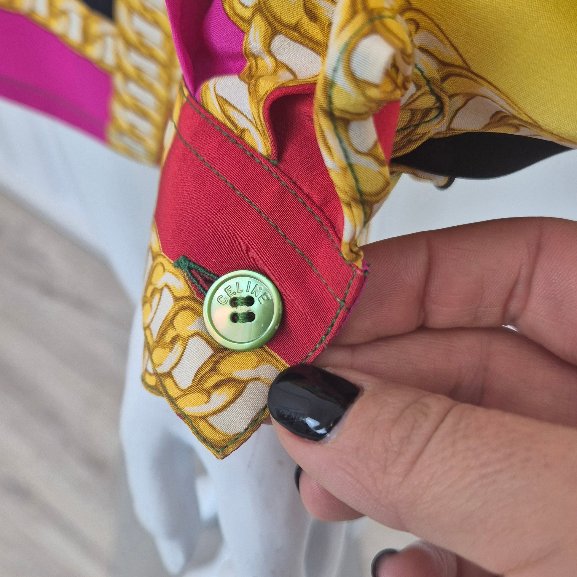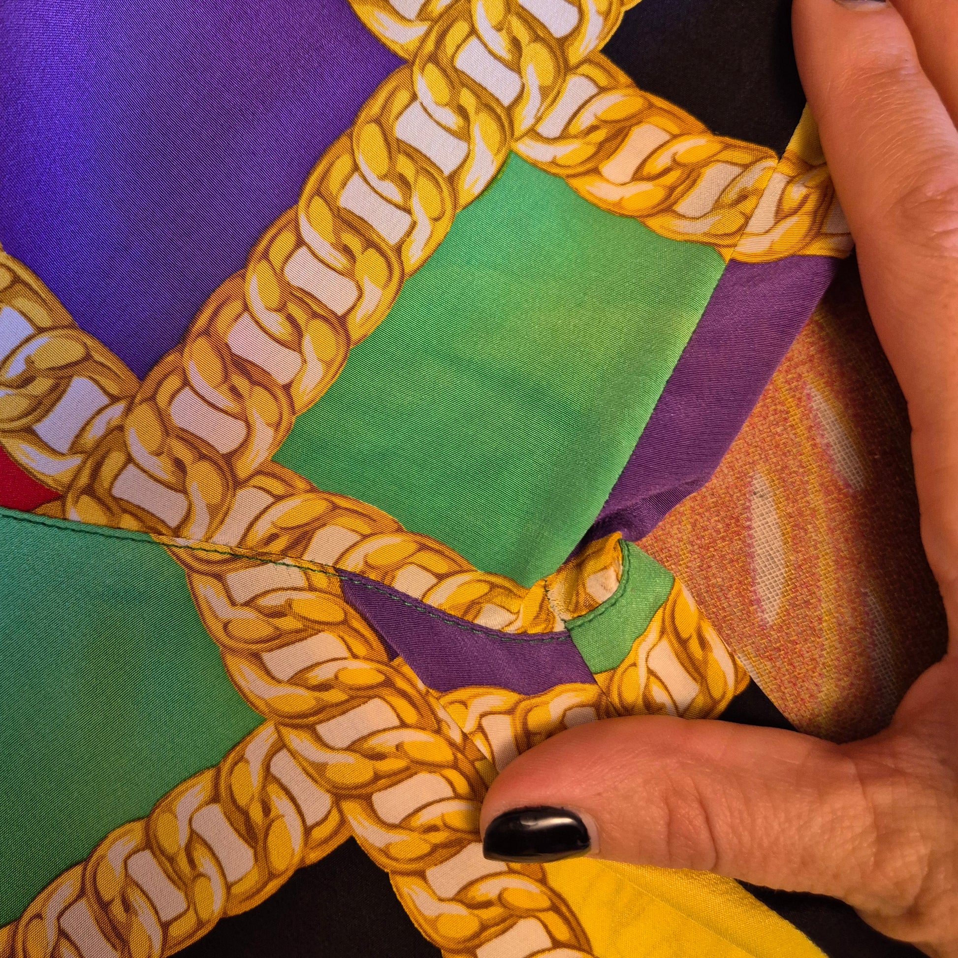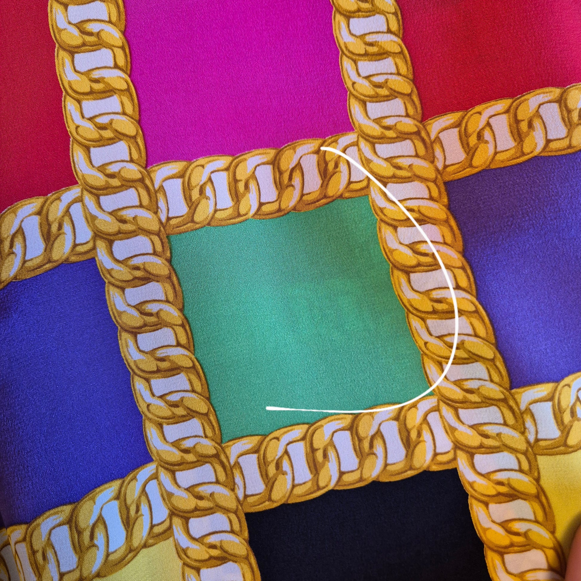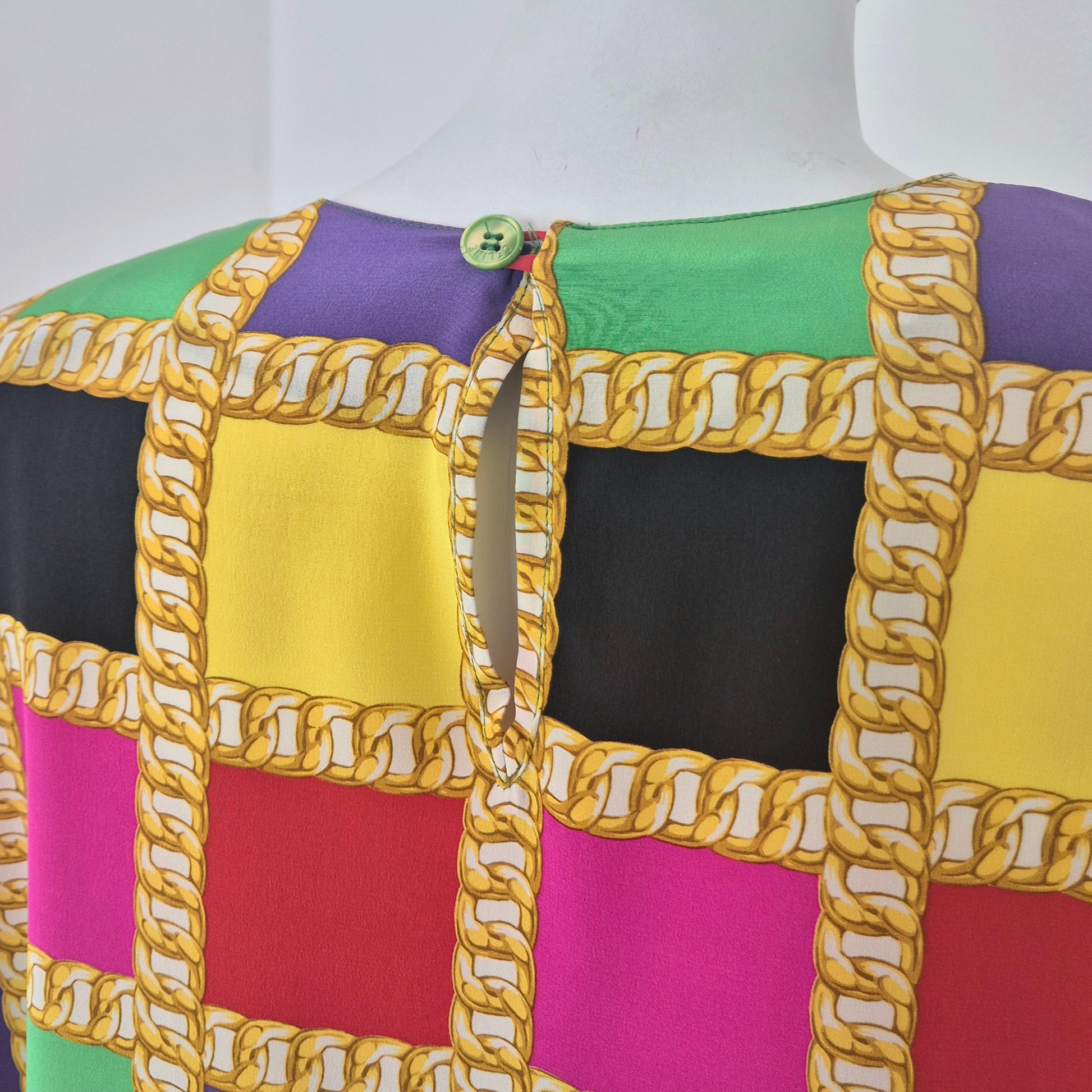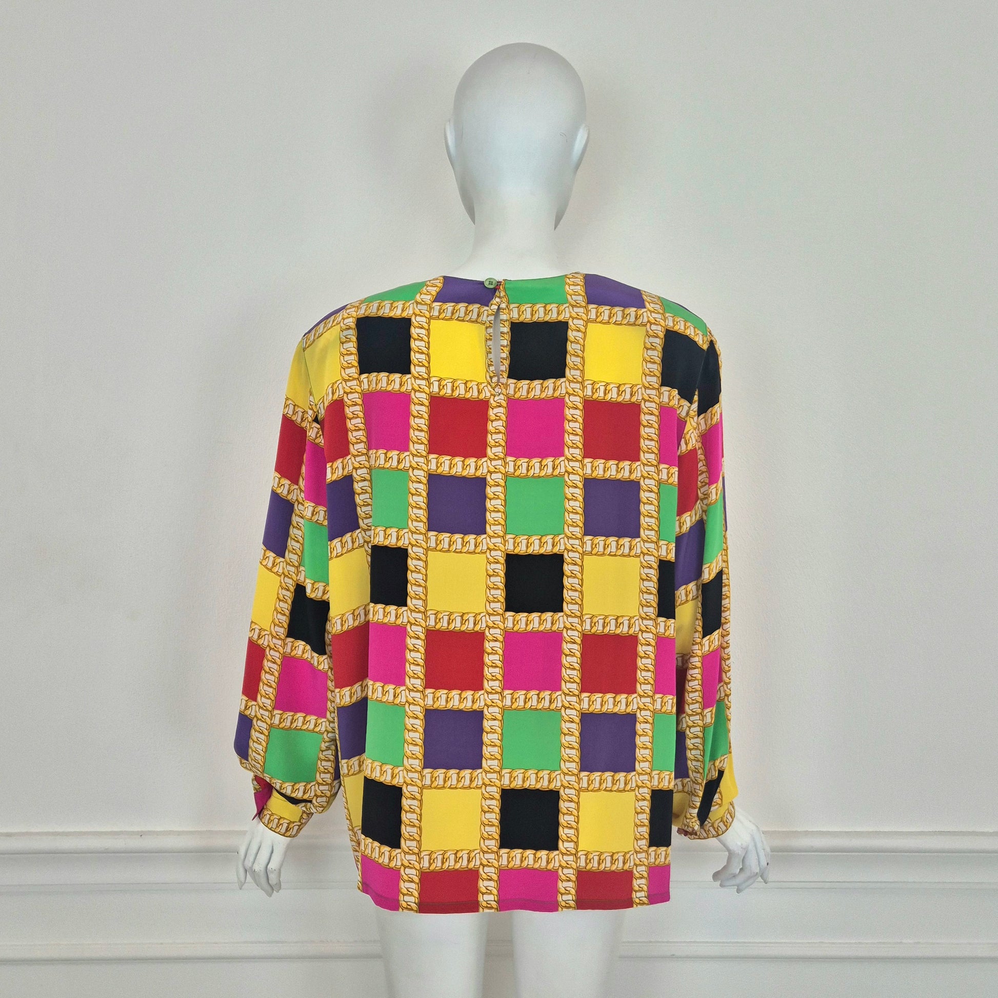 CELINE blusa vintage in pura seta dalla stampa a scacchi multicolor dai colori brillanti. a Fare da "ragnatela", la stampa di una catena dorata. Scollo rotondo, manica lunga, linea dritta e morbida sul busto.
