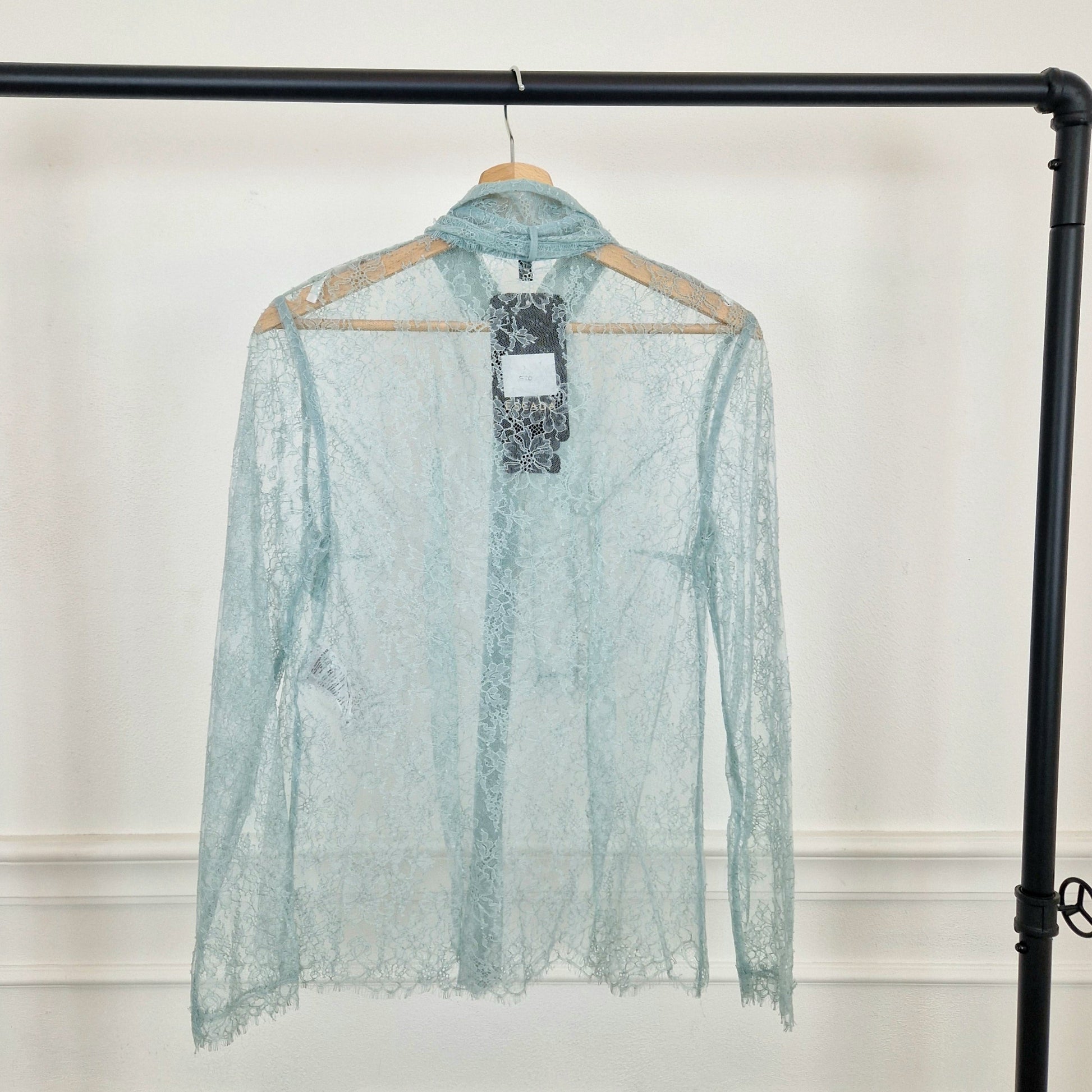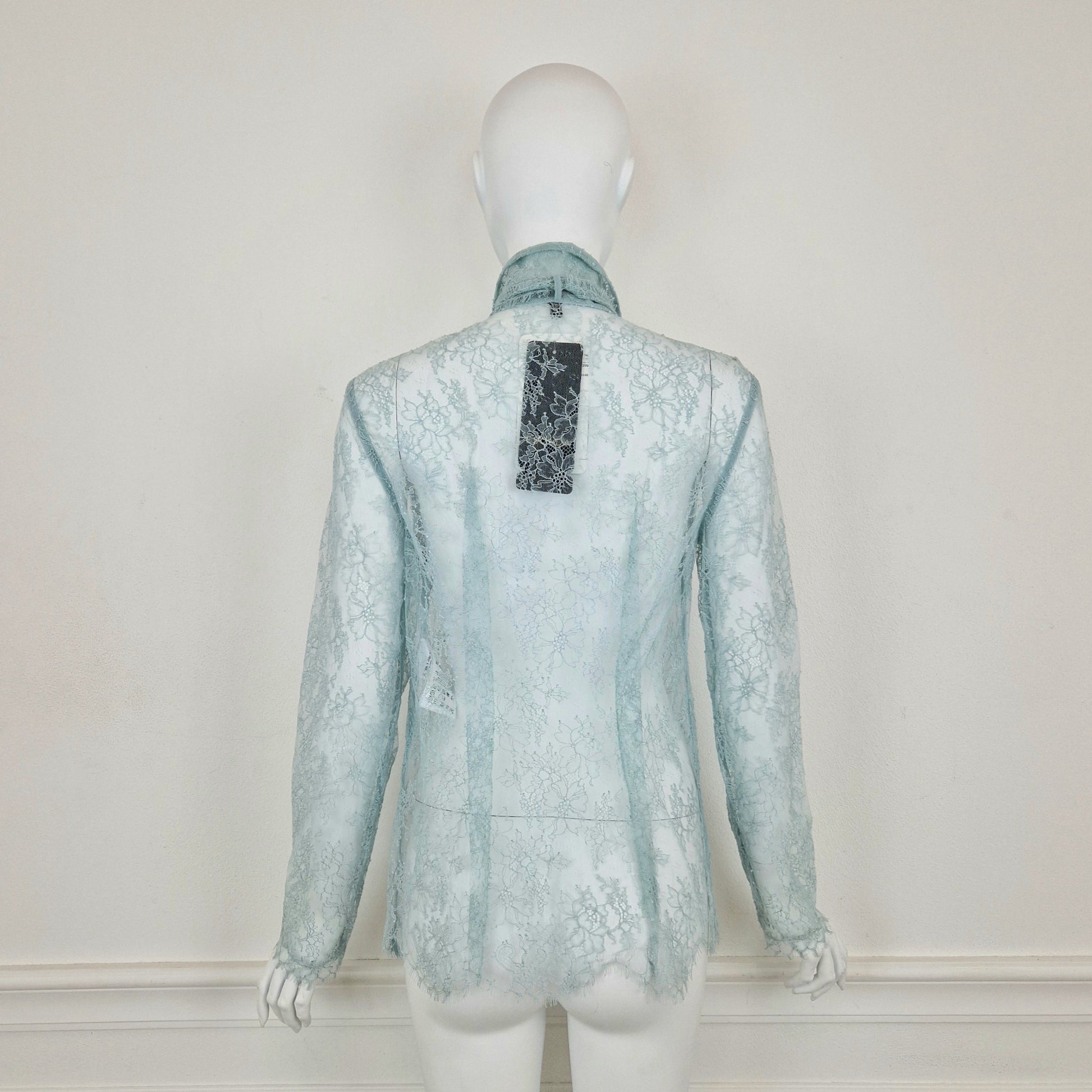 ESCADA camicia in pizzo azzurro chiaro, una tonalità tenue e polverosa, con colletto e due lunghi lacci da stringere in un fiocco al collo. In origine aveva una canotta azzurra con spalline sottili abbinata, che purtroppo non è più presente: risulta quindi velata e necessita di un giusto top.