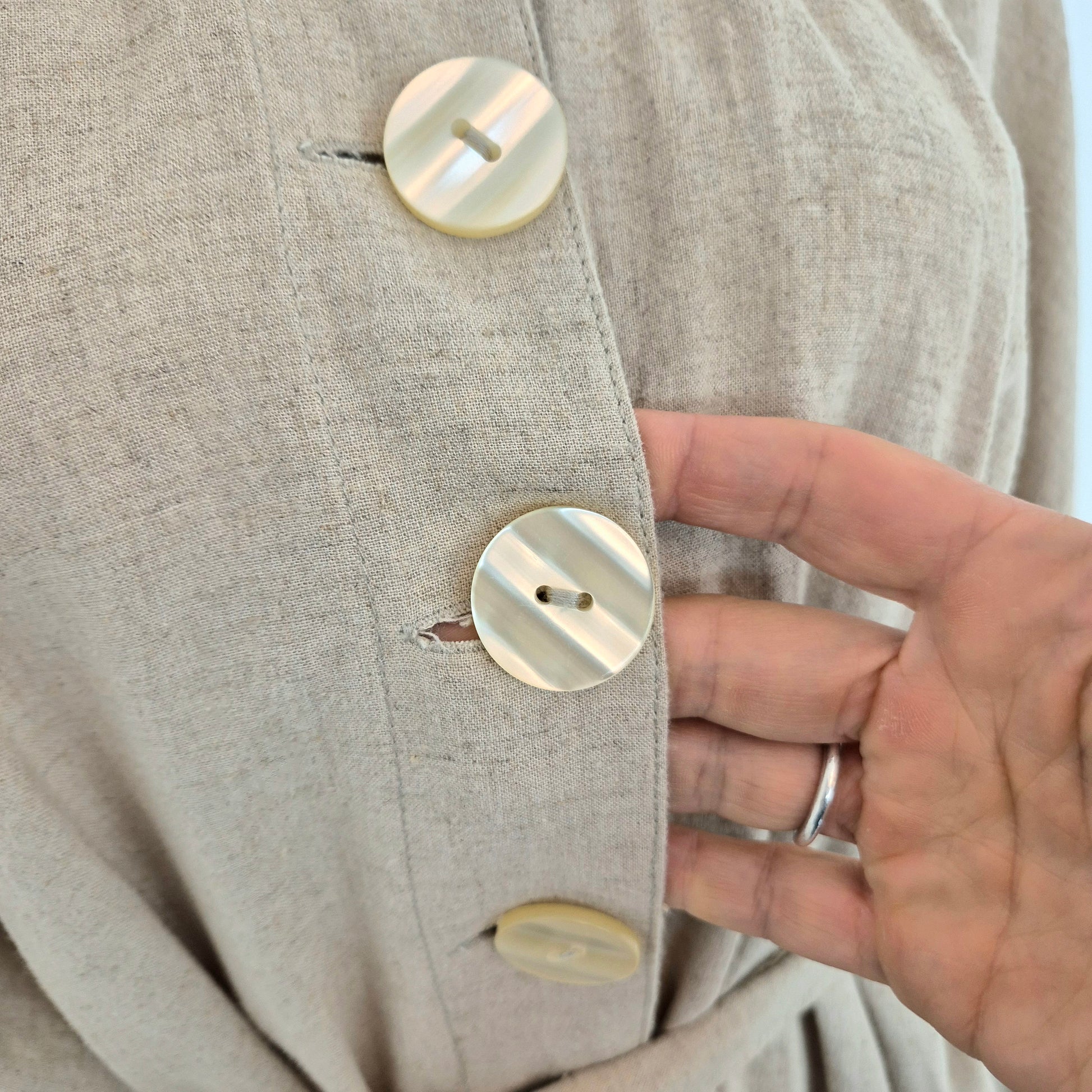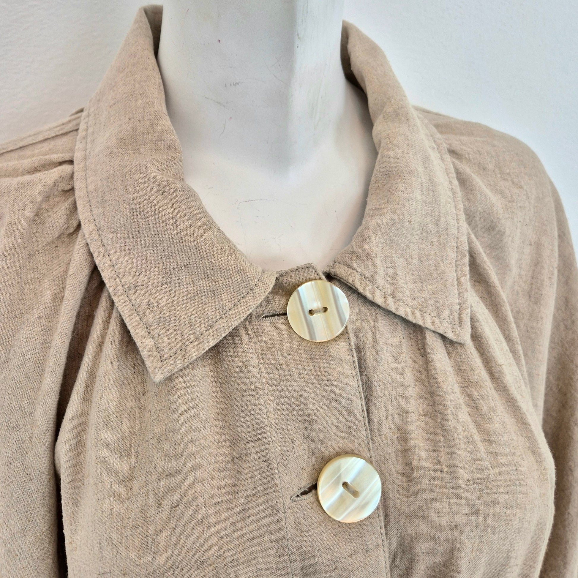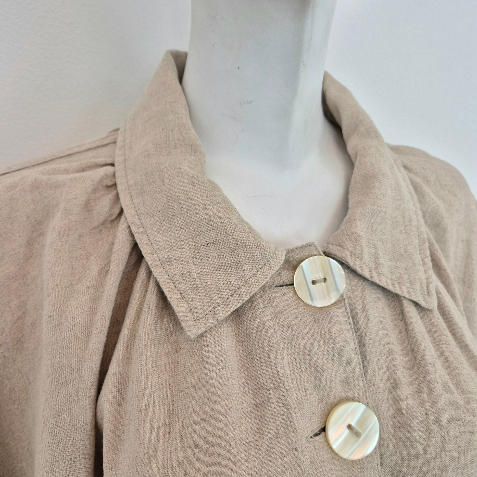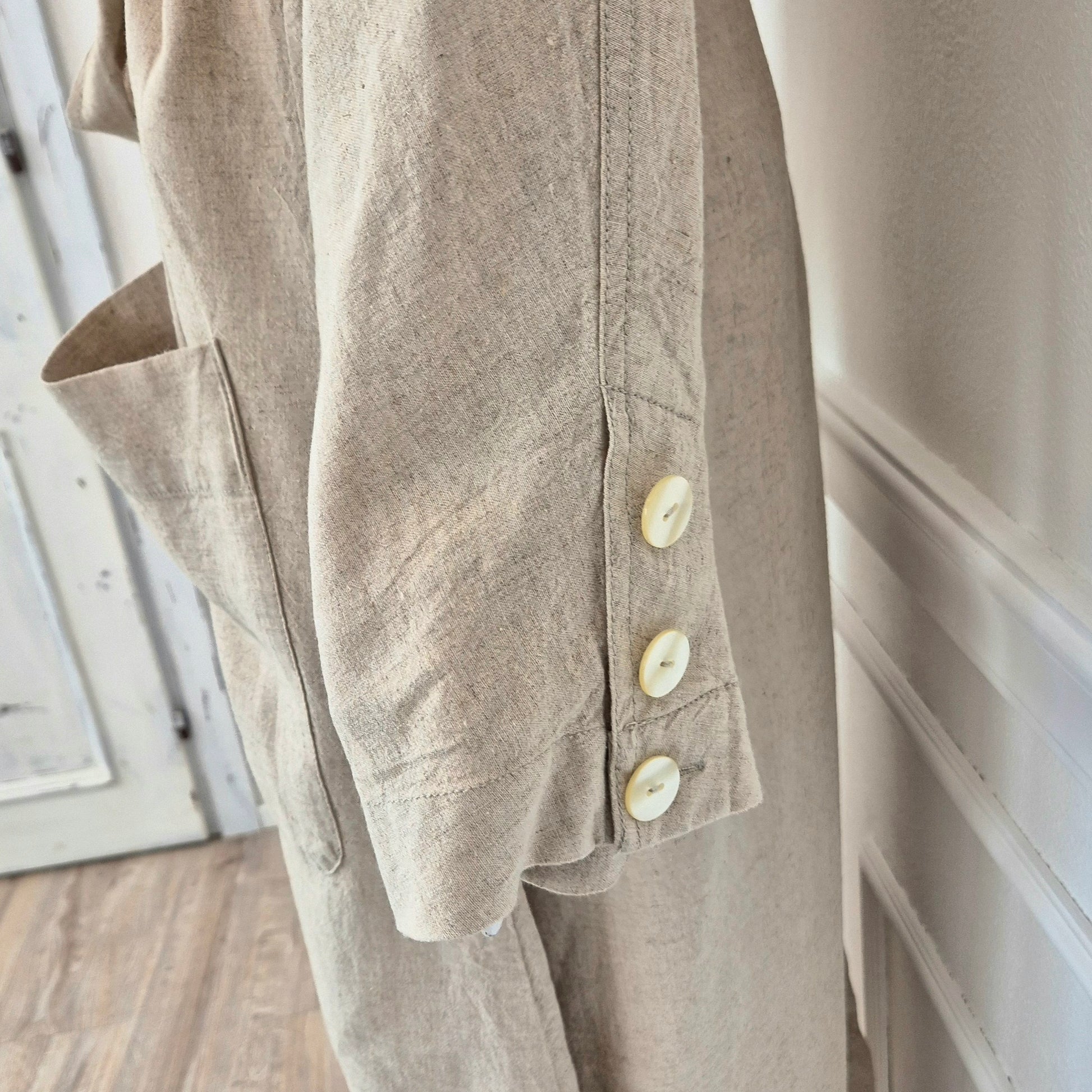 FREE PEOPLE spolverino / soprabito in misto lino e rayon nel classico color beige/sabbia, con cintura coordinata e grandi bottoni in madreperla su tutta la lunghezza.
