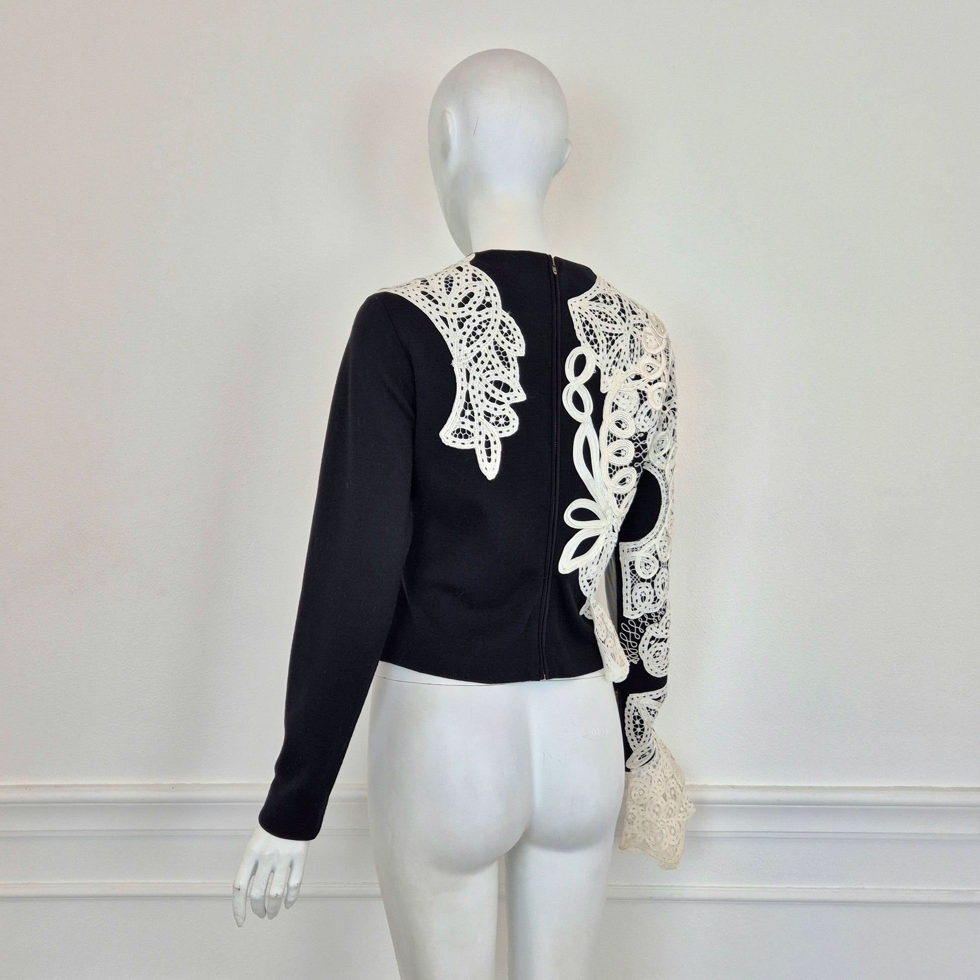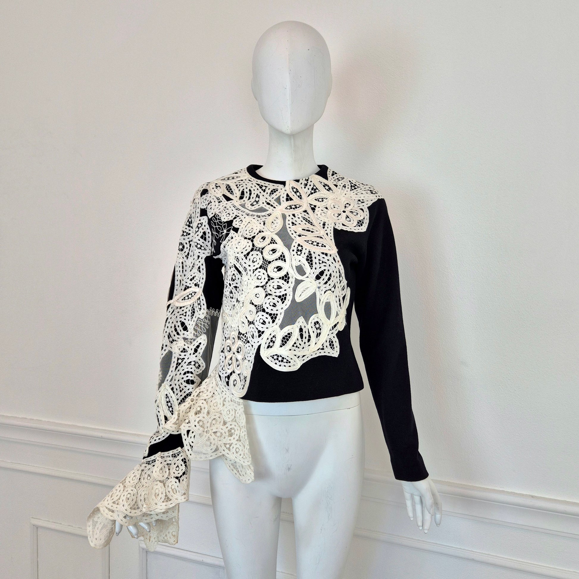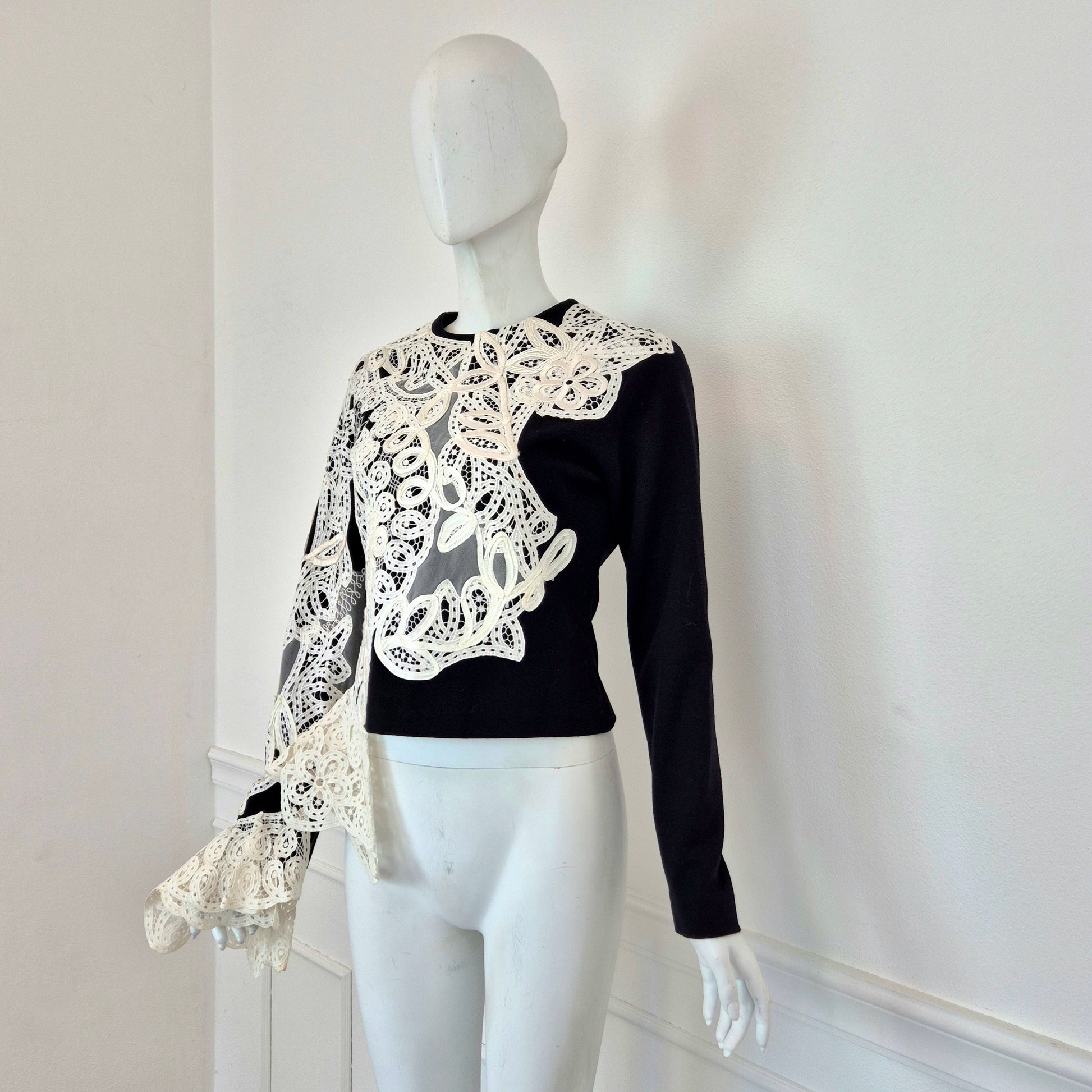GIANFRANCO FERRE' (fall winter 1988) top/maglia in lana con incredibili inserti a contrasto in pizzo bianco lavorato. Scollo rotondo, manica lunga, particolare allacciatura sul retro tramite lunga zip.