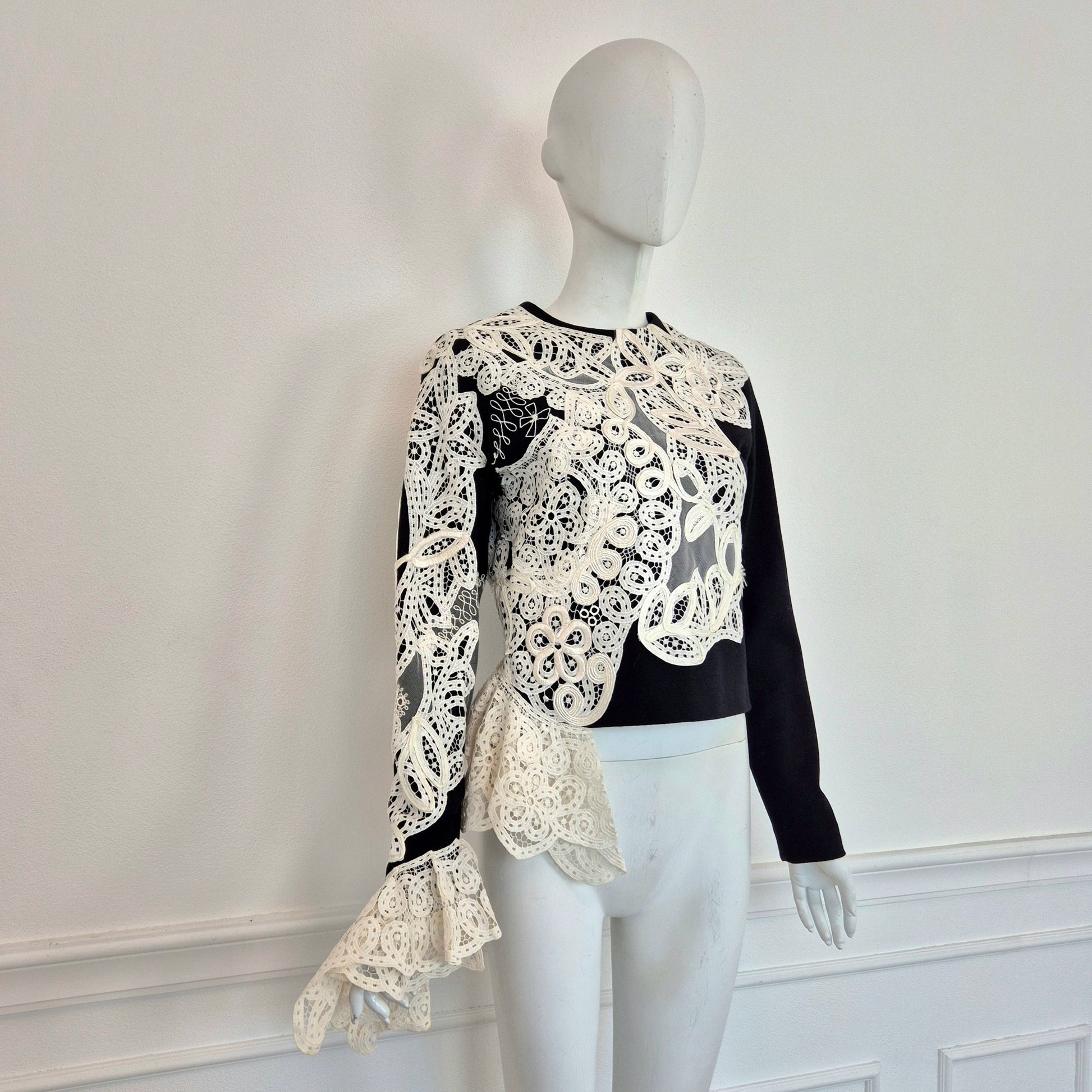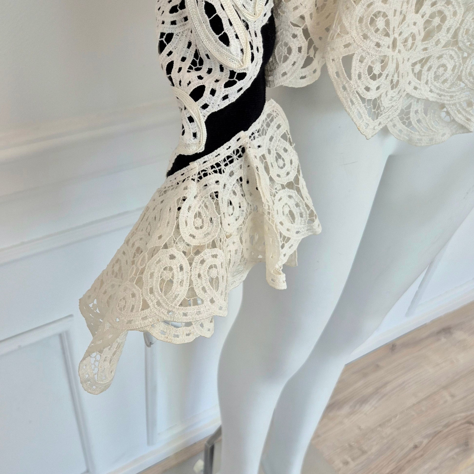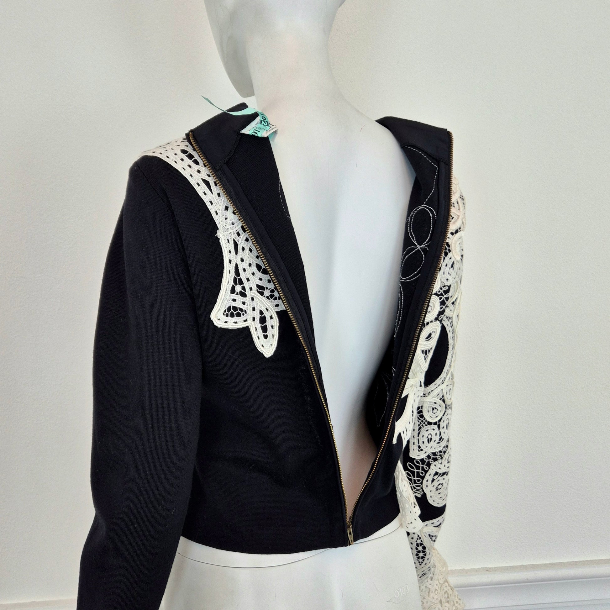 GIANFRANCO FERRE' (fall winter 1988) top/maglia in lana con incredibili inserti a contrasto in pizzo bianco lavorato. Scollo rotondo, manica lunga, particolare allacciatura sul retro tramite lunga zip.