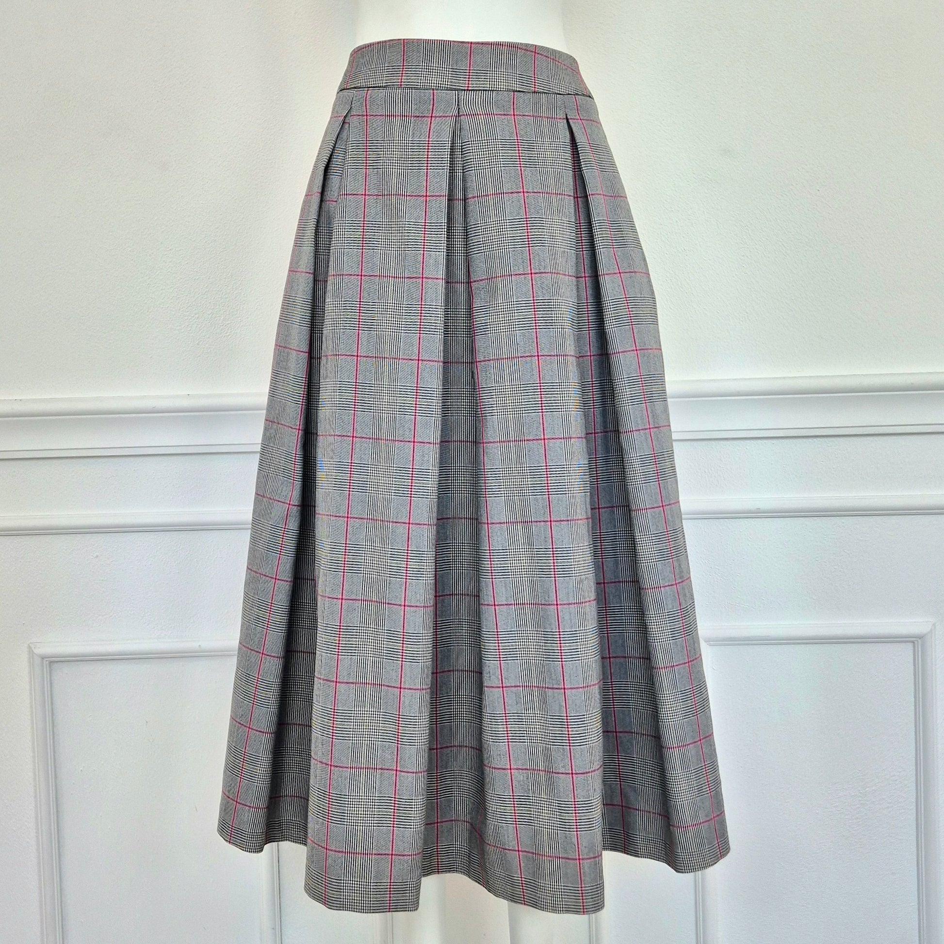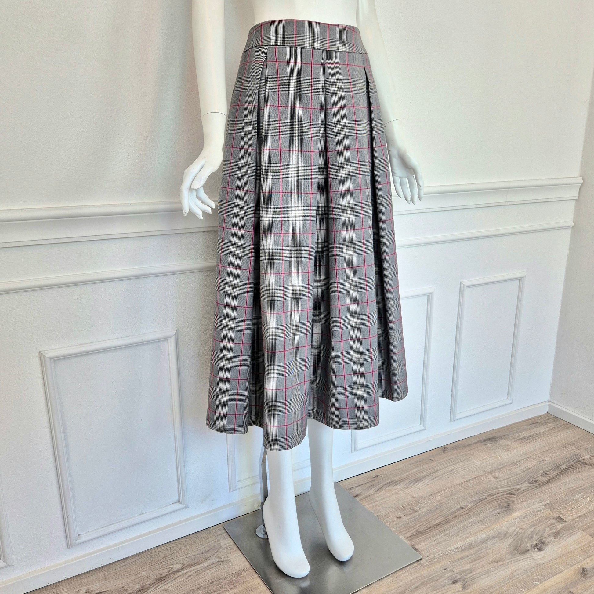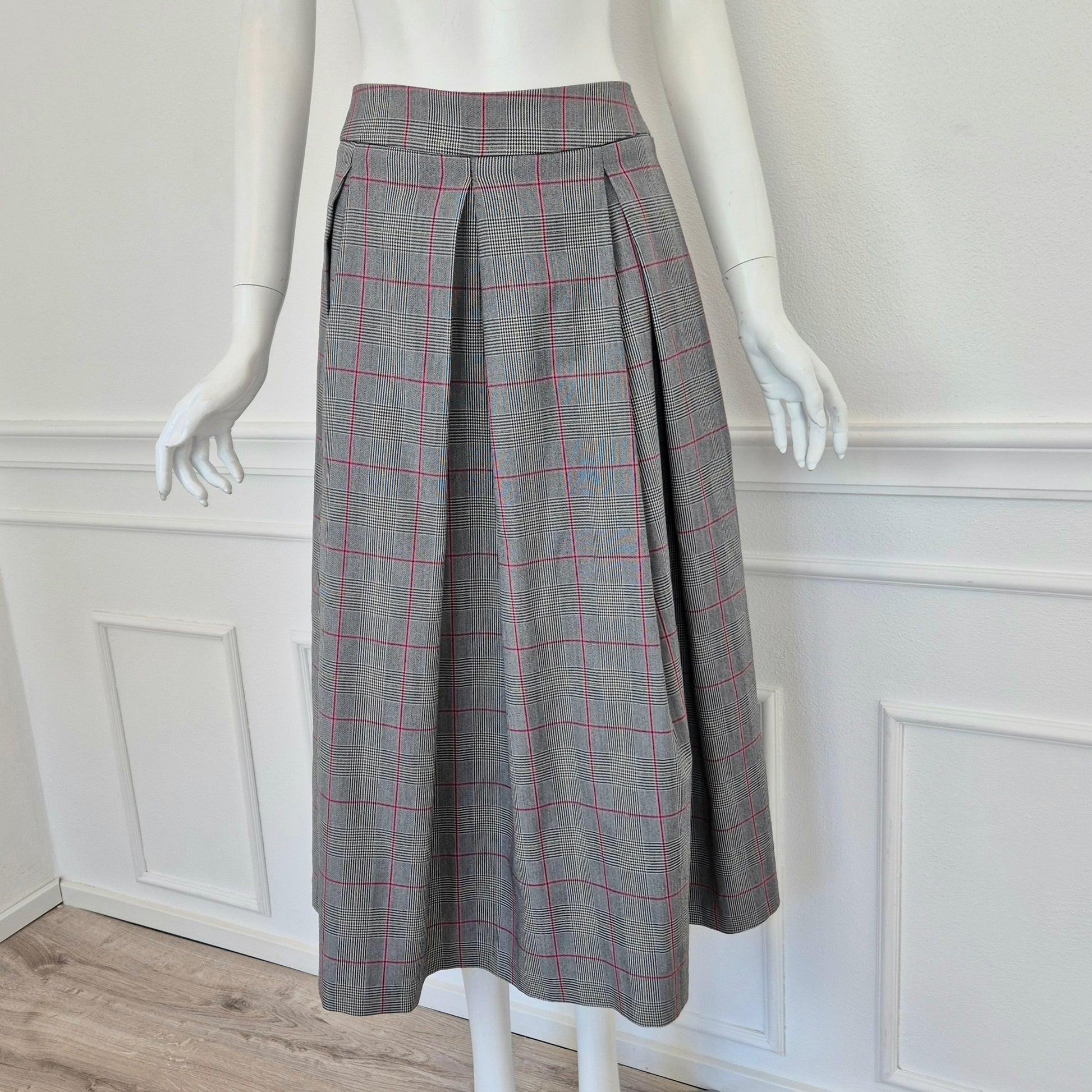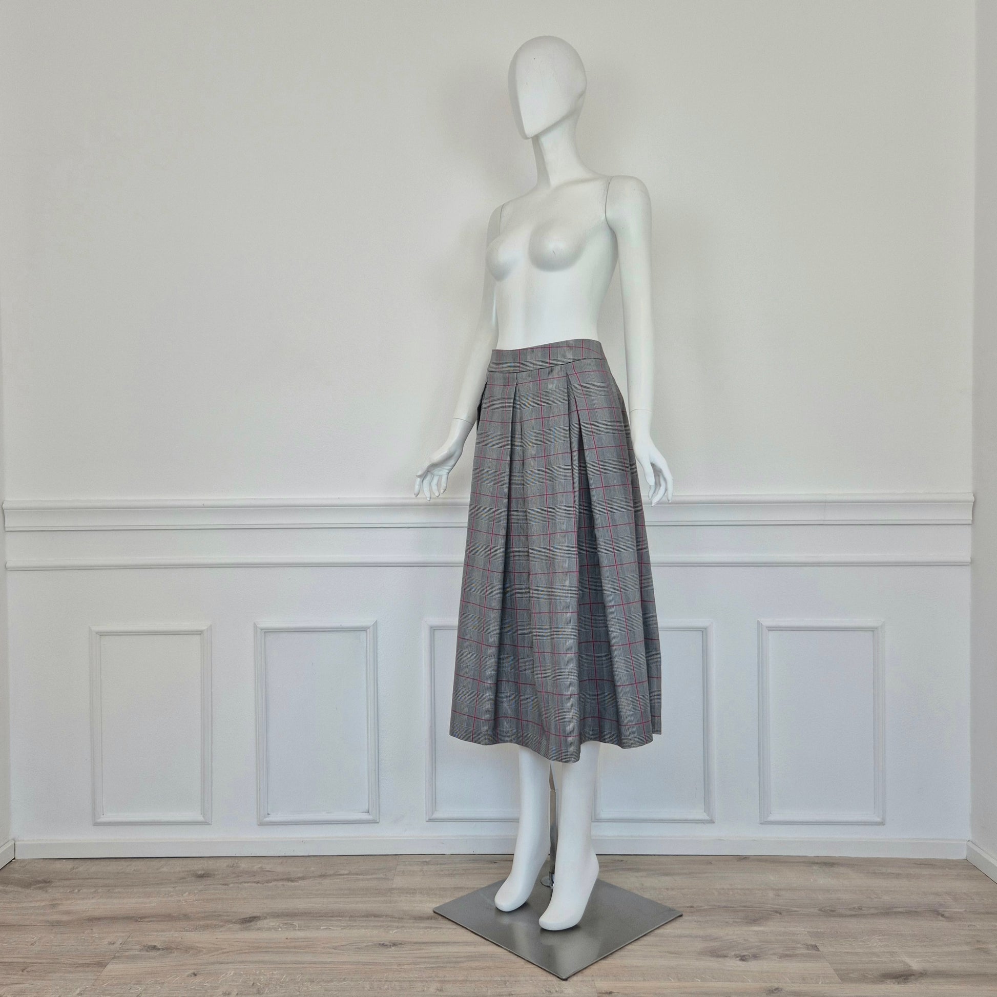 MIDINETTE gonna midi a pieghe piatte ed ampie, tessuto principe di Gallese sui classici toni del grigio ravvivati in questo caso dalla riga rosa. Chiusura sul fianco tramite zip.