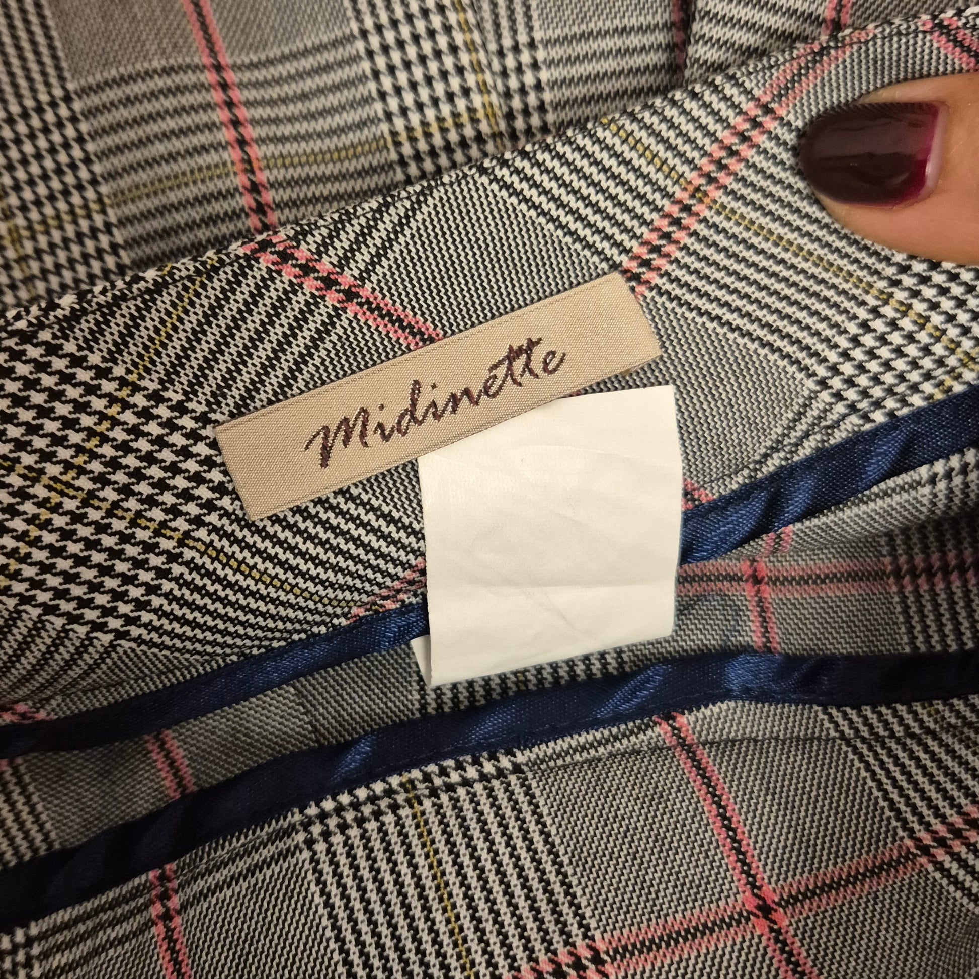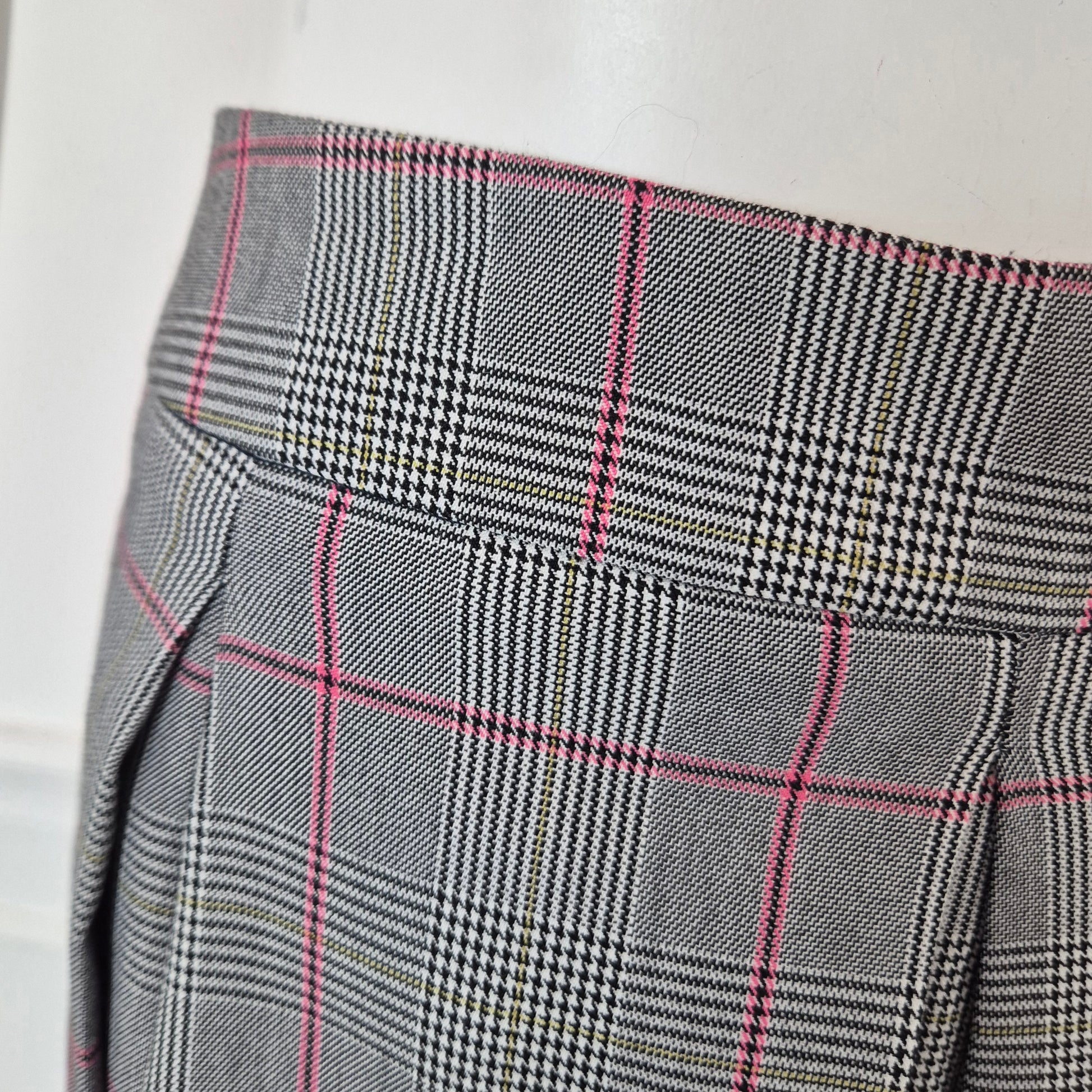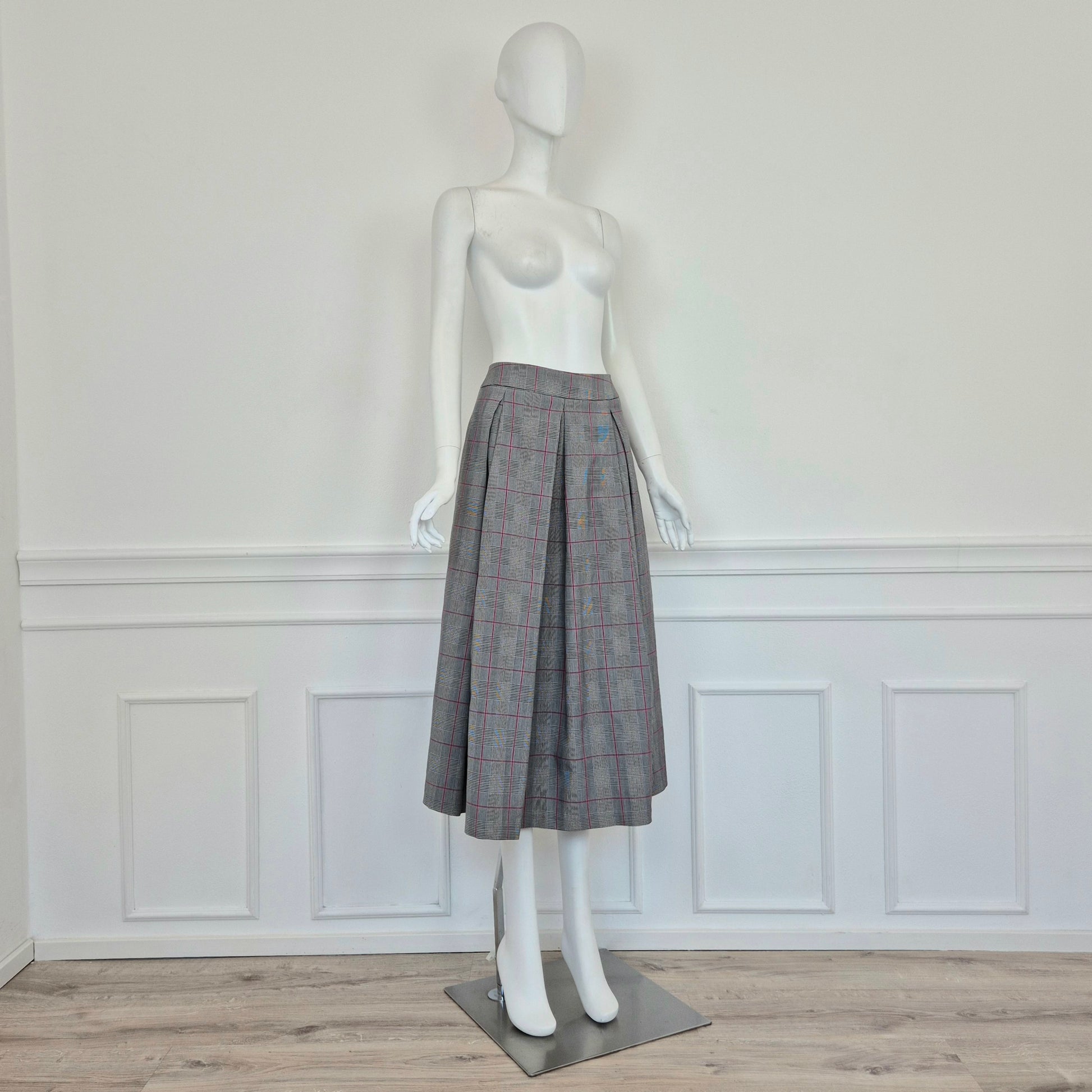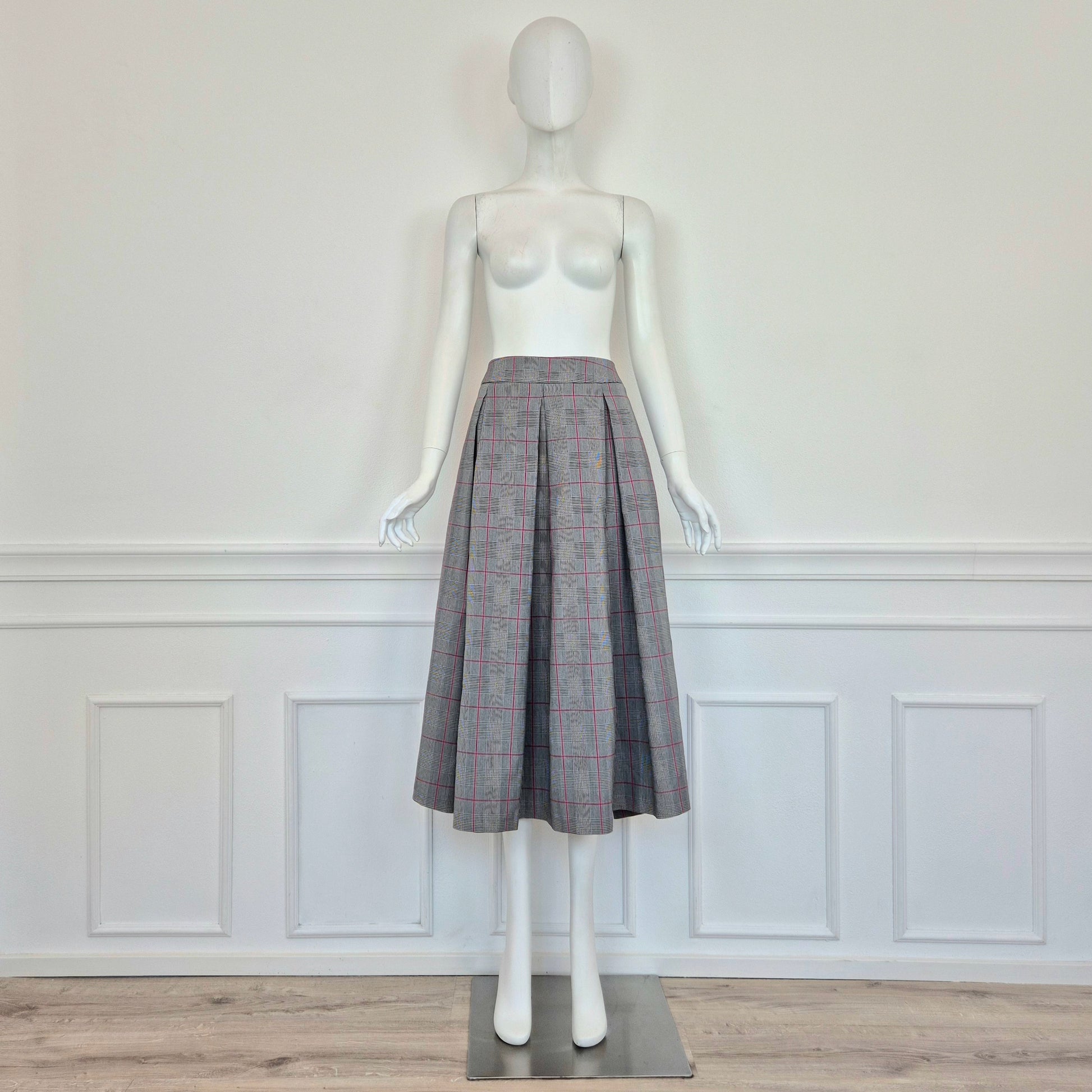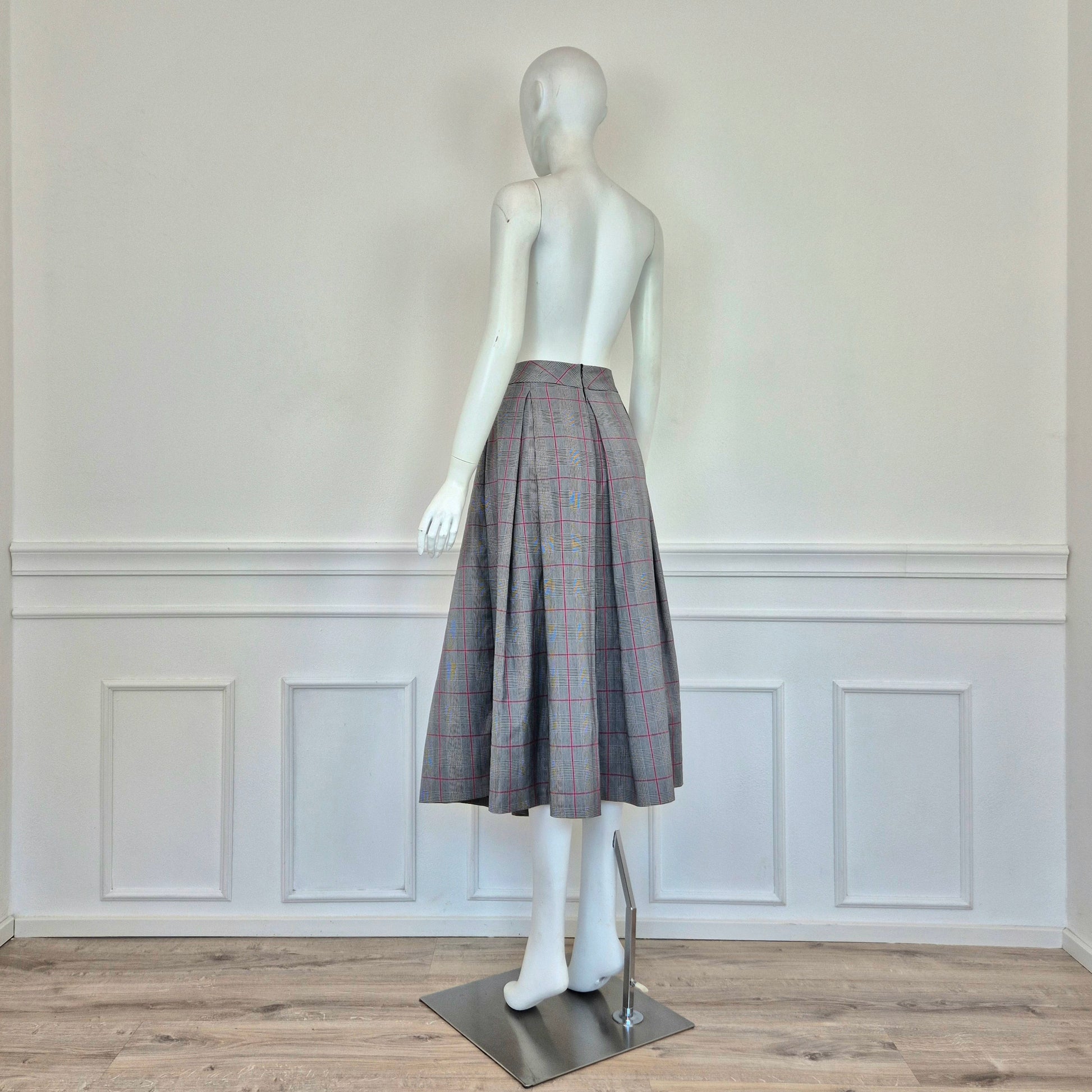 MIDINETTE gonna midi a pieghe piatte ed ampie, tessuto principe di Gallese sui classici toni del grigio ravvivati in questo caso dalla riga rosa. Chiusura sul fianco tramite zip.