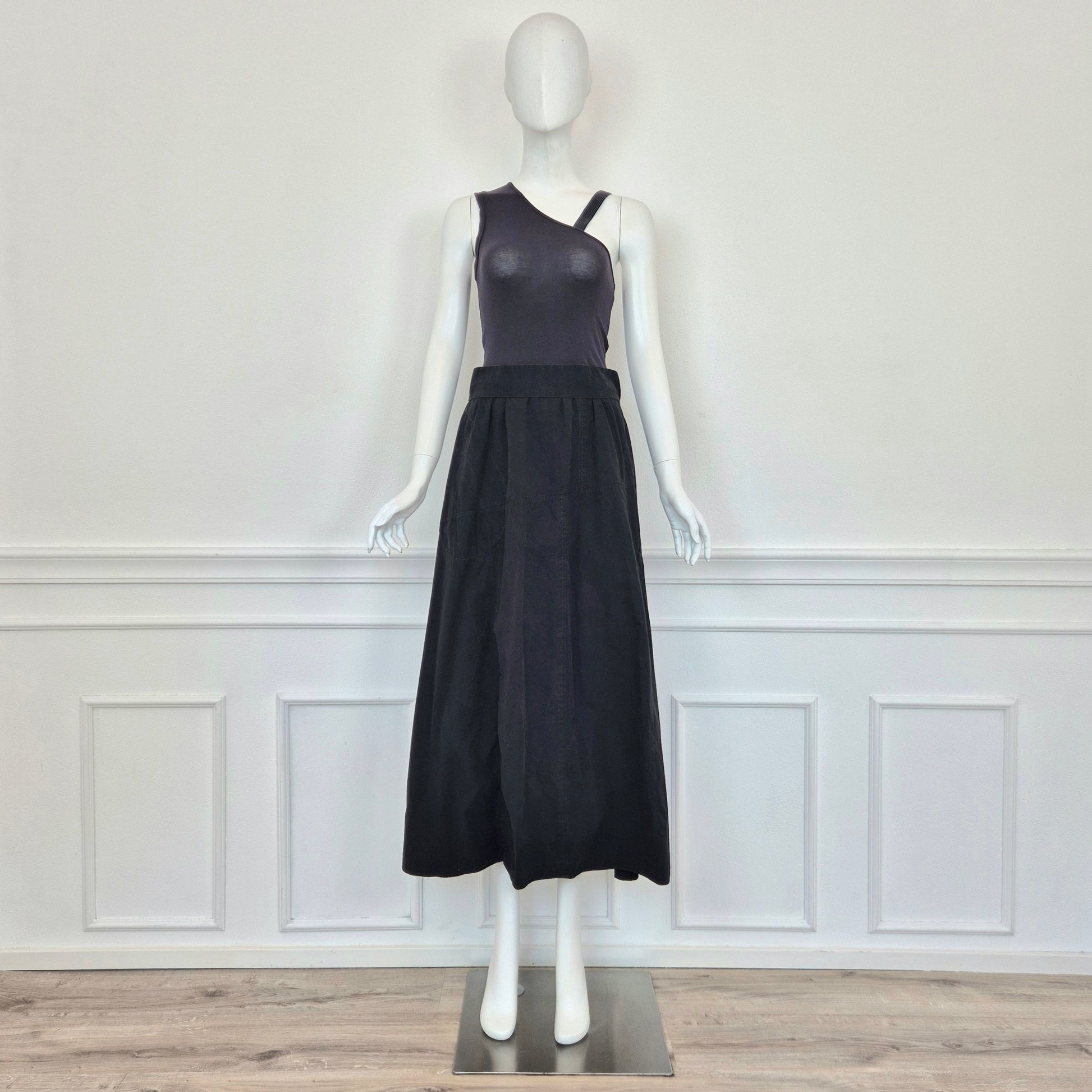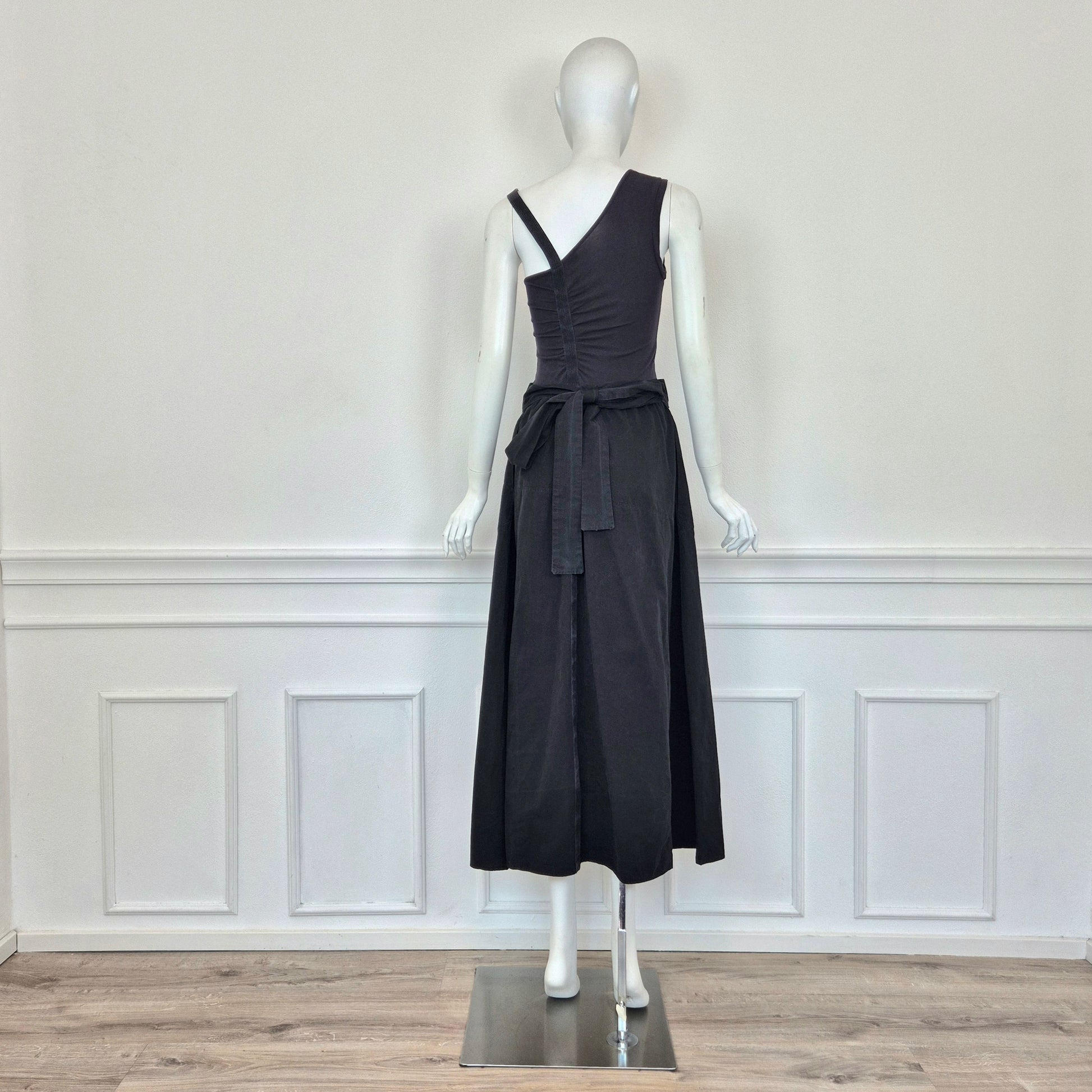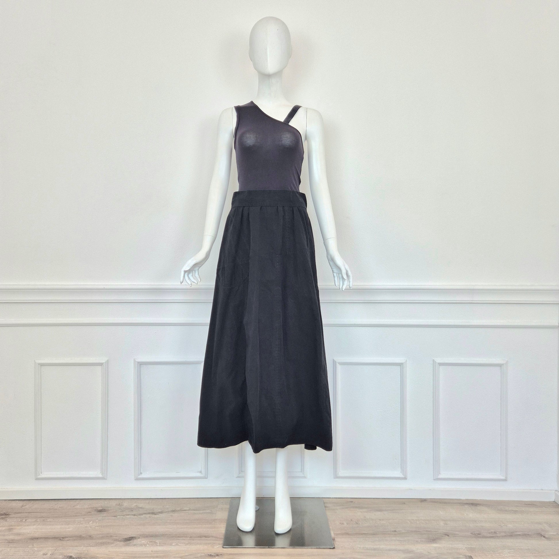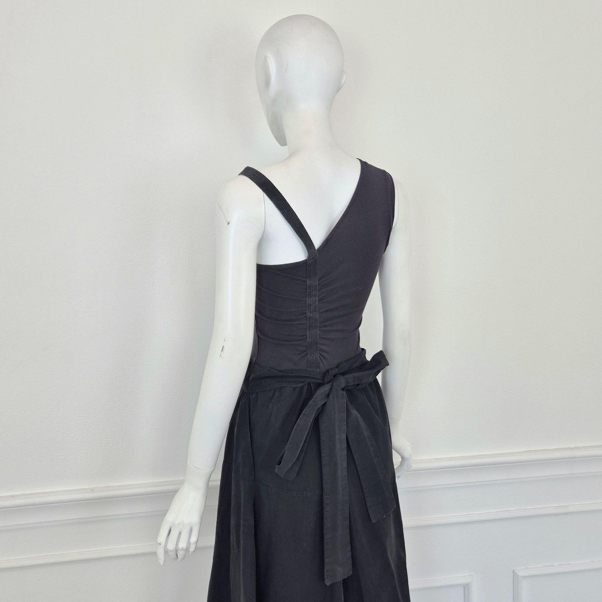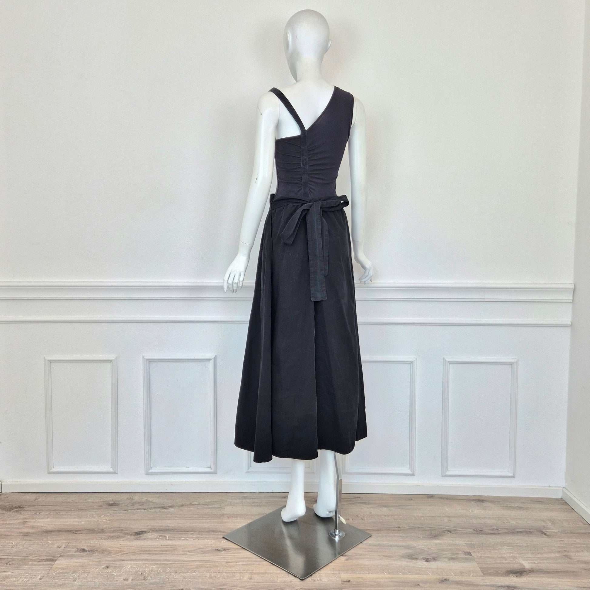 MALLONI abito lungo con parte superiore in cotone elasticizzato blu notte e gonna ampia in cotone nero più sostenuto.