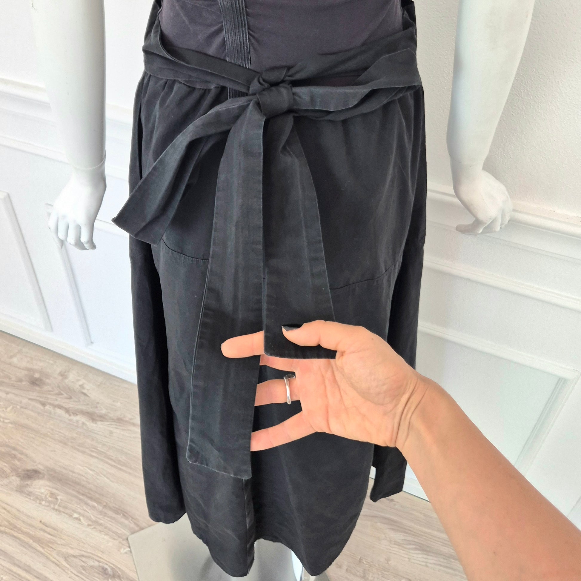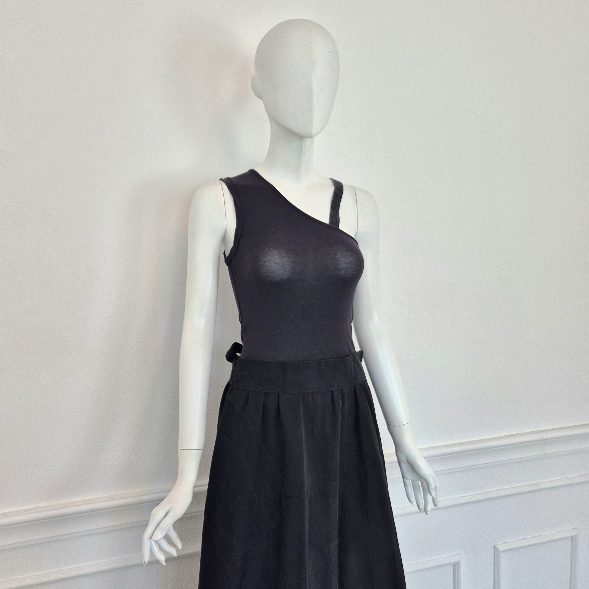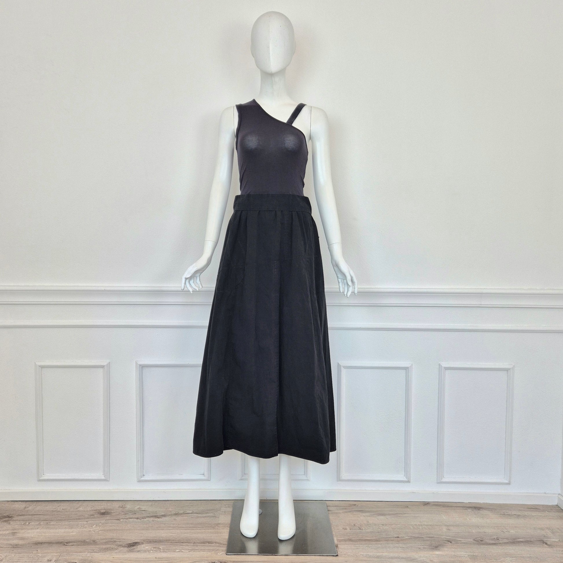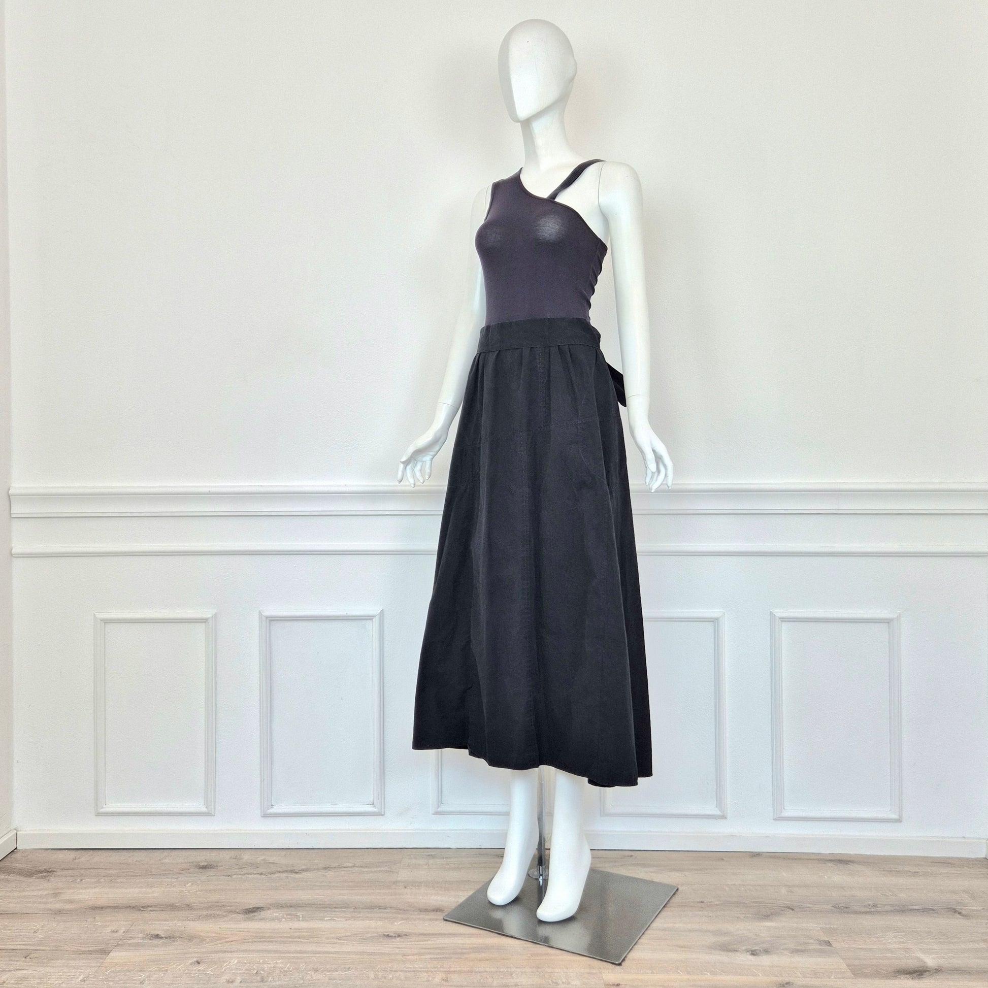 MALLONI abito lungo con parte superiore in cotone elasticizzato blu notte e gonna ampia in cotone nero più sostenuto.