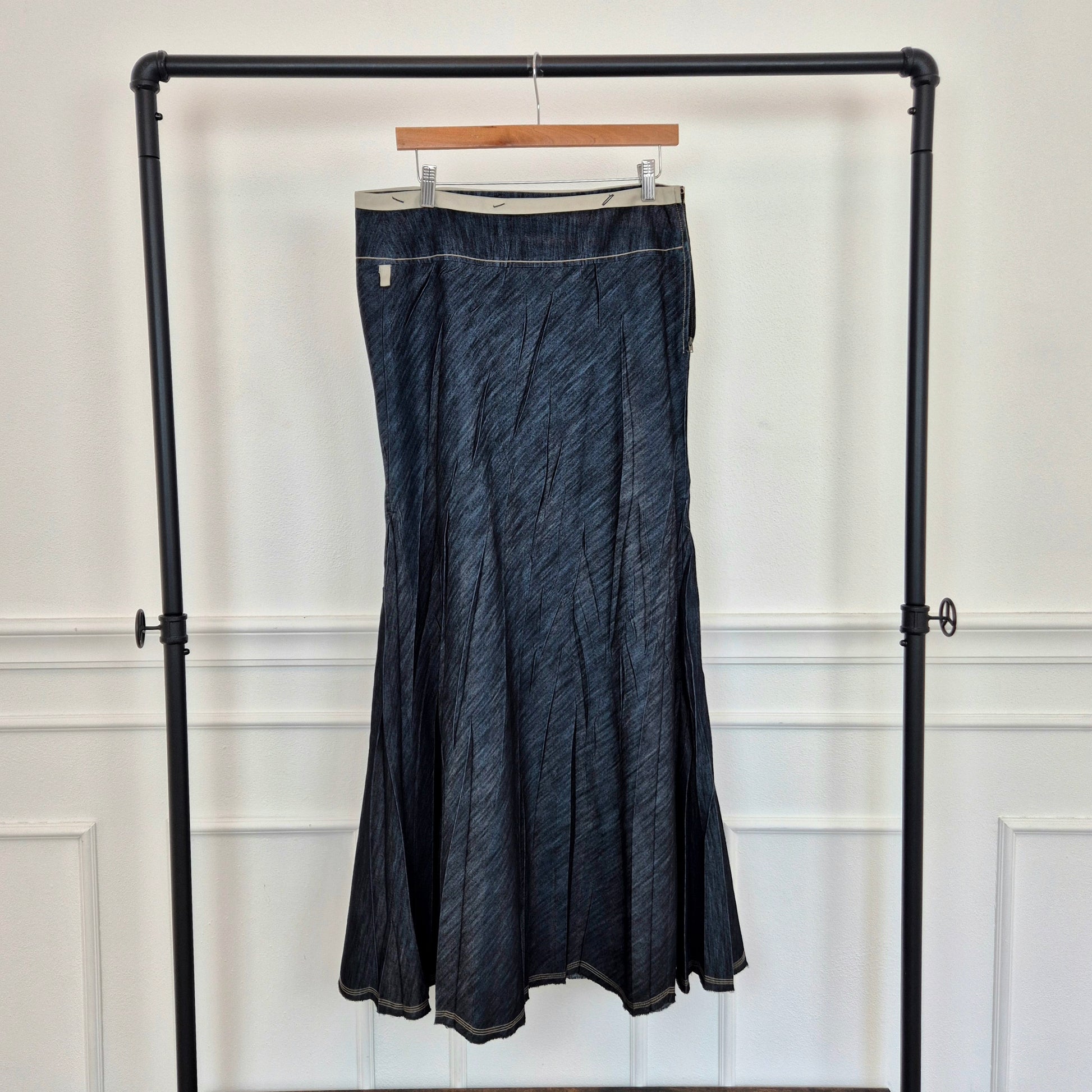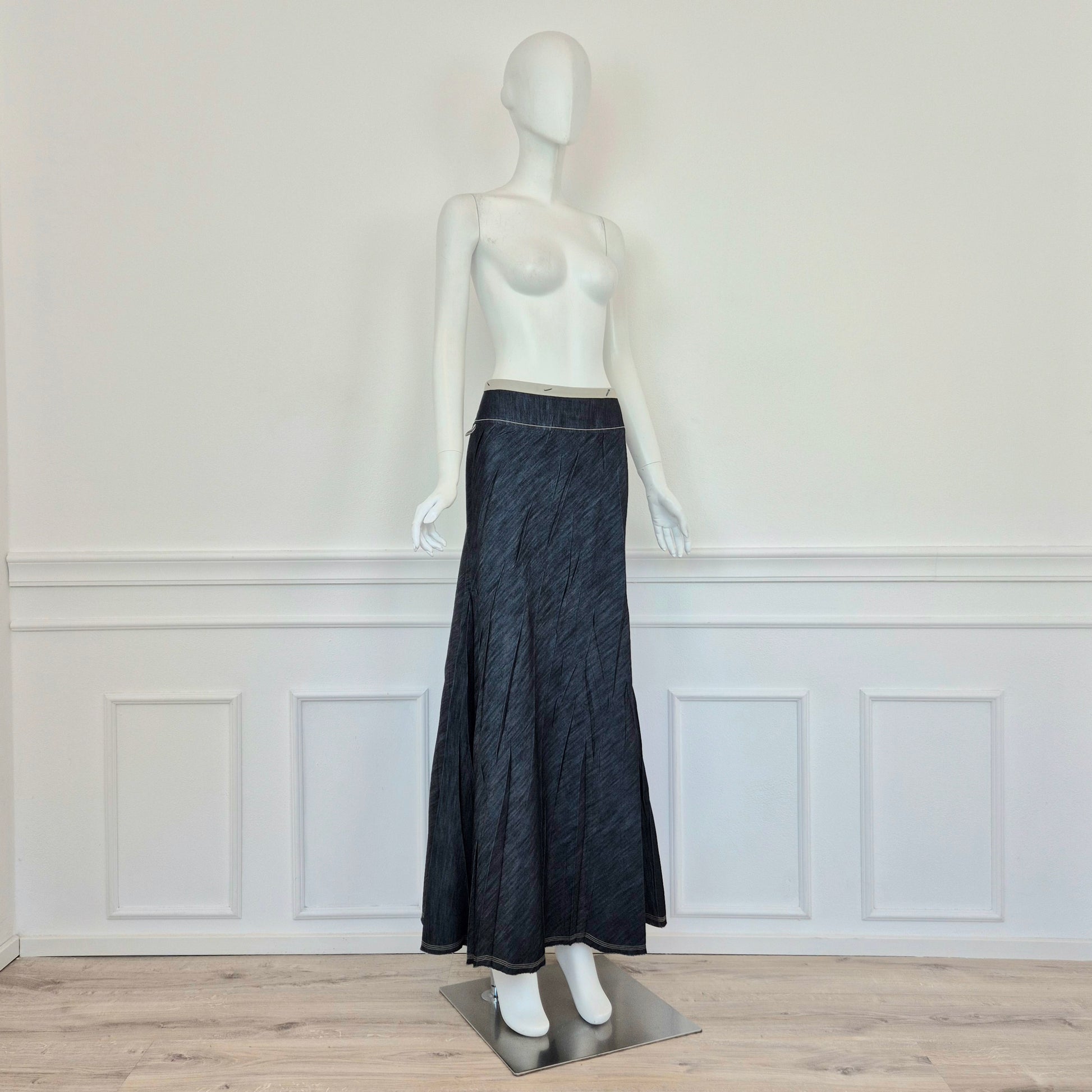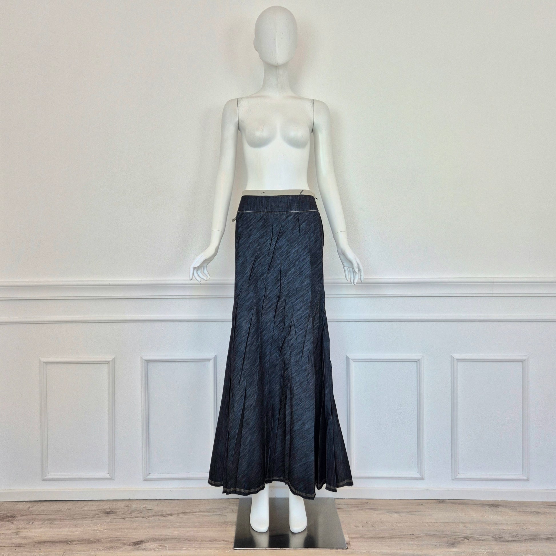 MARITHÉ+FRANҪOIS GIRBAUD gonna lunga in denim lavaggio scuro con particolare lavorazione del tessuto a darle un effetto "stropicciato". Linea a sirena con punto vita bordato in cotone grigio ghiaccio e zip laterale.